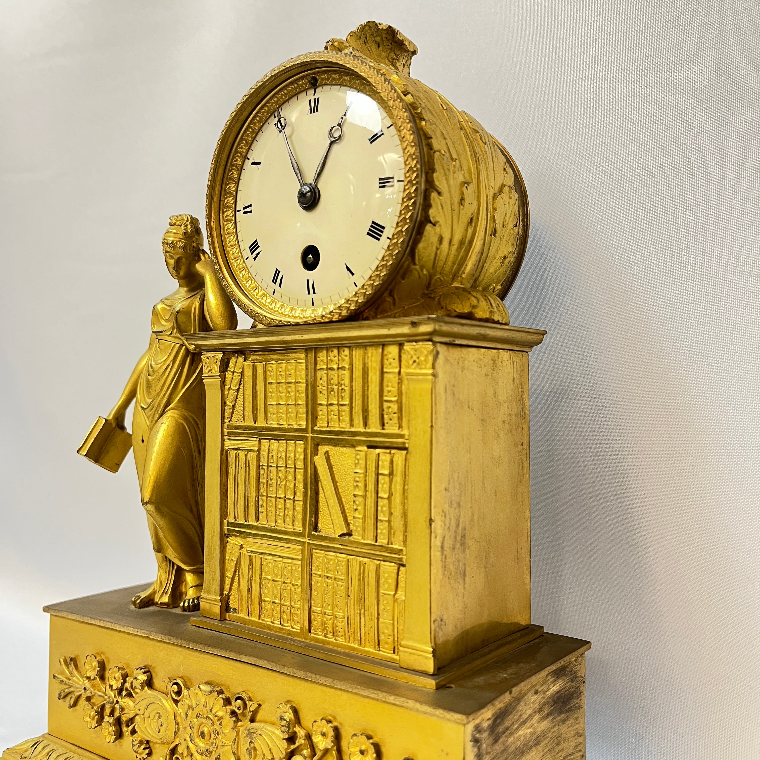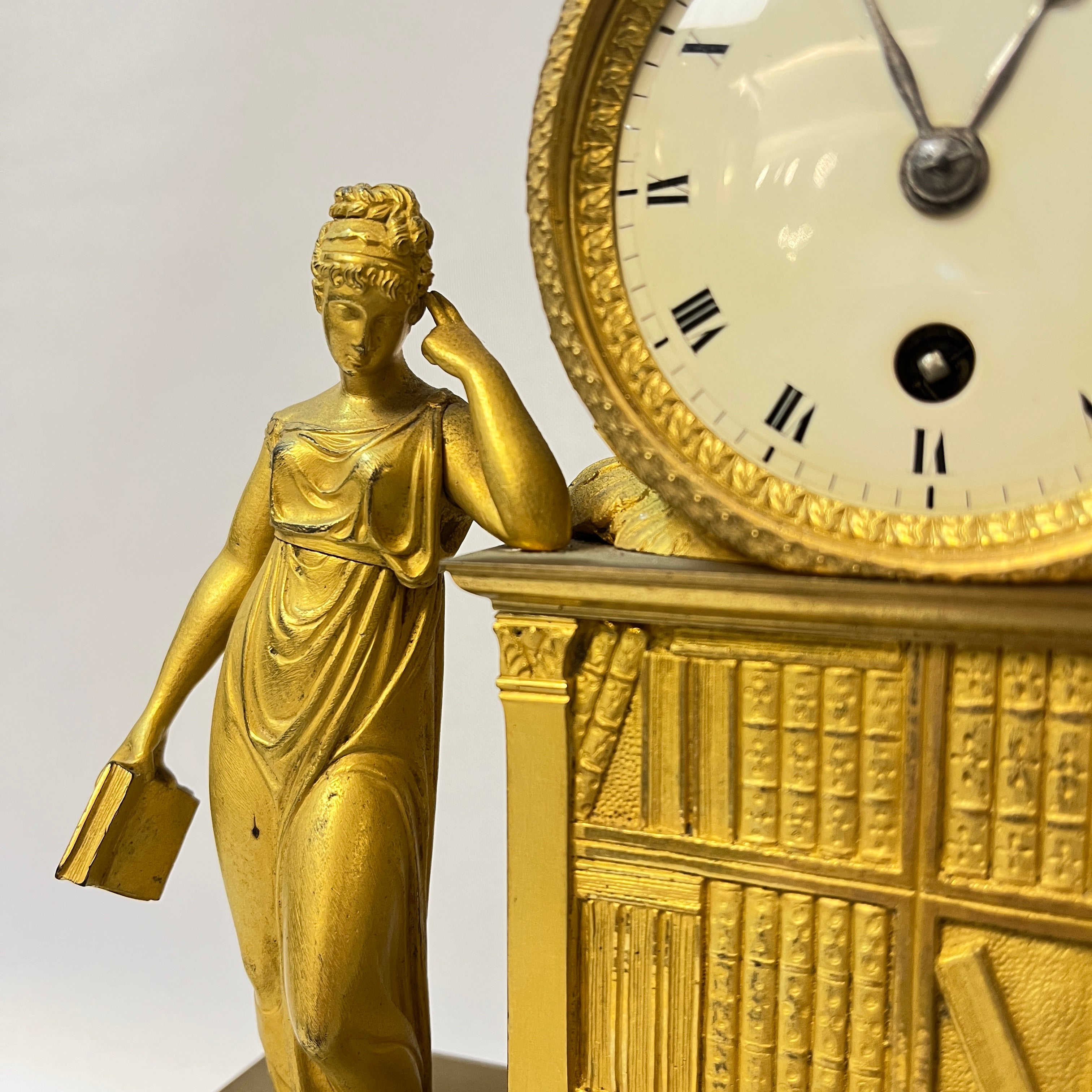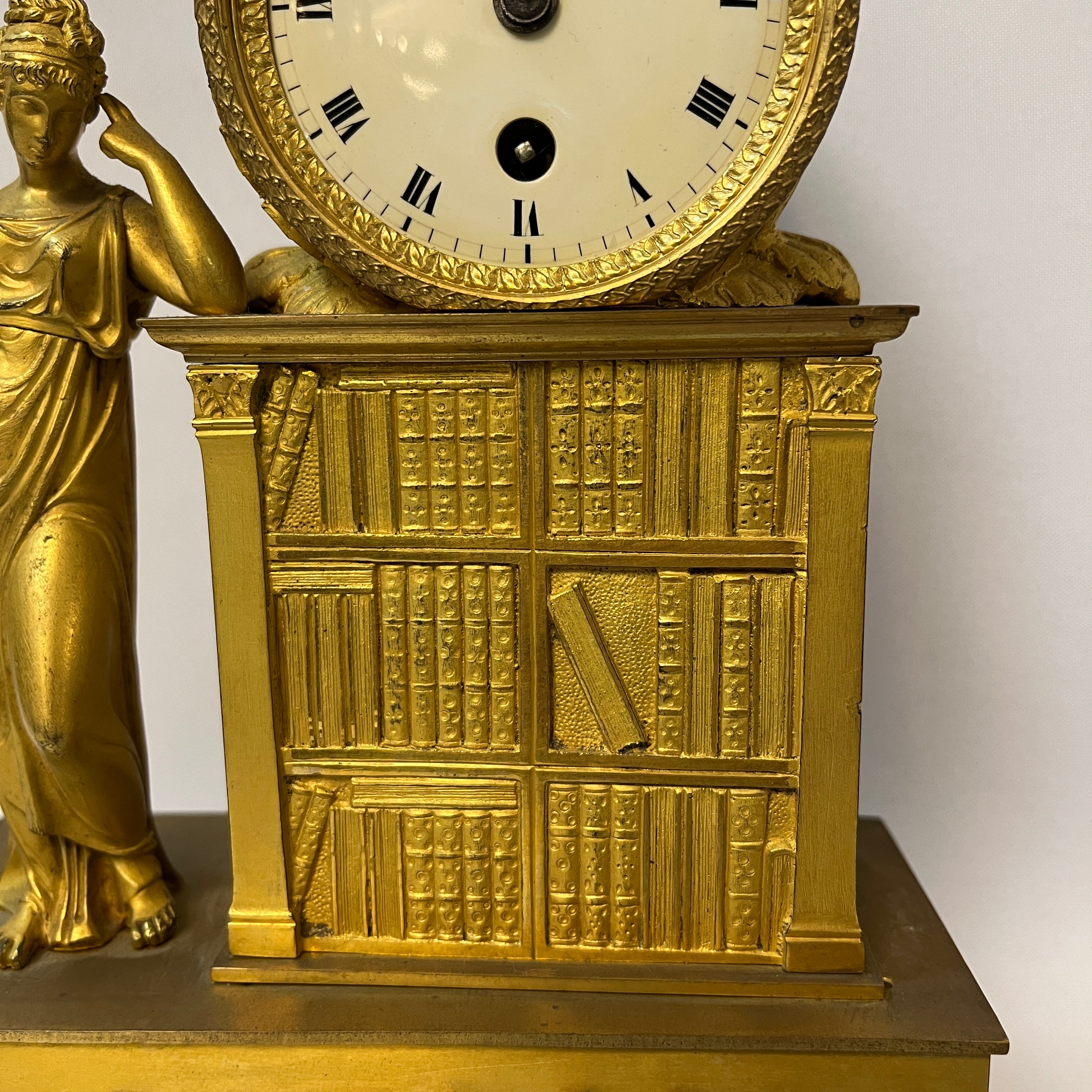 Este reloj de sobremesa, conocido como pendulette, es una pieza decorativa clásica de los hogares Franceses del siglo XIX, expuesta generalmente en los espacios comunes. Está hecho con una técnica llamada Ormolú, que consiste en cubrir el bronce con oro y mercurio para darle un color dorado. La figura muestra a una mujer junto a una biblioteca, representando una alegoría a la sabiduría y el estudio.