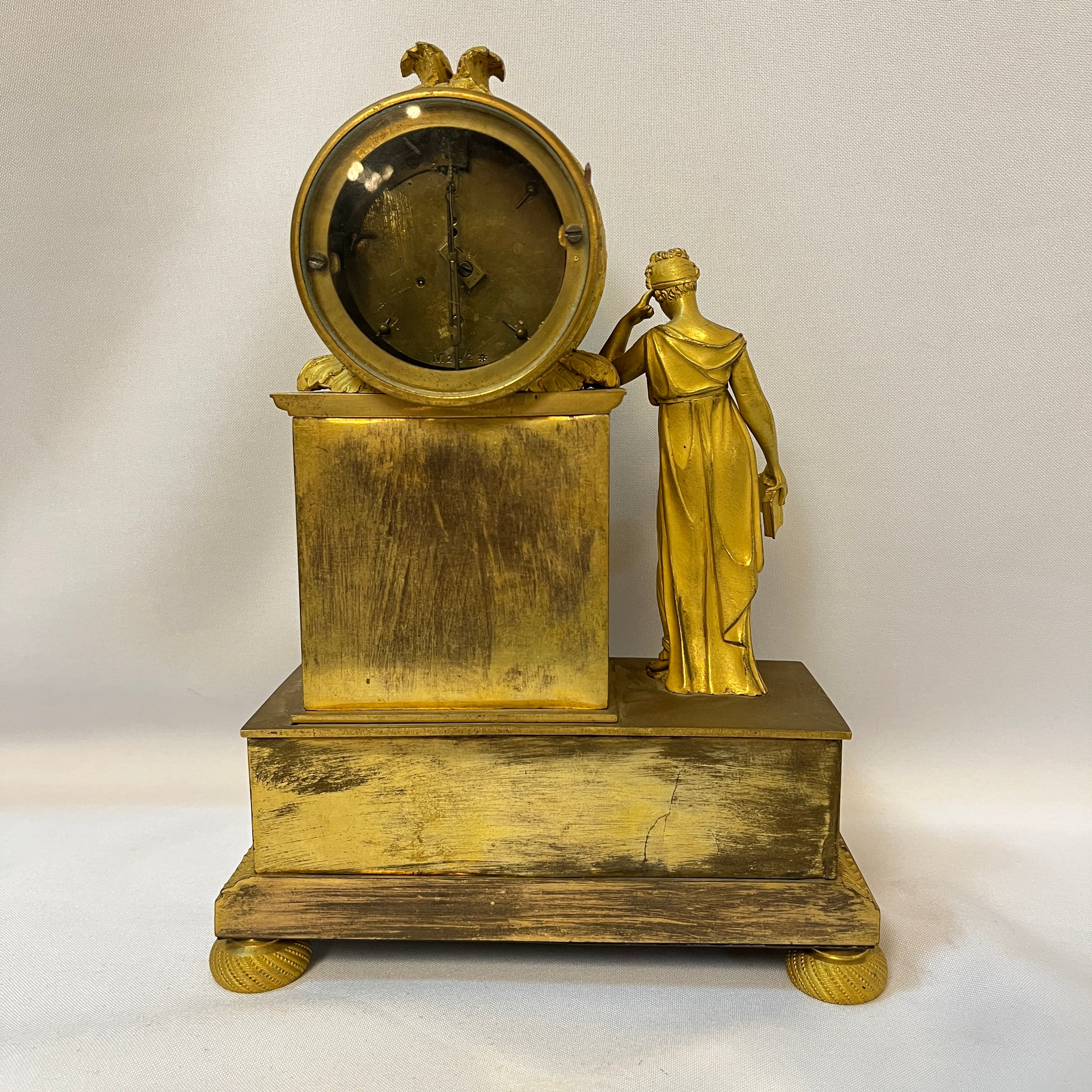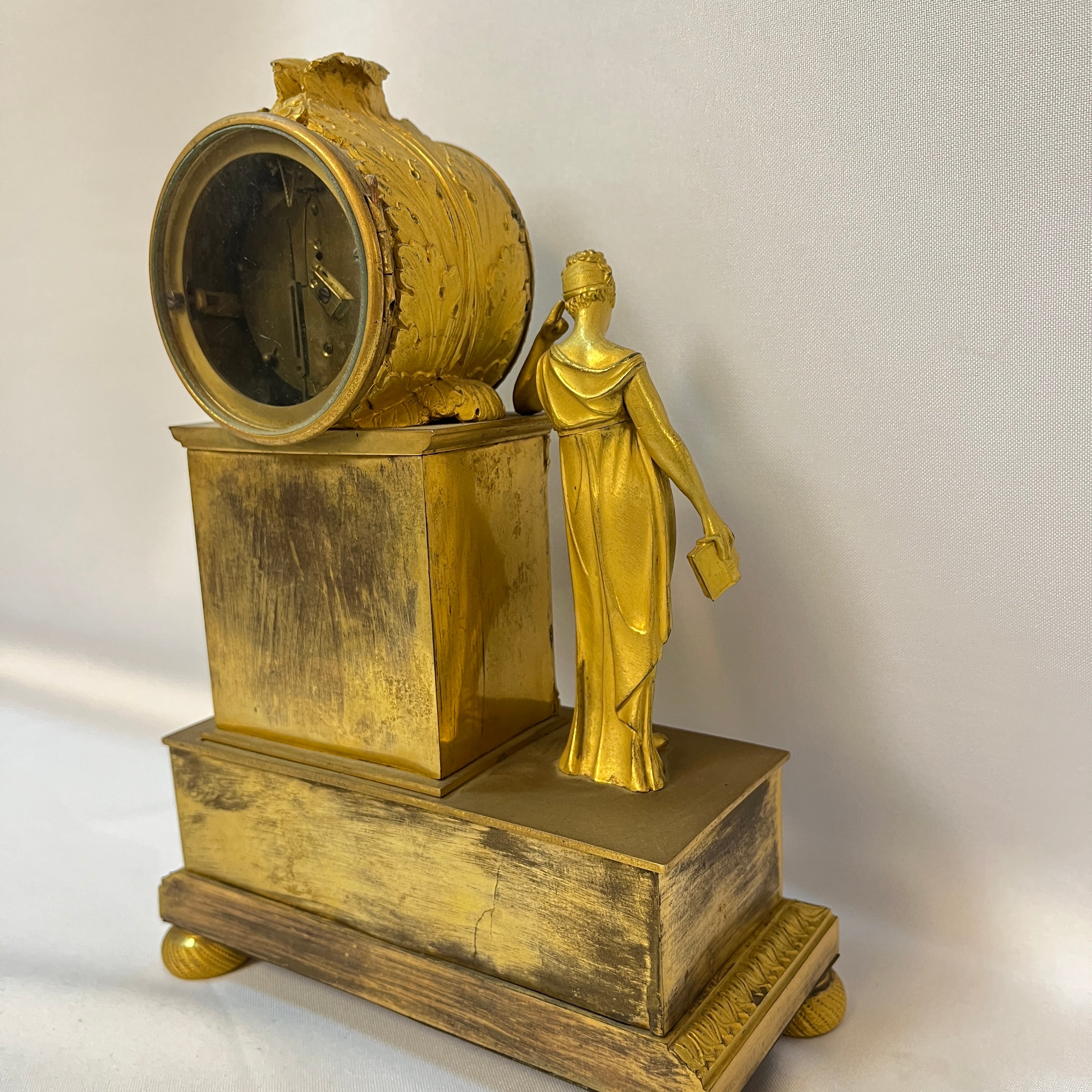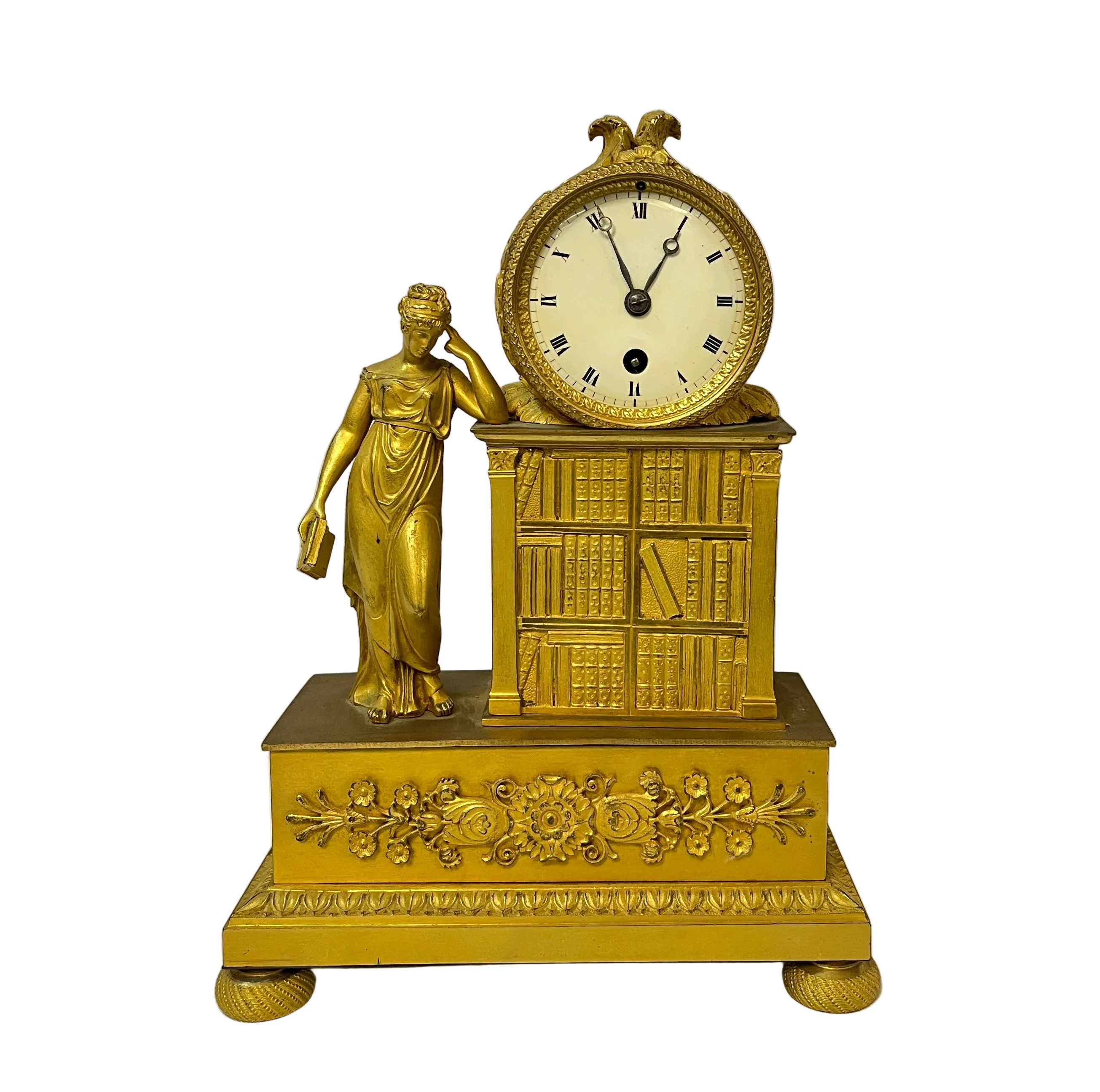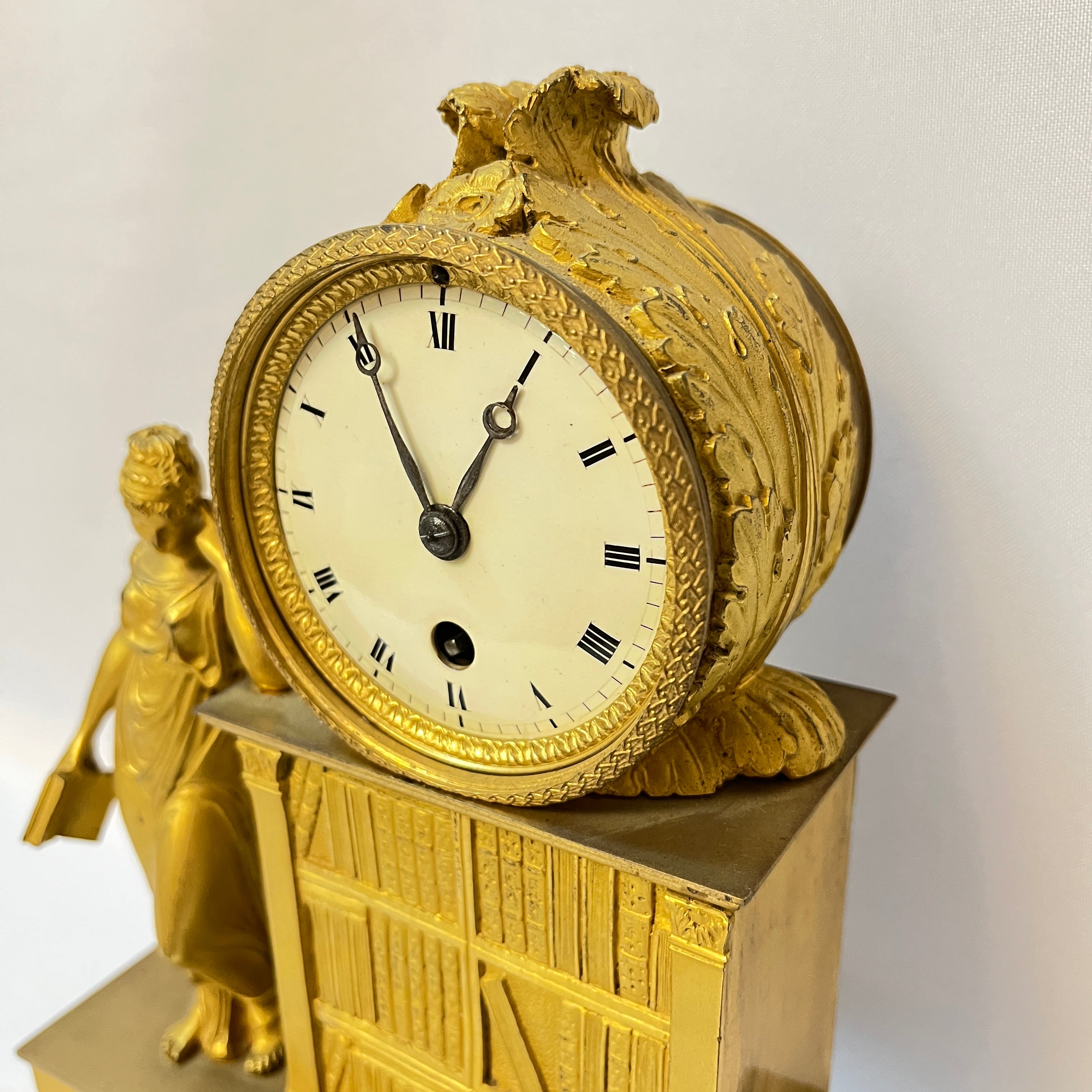 Este reloj de sobremesa, conocido como pendulette, es una pieza decorativa clásica de los hogares Franceses del siglo XIX, expuesta generalmente en los espacios comunes. Está hecho con una técnica llamada Ormolú, que consiste en cubrir el bronce con oro y mercurio para darle un color dorado. La figura muestra a una mujer junto a una biblioteca, representando una alegoría a la sabiduría y el estudio.