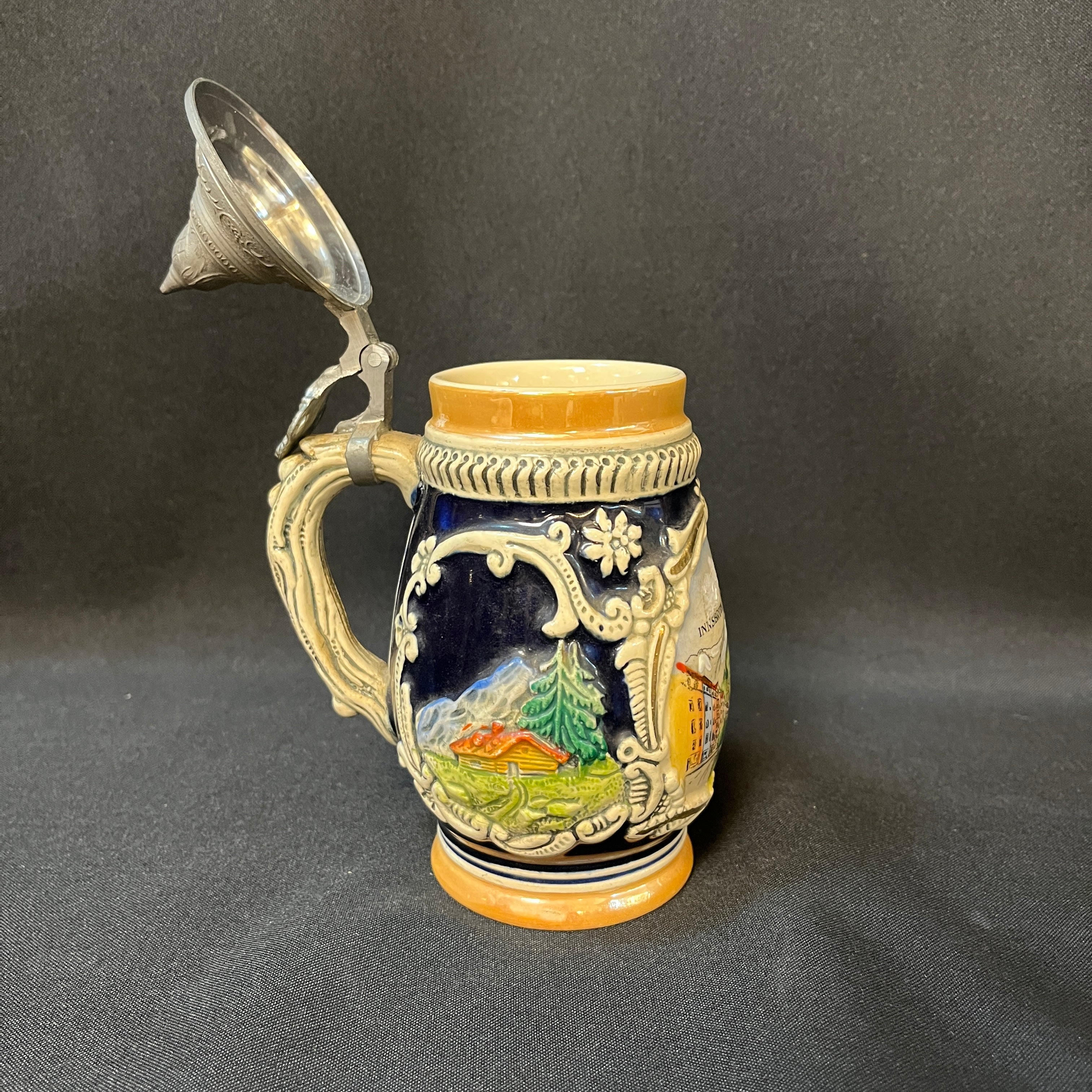 Shopero alemán de porcelana de pequeño tamaño con tapa de peltre. La jarra presenta la escena central es la clásica plaza María Theresien, en Innsbruck, coronada con bellos rosetones blancos y detalles dorados, que se extienden hacia los lado donde nos encontramos con una capilla y una casa rural por el otro