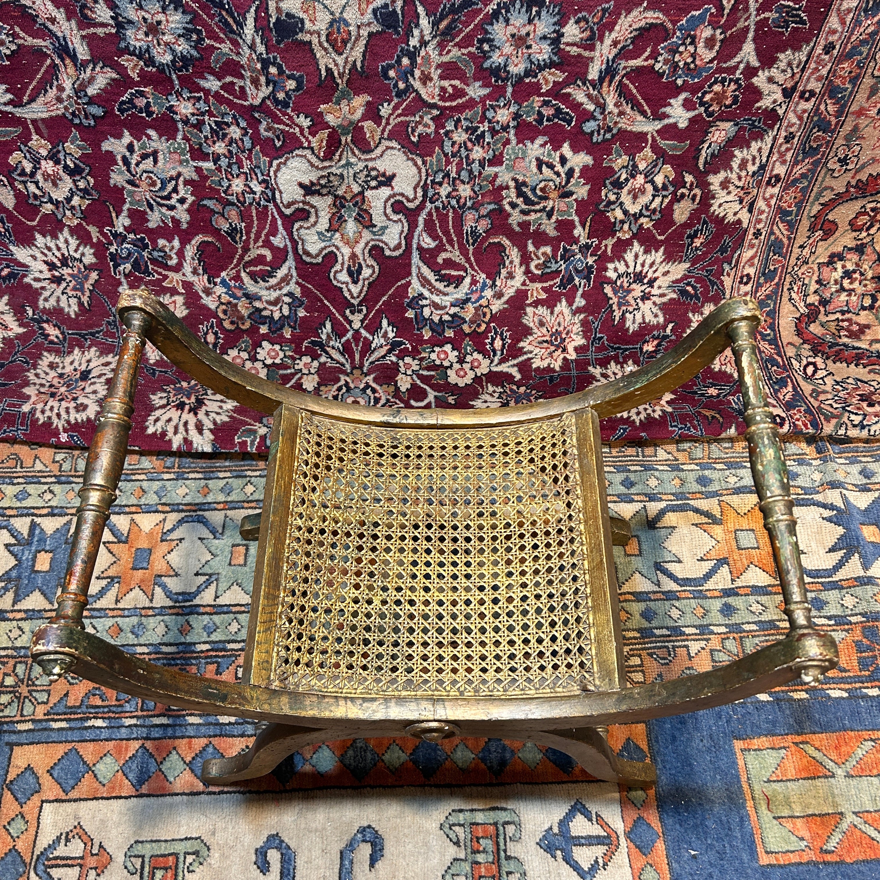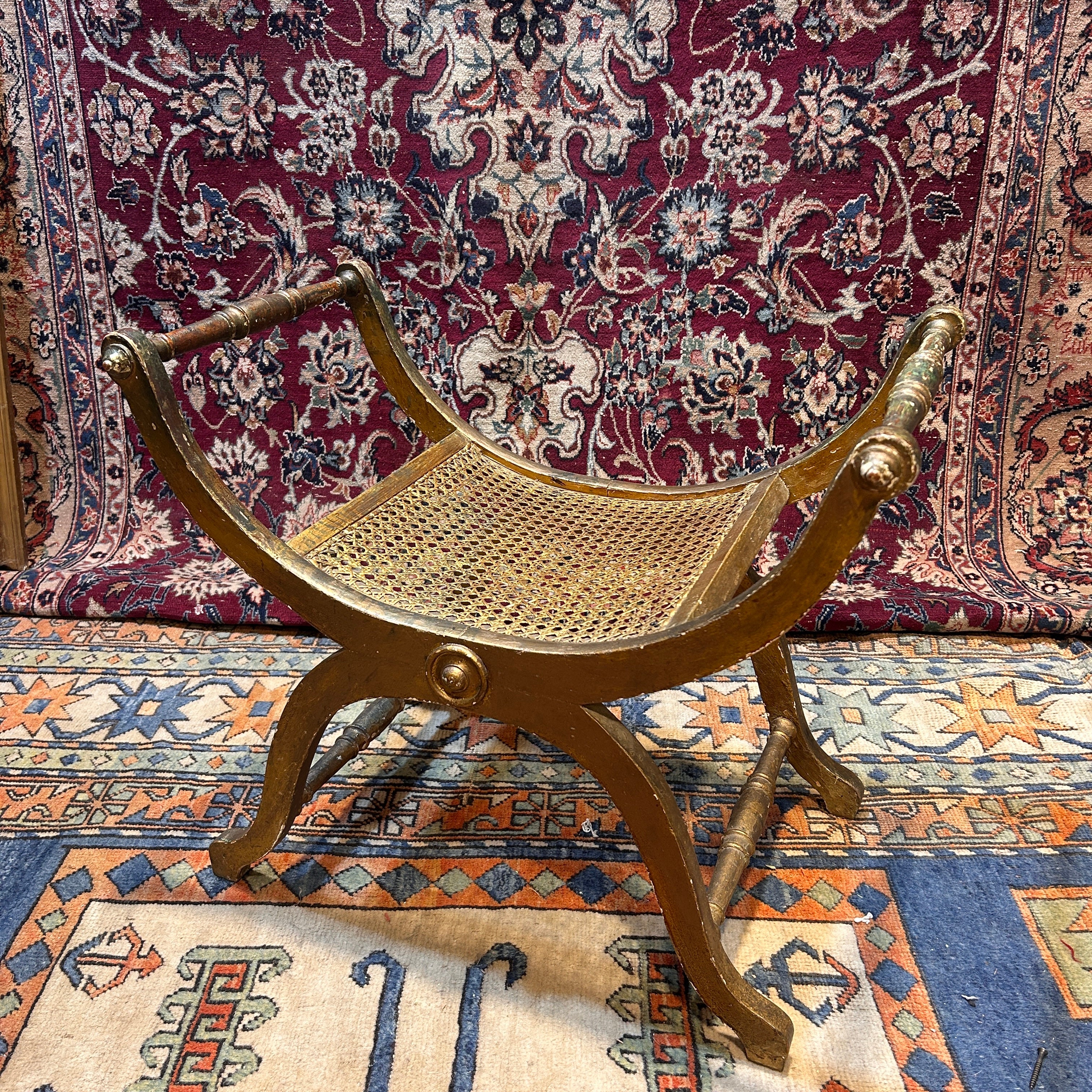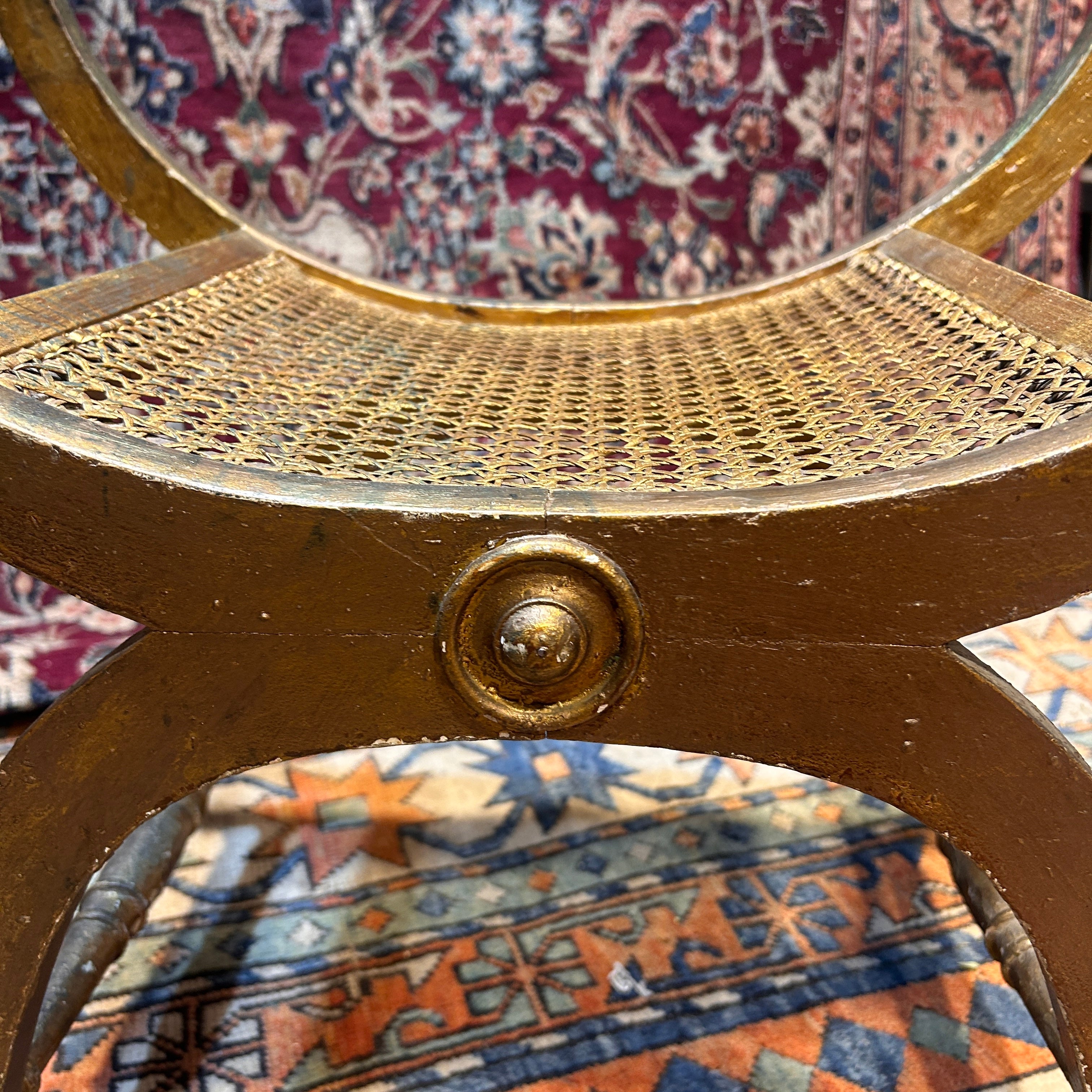 Taburete curul francés estilo Luis XVI del siglo XIX, trabajado en madera tallada con acabado en pan de oro conn desgaste natural de su pátina. La pieza se define por su silueta en "X", con soportes curvos que se unen en un eje central decorado con un rosetón circular. Francia, s.XIX