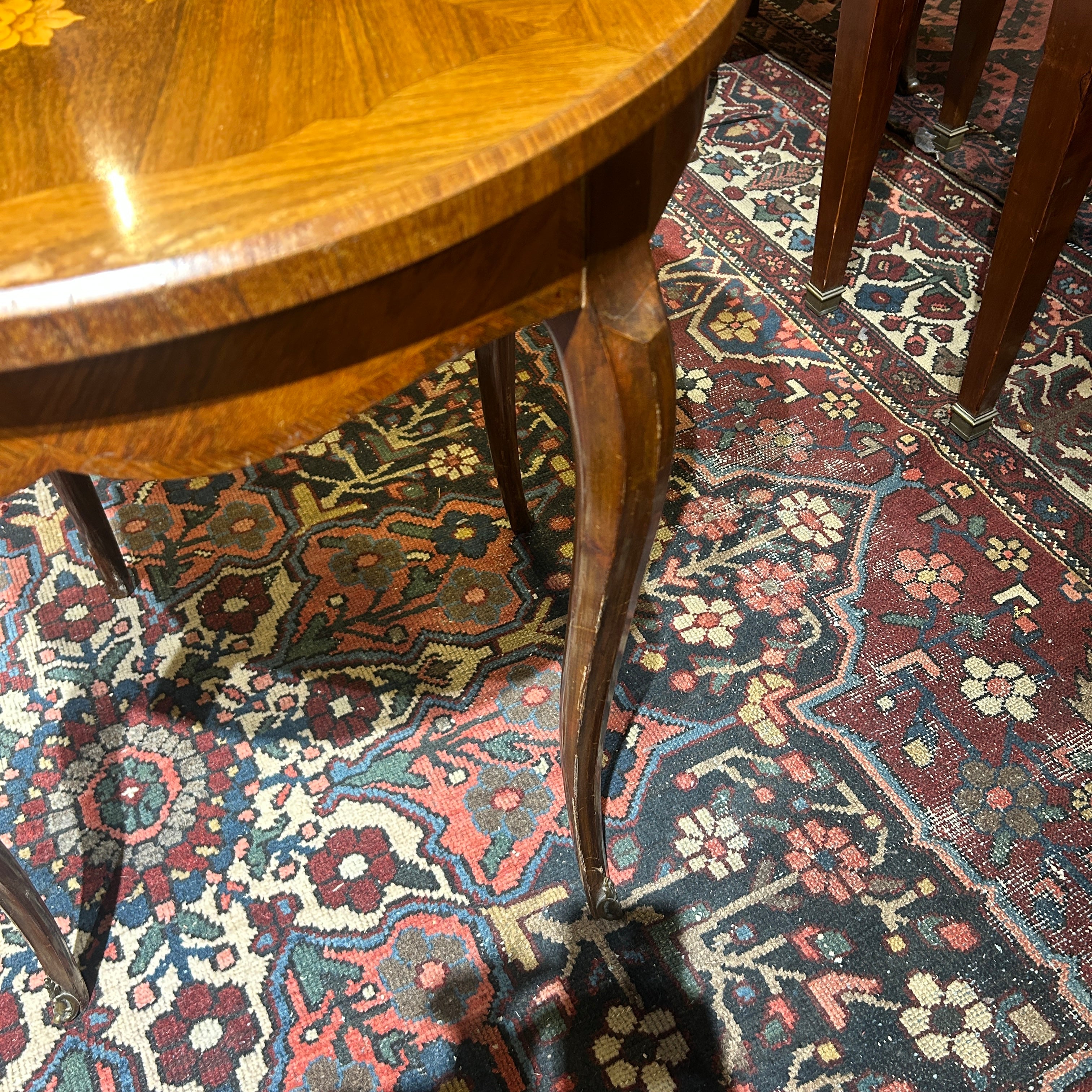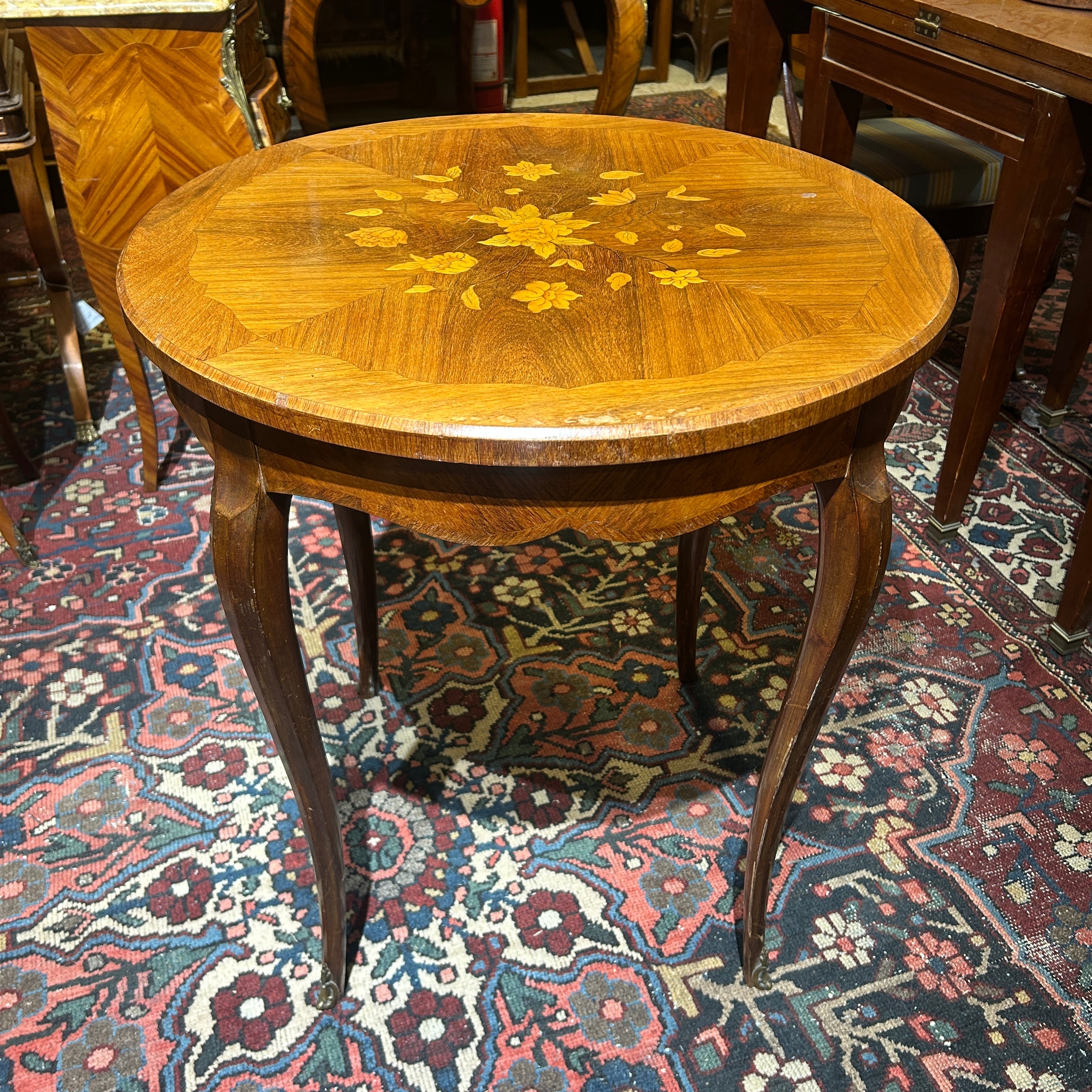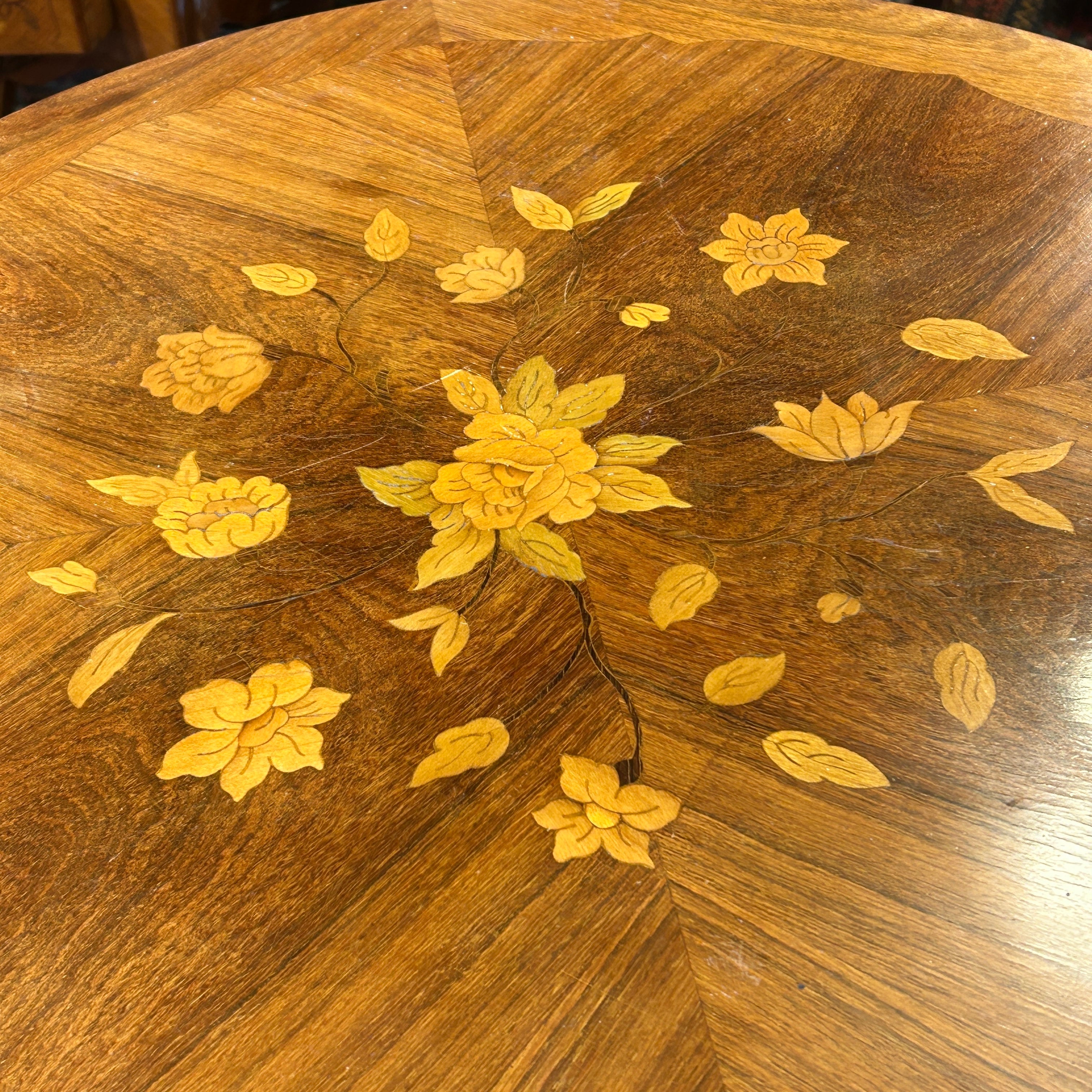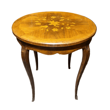 Preciosa mesa Guéridon francesa estilo Luis XV, en madera enchapada, marquetería central con bellos motivos florales, patas cabriolé y tacos de bronce.