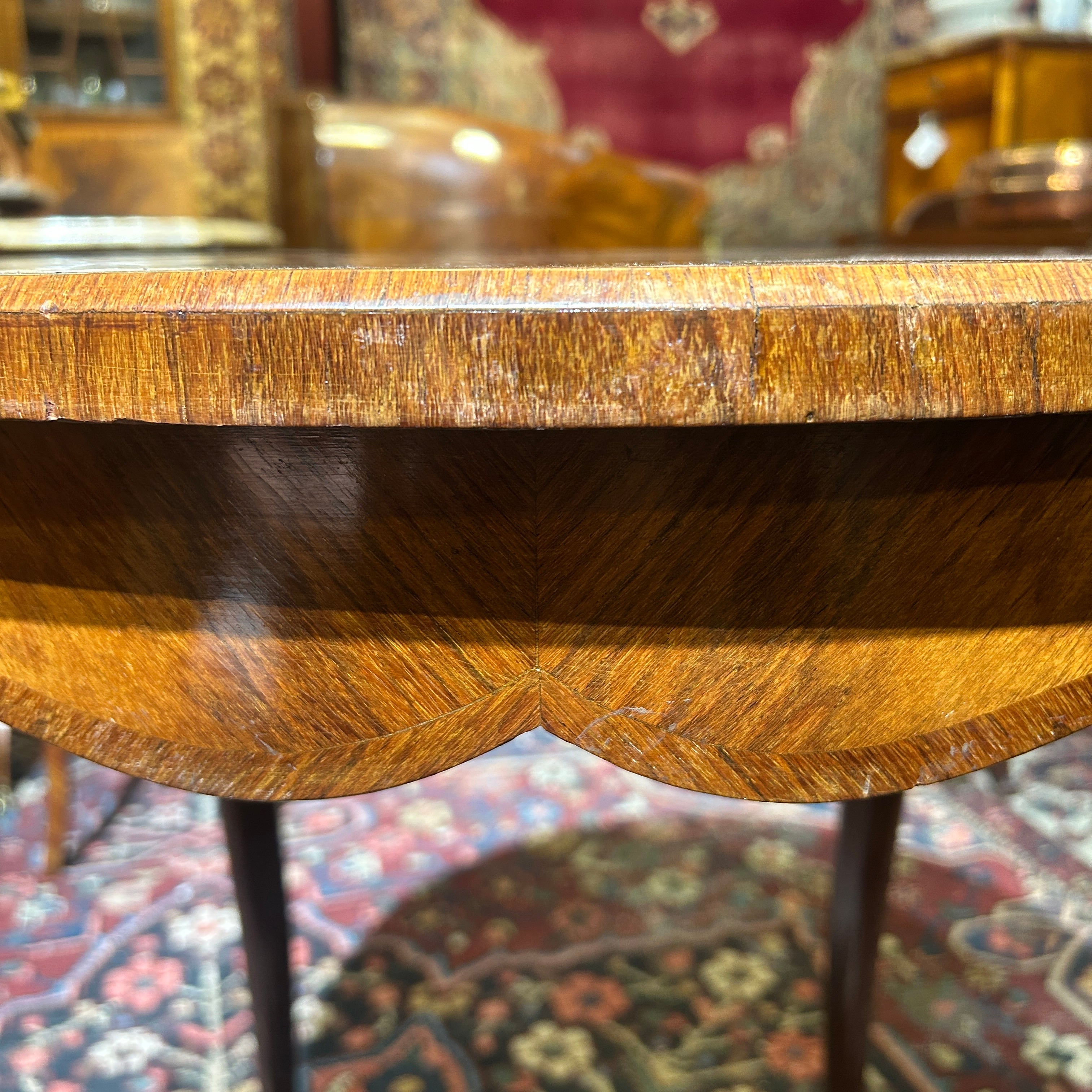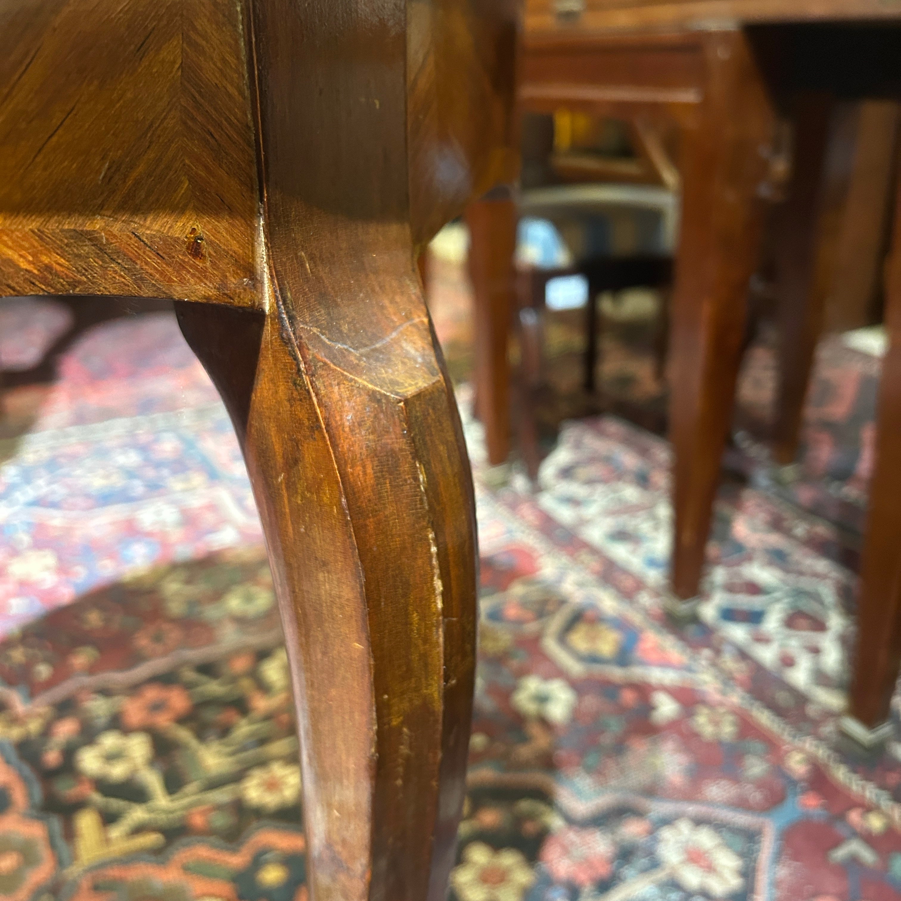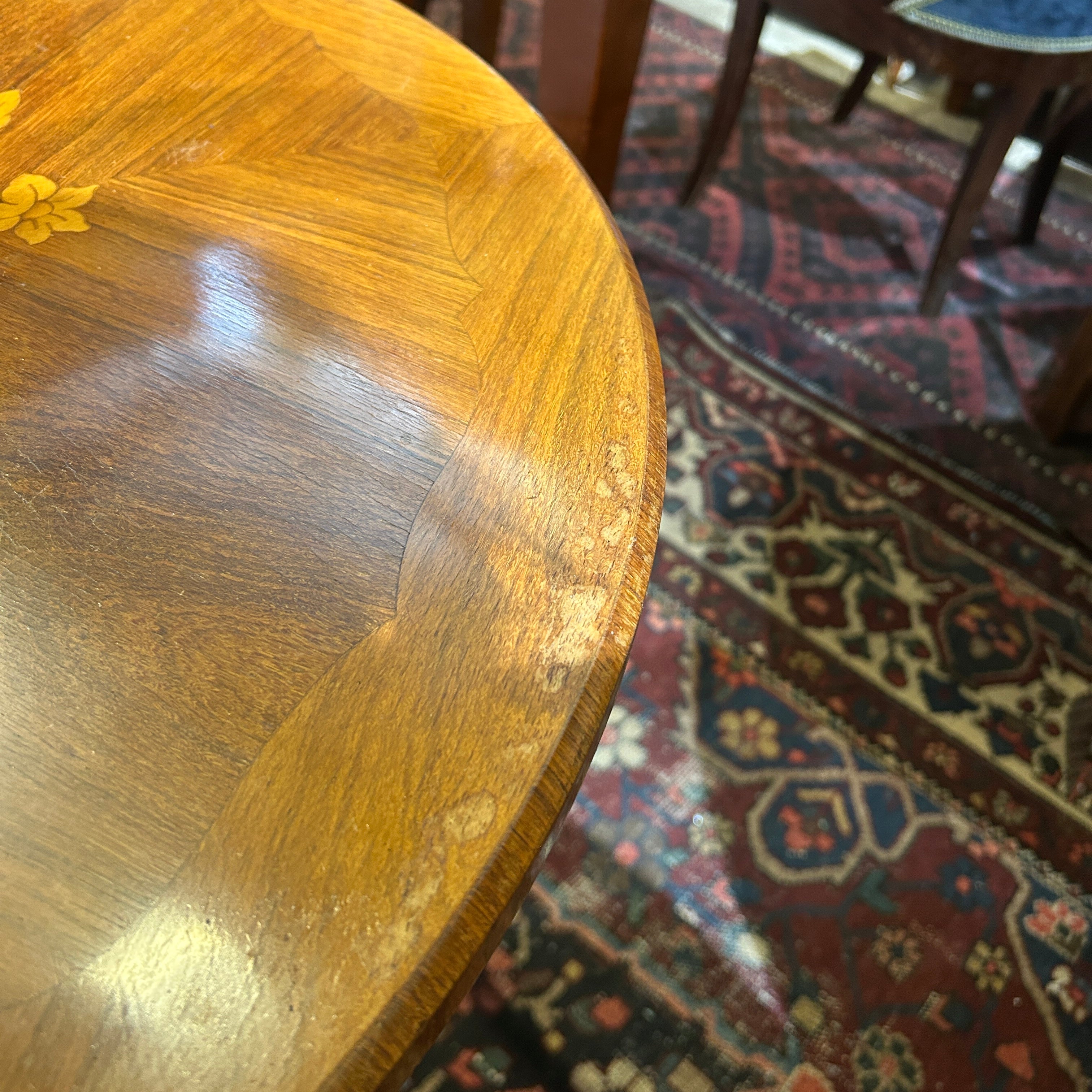 Preciosa mesa Guéridon francesa estilo Luis XV, en madera enchapada, marquetería central con bellos motivos florales, patas cabriolé y tacos de bronce.