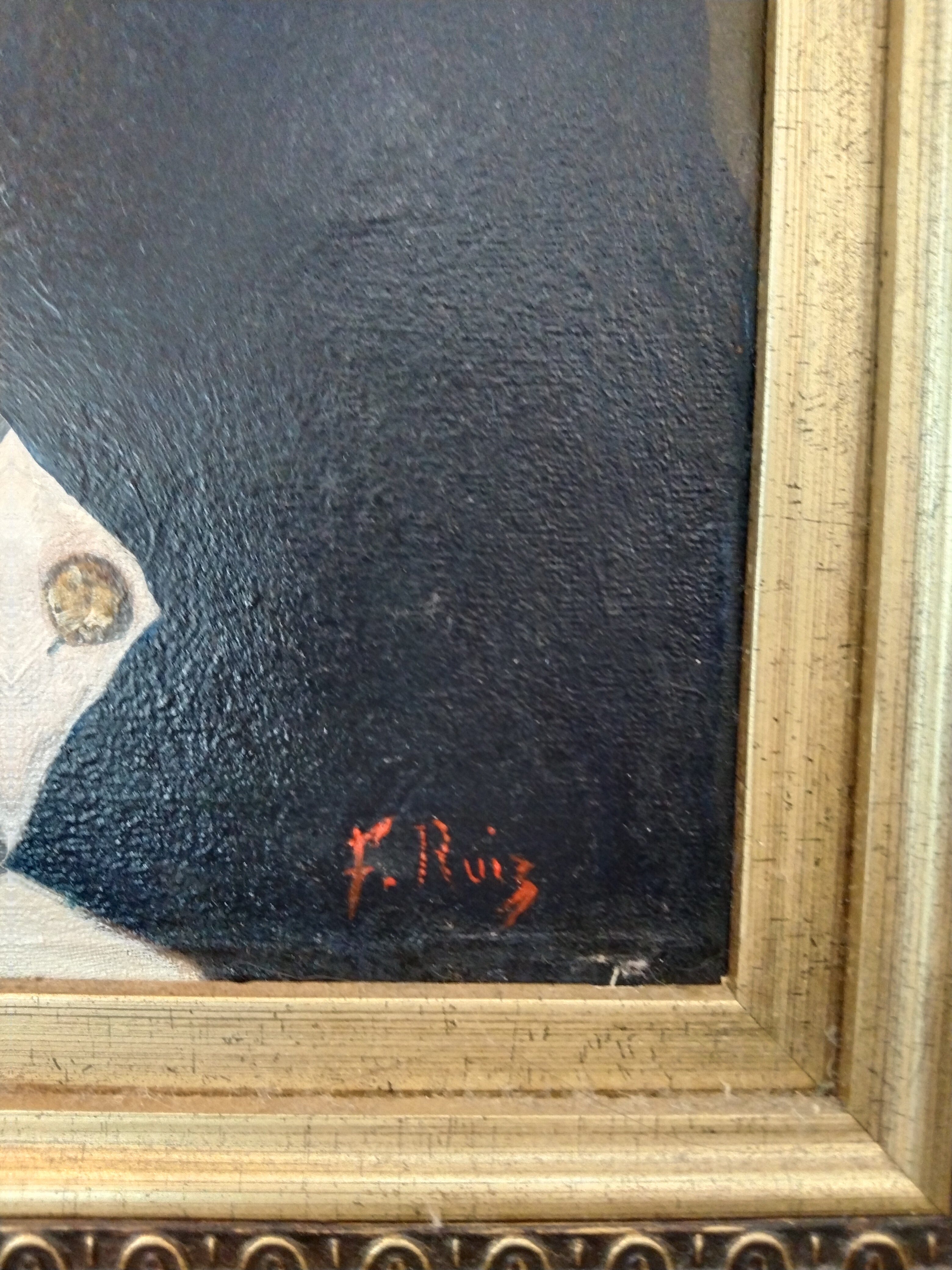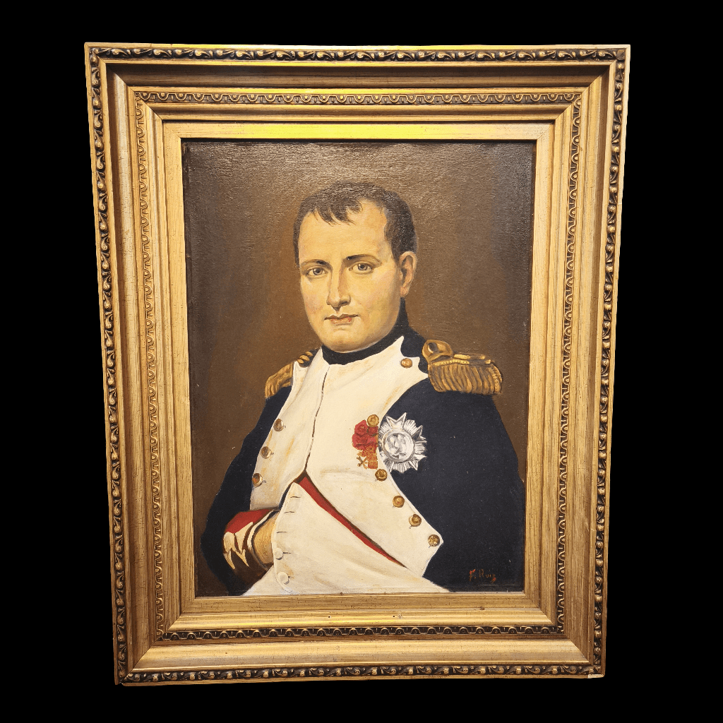 Óleo sobre madera del pintor chileno Fernando Ruíz, retratando a Napoleón Bonaparte. La obra está enmarcada en madera dorada.