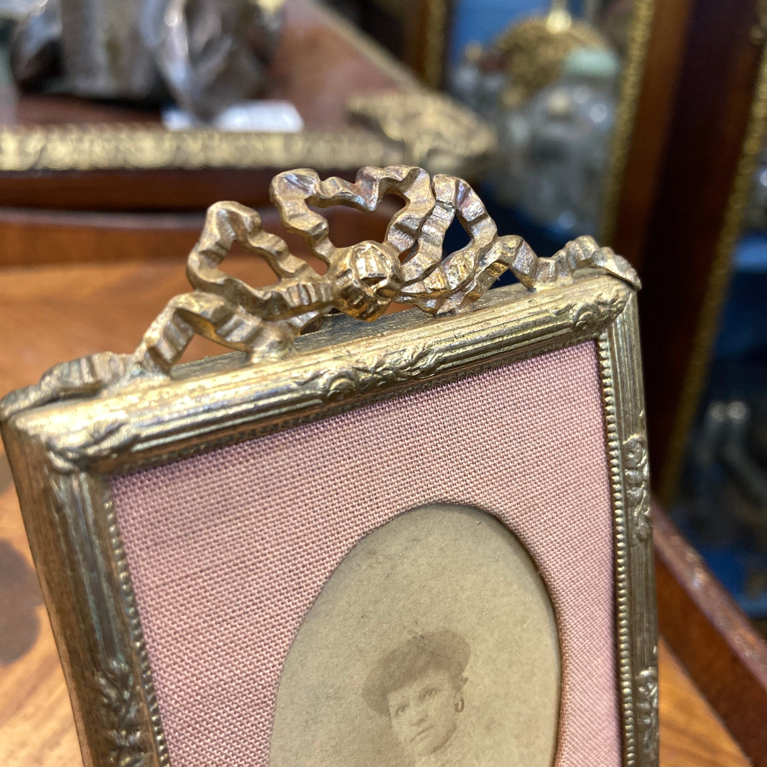 Hermoso y delicado portarretrato con estructura de bronce. Su diseño rectángulo y el rosetón en su centro, le brindan elegancia y un toque antiguo especial.