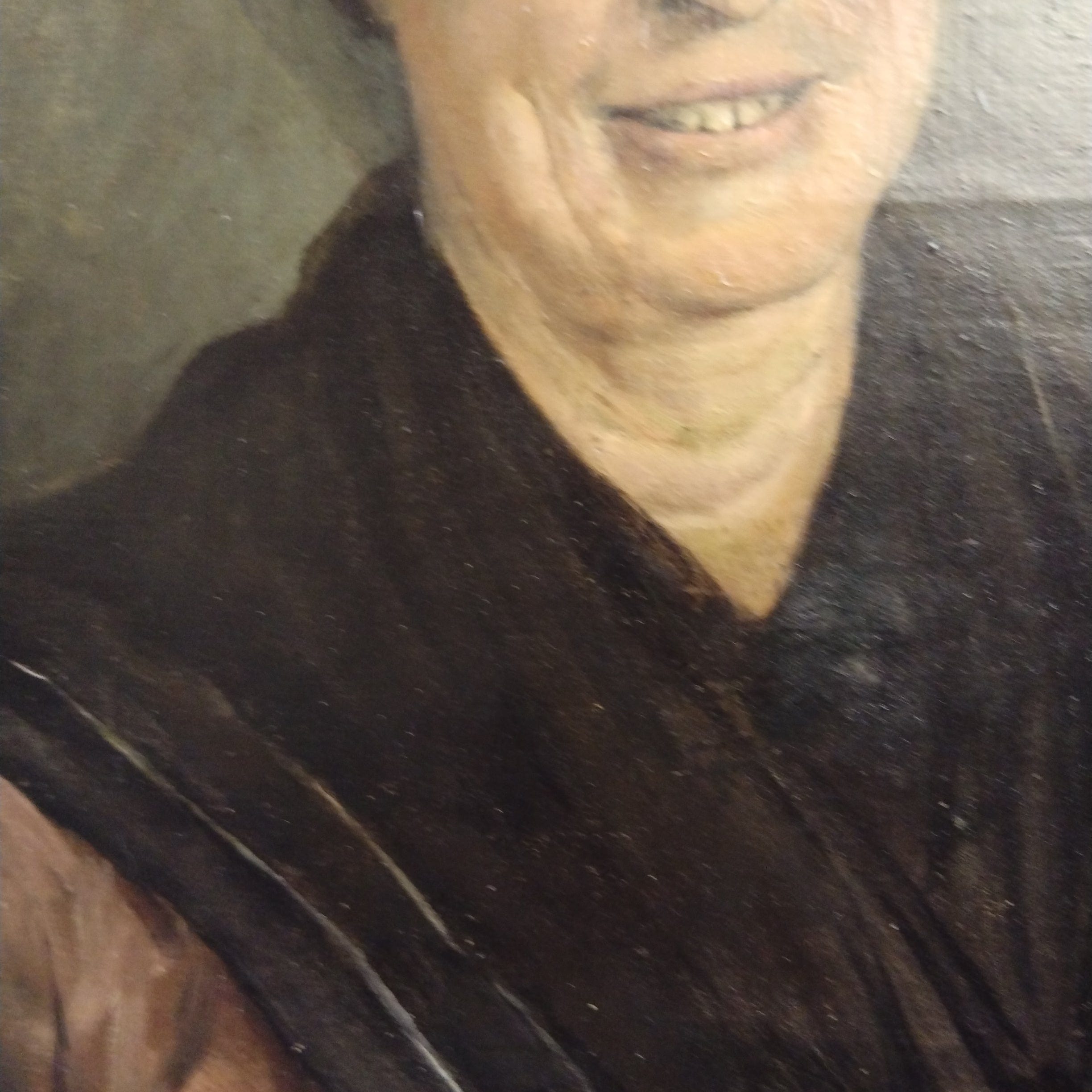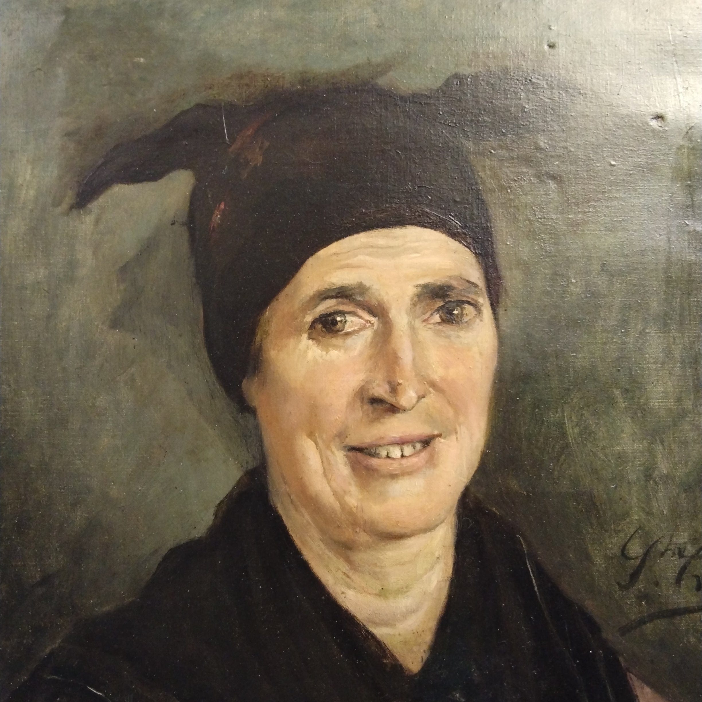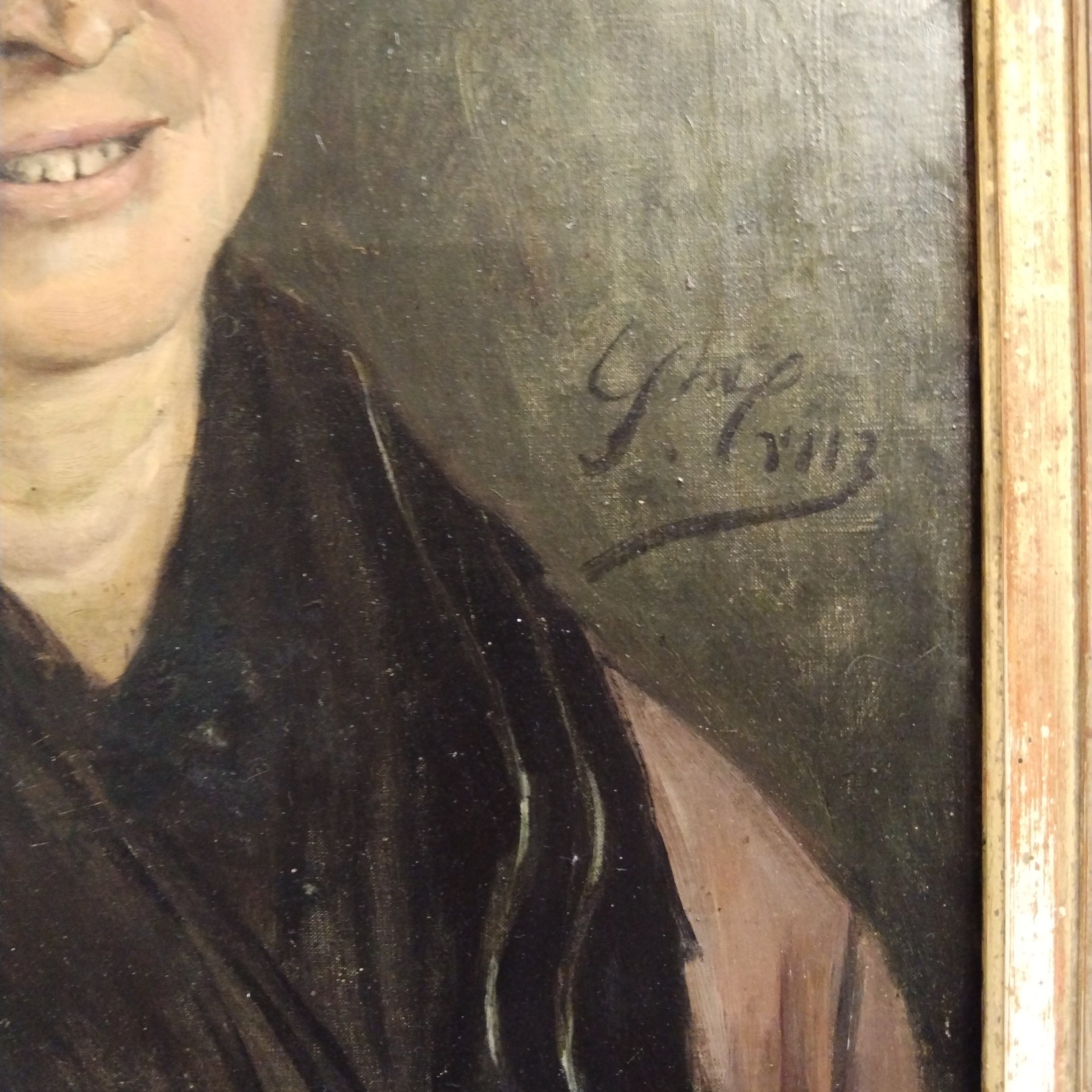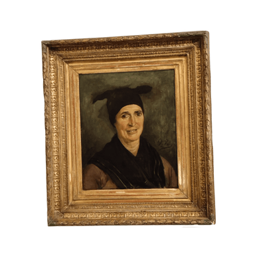 Óleo sobre tela, de origen Europeo, retratando detalladamente a una mujer de unos 60 años en atuendo de campesina, sonriendo. El cuadro tiene un bello marco de madera tallada y pintada en dorado.