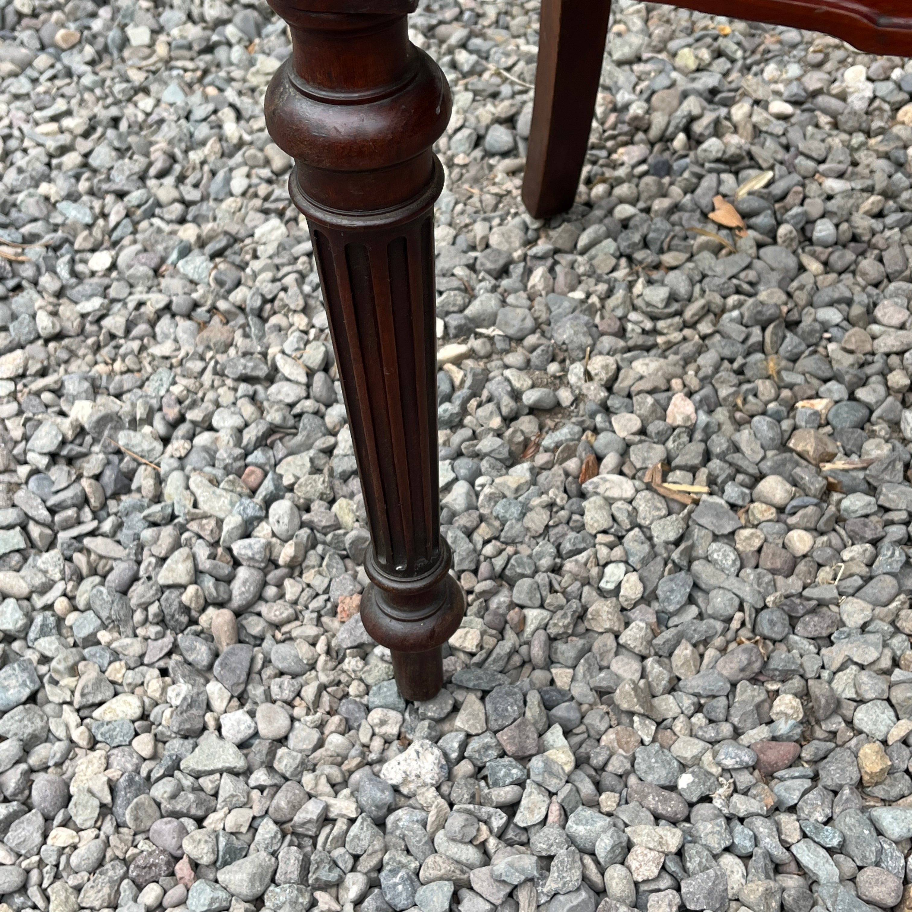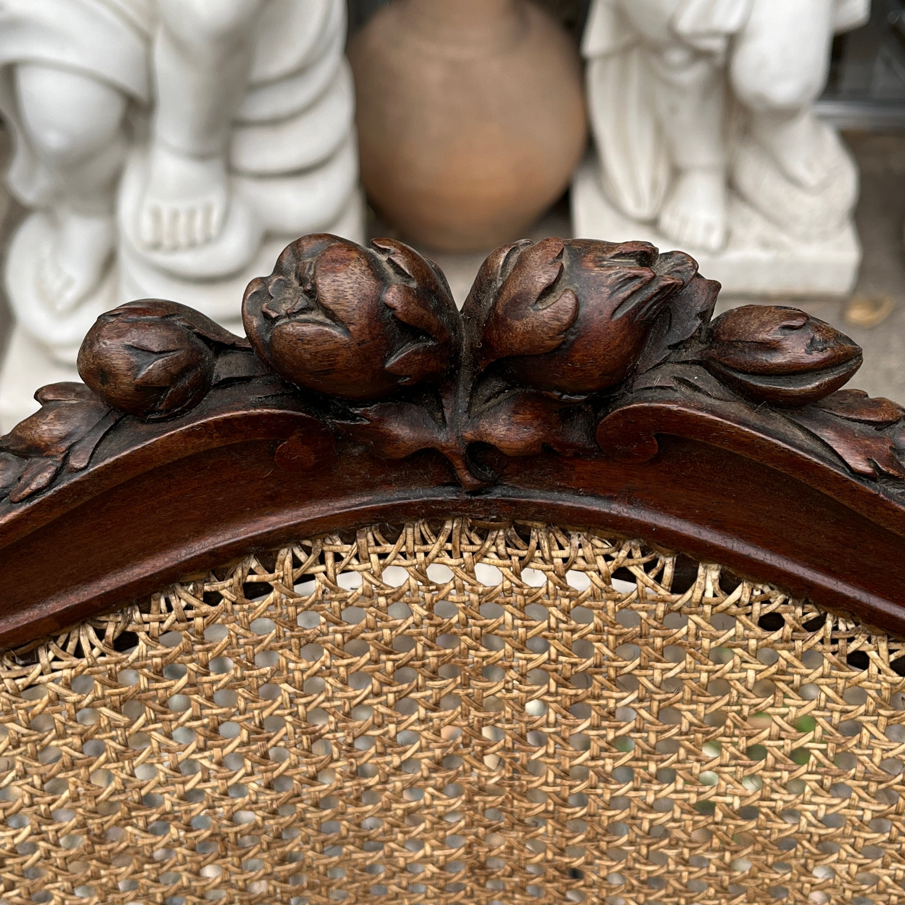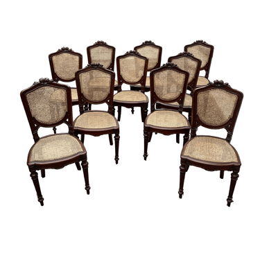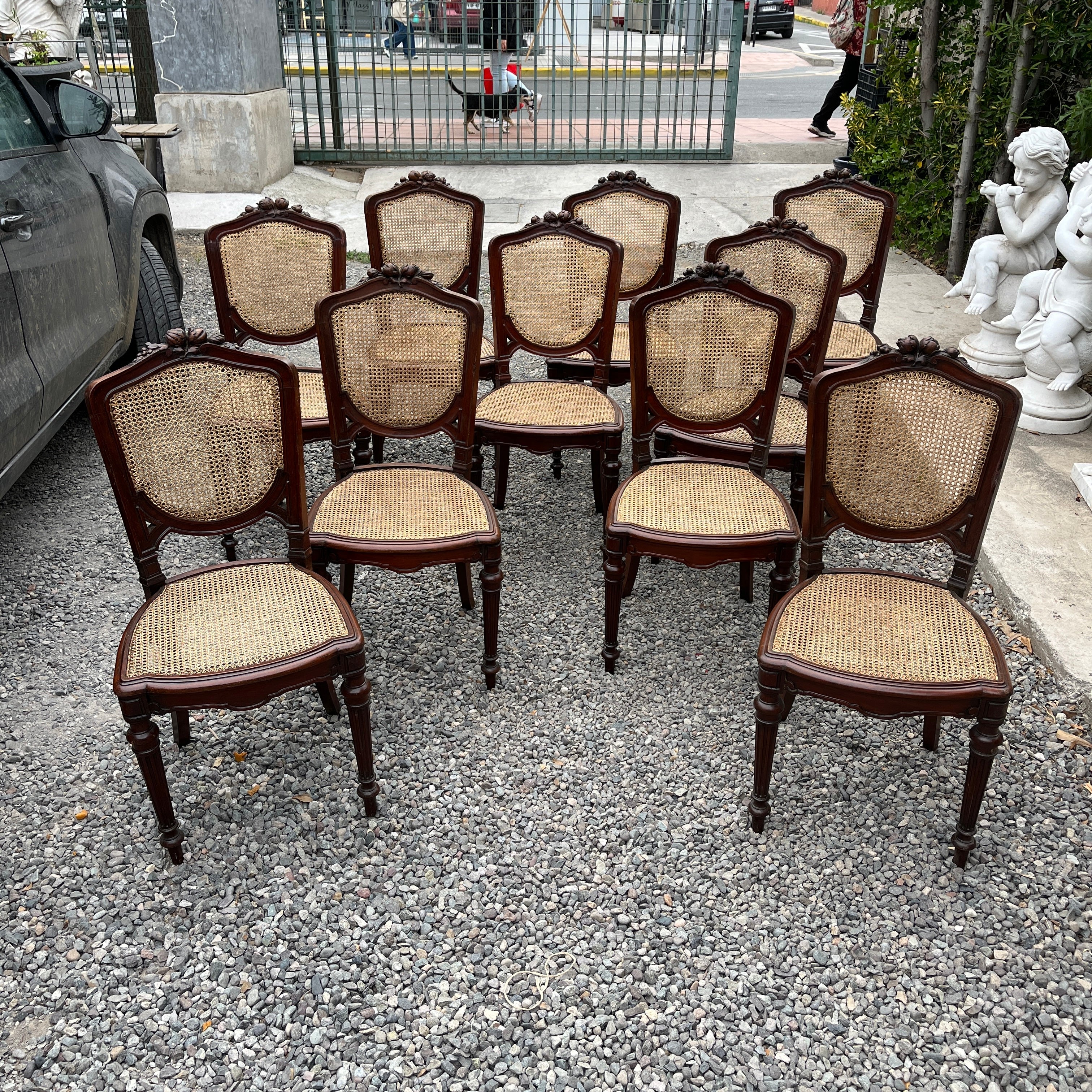 Elegante juego de 10 sillas francesas estilo Louis Philippe, hechas de madera de caoba tallada con bellos decorados florales en su respaldo, patas torneadas y un enjuncado impecable enjuncado, también en su respaldo y asiento.