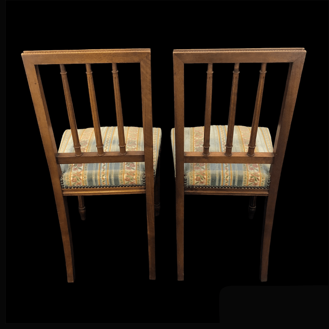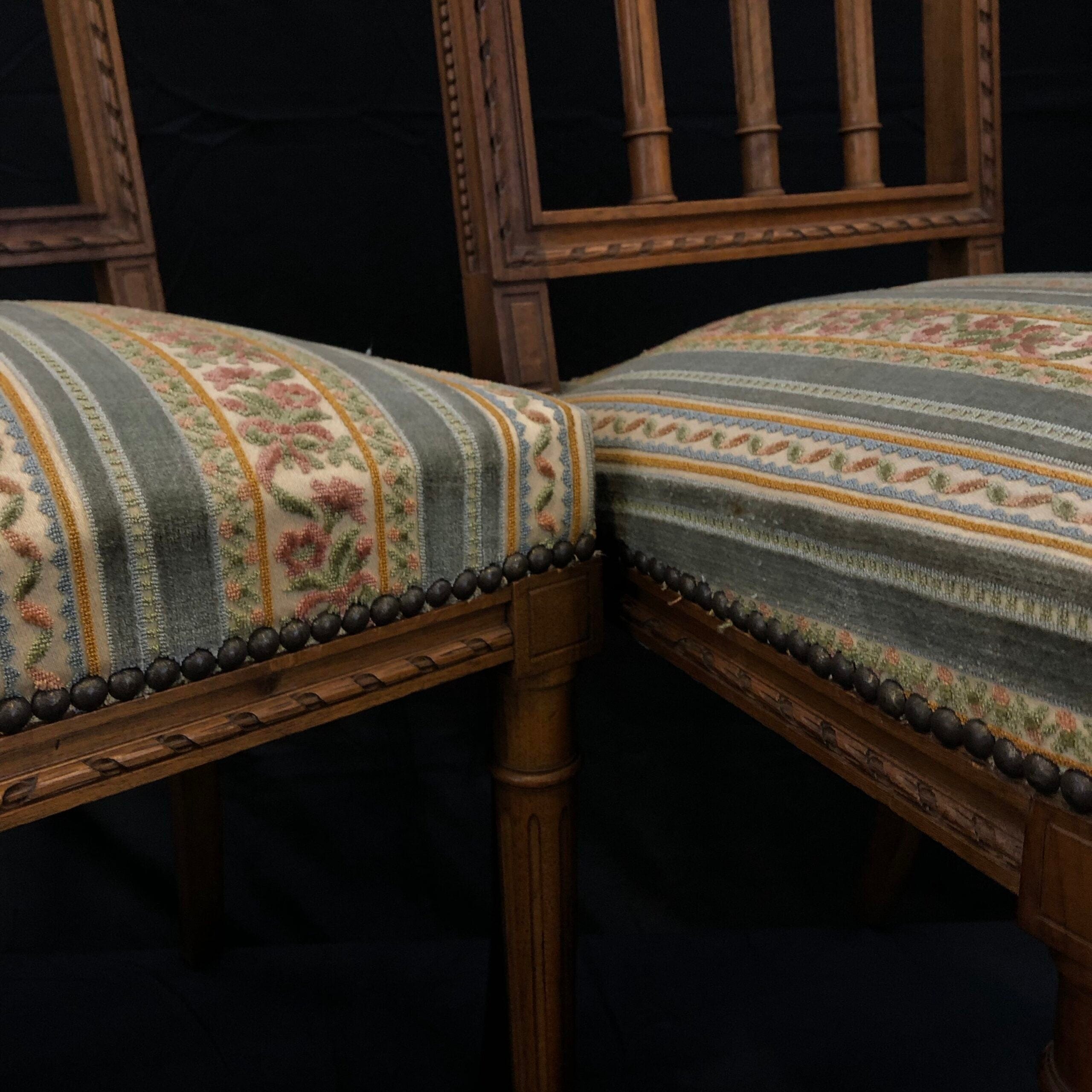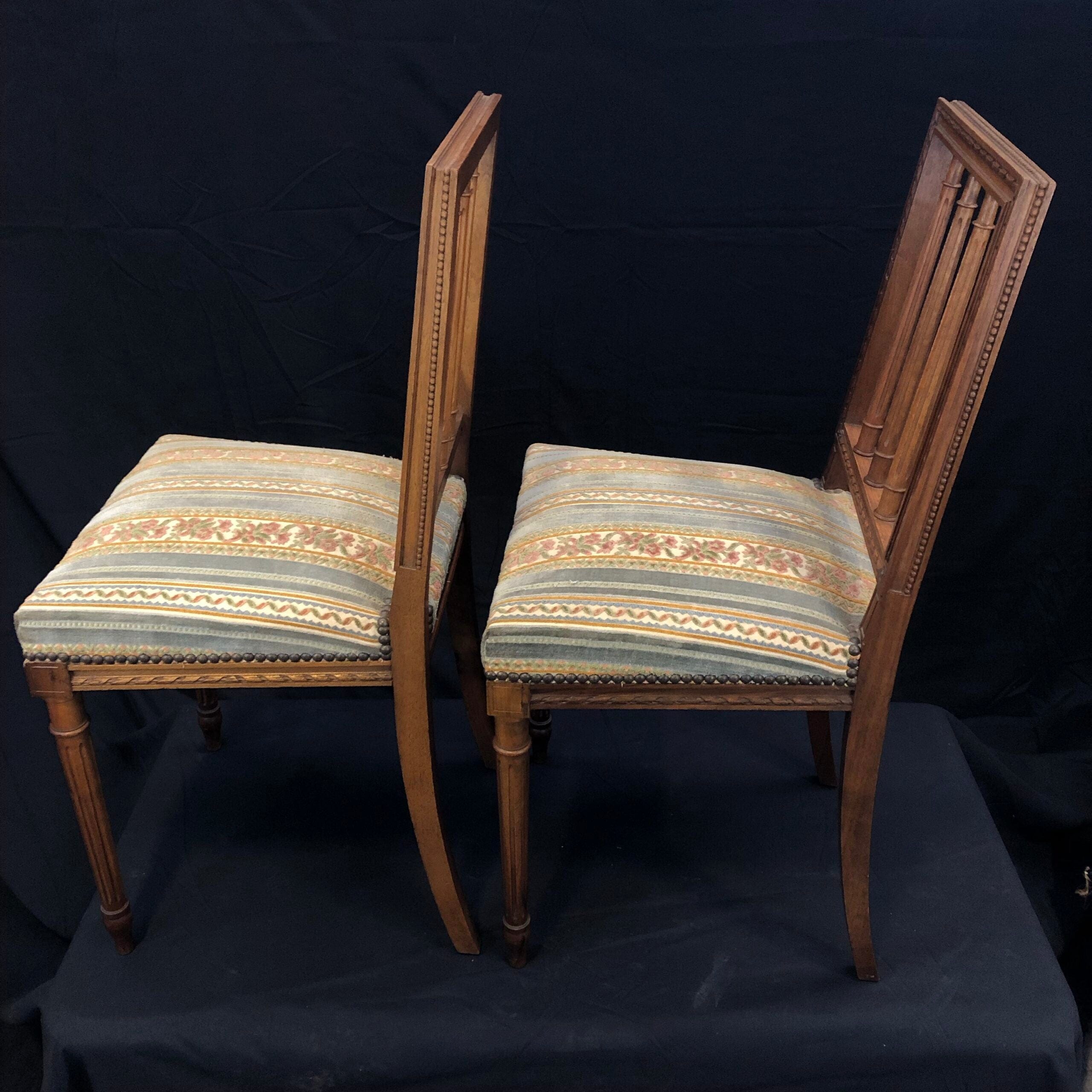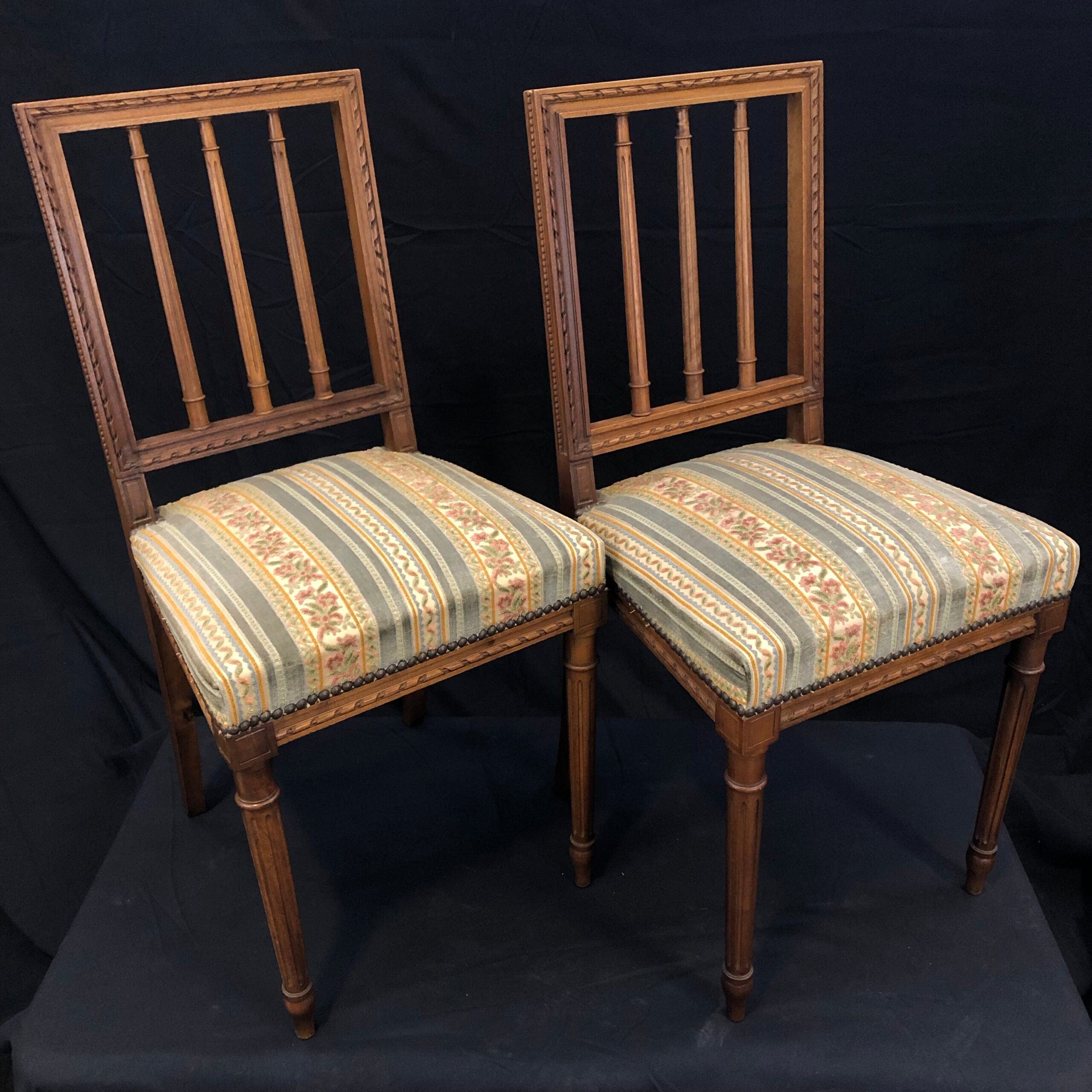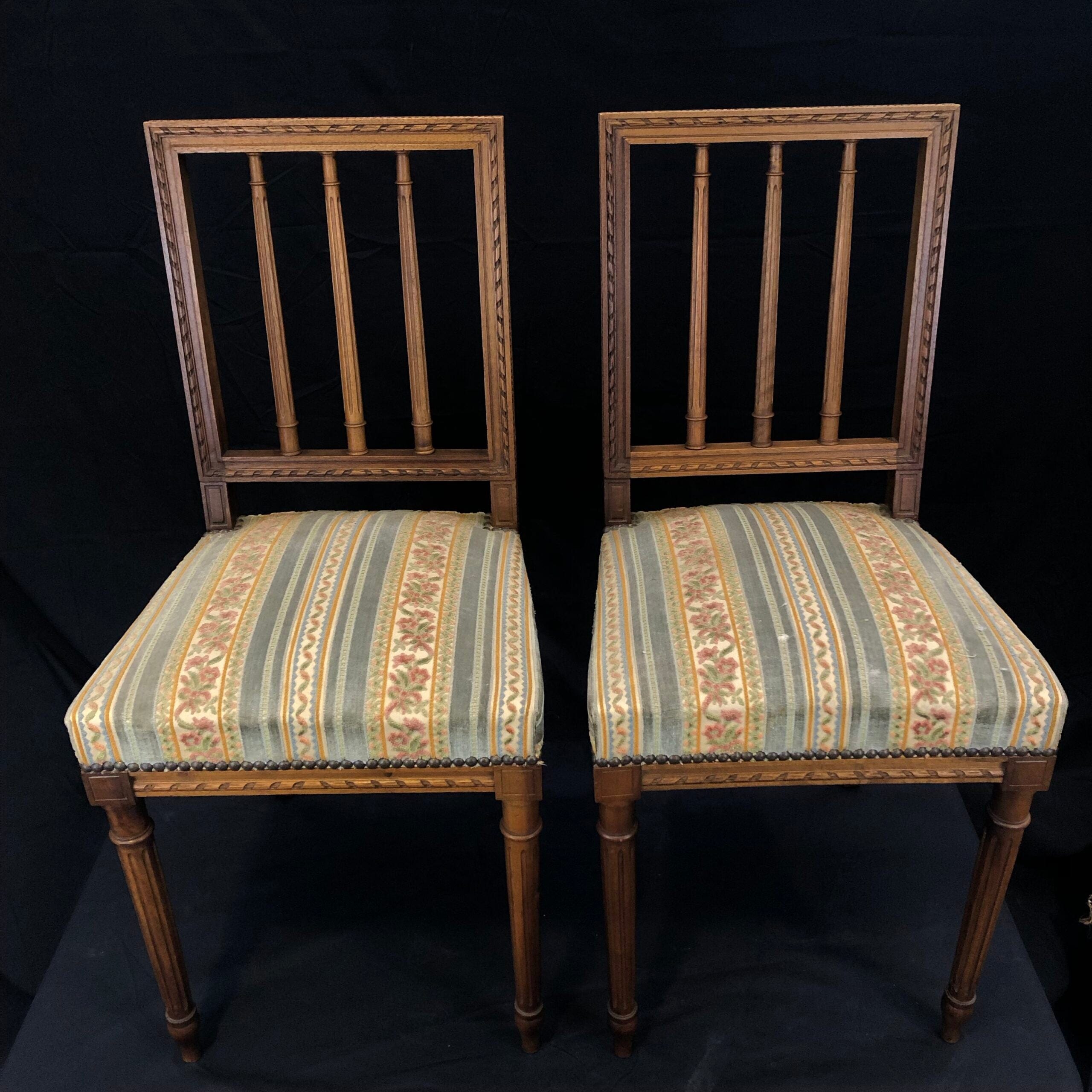 Elegante pareja de sillas francesas en roble estilo Luis XVI, peinazo con columnas acanaladas en respaldo terminadas en fino marco tallado. Al centro un bello cordón perlé en todo su contorno bajo relieve, meticuloso cordón de tachuelas tapiceras como pasamanería, asiento de resortes con tapiz francés de origen.