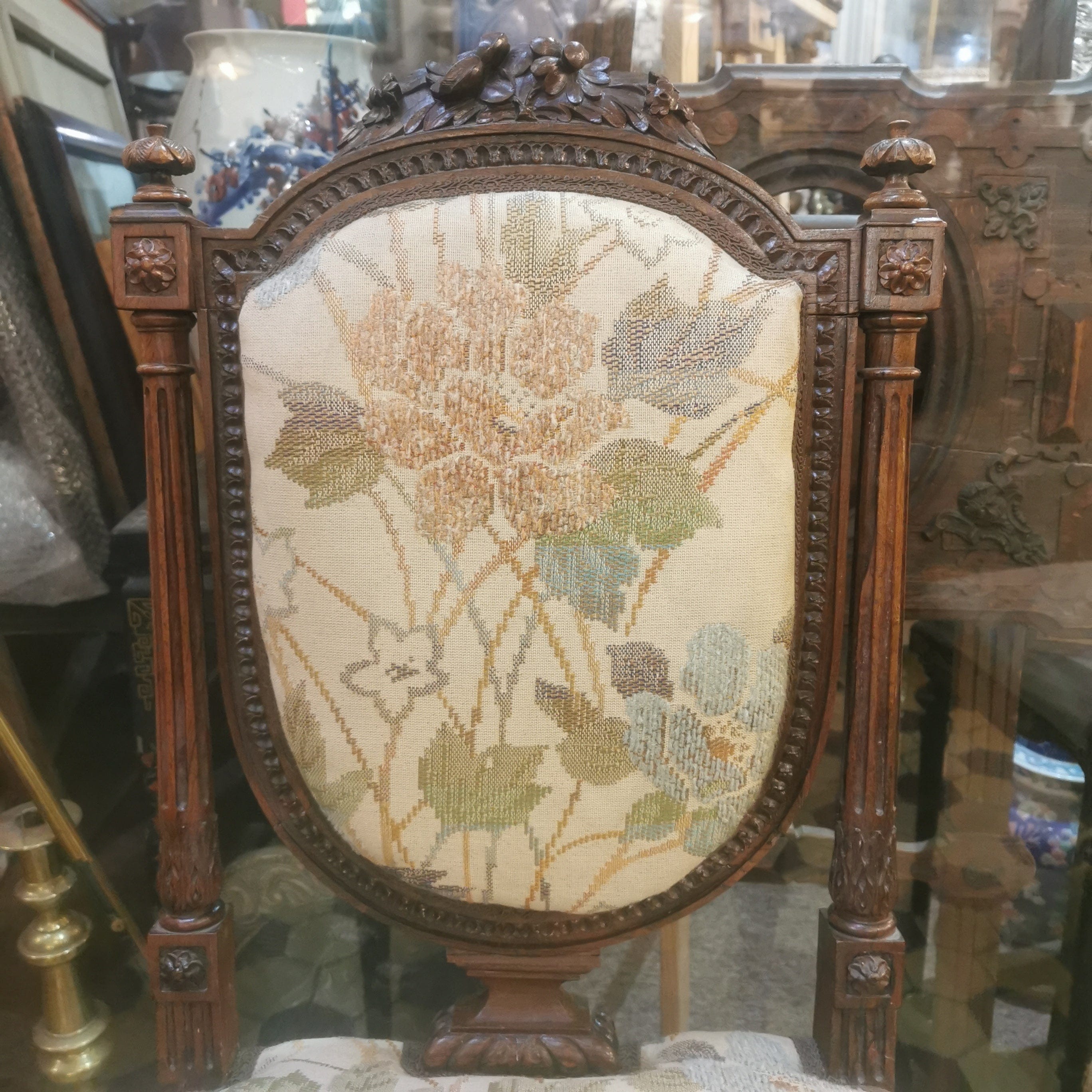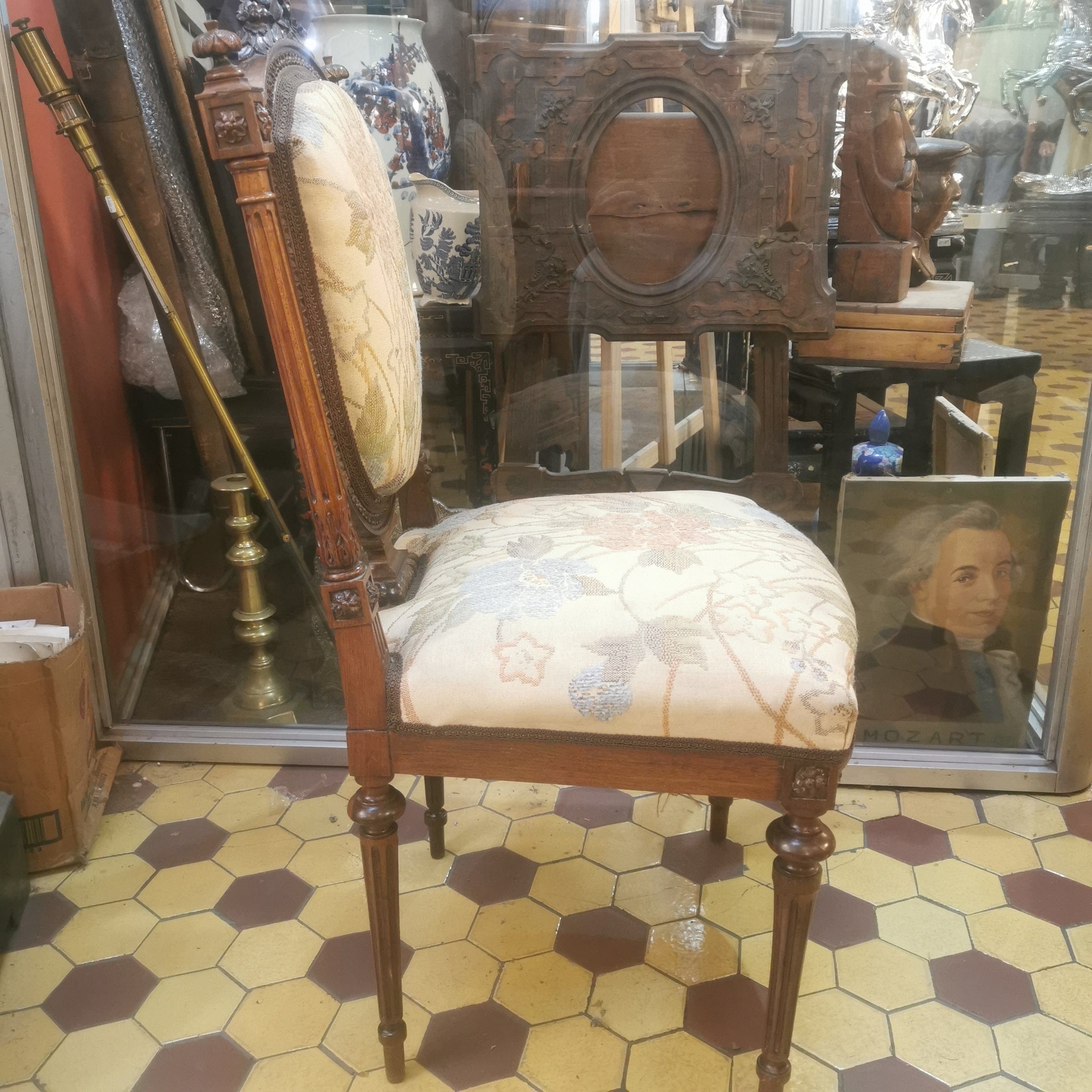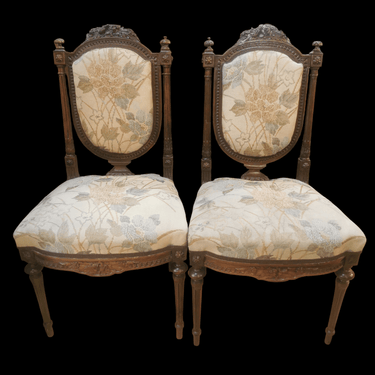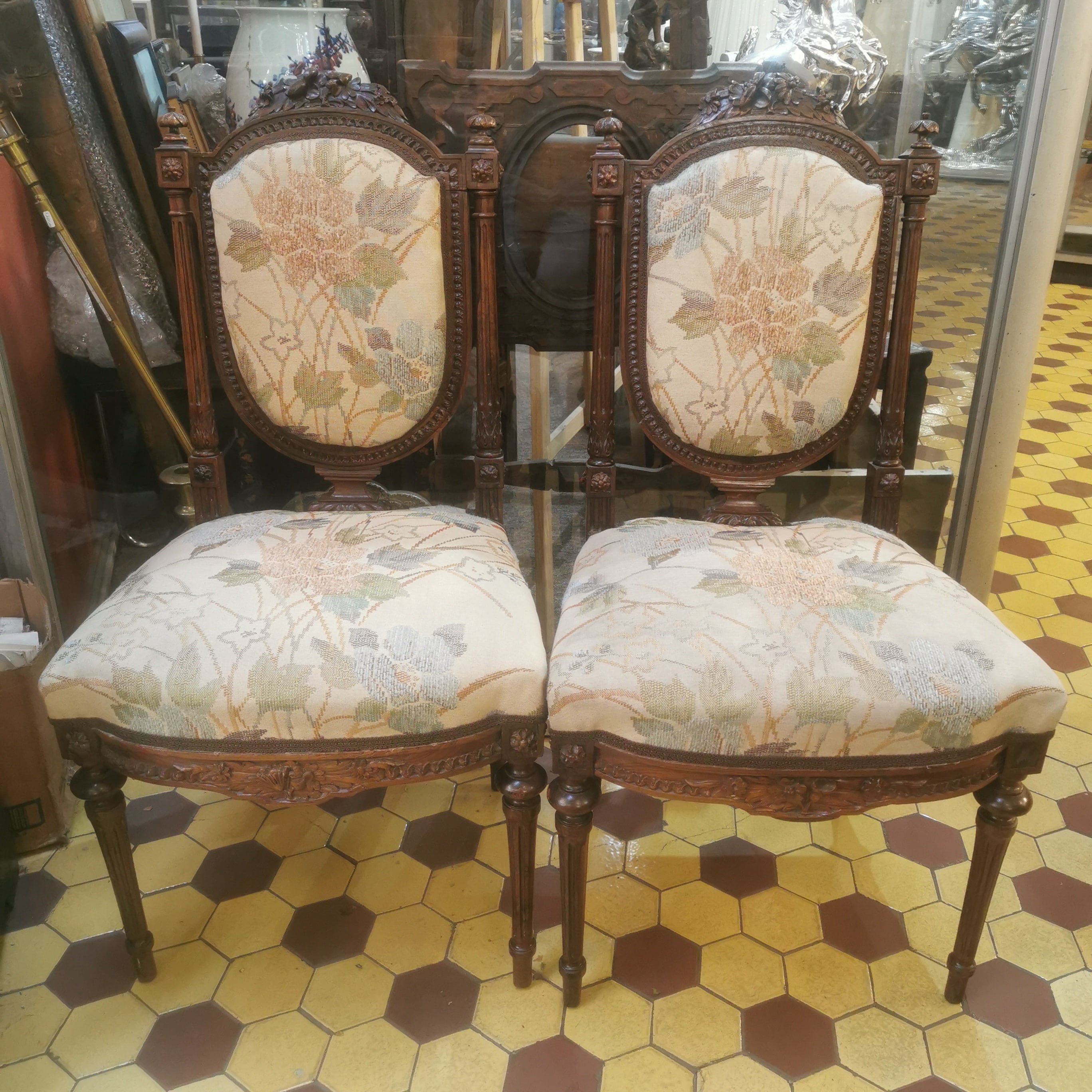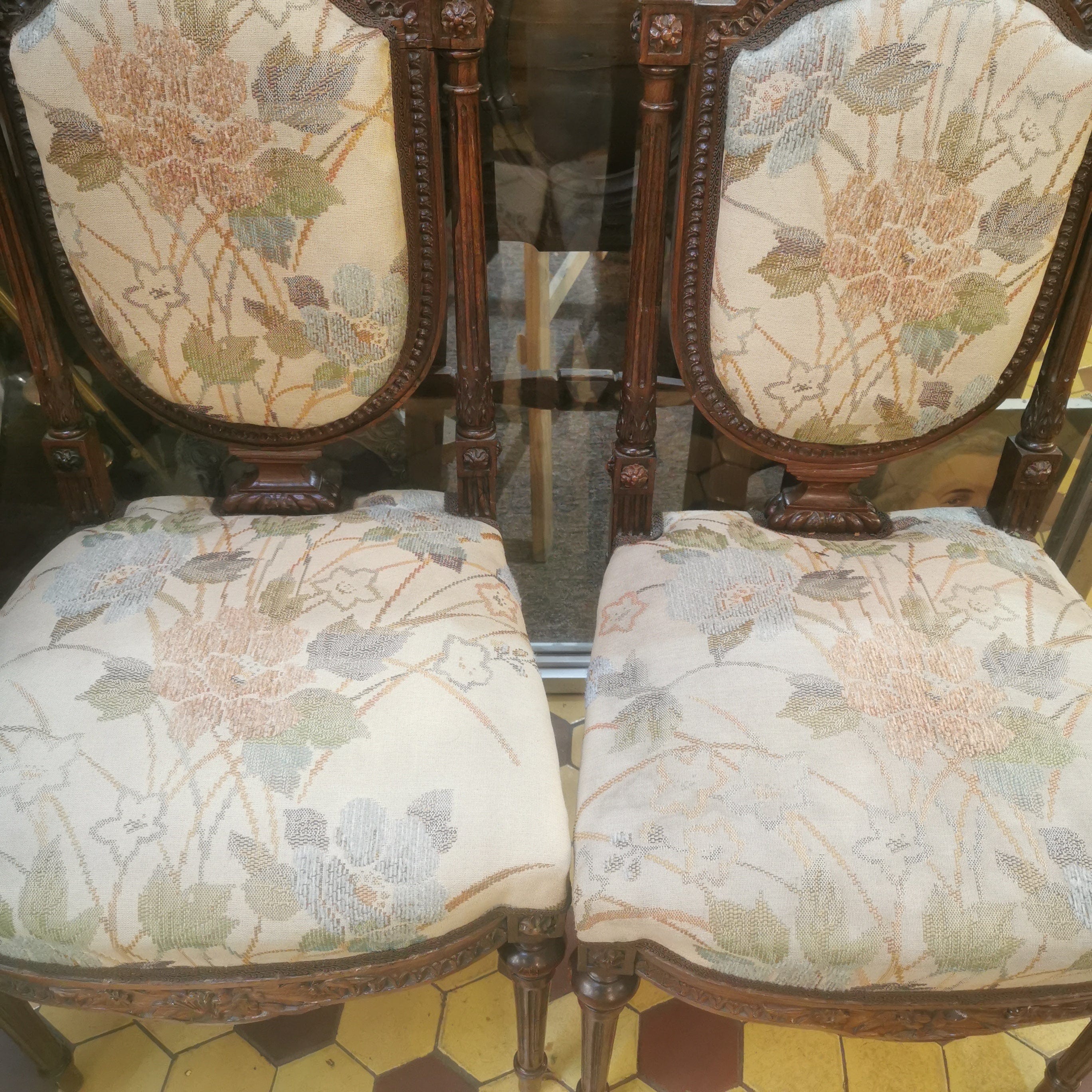 Par de sillas Luis XVI, con un hermoso tallado en madera Jacarandá y un tapiz floral bordado.