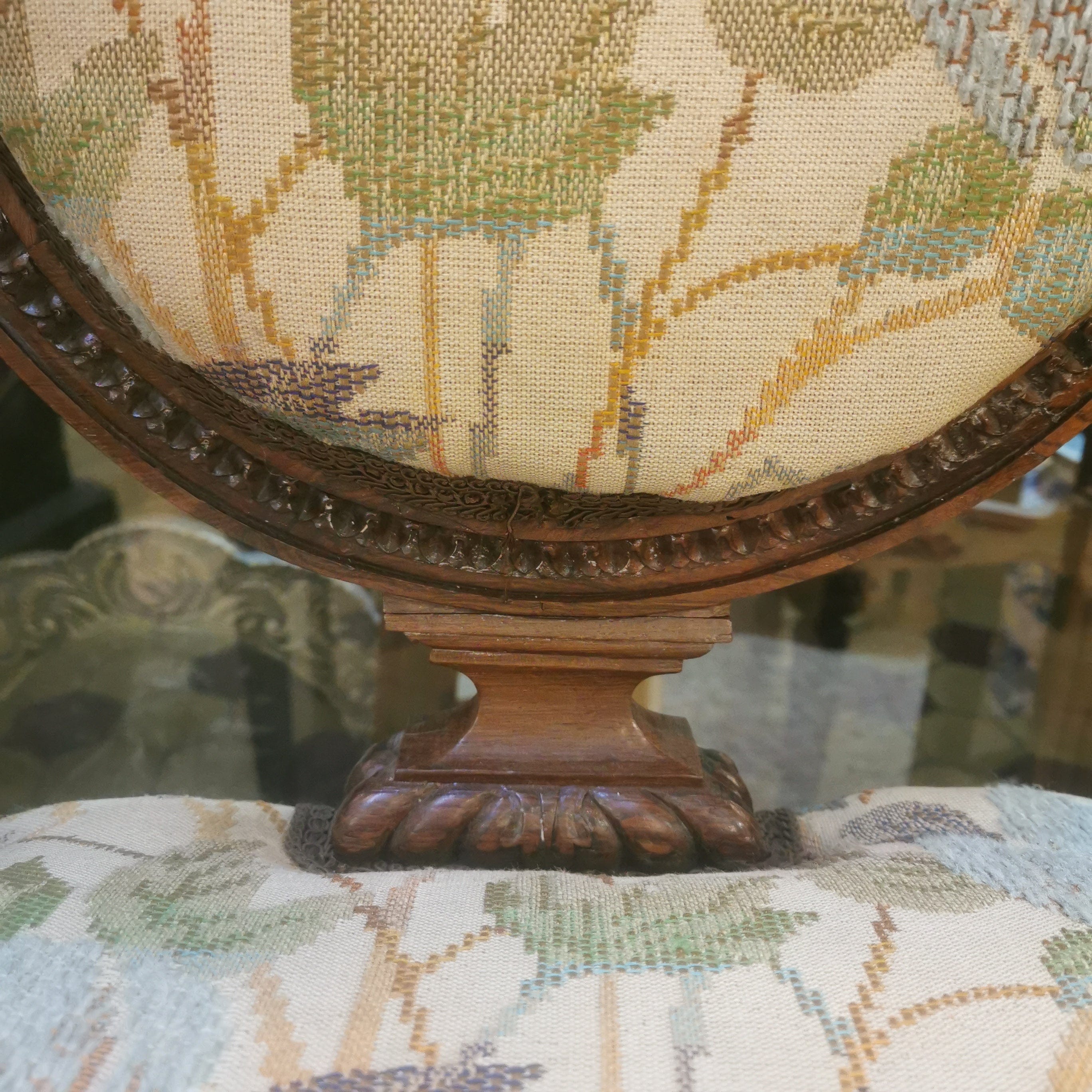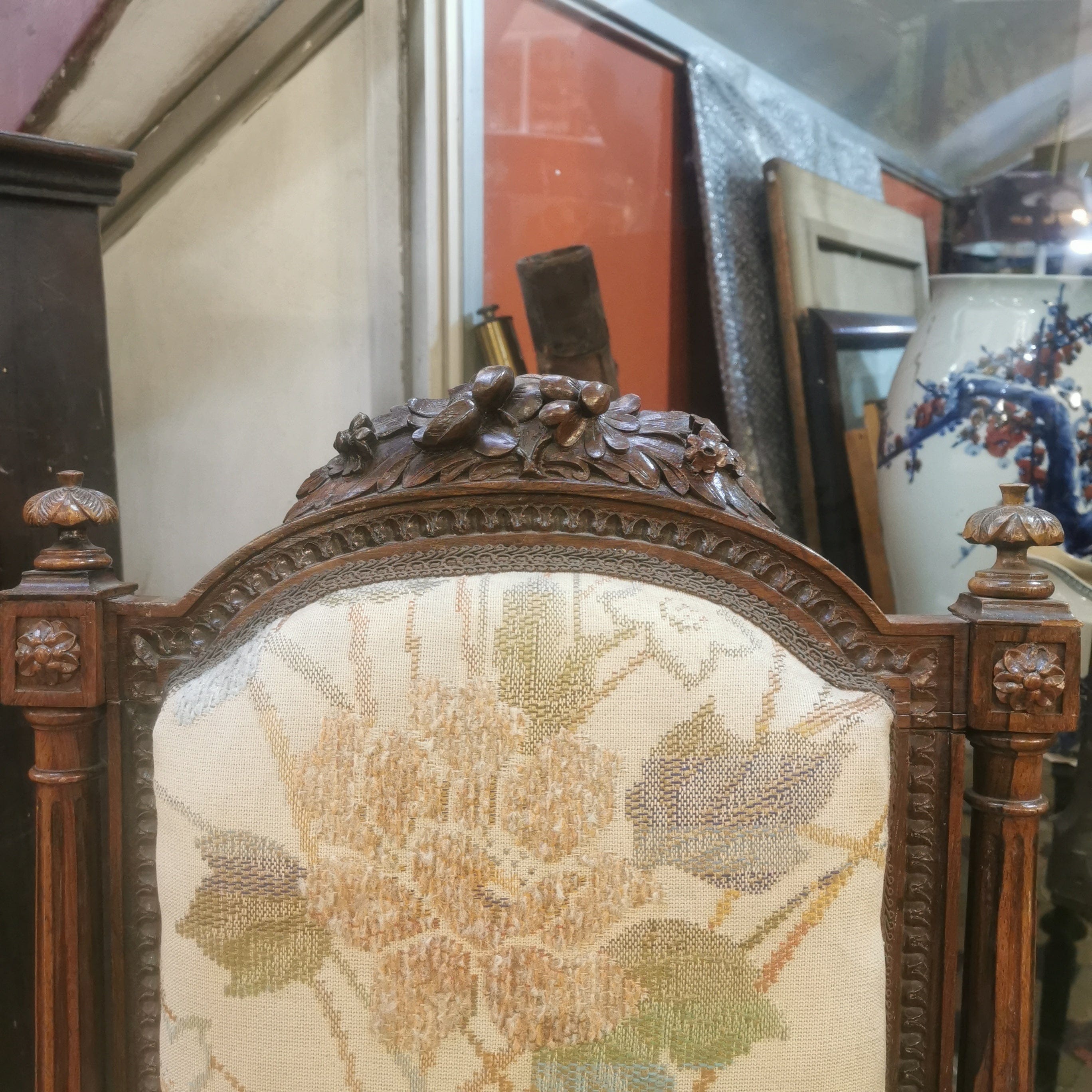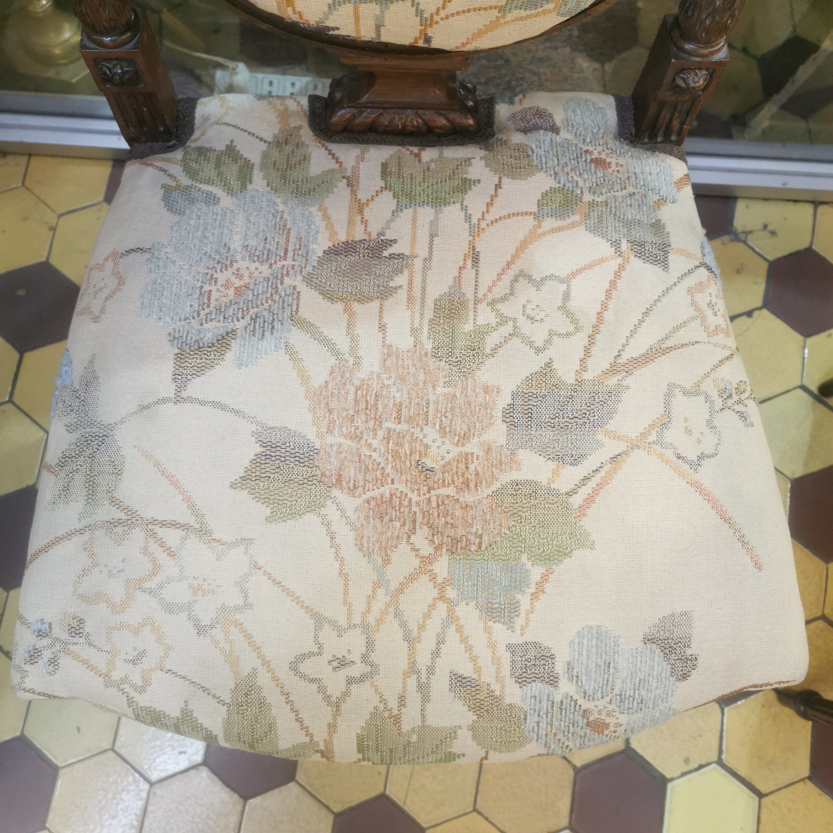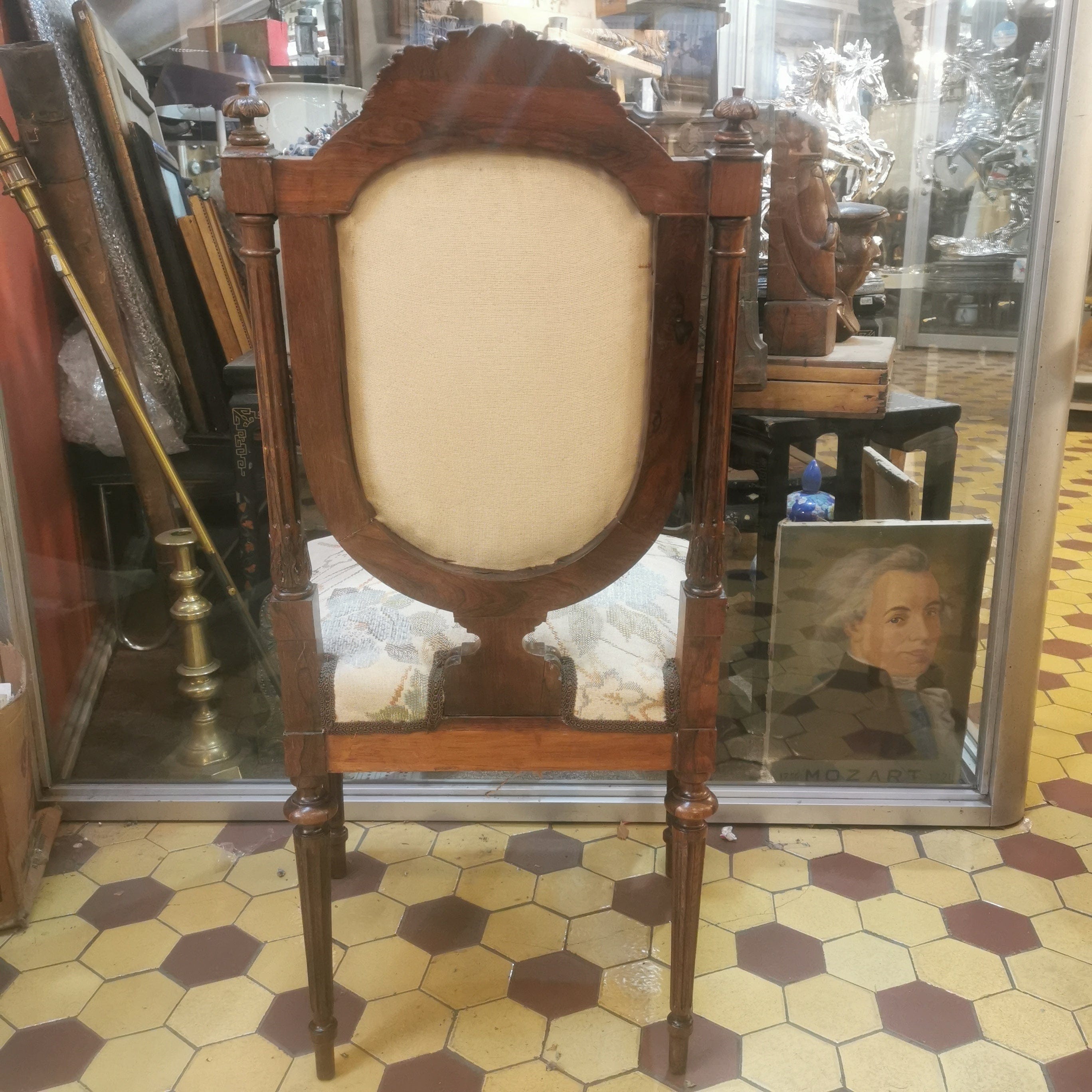 Par de sillas Luis XVI, con un hermoso tallado en madera Jacarandá y un tapiz floral bordado.