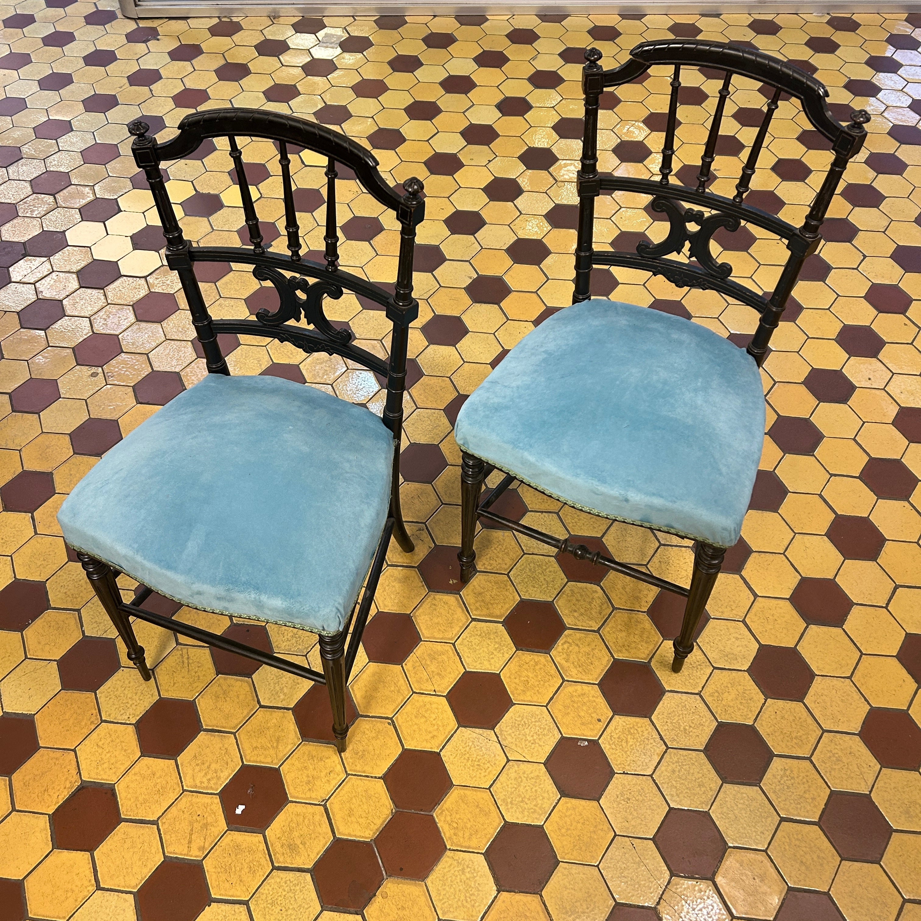 Preciosa pareja de sillas de origen francés y estilo Napoleón III, reconocible por su respaldo de columnas verticales. Las sillas están hechas de madera lacada y tapizadas de un bello terciopelo color turquesa con borde verde decorado en encaje.