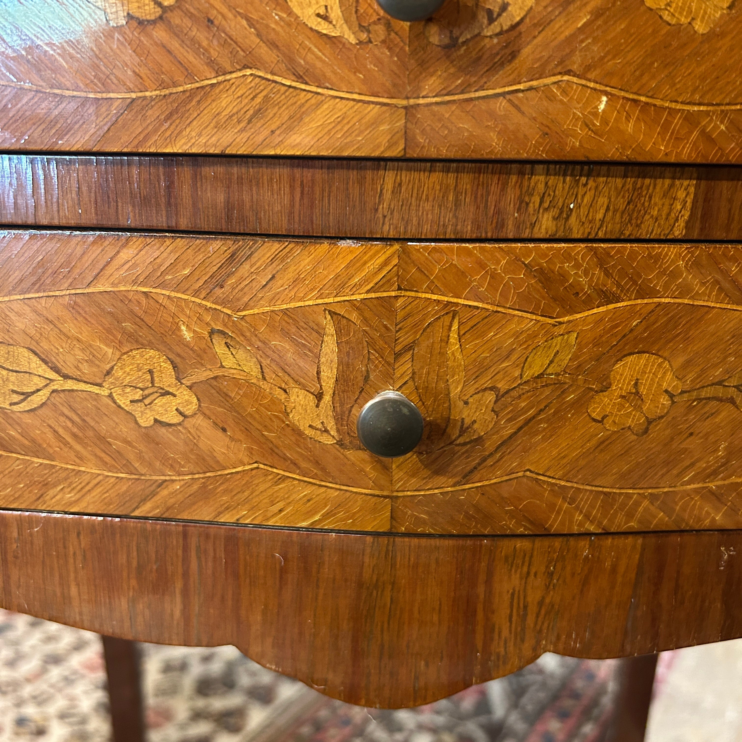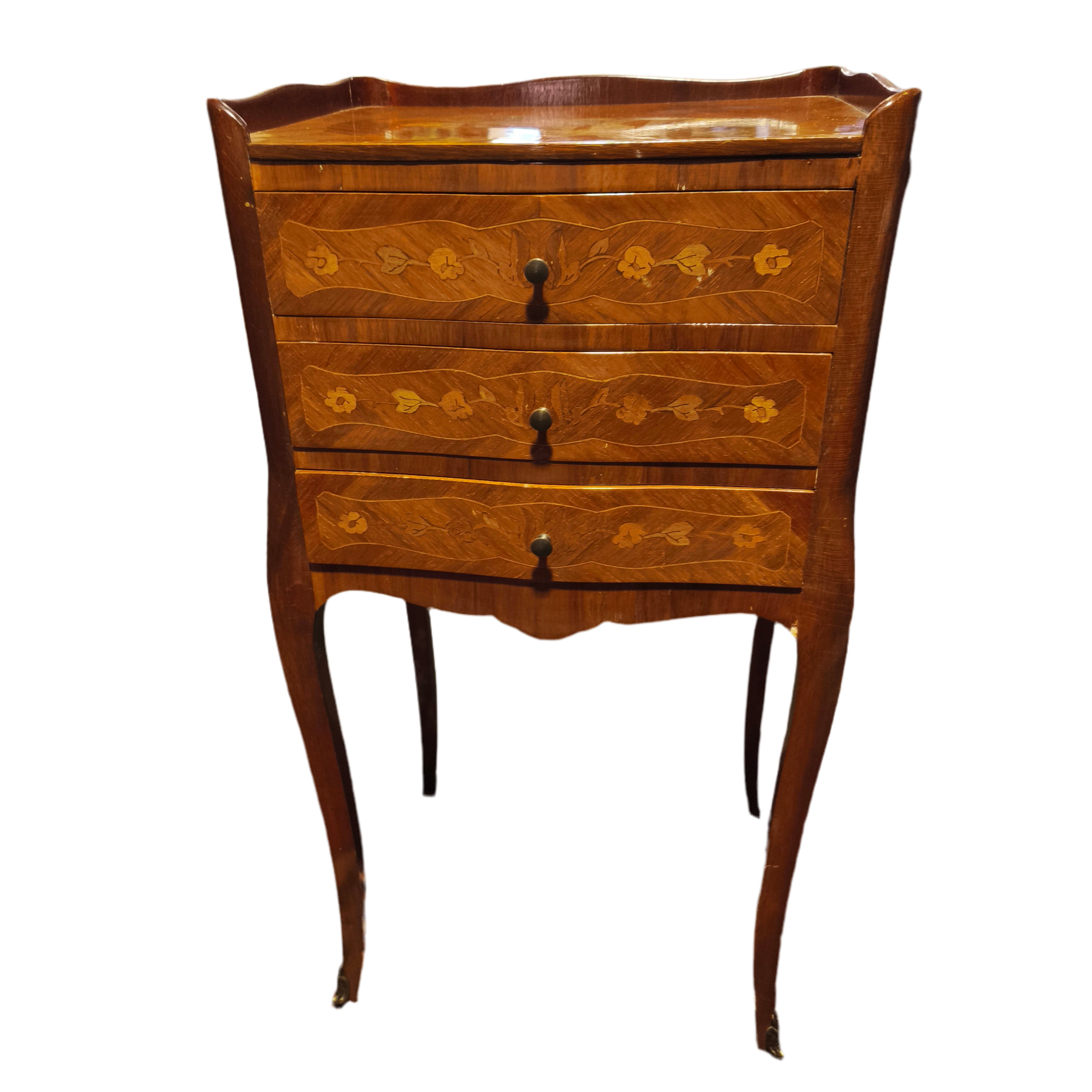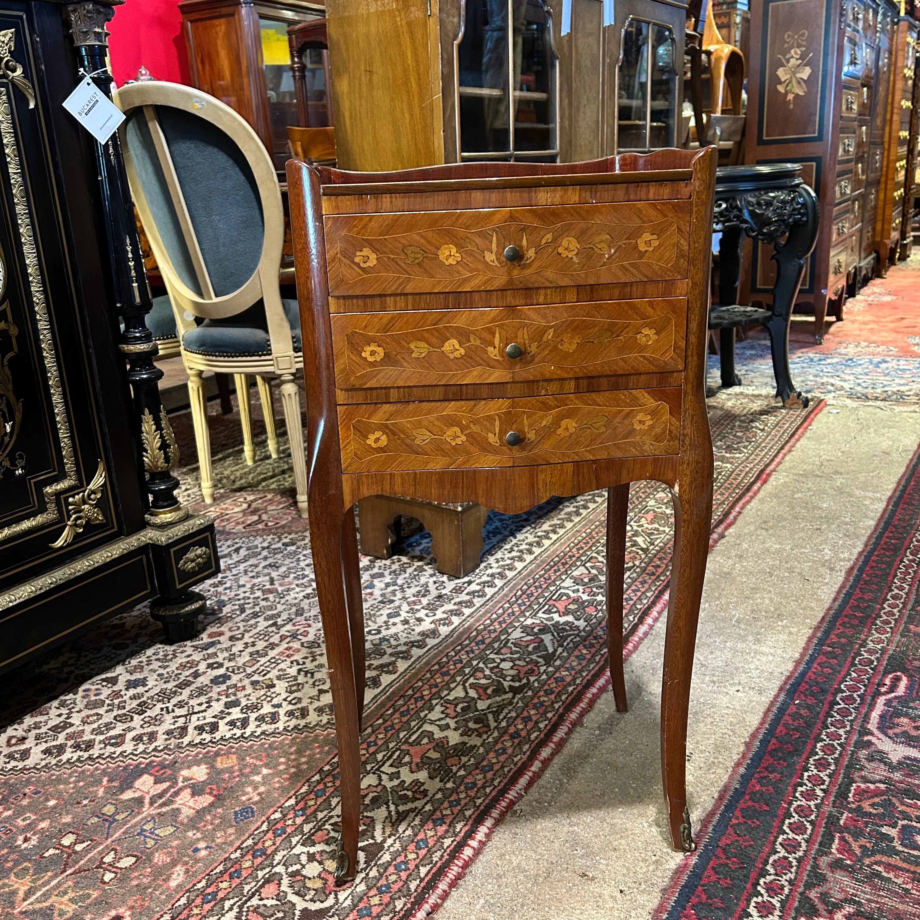 Elegante velador de origen francés y estilo Luis XV en madera enchapada con marquetería floral, tres cajones, patas curvas y tacos de bronce.