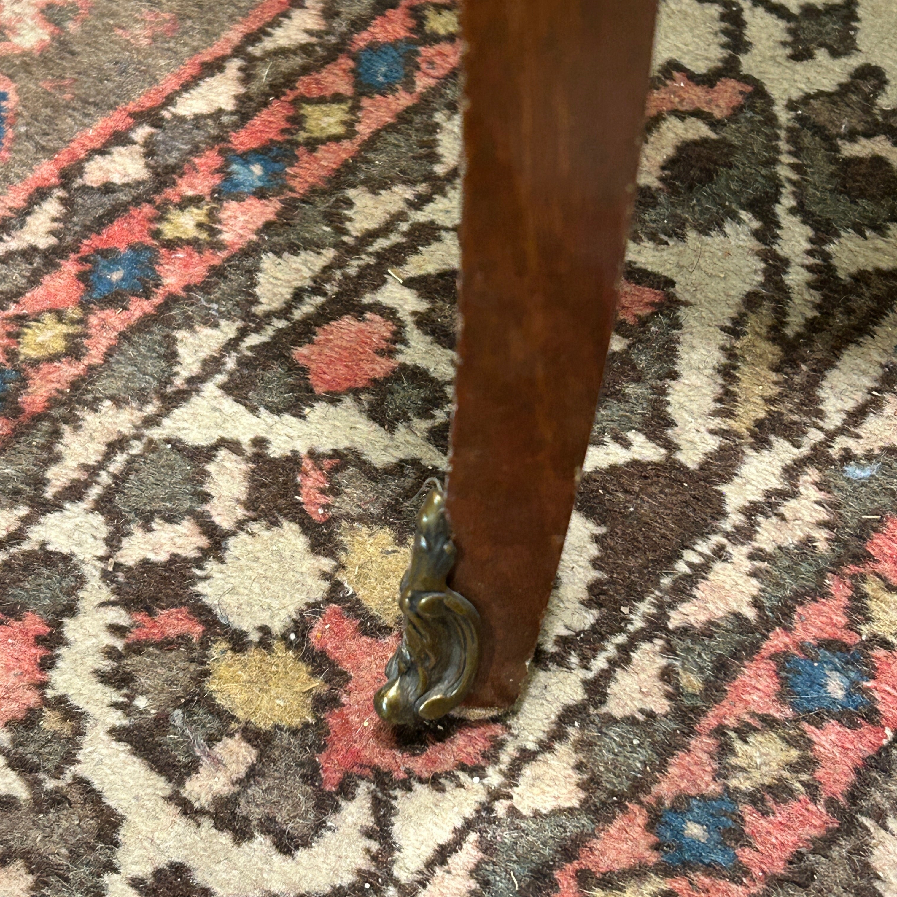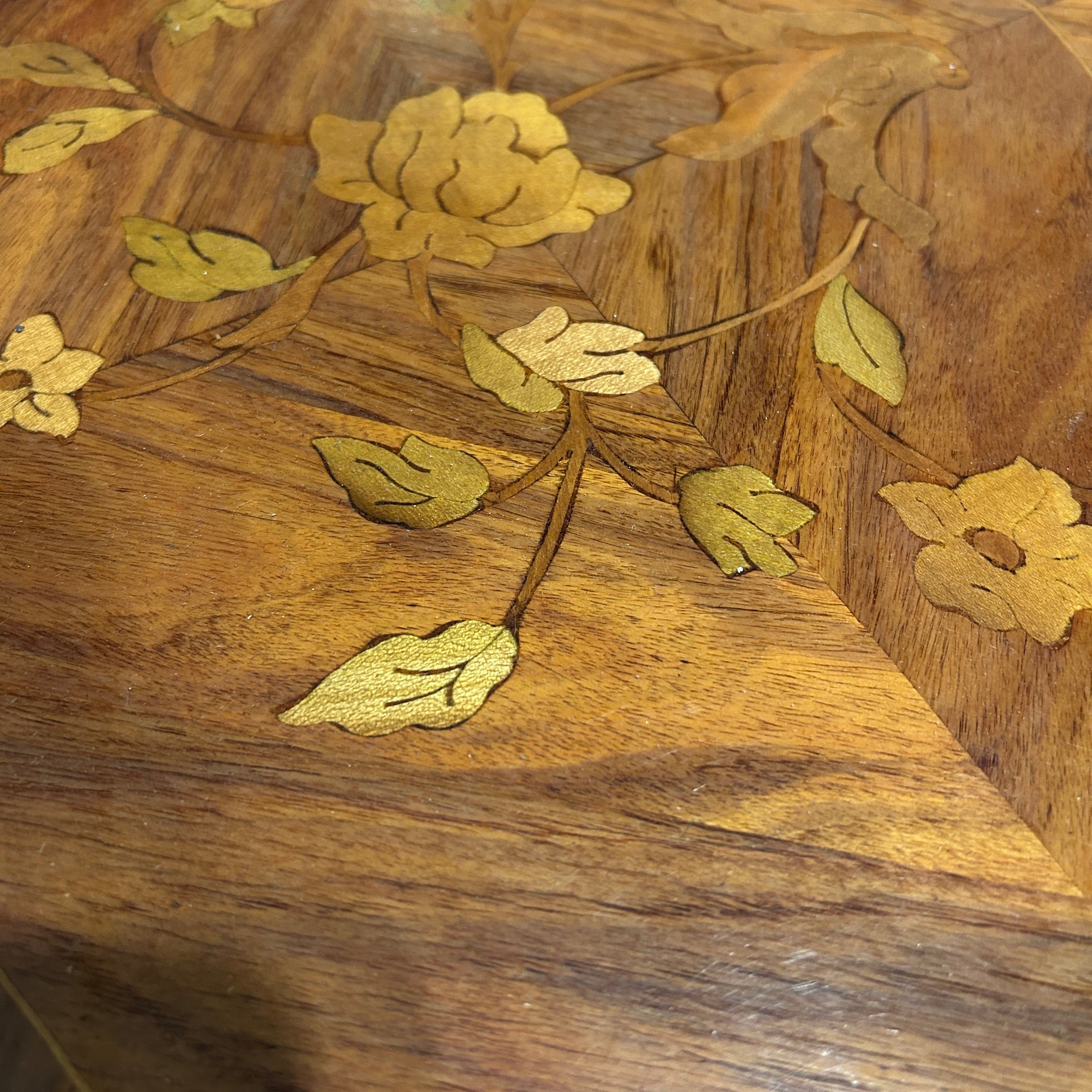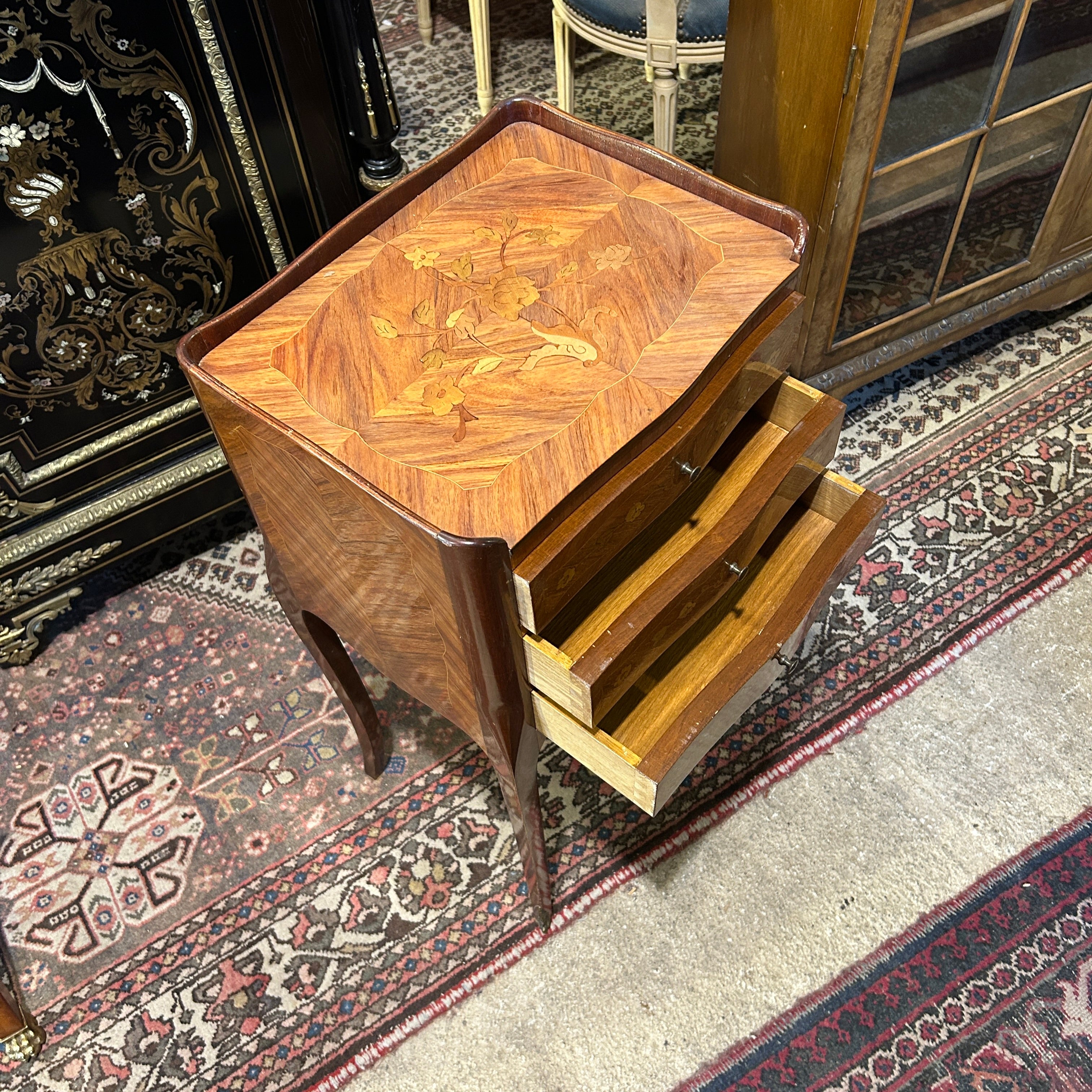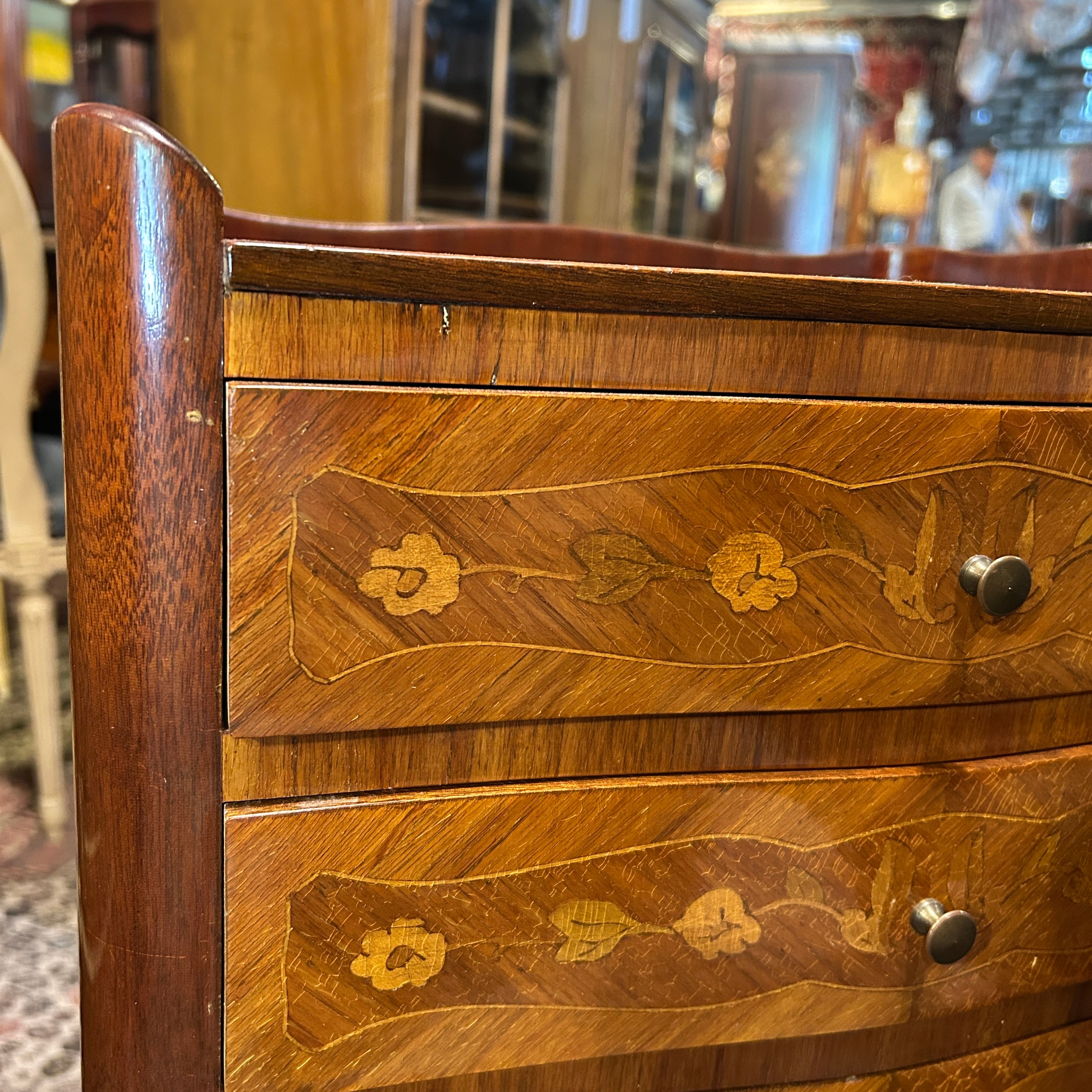Elegante velador de origen francés y estilo Luis XV en madera enchapada con marquetería floral, tres cajones, patas curvas y tacos de bronce.