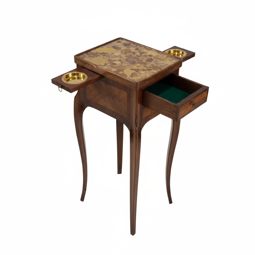 Dos cajones y dos bandejas cenicero en latón, tapa de mármol brèche d’Alep. Estilo Luis XV.