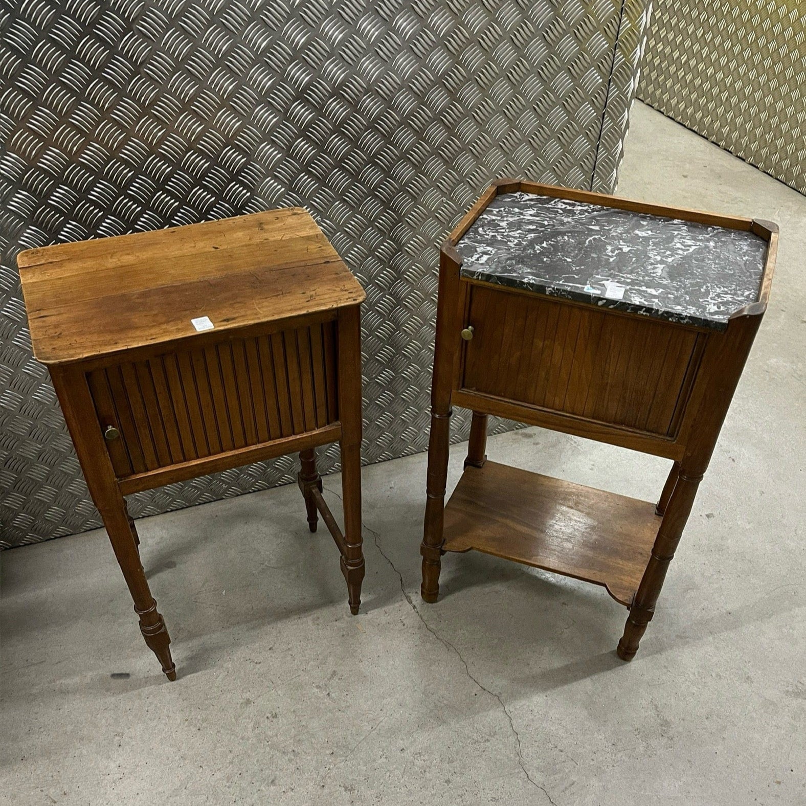 Chêne con persianas, uno con cubierta de mármol Saint Anne. 73x44x31 cm y 76x44x30 cm.