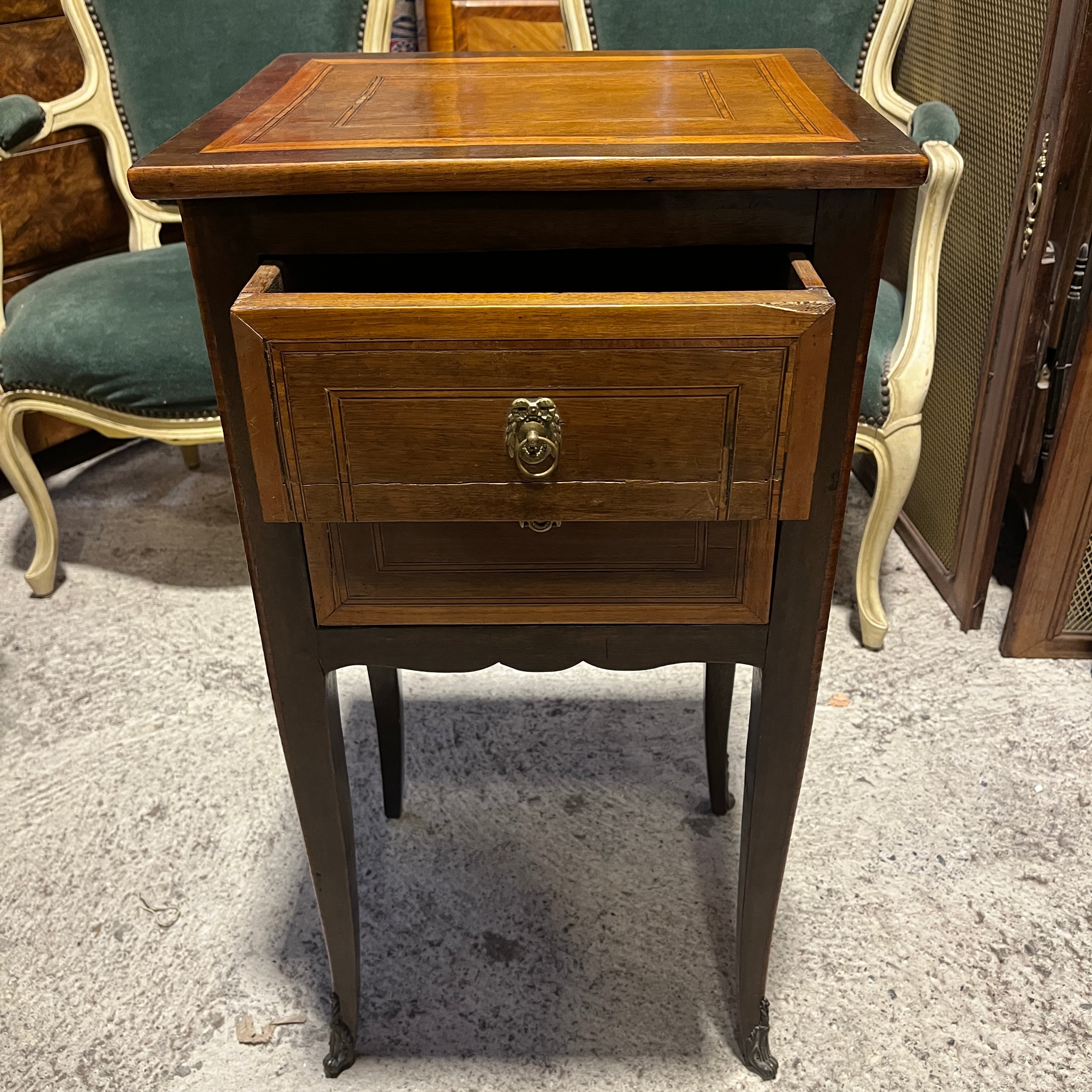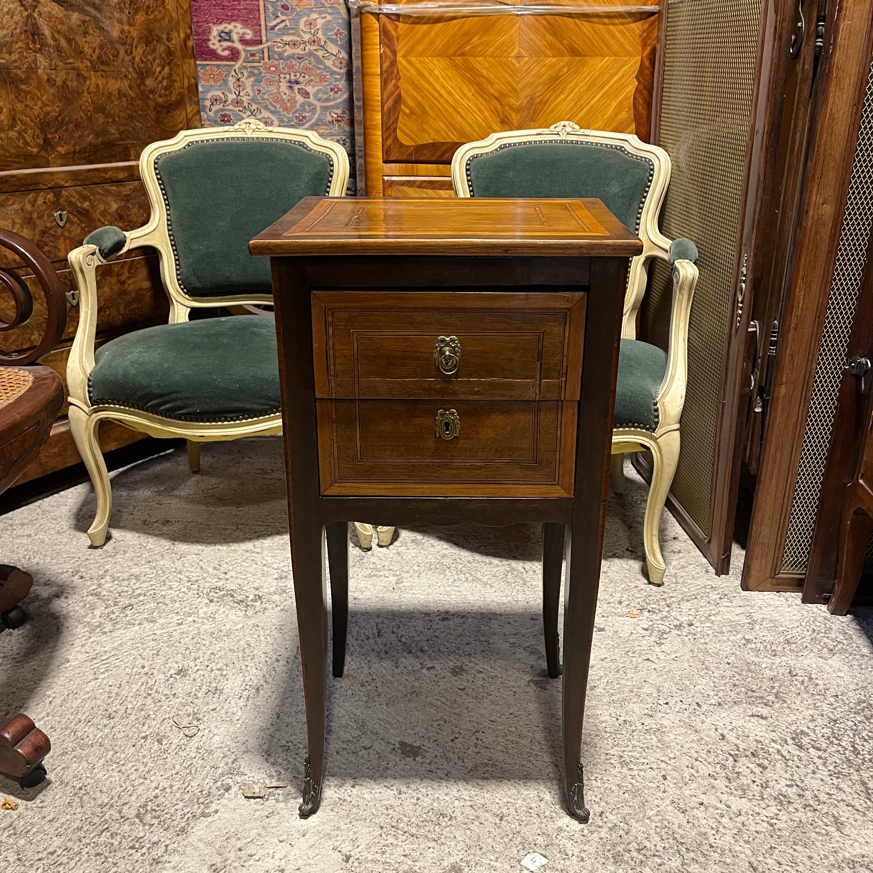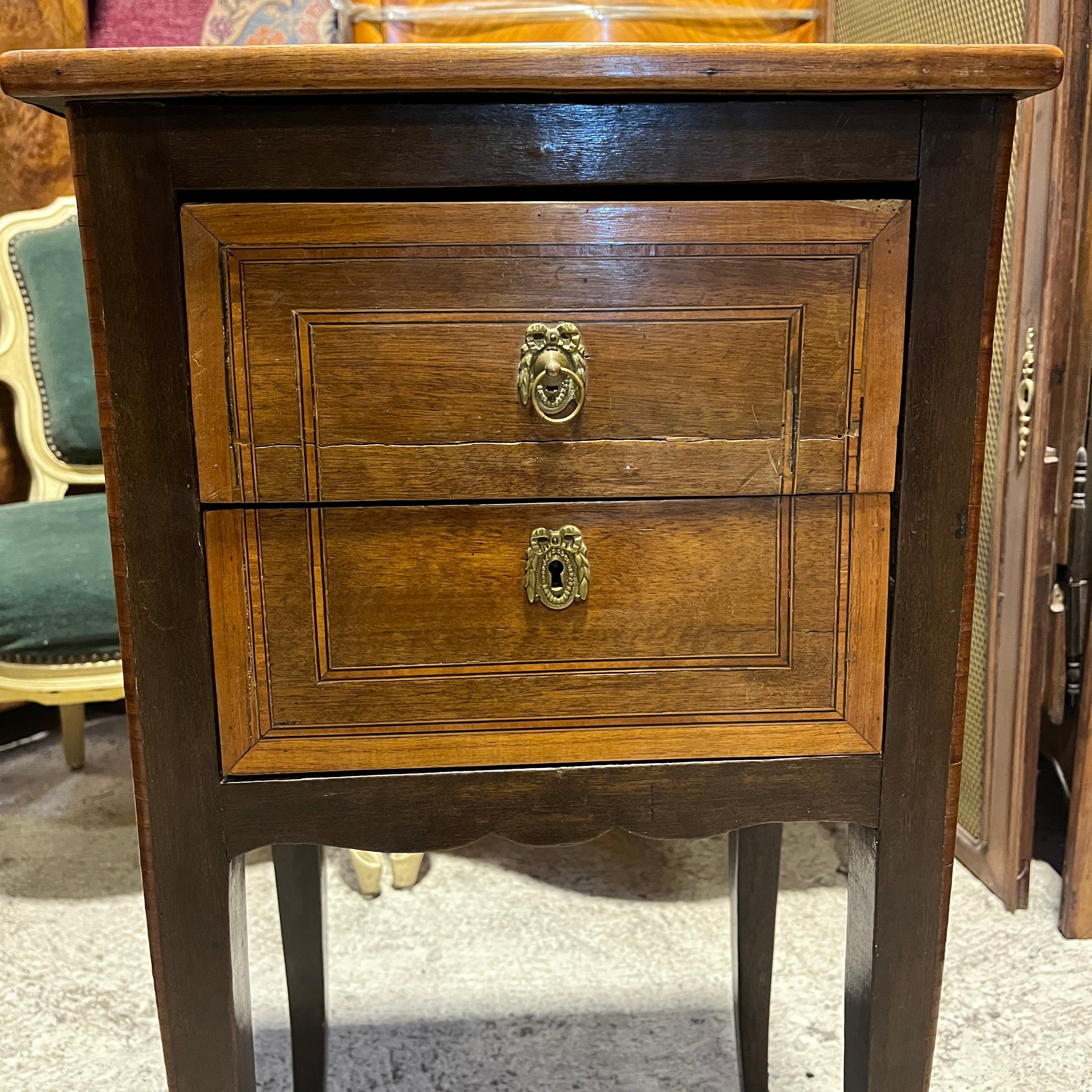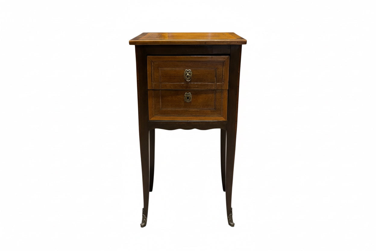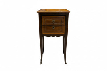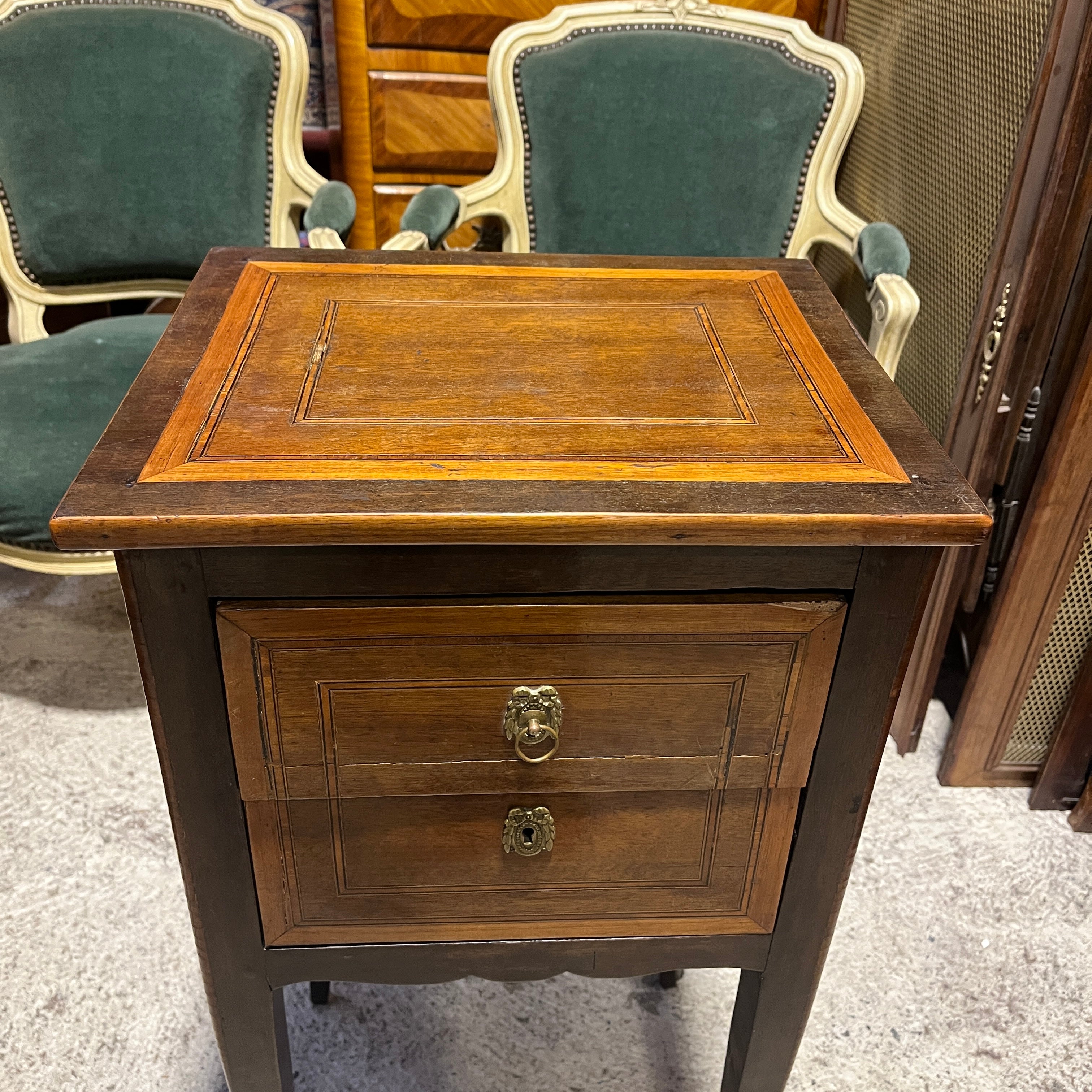 Maravilloso velador francés hecho completamente a mano, con marquetería de tres tipos de maderas. Posee dos cajones, uno con tirador de bronce y otro con su llave. En el velador se puede apreciar el minucioso trabajo del artesano, ensamblando diferentes tipos de maderas  además de un sutil detalle en sus cuatro patas a partir del ensamble considerando la veta de la madera. Es un velador que a simple vista parece sencillo, sin embargo, al observarlo con detención se puede apreciar la increíble visión artística. El velador tiene detalles producto del paso del tiempo, sin embargo es un mueble que goza de una belleza propia de una pieza realizada a mano. Posiblemente fines del siglo XIX.