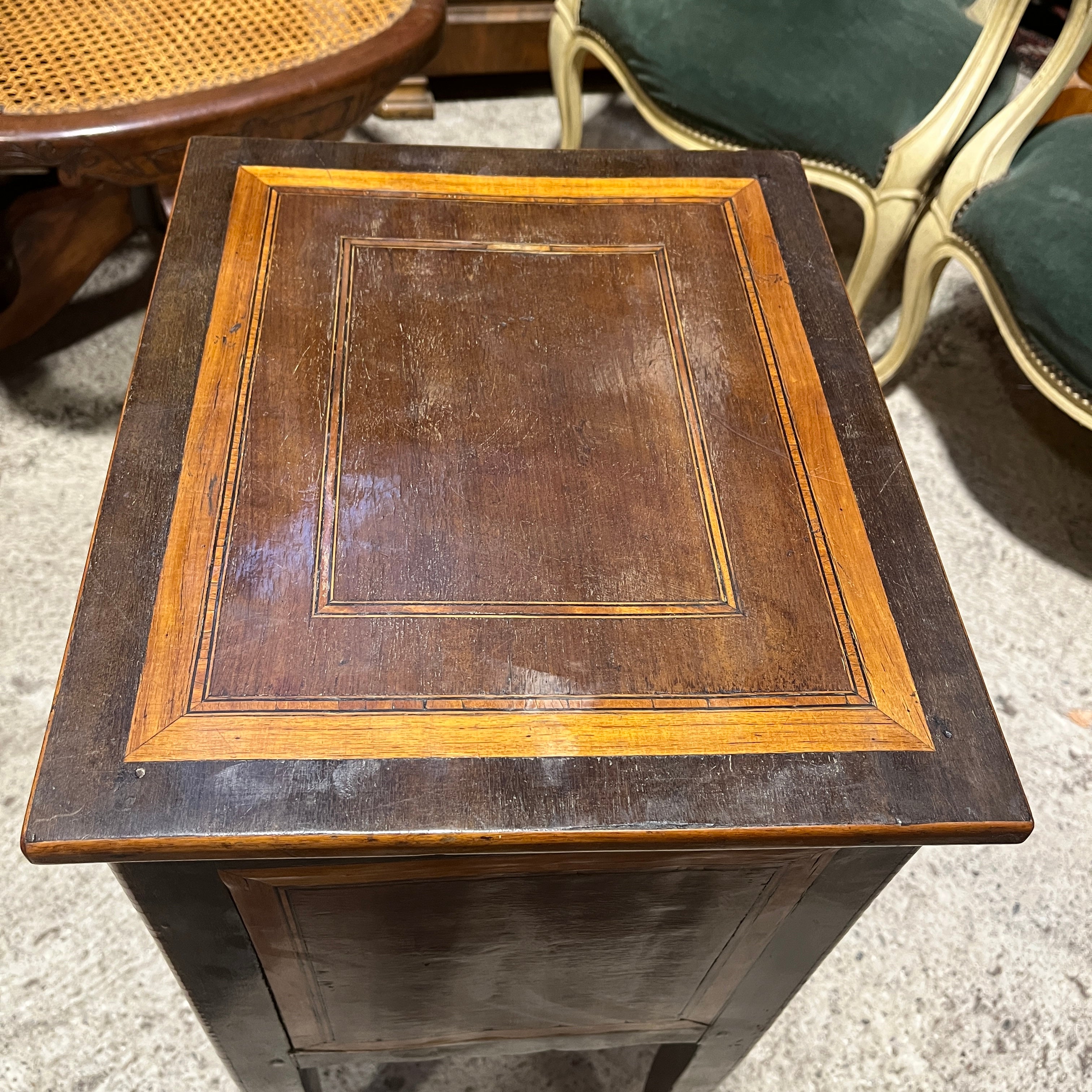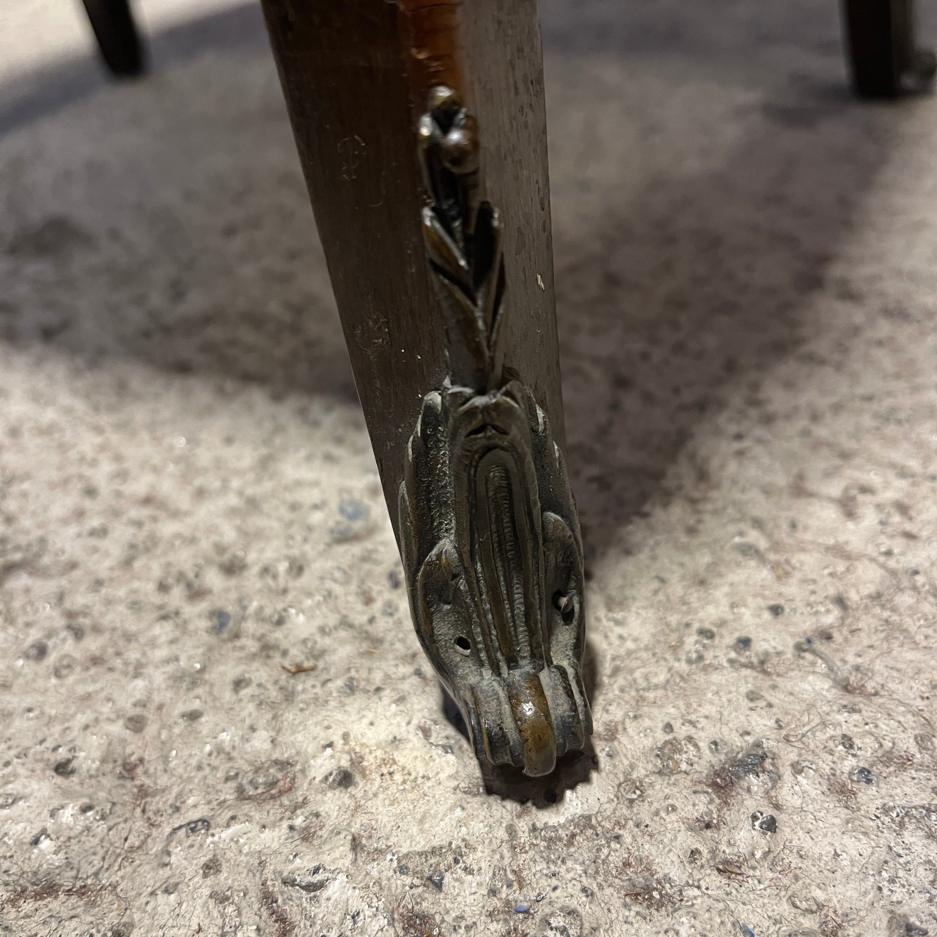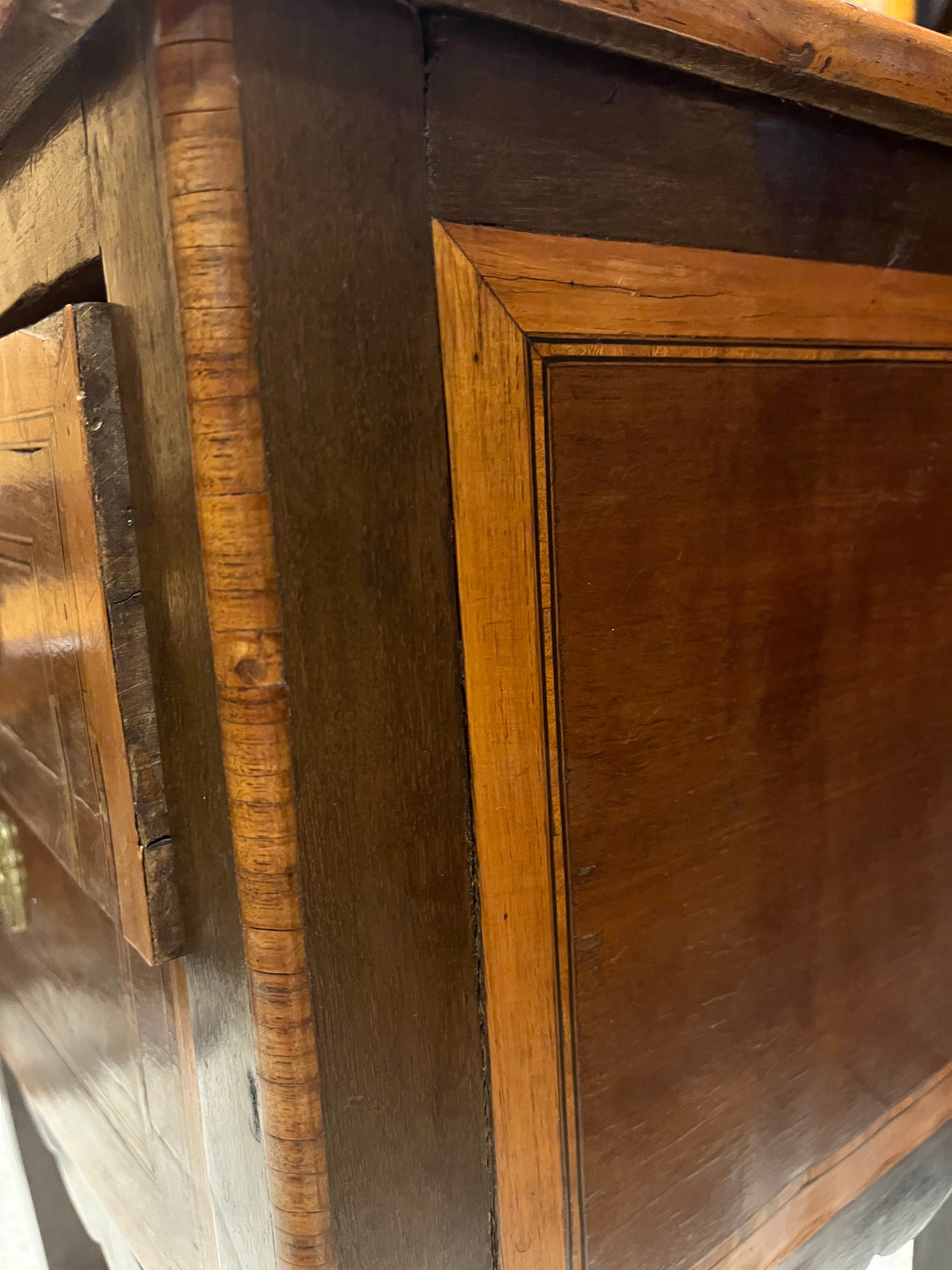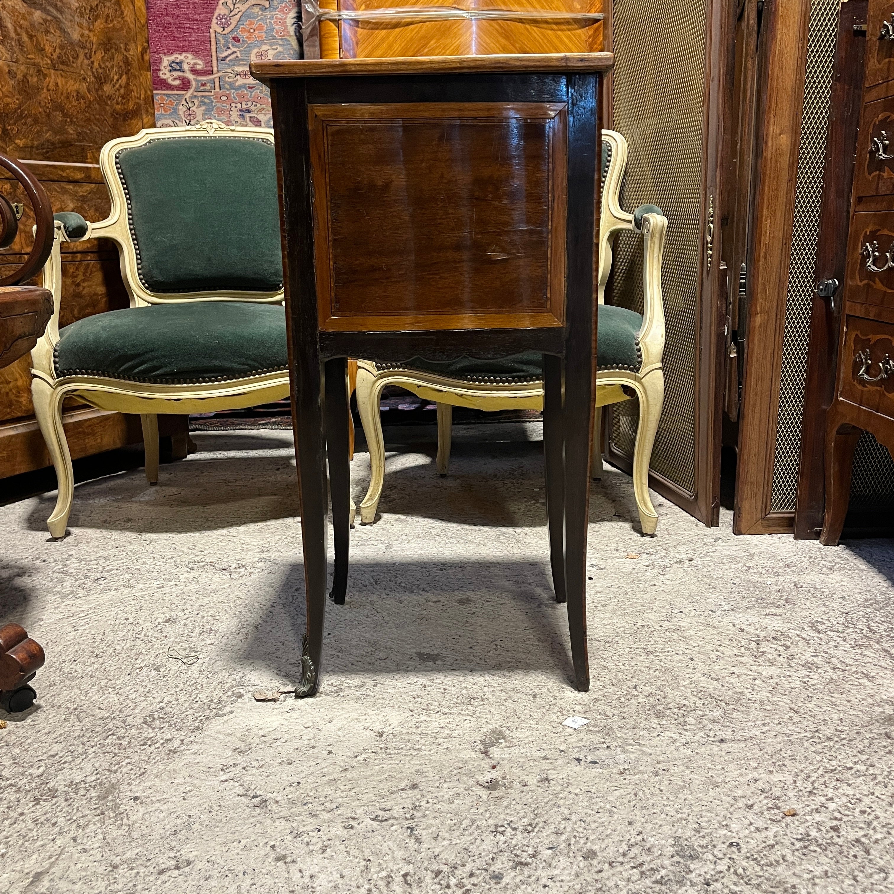 Maravilloso velador francés hecho completamente a mano, con marquetería de tres tipos de maderas. Posee dos cajones, uno con tirador de bronce y otro con su llave. En el velador se puede apreciar el minucioso trabajo del artesano, ensamblando diferentes tipos de maderas  además de un sutil detalle en sus cuatro patas a partir del ensamble considerando la veta de la madera. Es un velador que a simple vista parece sencillo, sin embargo, al observarlo con detención se puede apreciar la increíble visión artística. El velador tiene detalles producto del paso del tiempo, sin embargo es un mueble que goza de una belleza propia de una pieza realizada a mano. Posiblemente fines del siglo XIX.