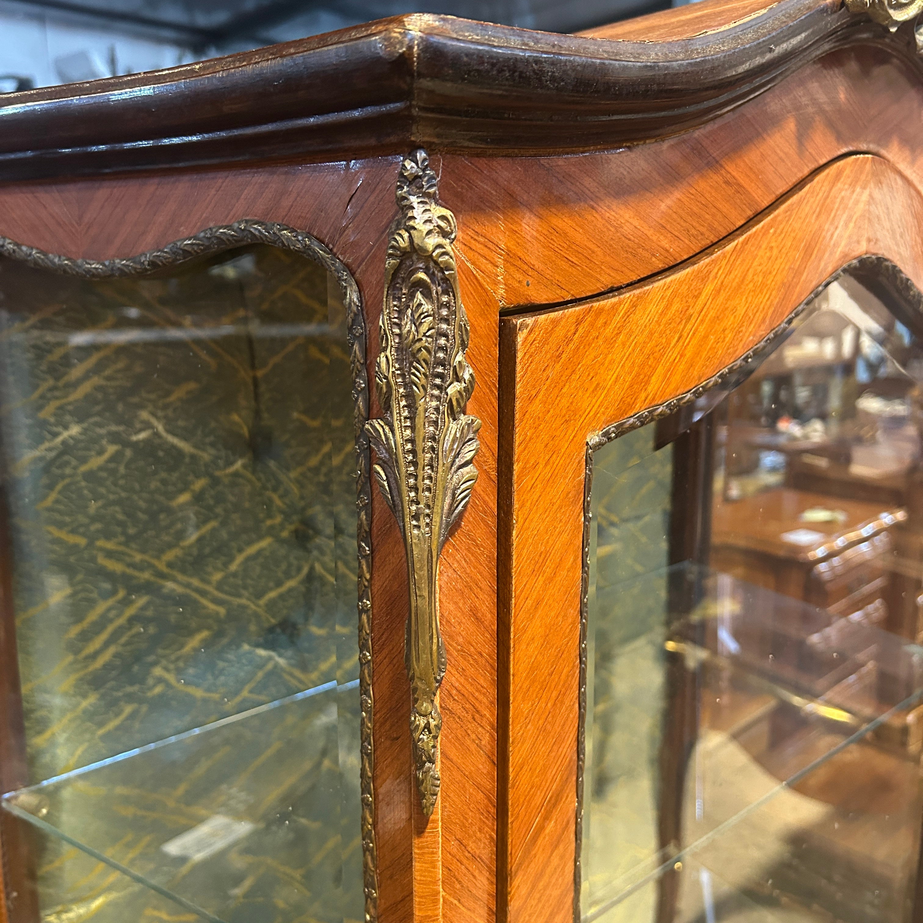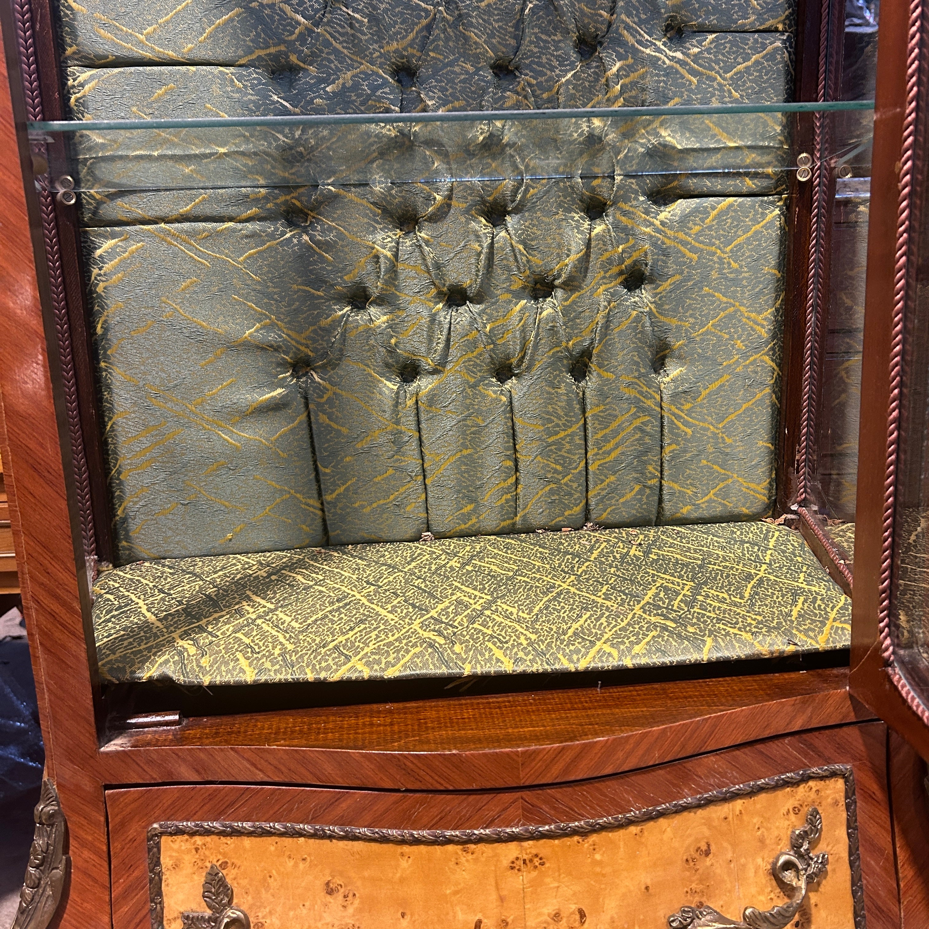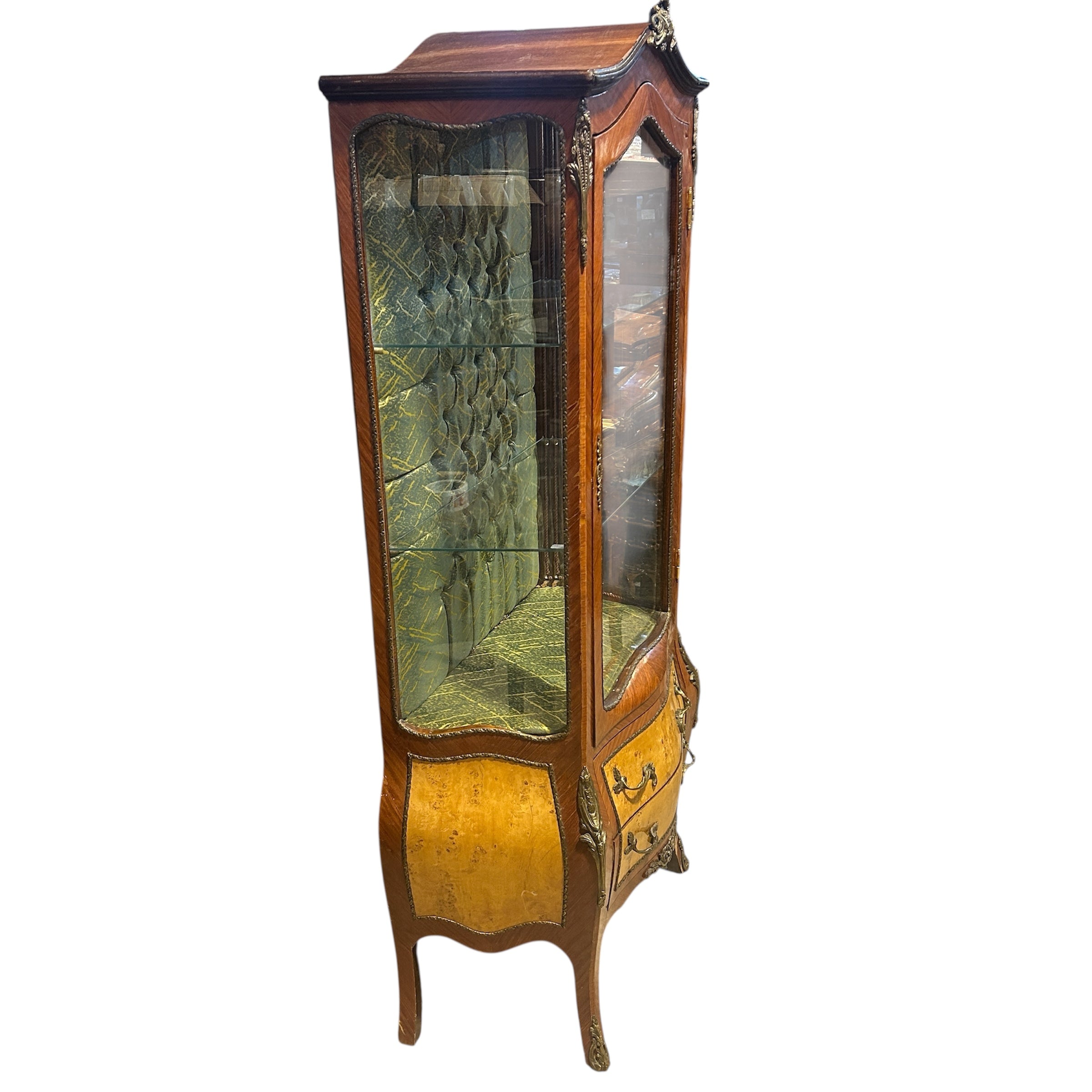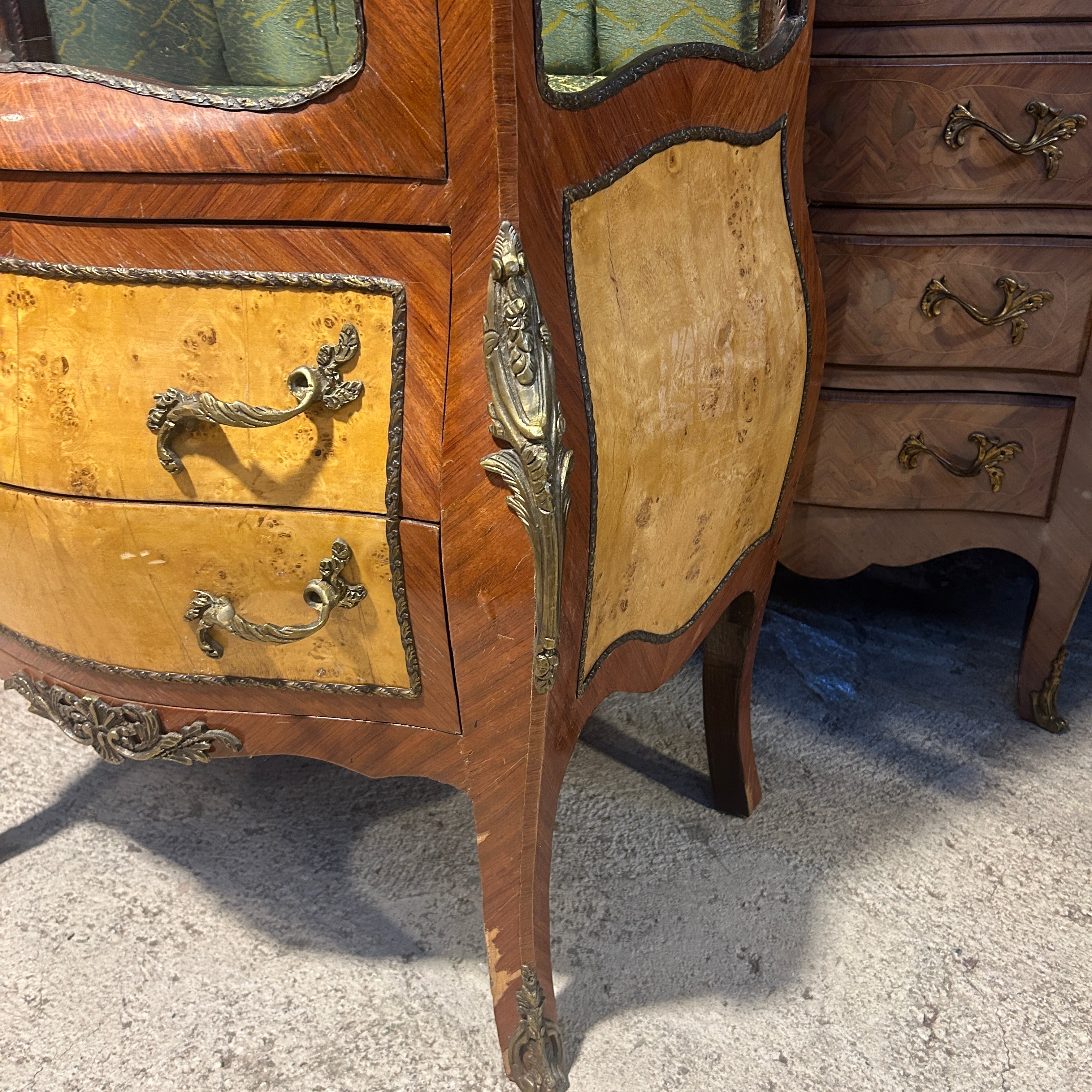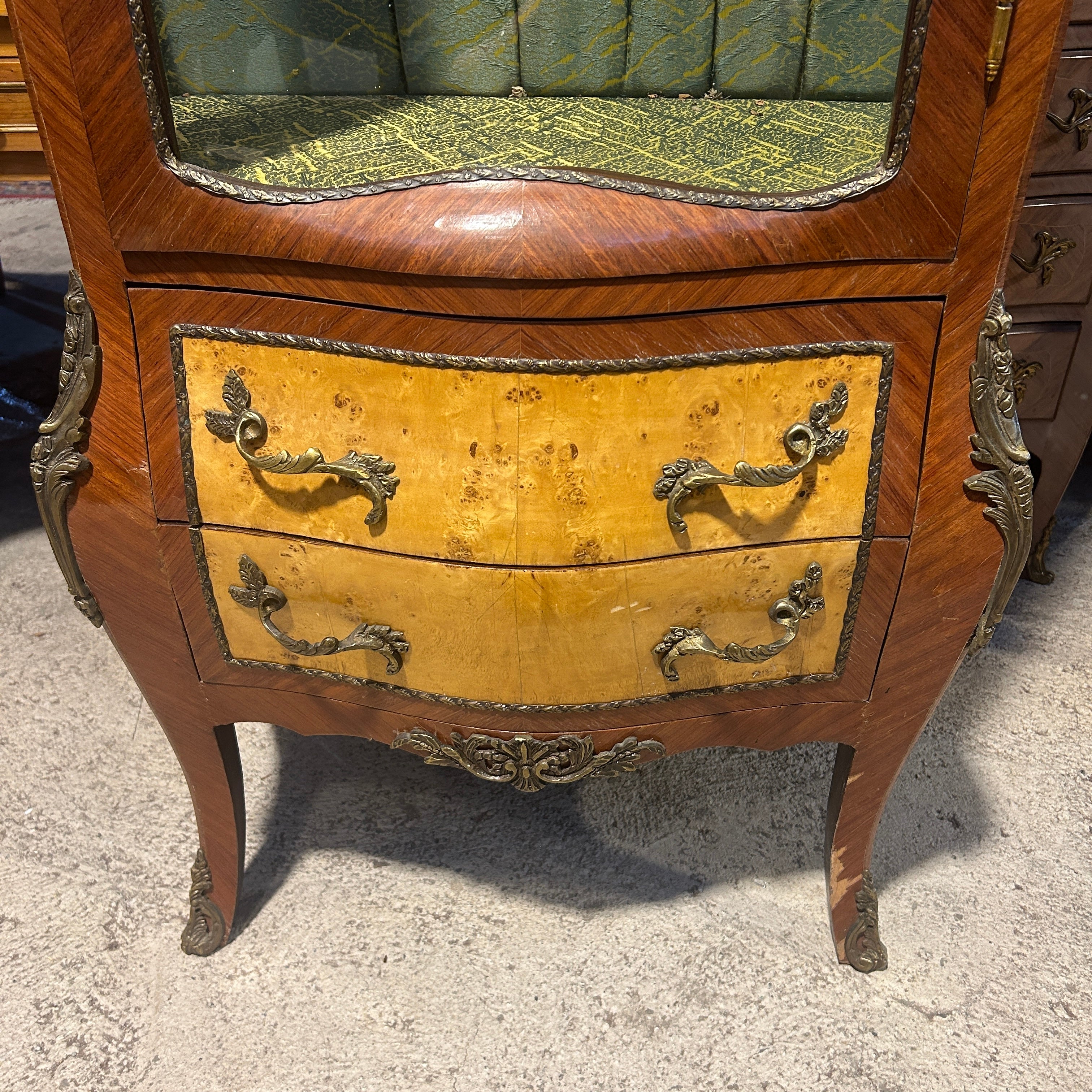 Hermosa vitrina francesa de entrepaño de color pistacho, madera de palorosa y erable. Cuenta con dos cajones inferiores bombé y con con tiradores y aplicaciones en bronce. Tiene un bello filete más oscuro que corona la parte superior de ella. Se destaca por su pequeño tamaño, lo cual la vuelve ideal para espacios más reducidos