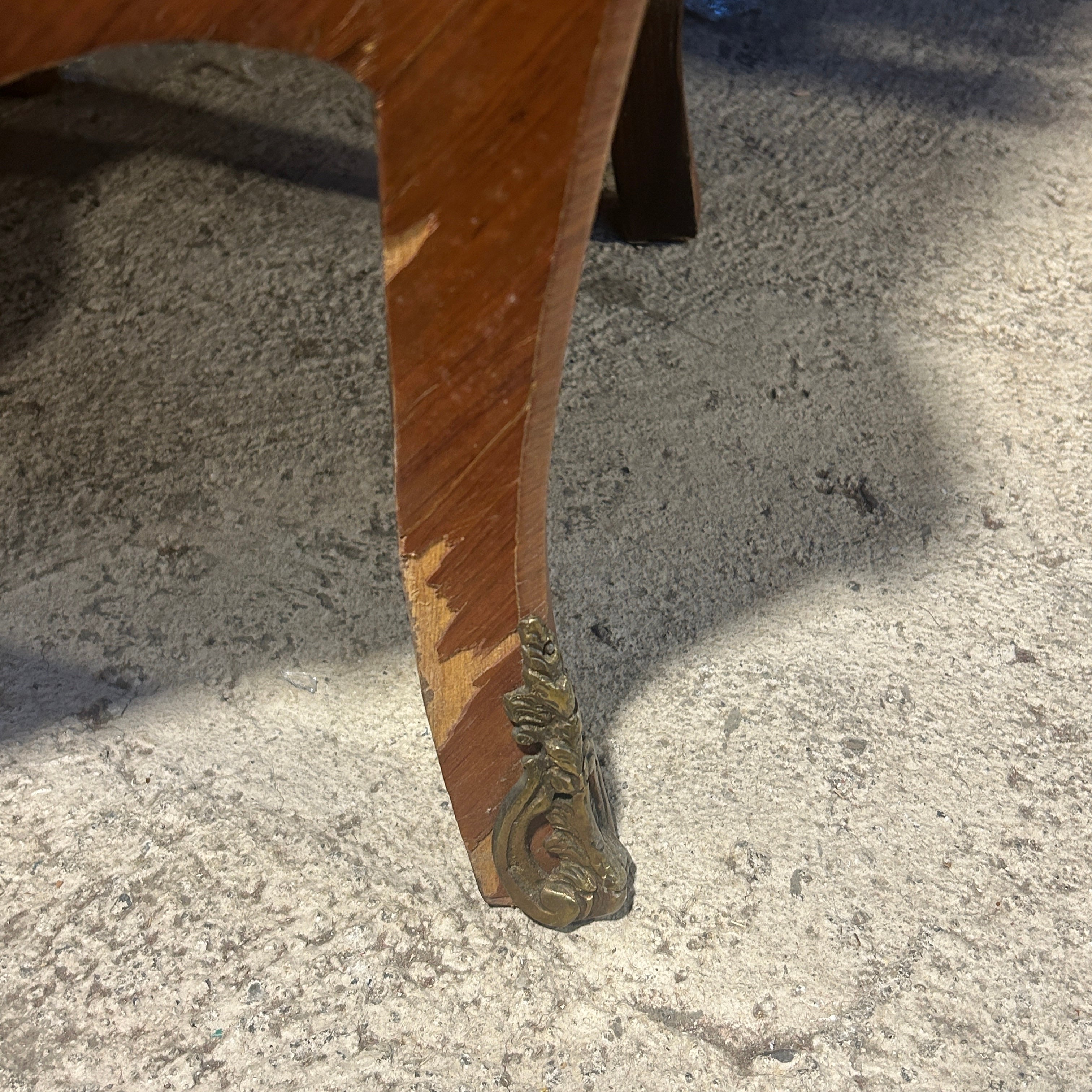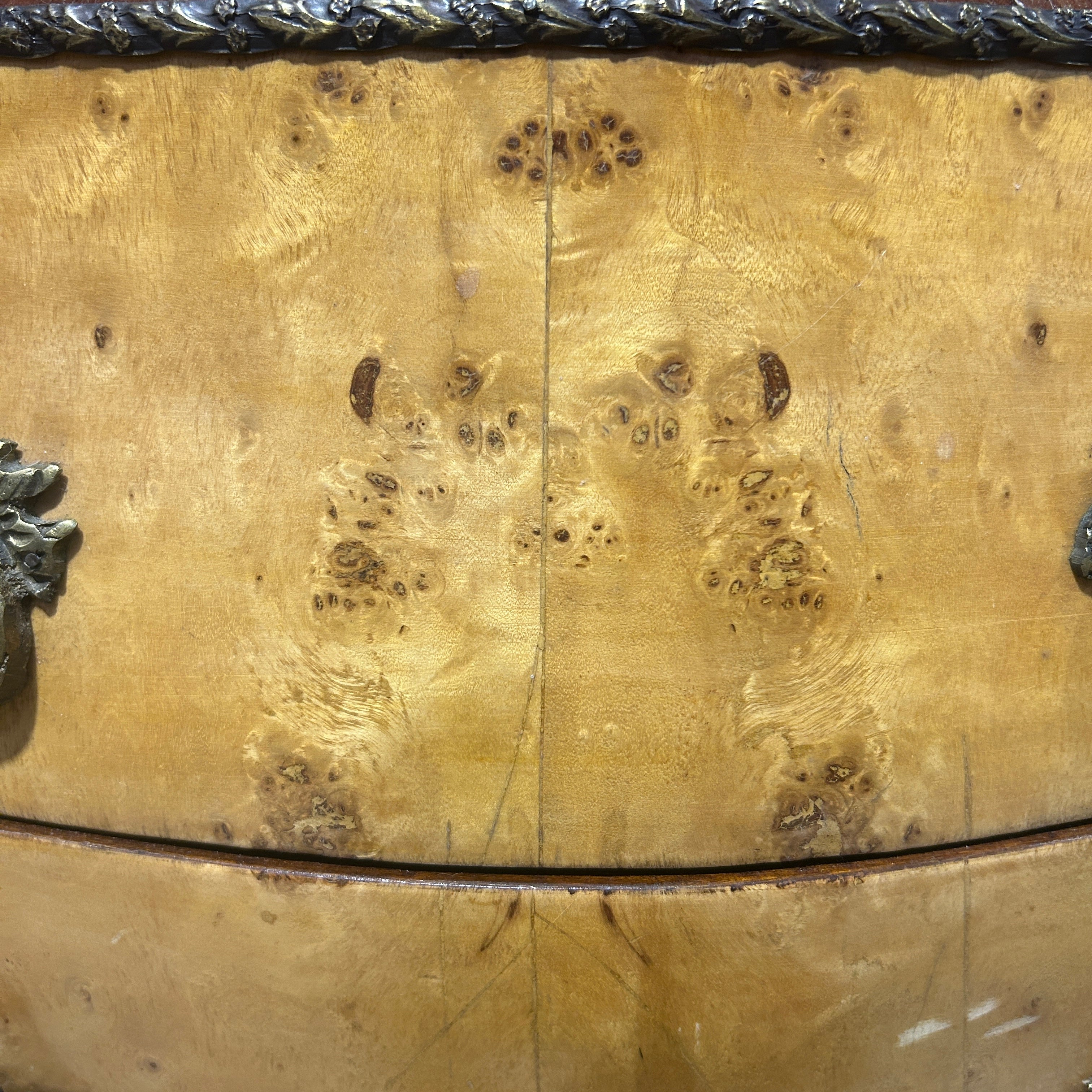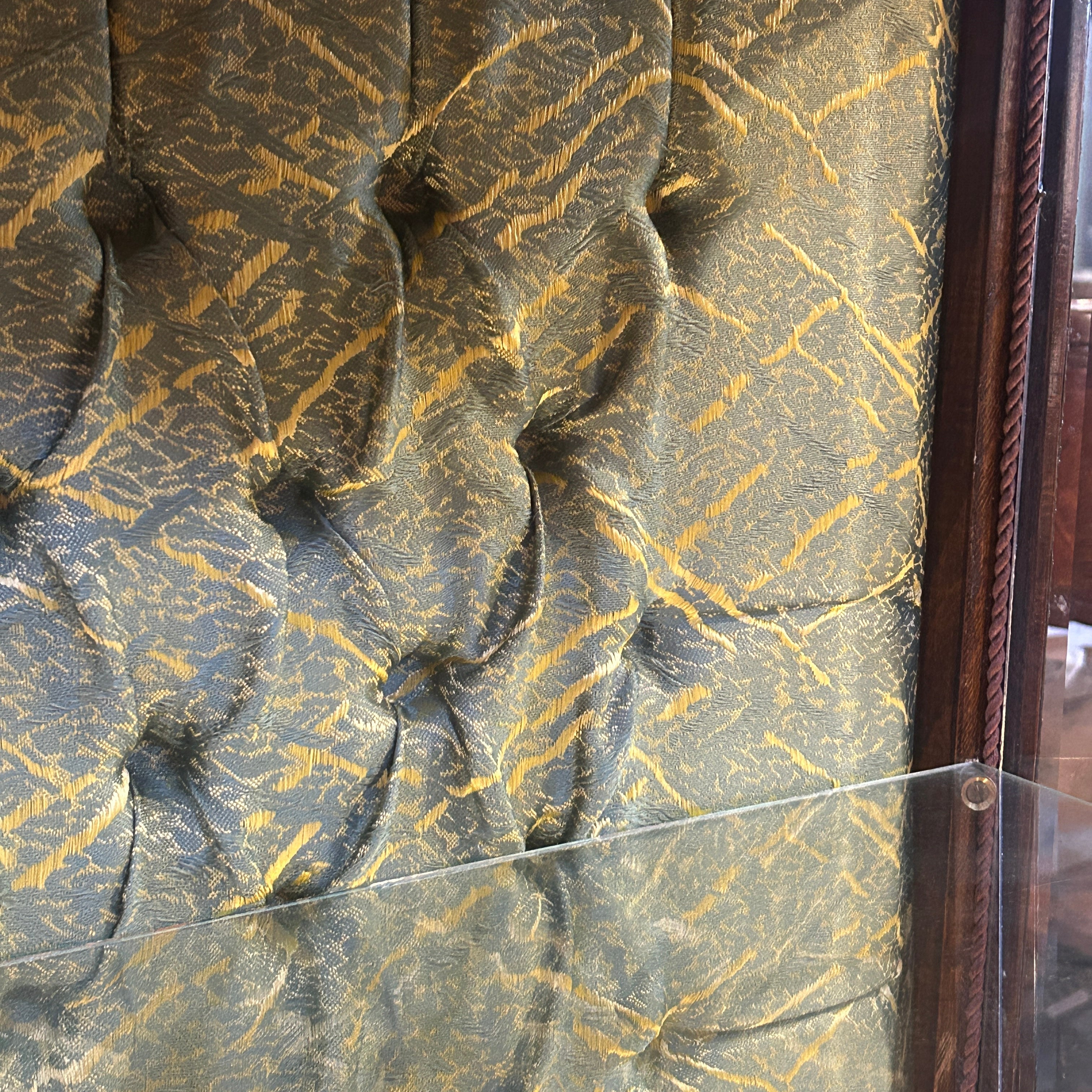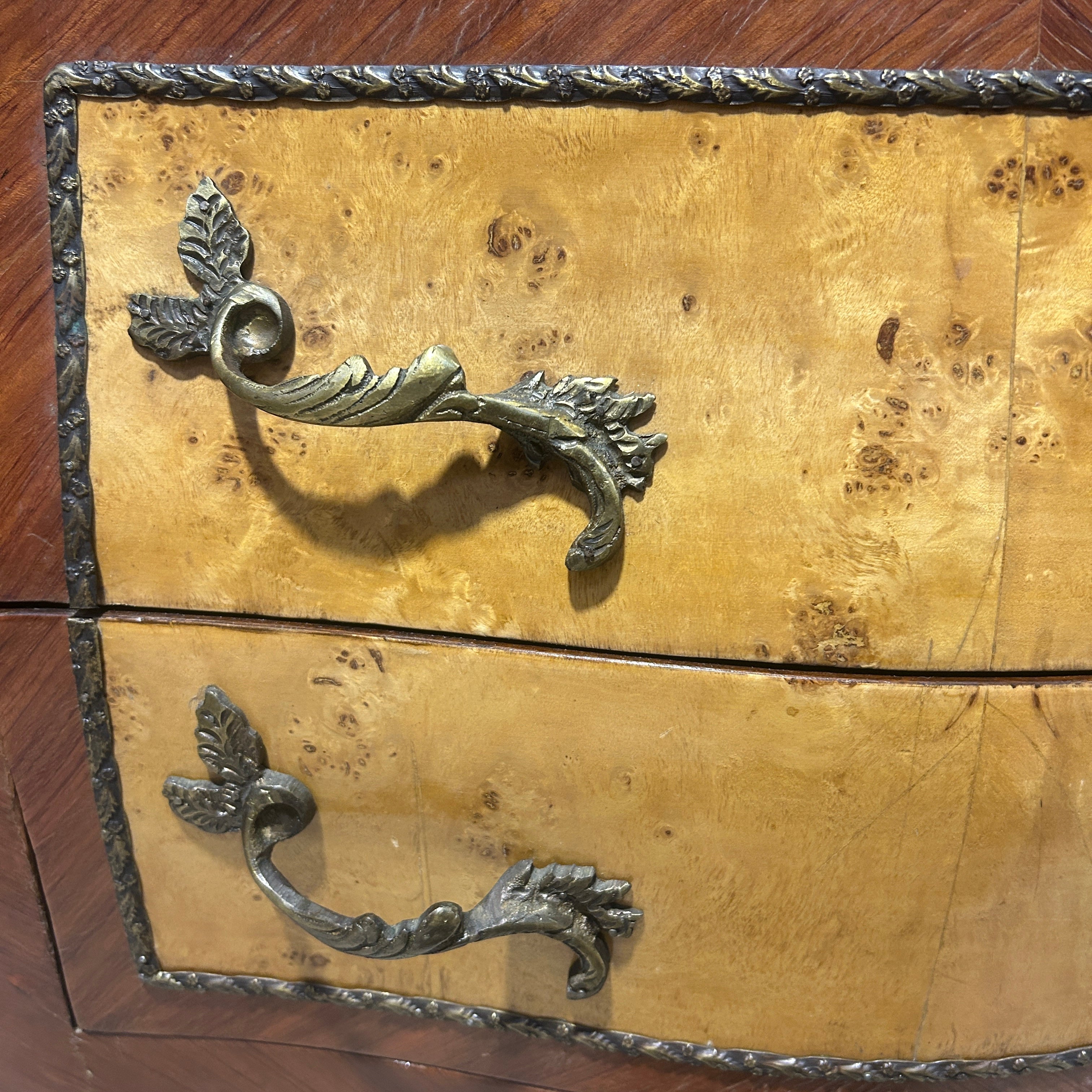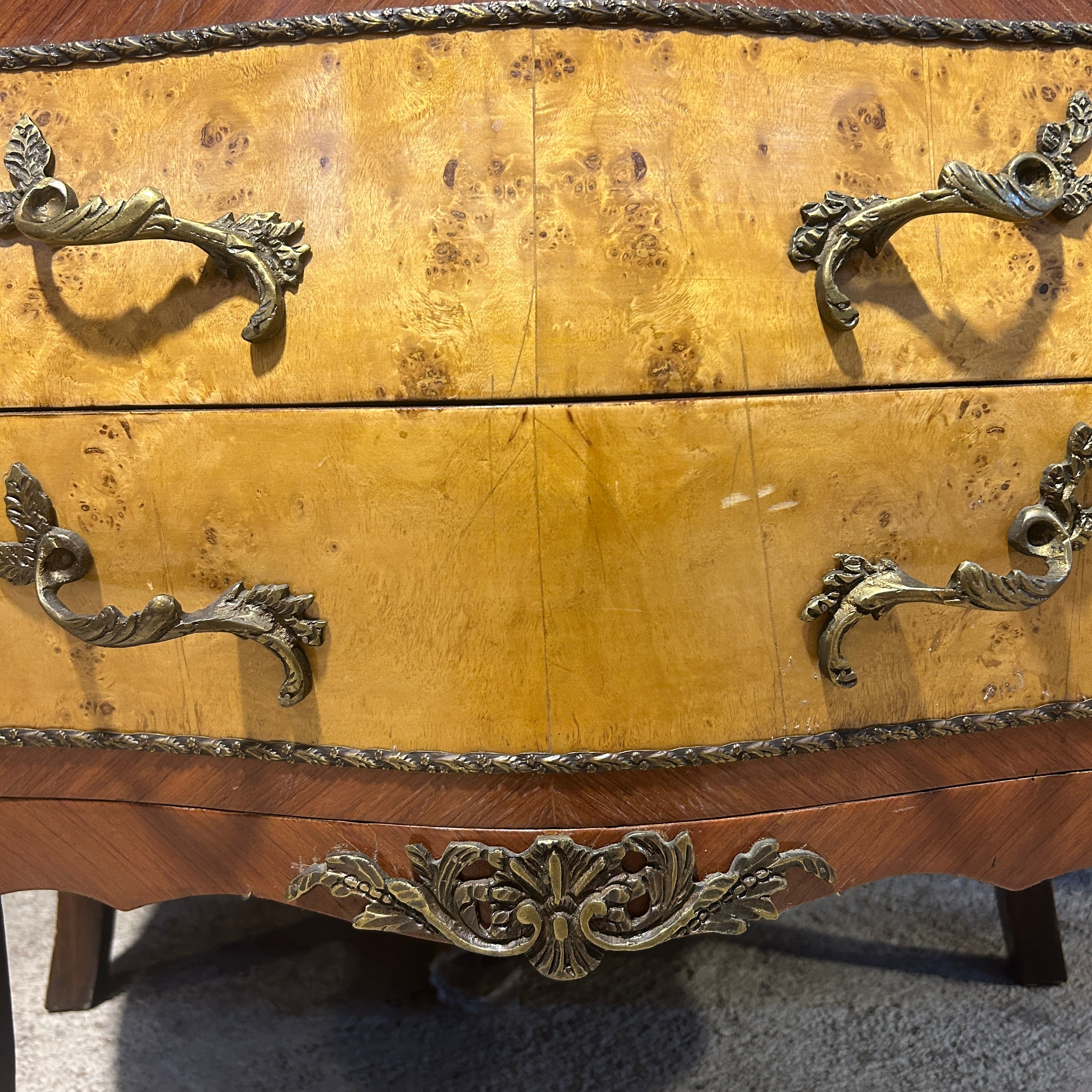 Hermosa vitrina francesa de entrepaño de color pistacho, madera de palorosa y erable. Cuenta con dos cajones inferiores bombé y con con tiradores y aplicaciones en bronce. Tiene un bello filete más oscuro que corona la parte superior de ella. Se destaca por su pequeño tamaño, lo cual la vuelve ideal para espacios más reducidos