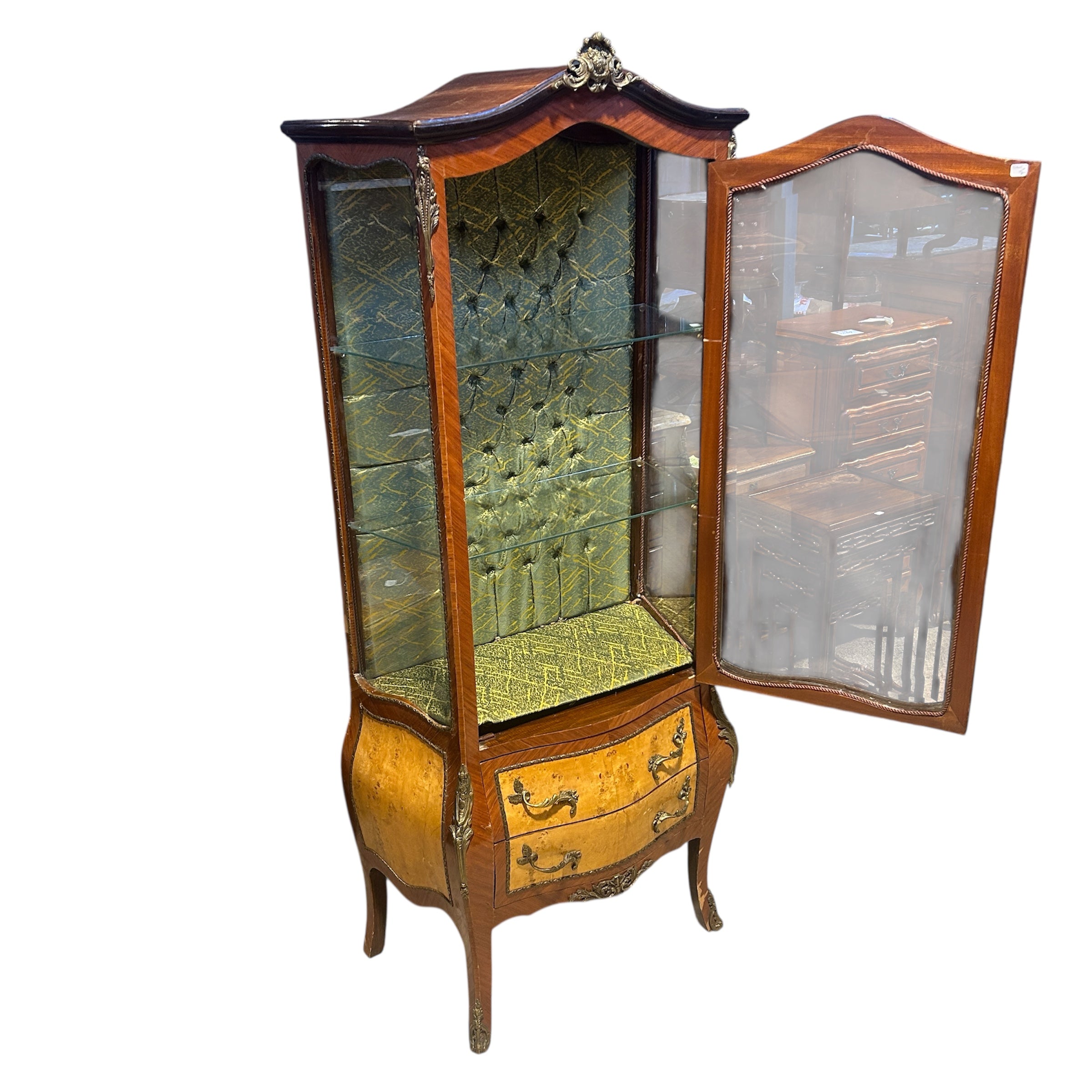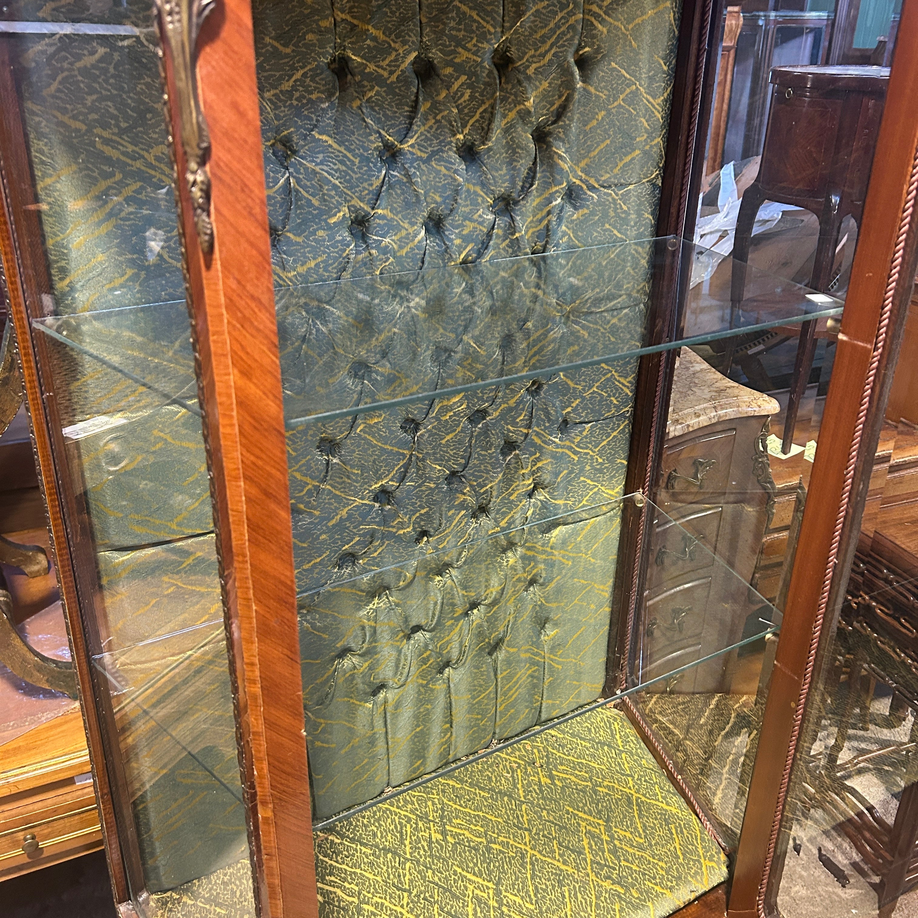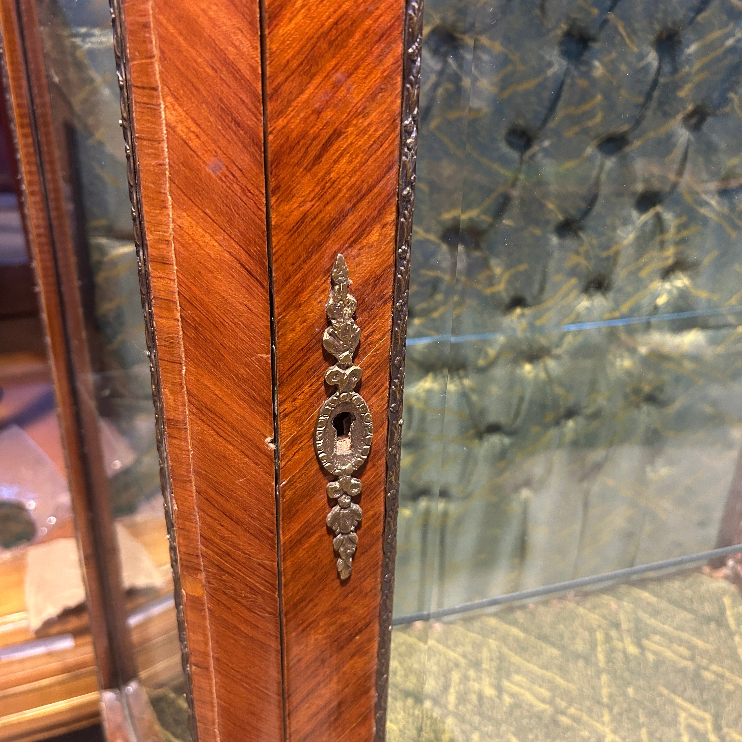 Madera con filetes, puerta vidriada, dos cajones, base bombé, dos repisas de vidrio. Principios del siglo XX, Francia.