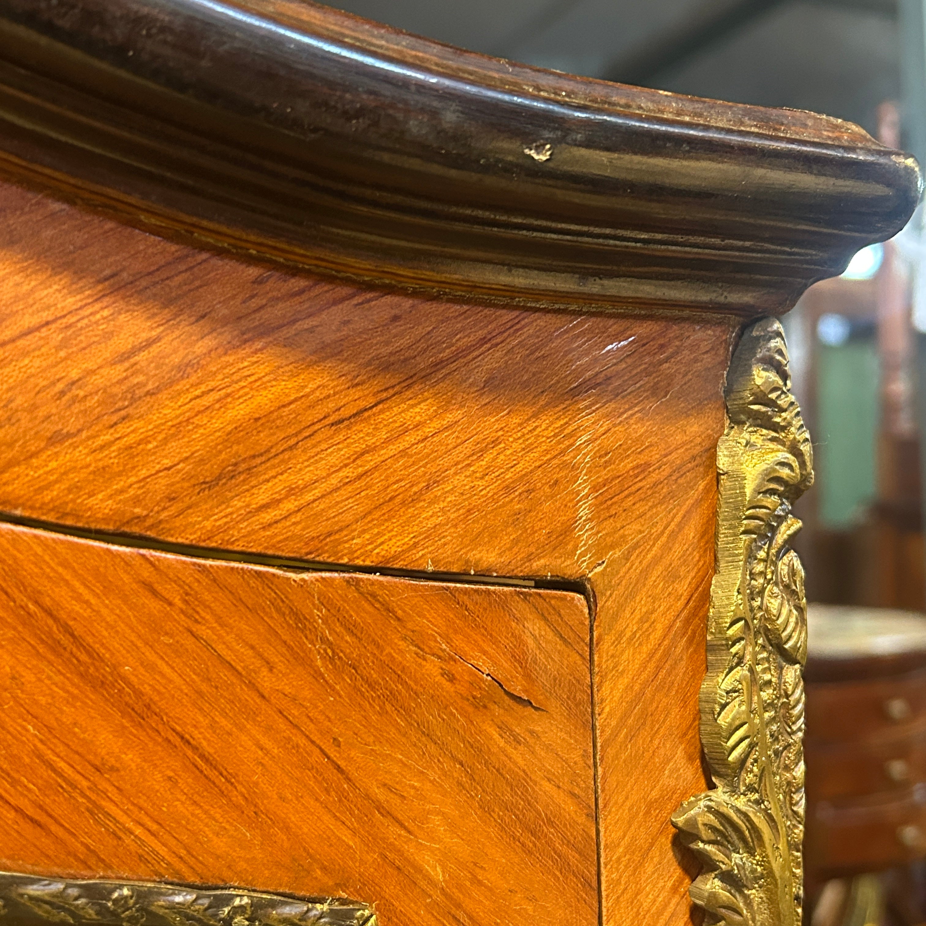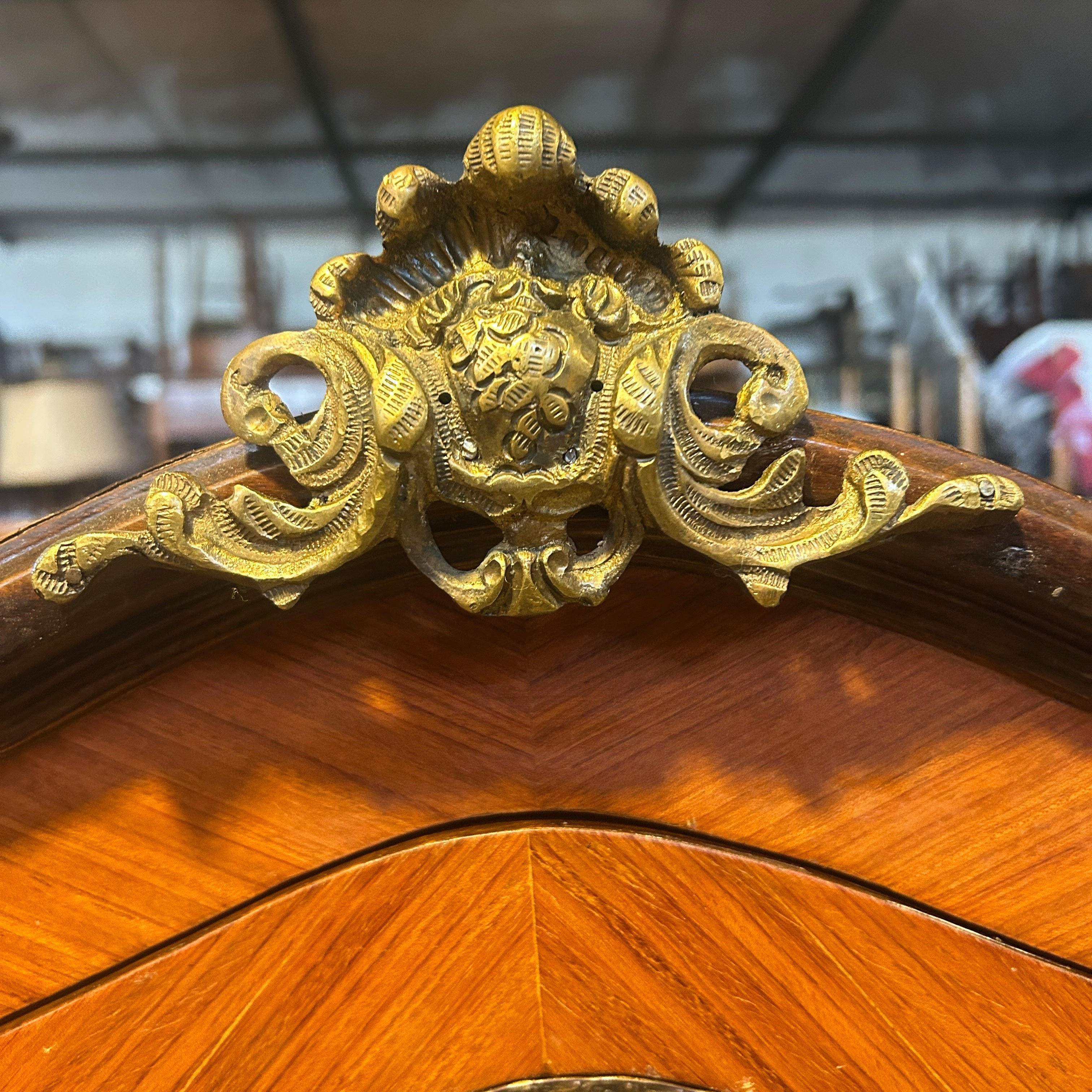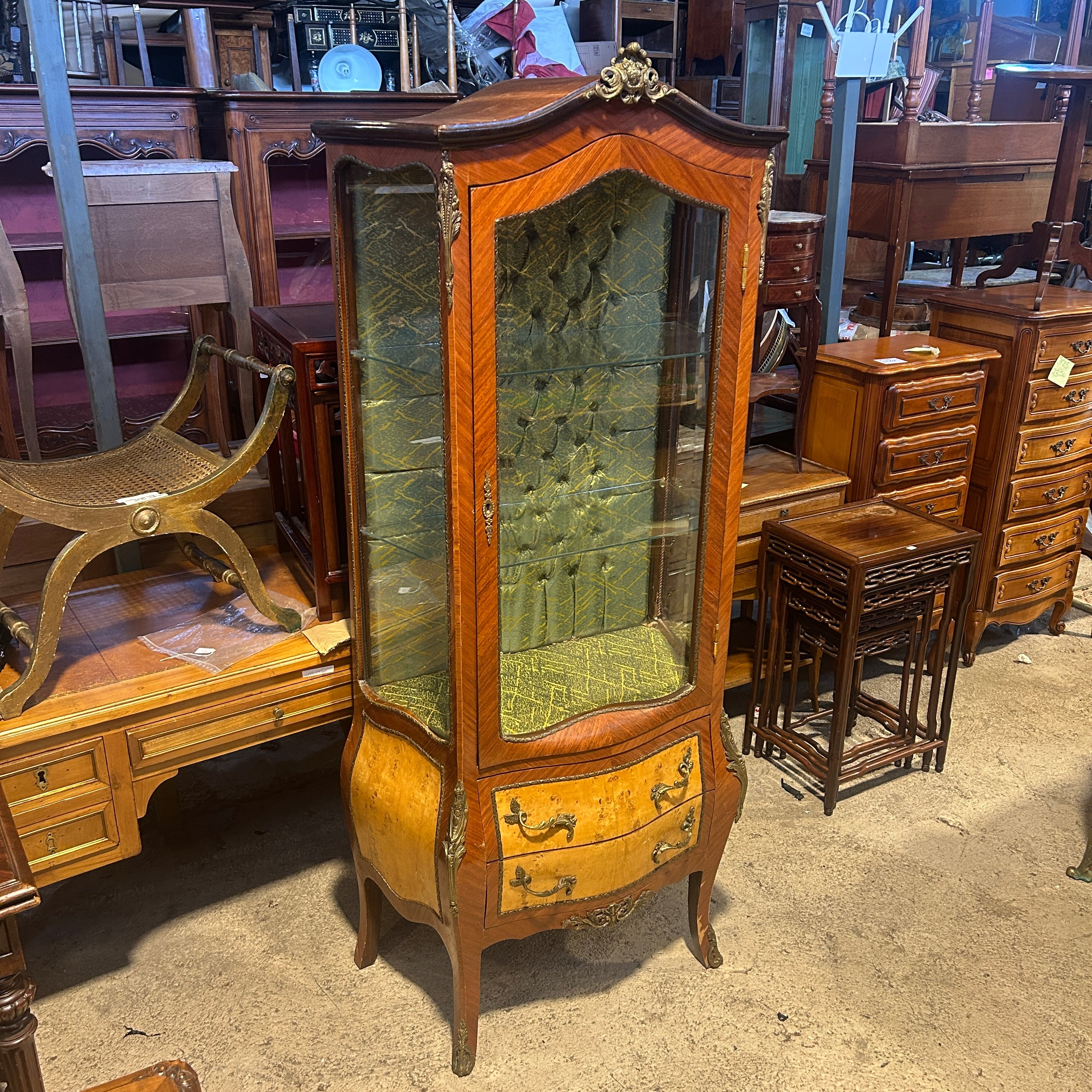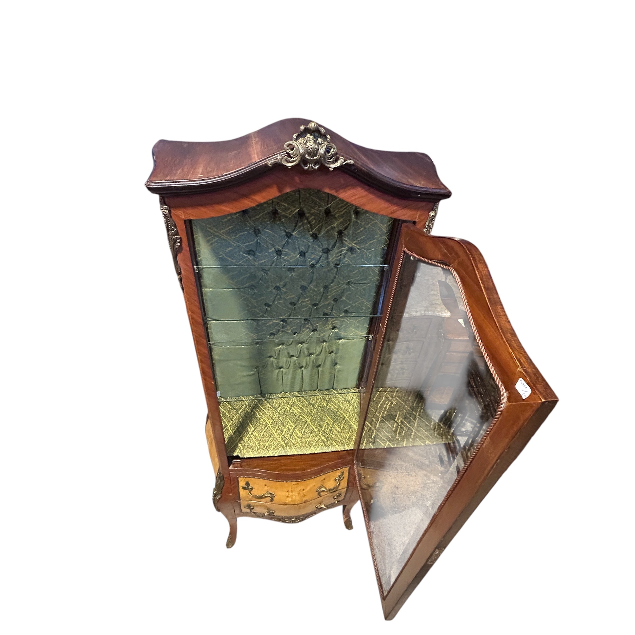 Madera con filetes, puerta vidriada, dos cajones, base bombé, dos repisas de vidrio. Principios del siglo XX, Francia.