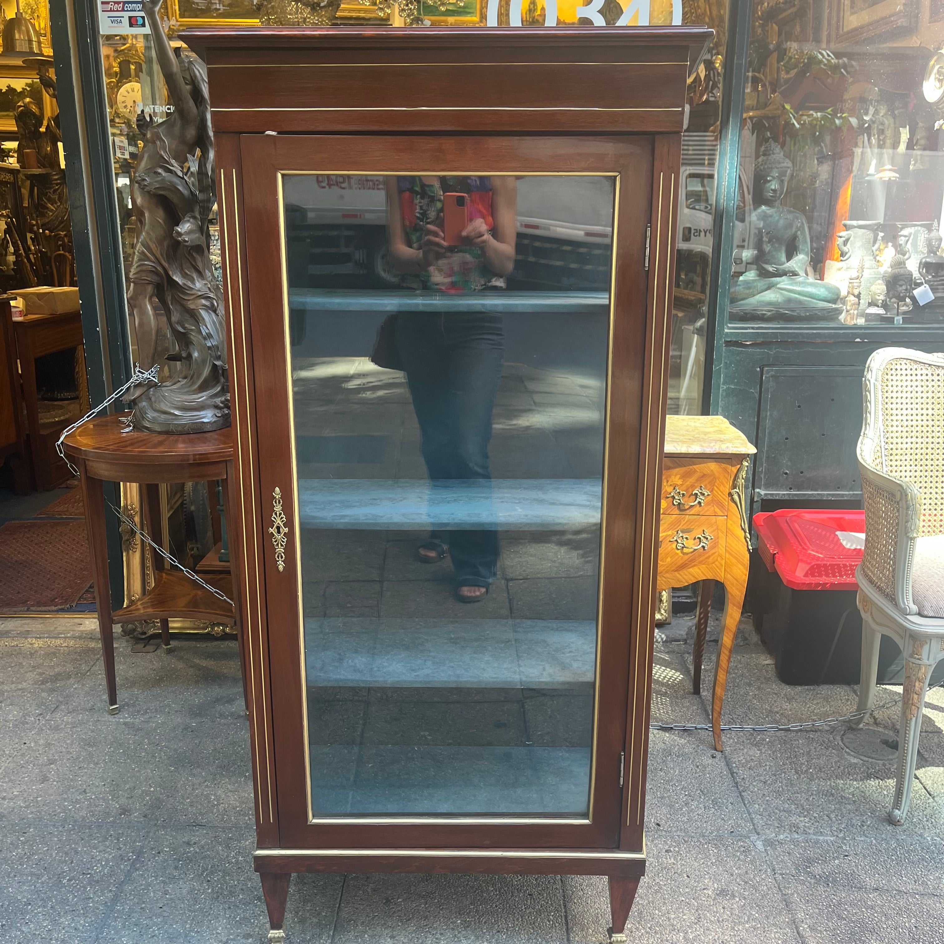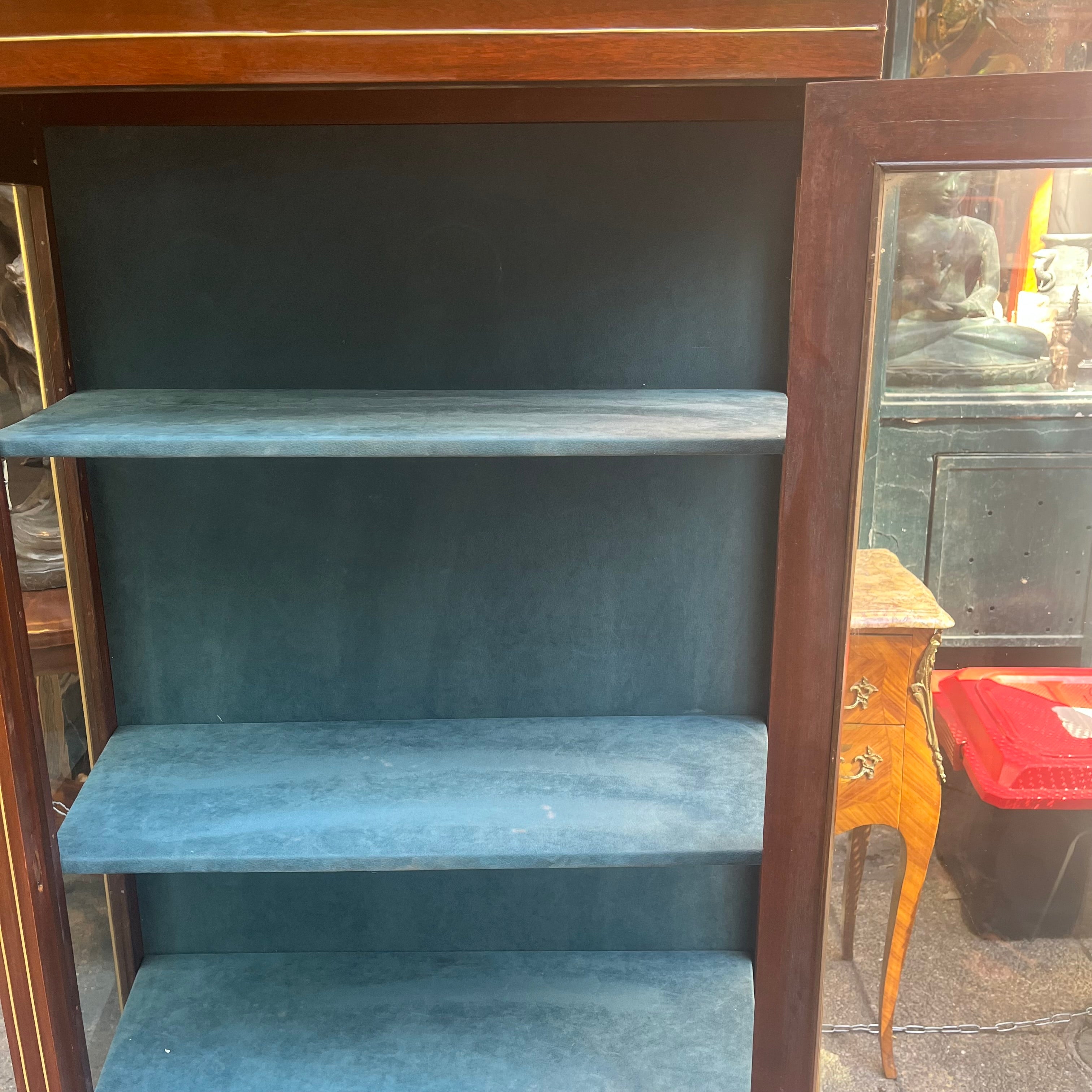 Preciosa vitrina Luís XVI caoba con vidrio frontal y laterales con decoraciones en bronce en su exterior. El interior se encuentra tapizado en azul acero aterciopelado y tres cuenta con tres repisas.