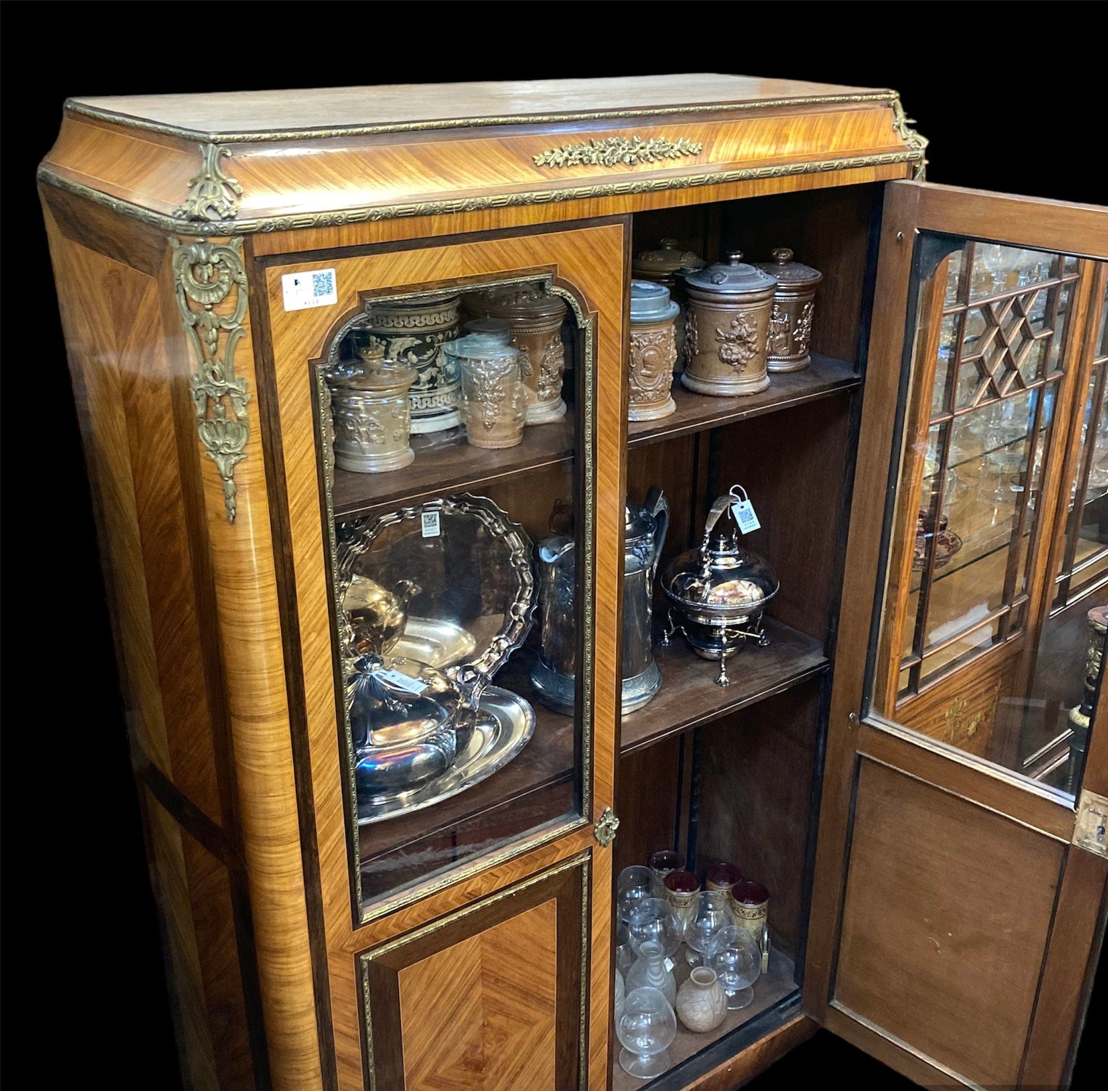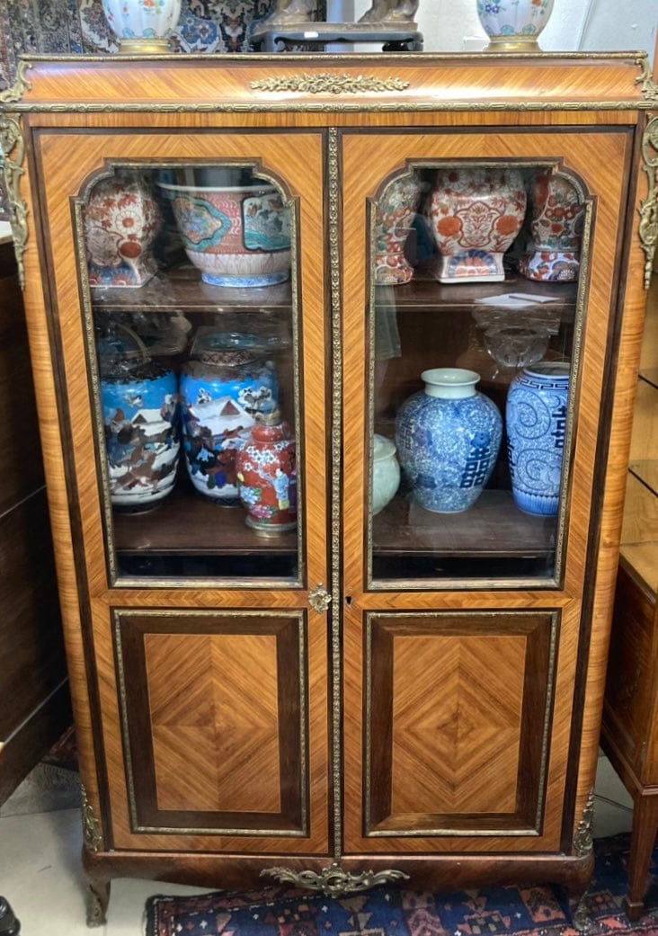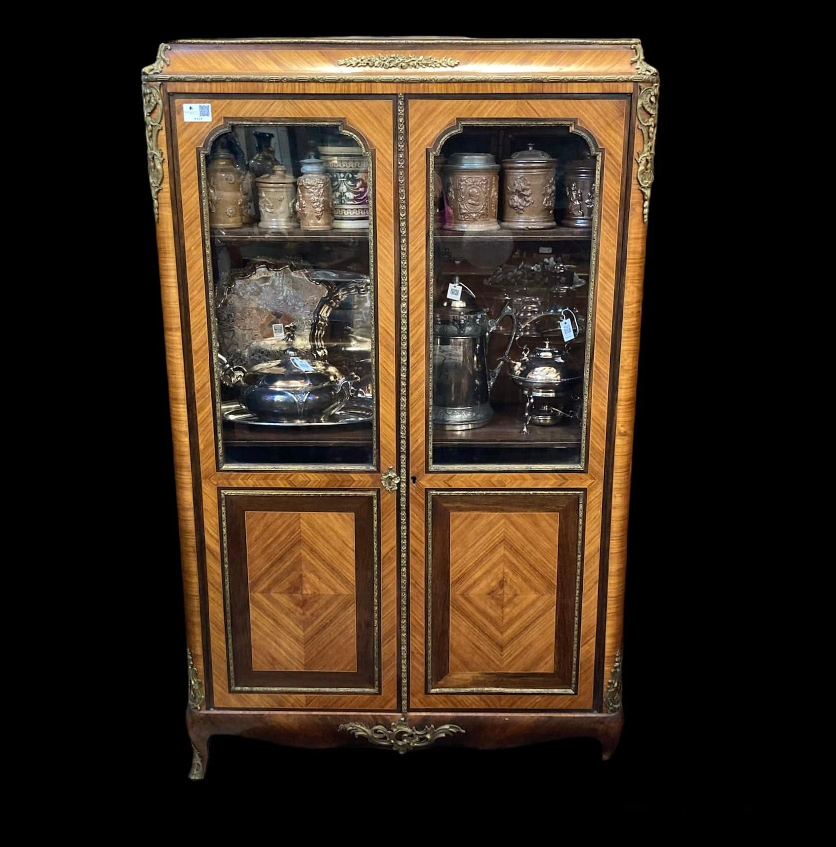 Vitrina estilo librero Luis XV con marquetería y aplicaciones de bronce. Contiene tres niveles en su interior.