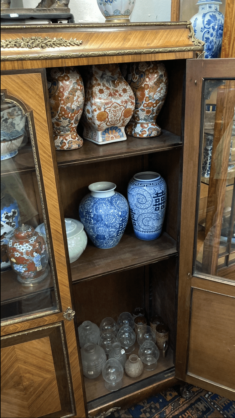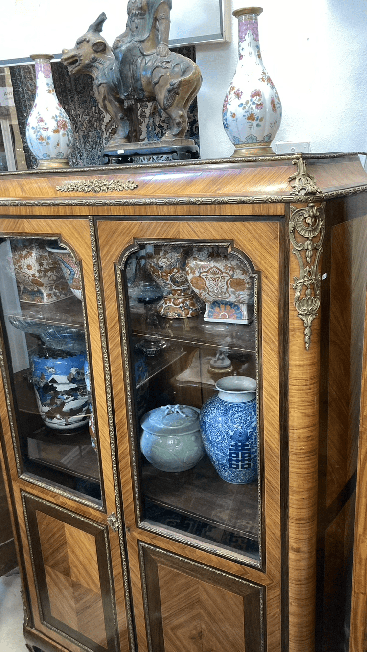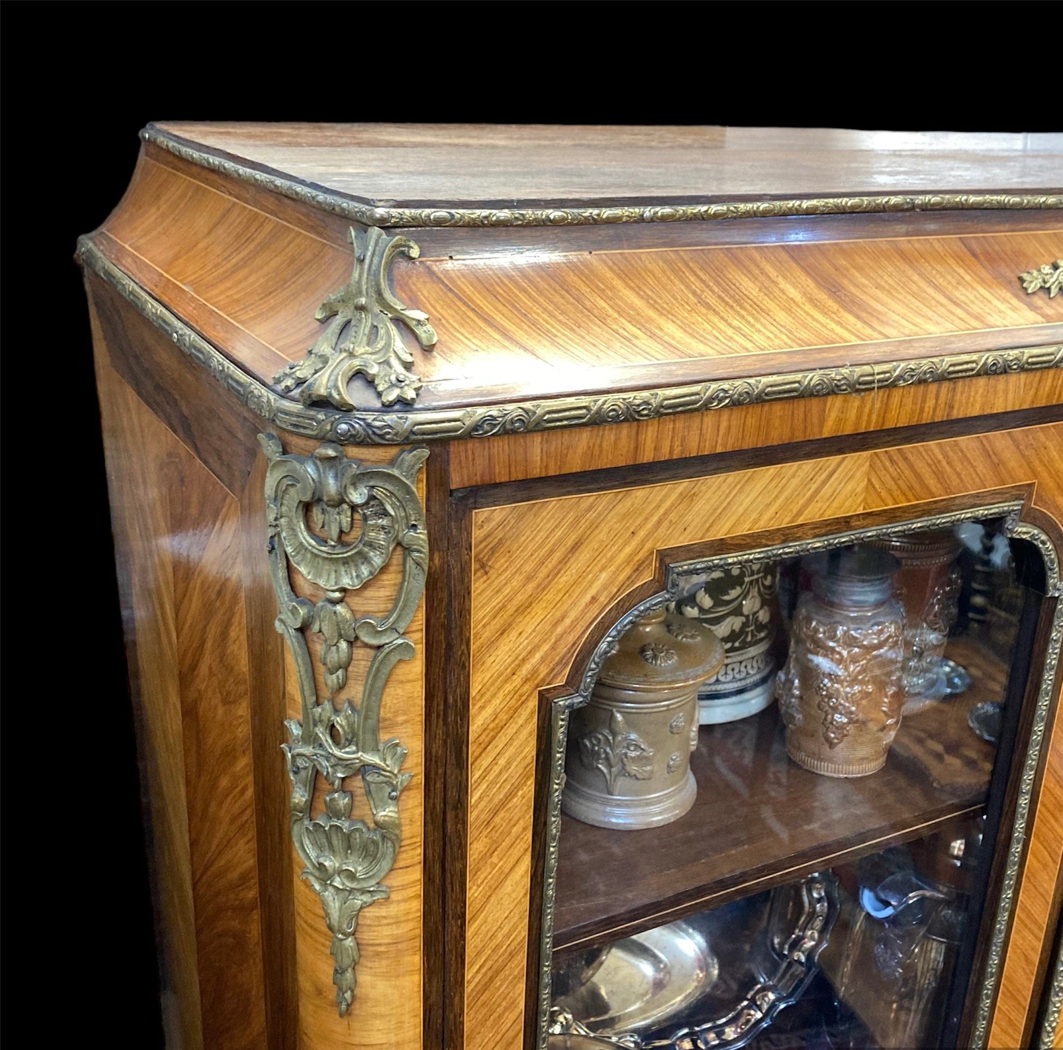 Vitrina estilo librero Luis XV con marquetería y aplicaciones de bronce. Contiene tres niveles en su interior.