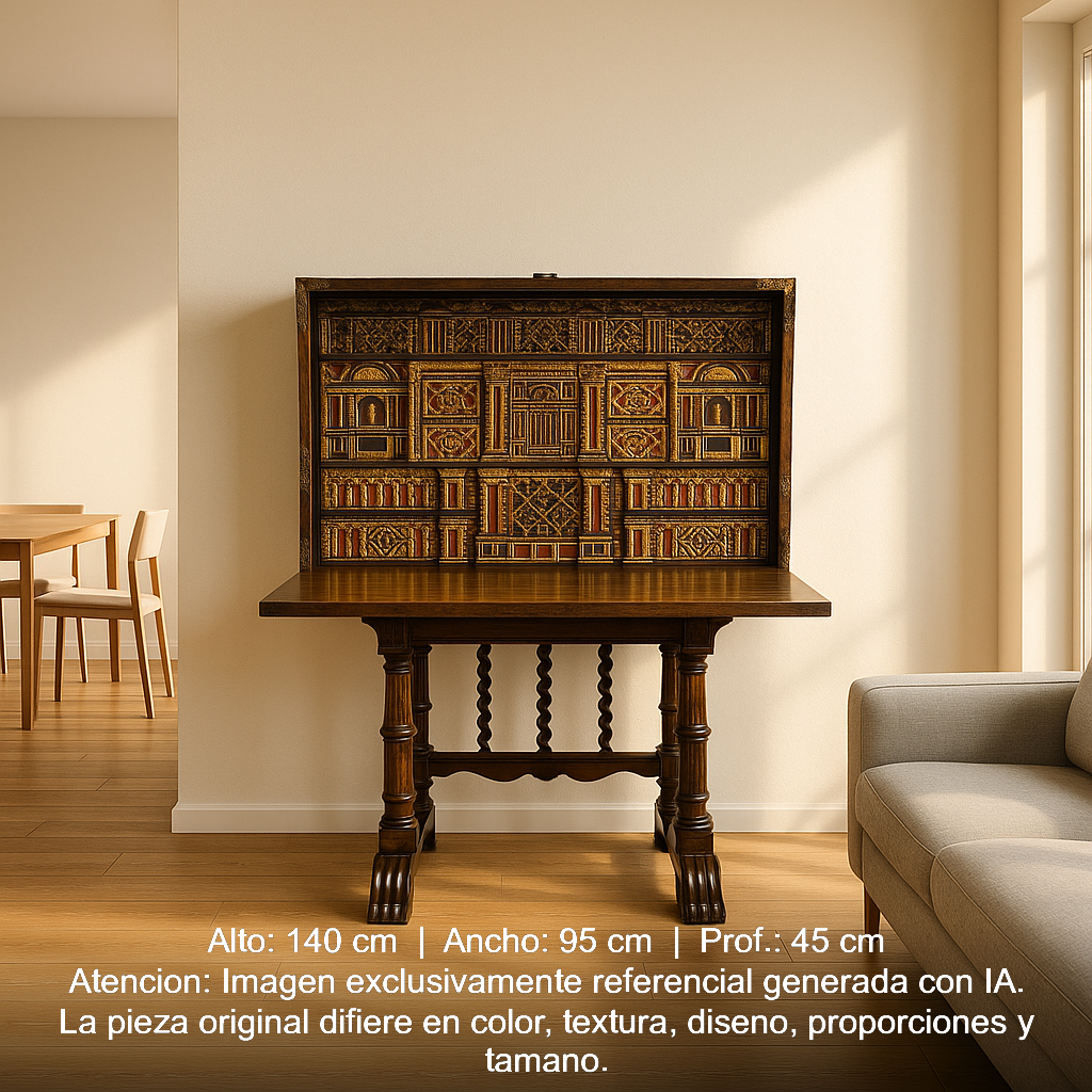 Bargueño español nogal s.XIX detalles policromados aplicaciones bronce y hierro