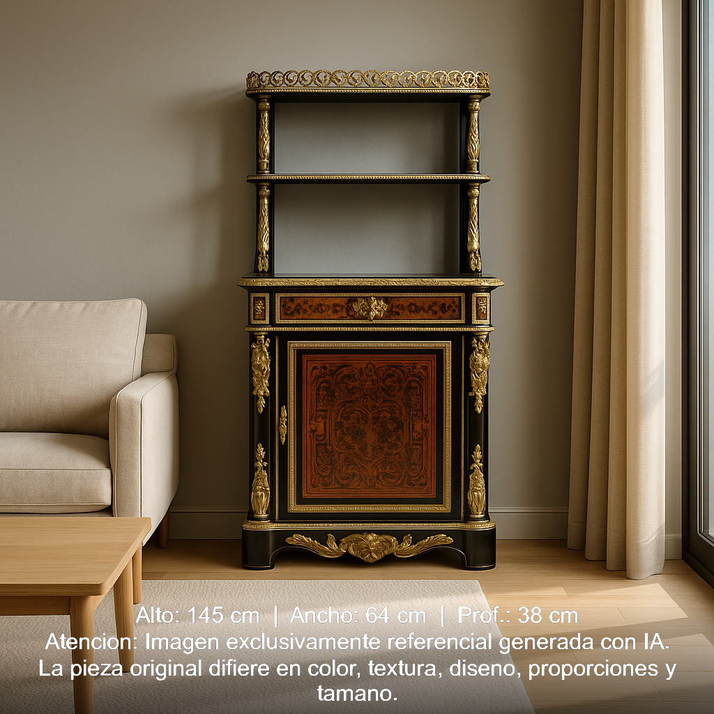 Hermoso vajillero de madera estilo Napoleón III con aplicaciones e incrustaciones en bronce y carey. La parte superior destacan dos repisas con un bello balcón de bronce y soportes curvos de diferentes tamaños, cada repisa viene decorada con un detallado borde de bronce cincelado en motivo vegetal, al igual que los pilares traseros que sostienen la estructura superior. En el centro tiene un cajón extenso también con aplicaciones en bronce y figuras angelicales. La parte inferior es un maravilloso boulle enmarcado en coronas de bronce y aplicaciones de figuras femeninas en ambos costados. En su centro mezcla el bronce con un delicado carey rojo.