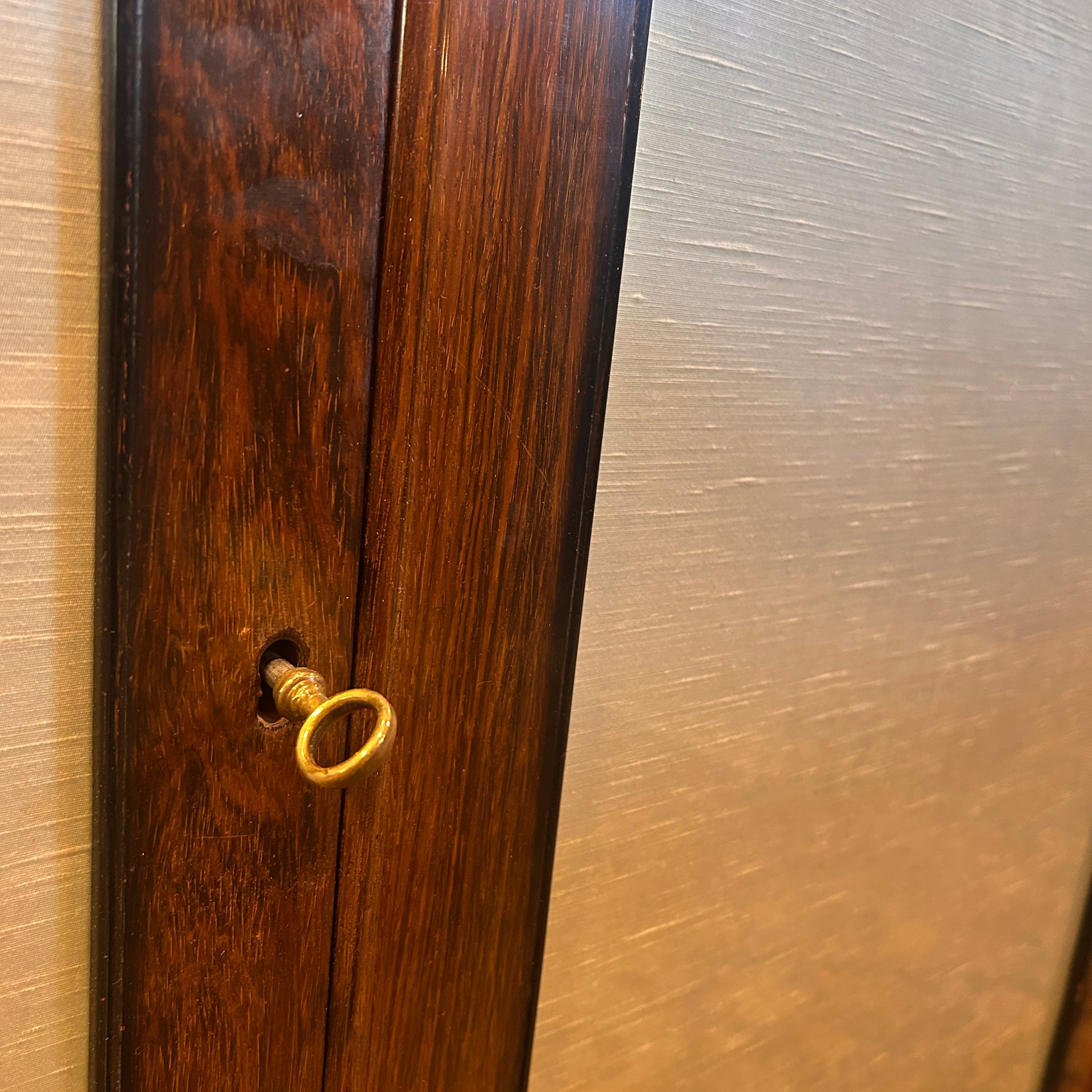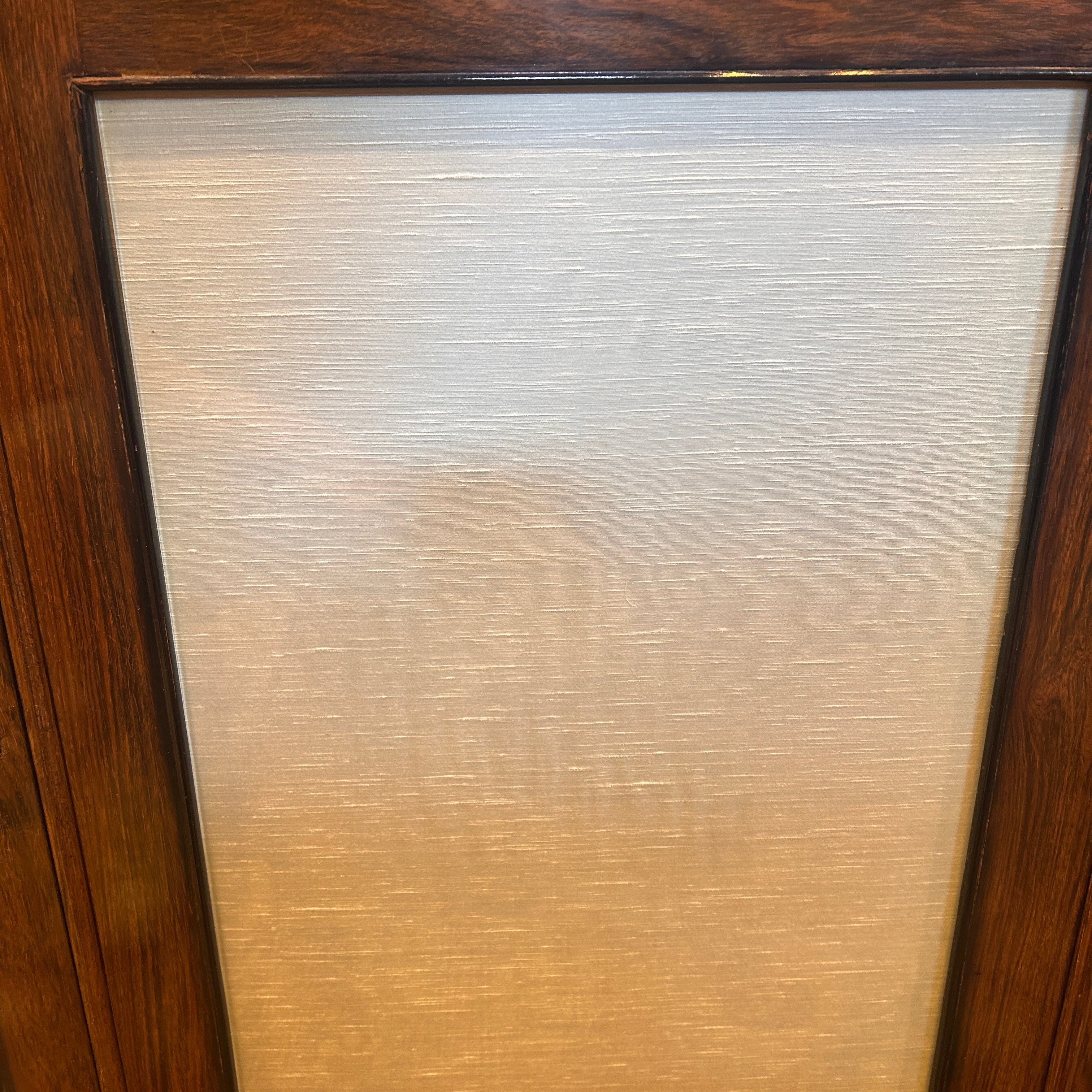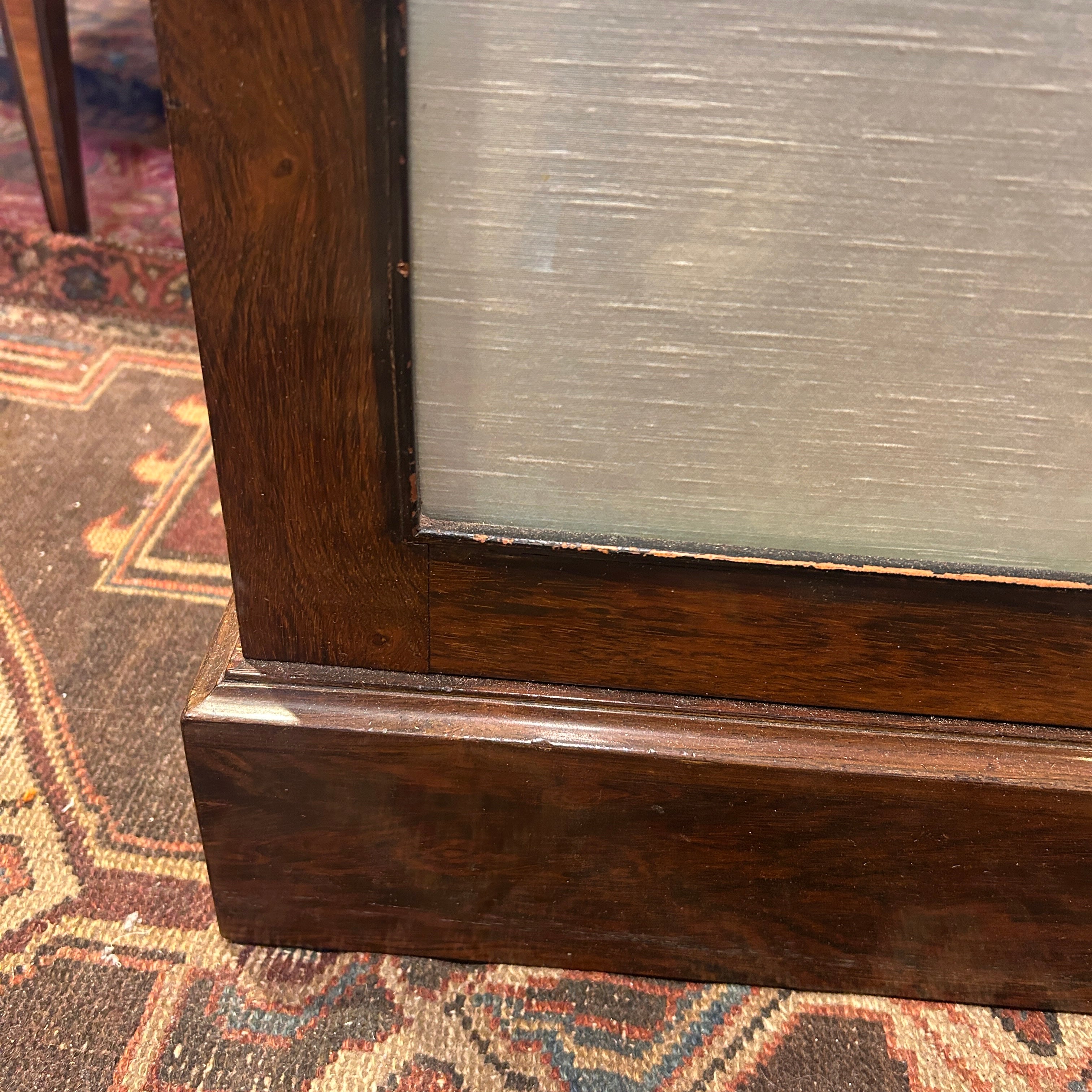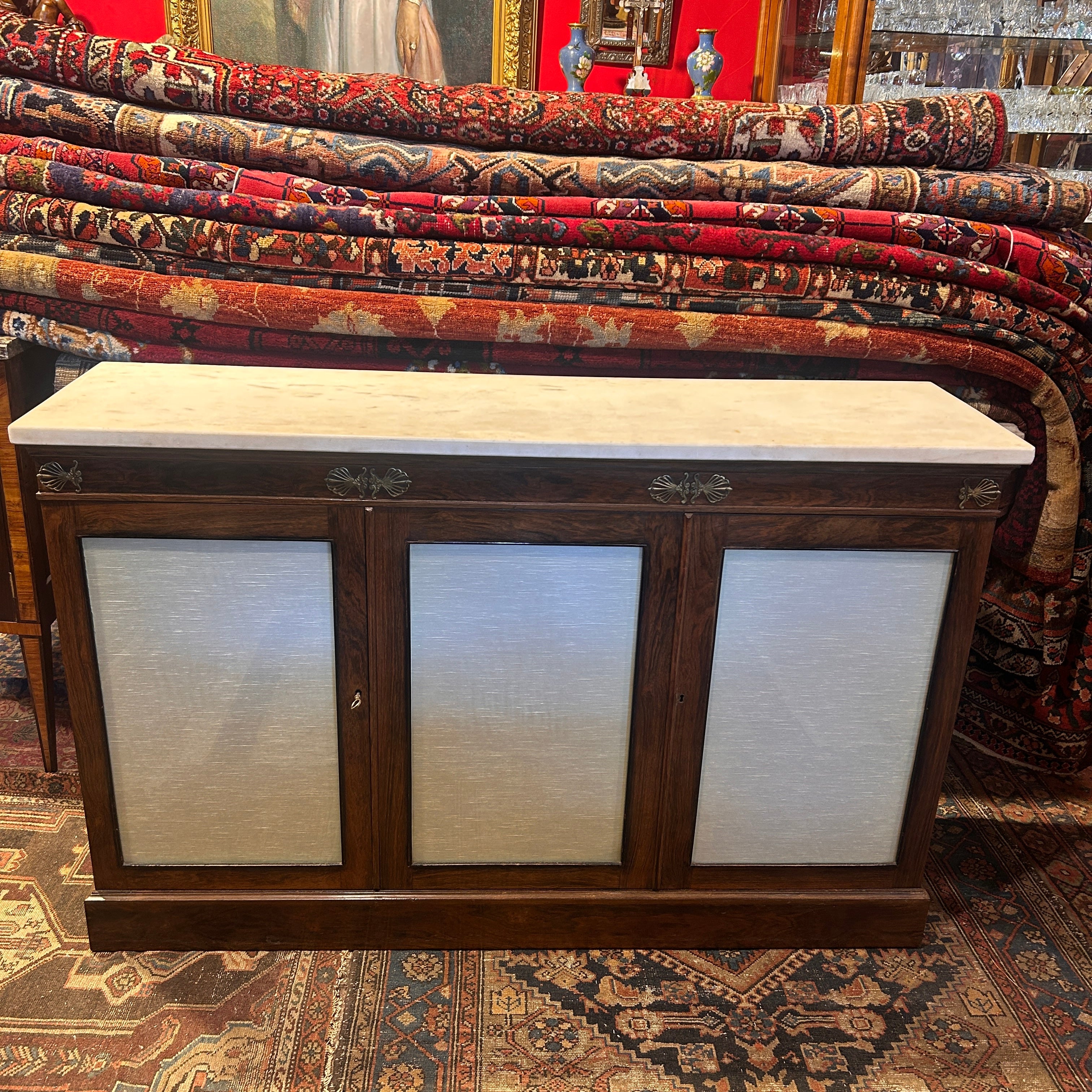 Elegante biblioteca o buffet francés estilo Imperio de peincipios del 1900 en palisandro, decorada con bronces dorados y mármol blanco. Doble espacio de almacenaje interior con tres repisas y vidrios cubiertos de tela.