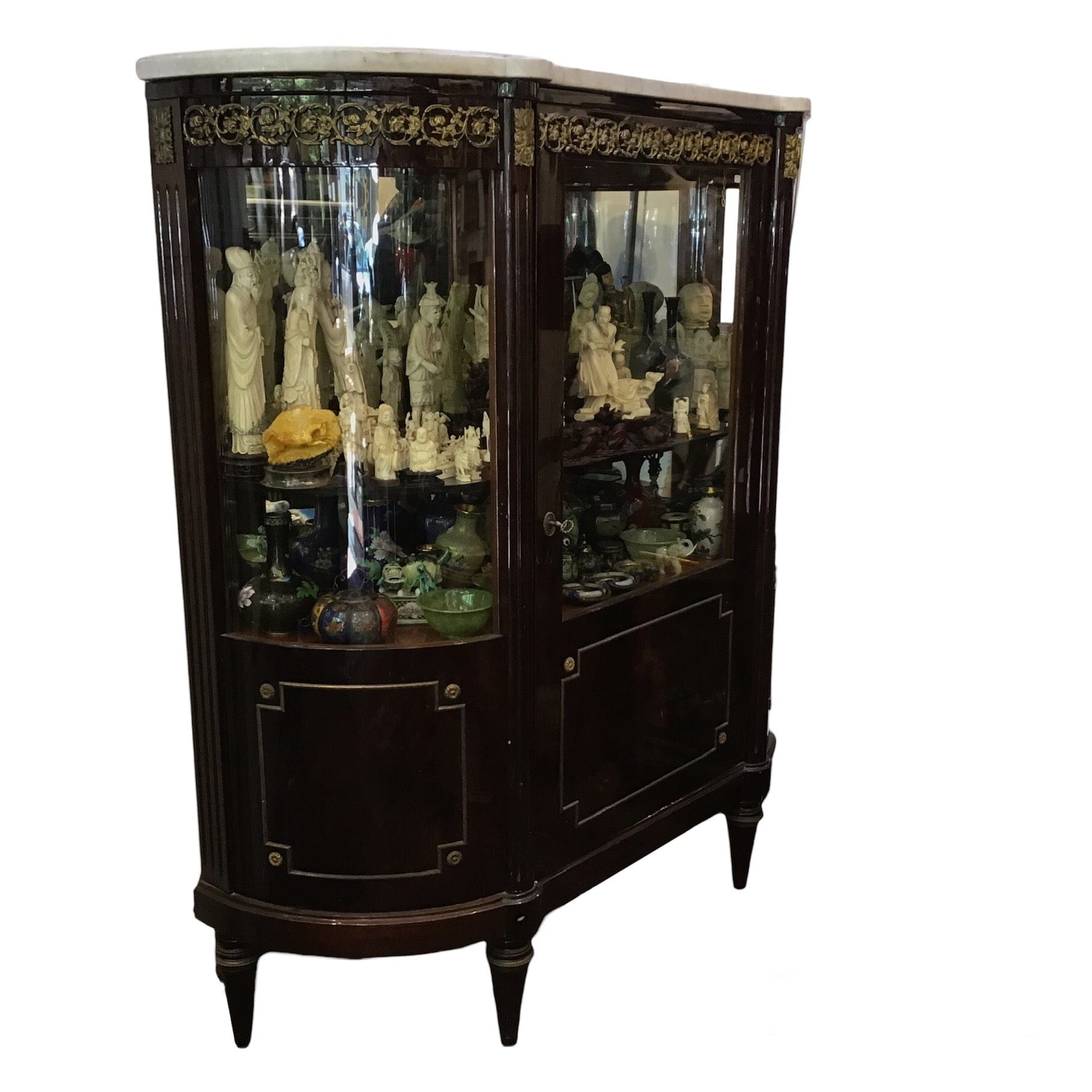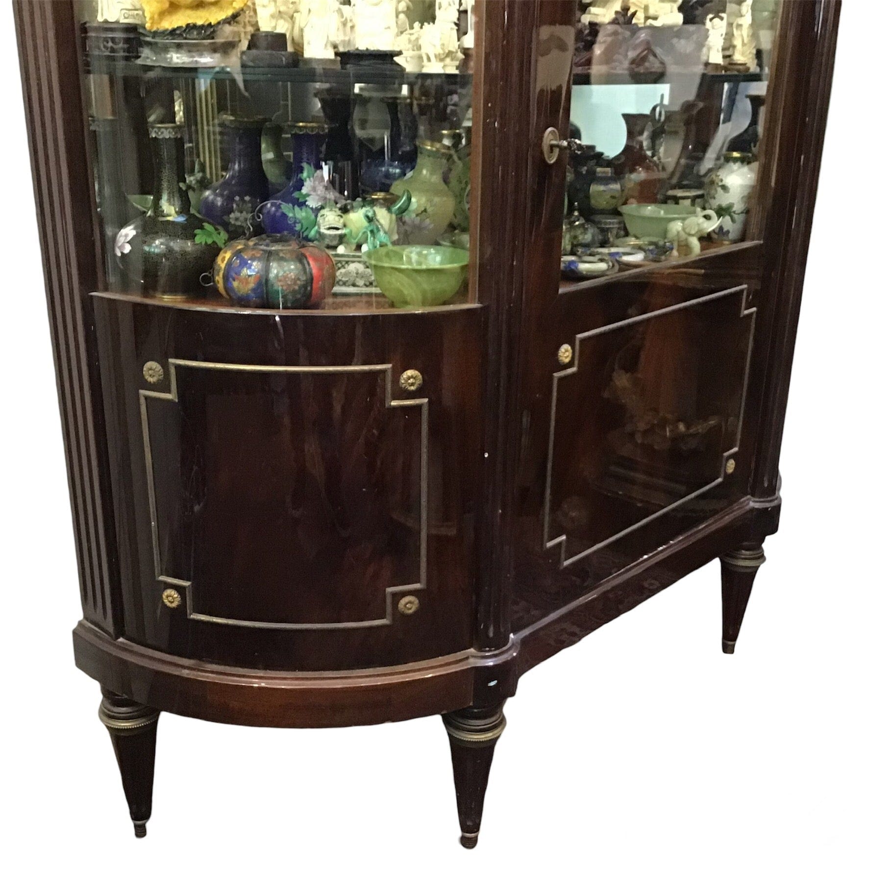 Vitrina de estilo Luis XVI construida en fina madera de caoba. Con vidrio bombé en los costados, aplicaciones de bronce. Cuenta con dos repisas y una puerta con llave y cerradura.