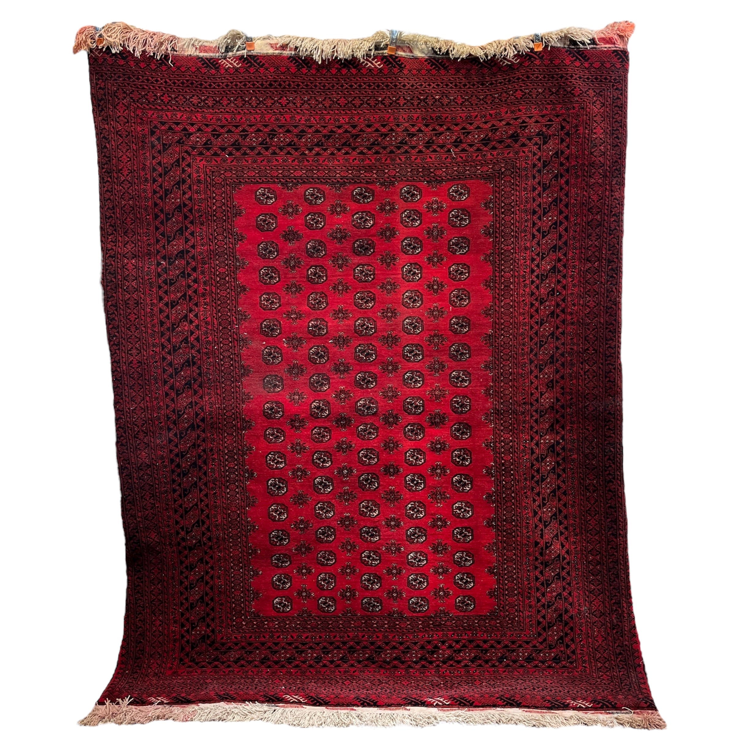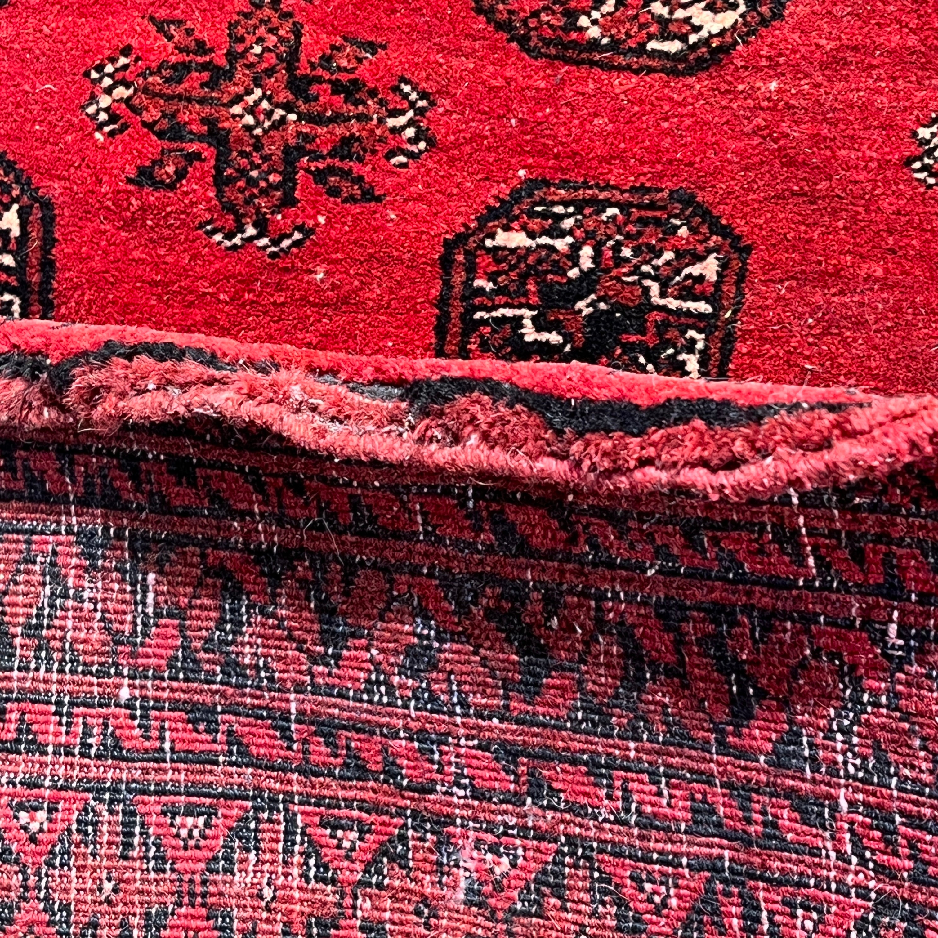 Llamativa alfombra de origen pakistaní, hecha de lana tejida y teñida a mano con lana de primera calidad y tintes naturales. Este tipo de alfombras, tejidas en Pakistán, toman la tradición originaria de diseño de la tribu turcomana Tekke, se caracterizan por un patrón repetitivo de motivos geométricos ovalados o en forma de huella de elefante, conocidos como gules. Estos diseños suelen presentarse en tonos rojizos, amarillos, verdes y blancos. En el caso de esta pieza, el diseño se des´pliega en tonos rojos, negros y detalles blancos. Otro elemento distintivo de esta bella alfombra, son sus cenefas gruesas, que hacen destacar el intrincado patrón geométrico utilizado para bordear la mayoría de las alfombras orientales.