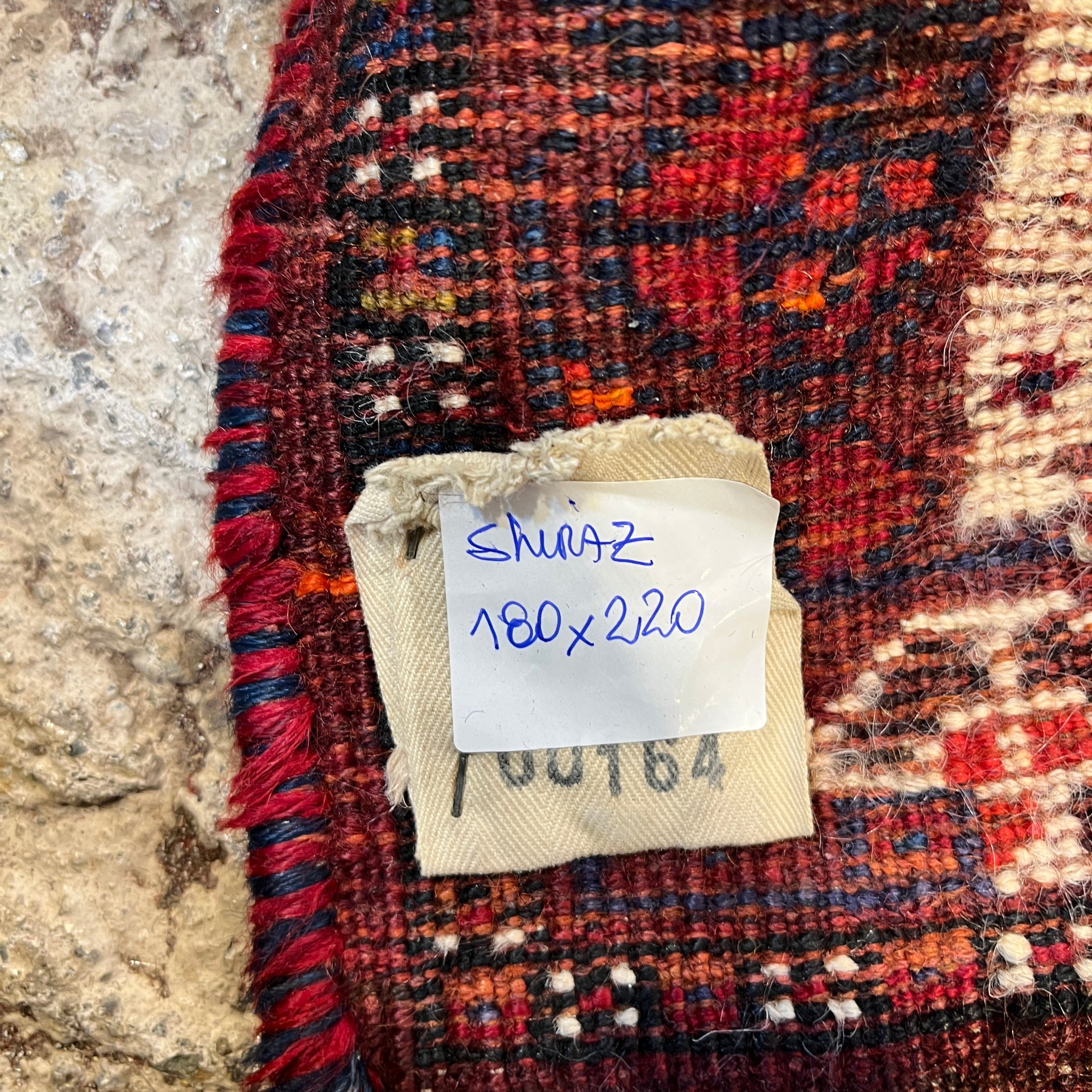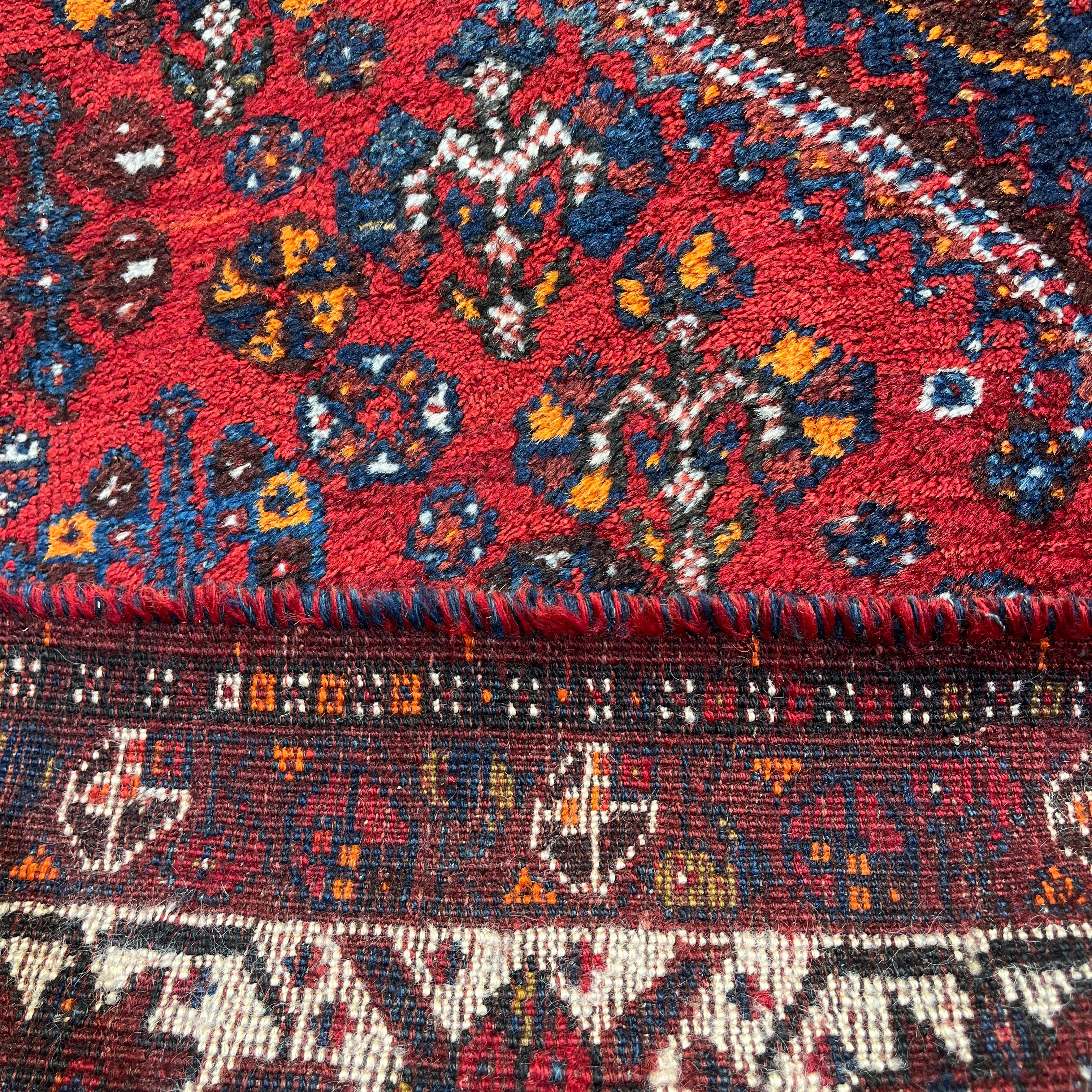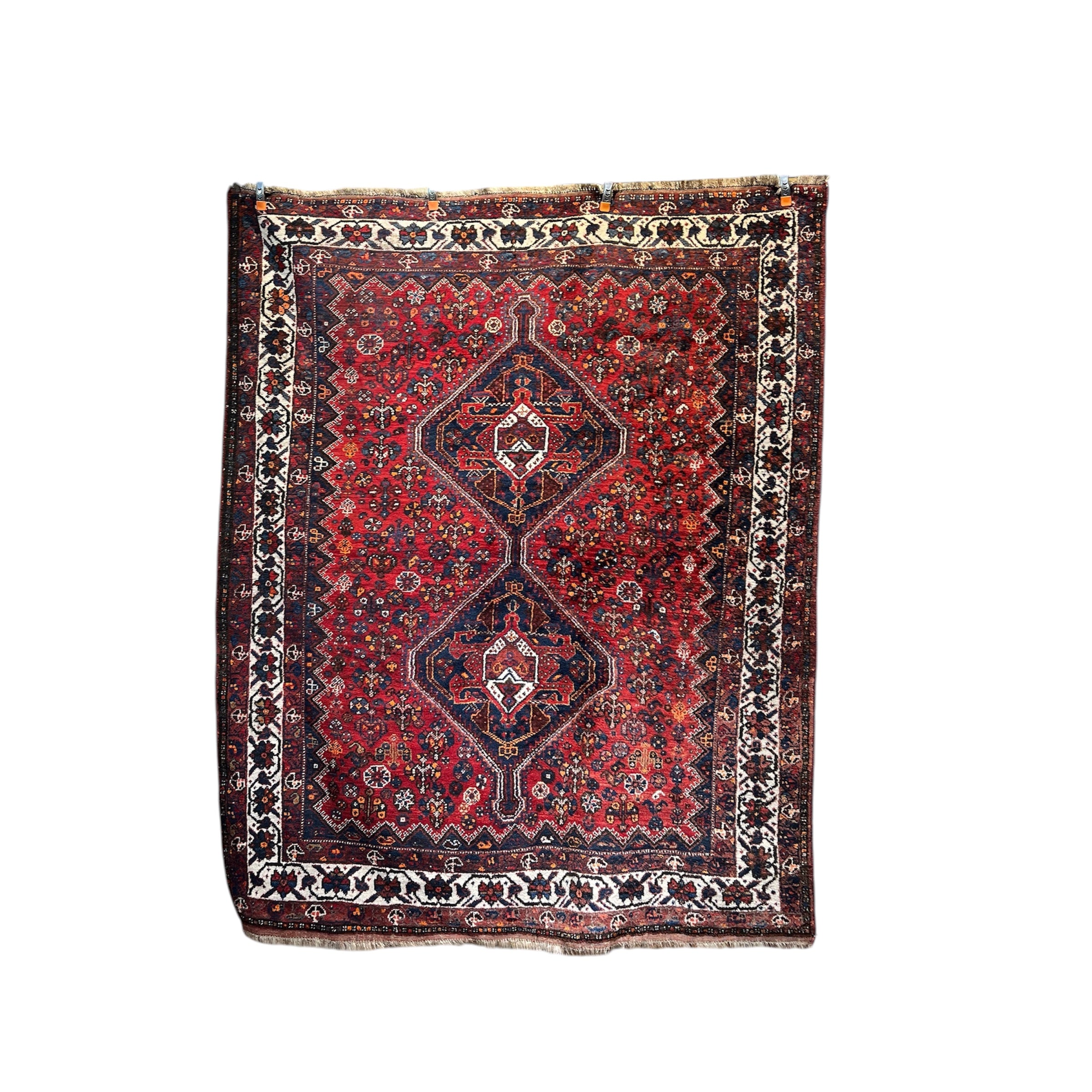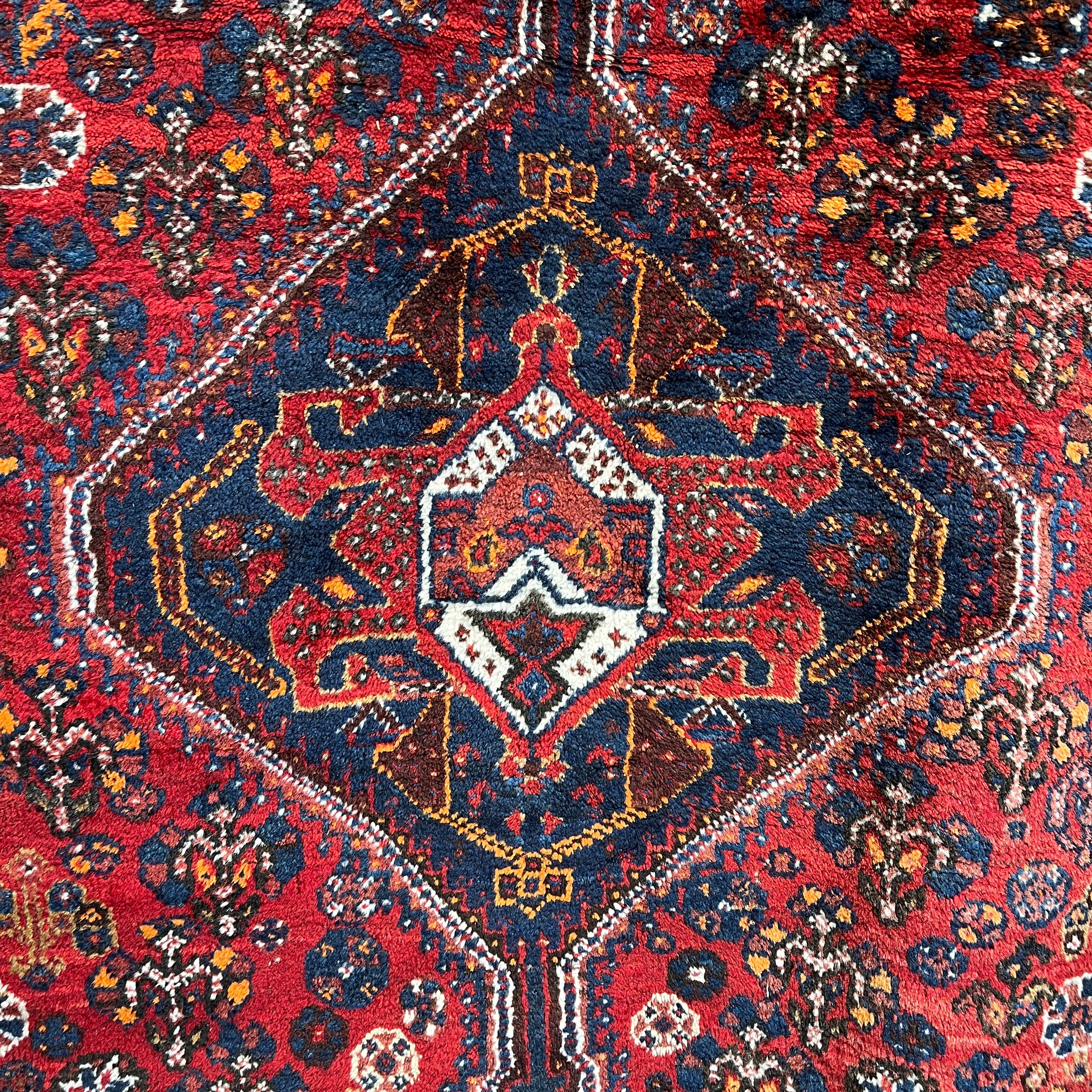 Preciosa alfombra persa Shiraz, de origen Iraní, tejida a mano por las tribus nómadas de Qashqai, en los pueblos alrededor de la ciudad de Shiraz. Aunque los diseños pueden variar, a menudo presentan motivos geométricos sencillos, como rombos, y representaciones de aves angulares que simbolizan la felicidad. En el caso de esta pieza, podemos ver un diseño de doble medallón central, en tonos de rojo, azul y detalles en blanco y amarillo, rodeados de una zona de jardín de fondo rojo con motivos florales. Por último, una de sus cenefas hace predominar el blanco, haciendo un contrapunto con el rojo y enmarcando el tejido interior.