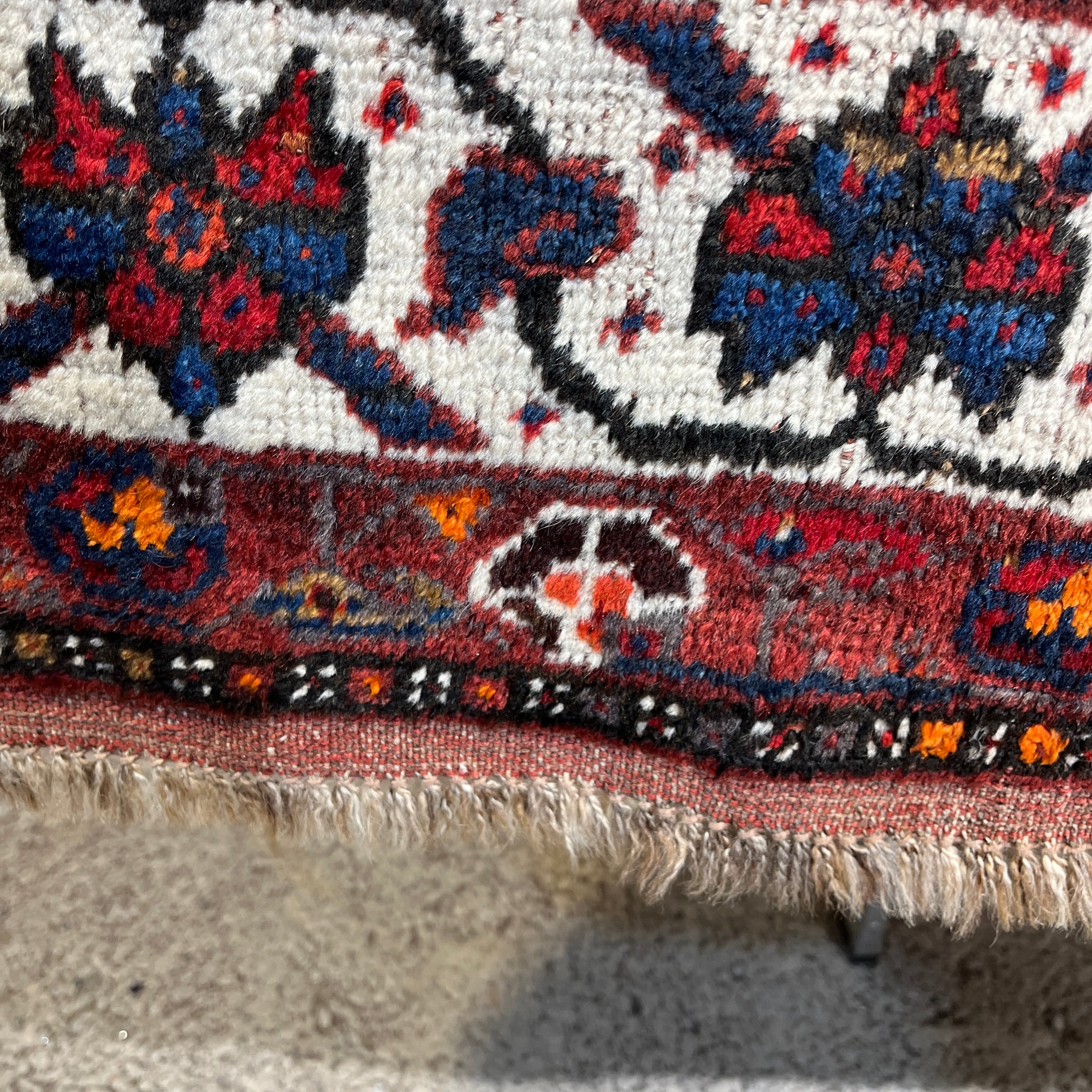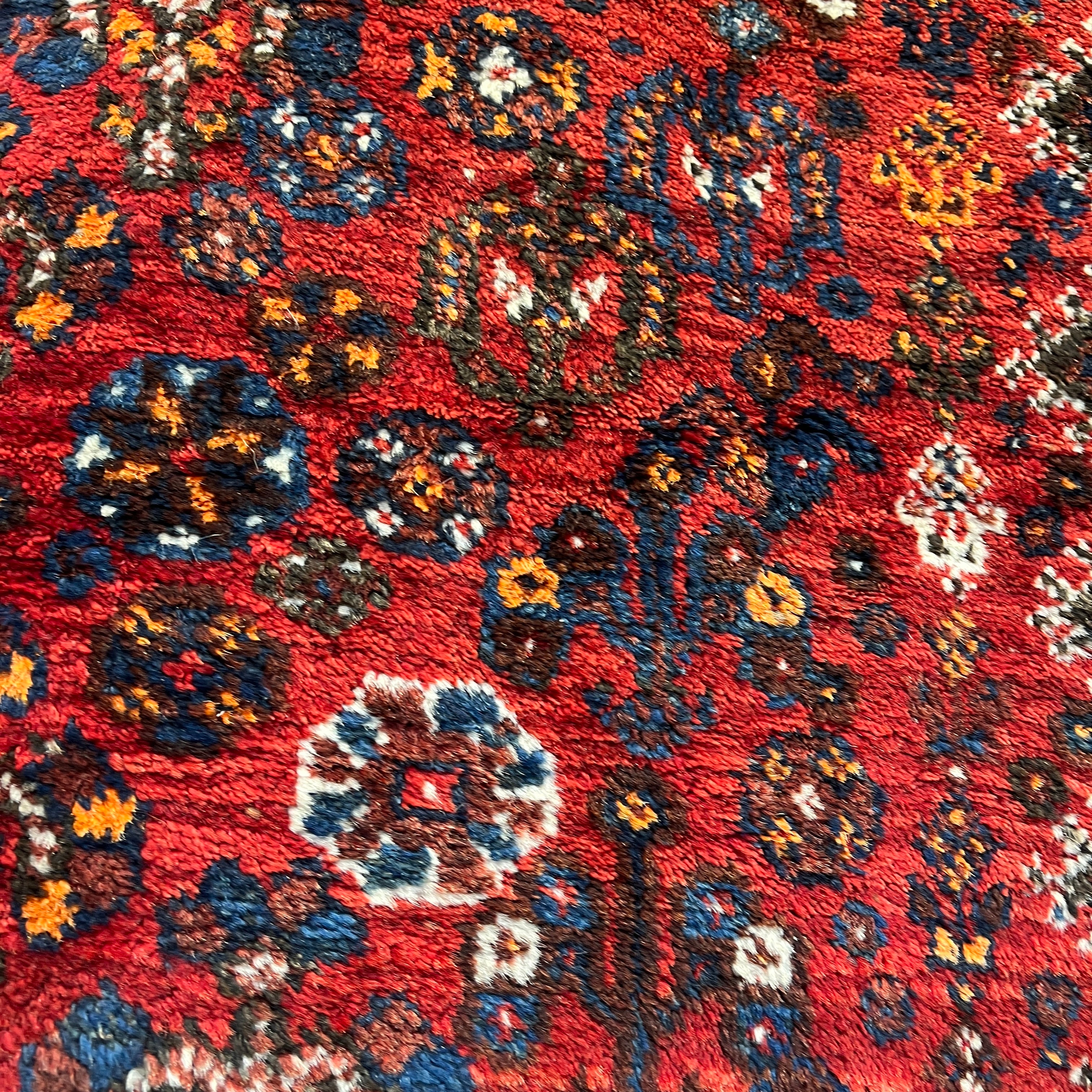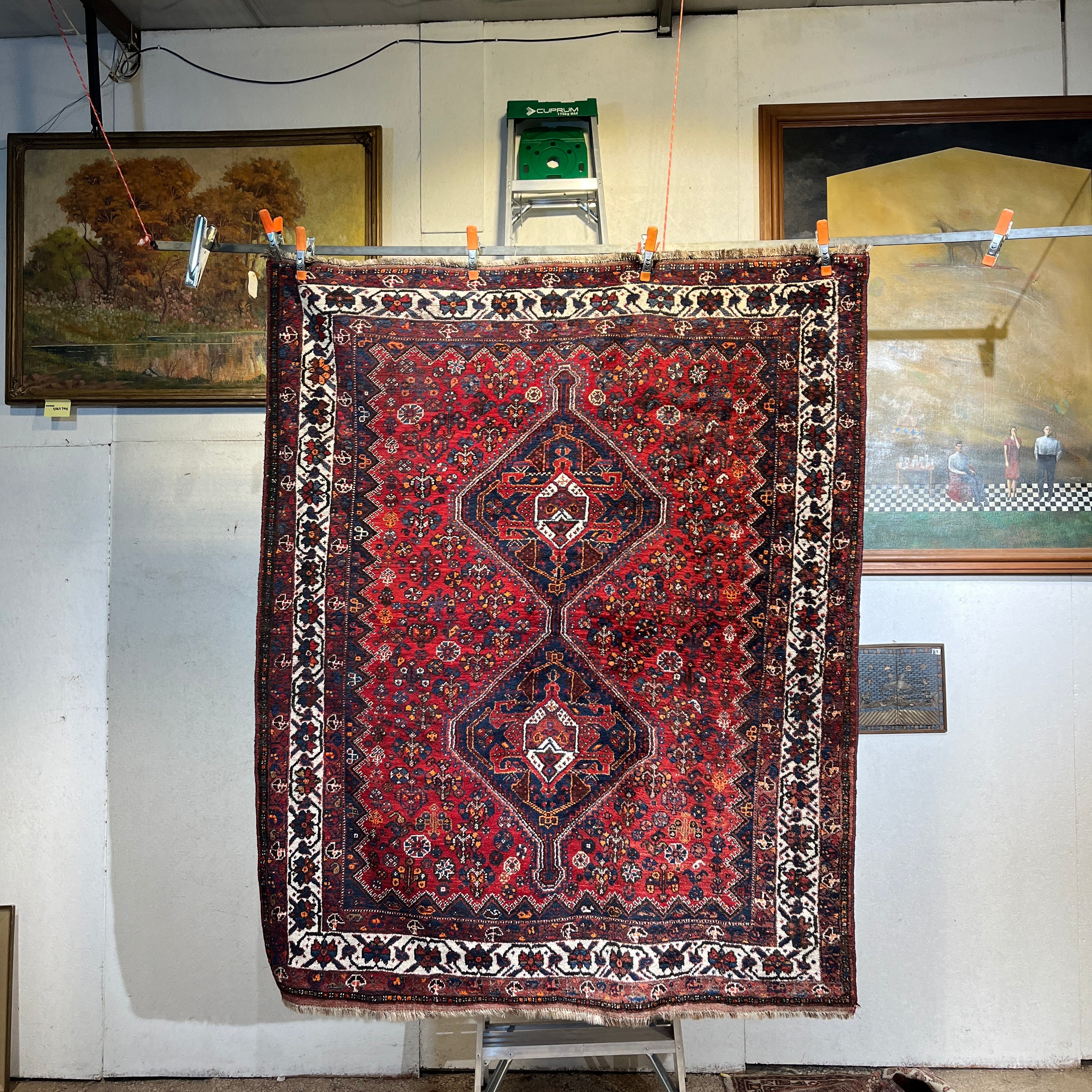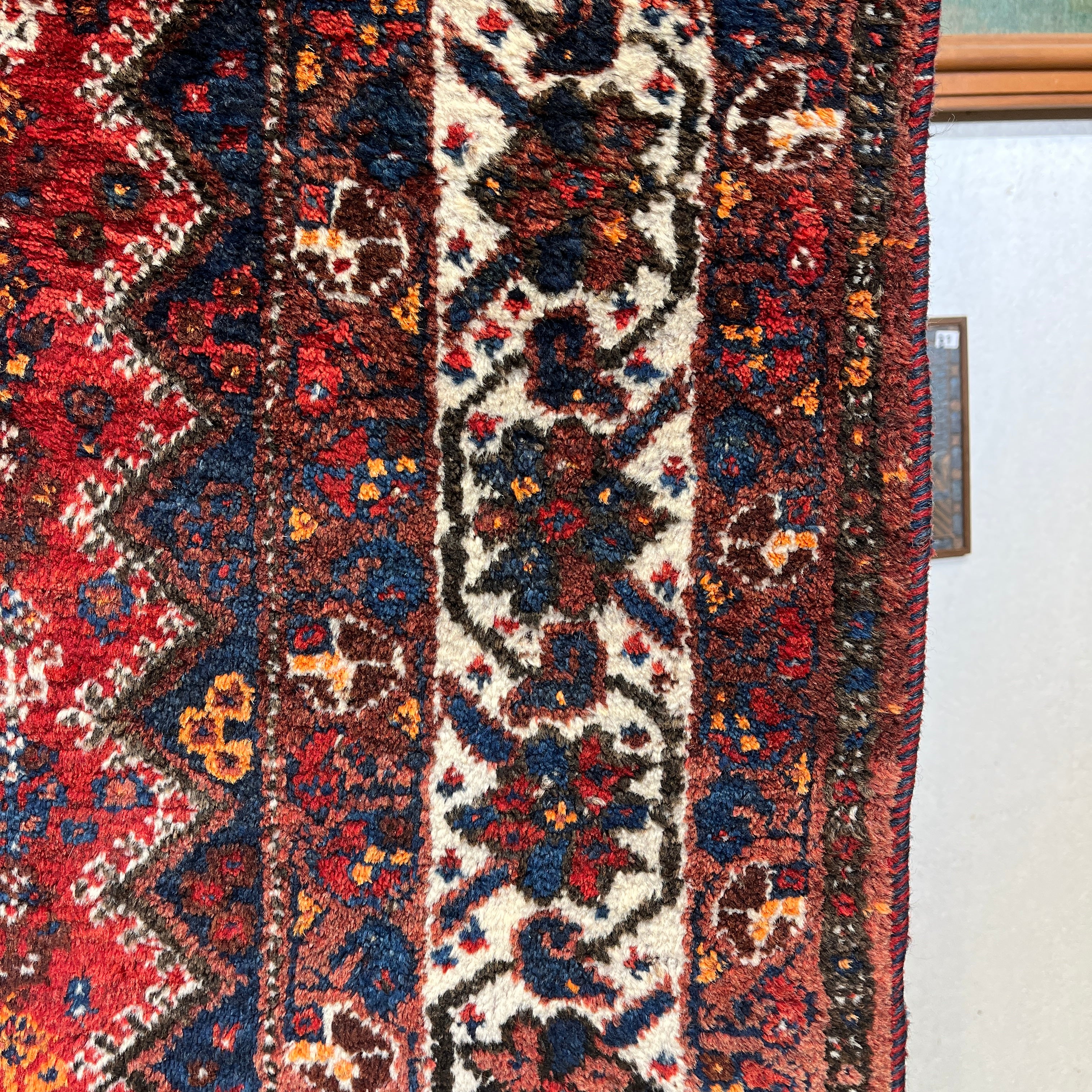 Preciosa alfombra persa Shiraz, de origen Iraní, tejida a mano por las tribus nómadas de Qashqai, en los pueblos alrededor de la ciudad de Shiraz. Aunque los diseños pueden variar, a menudo presentan motivos geométricos sencillos, como rombos, y representaciones de aves angulares que simbolizan la felicidad. En el caso de esta pieza, podemos ver un diseño de doble medallón central, en tonos de rojo, azul y detalles en blanco y amarillo, rodeados de una zona de jardín de fondo rojo con motivos florales. Por último, una de sus cenefas hace predominar el blanco, haciendo un contrapunto con el rojo y enmarcando el tejido interior.