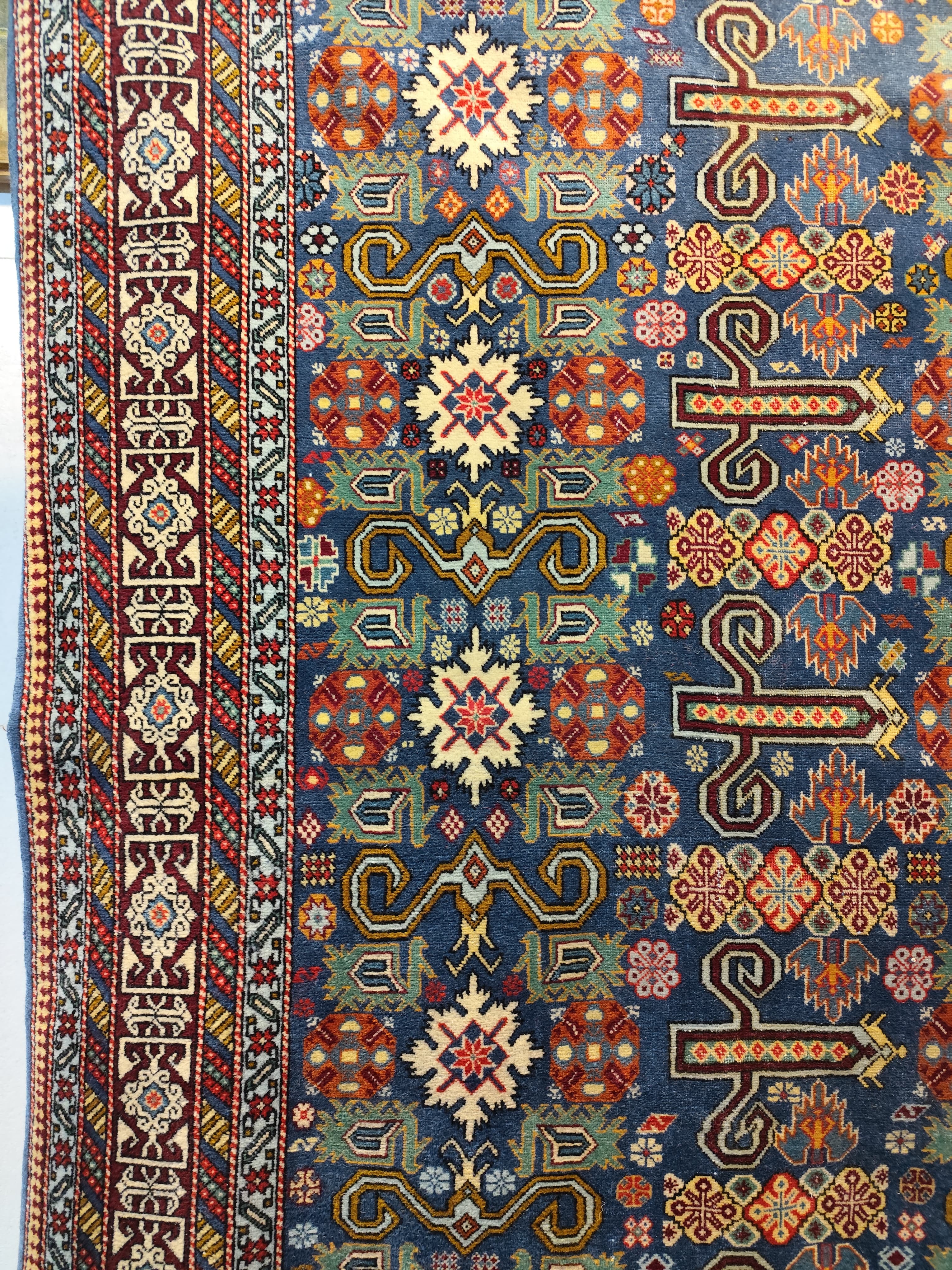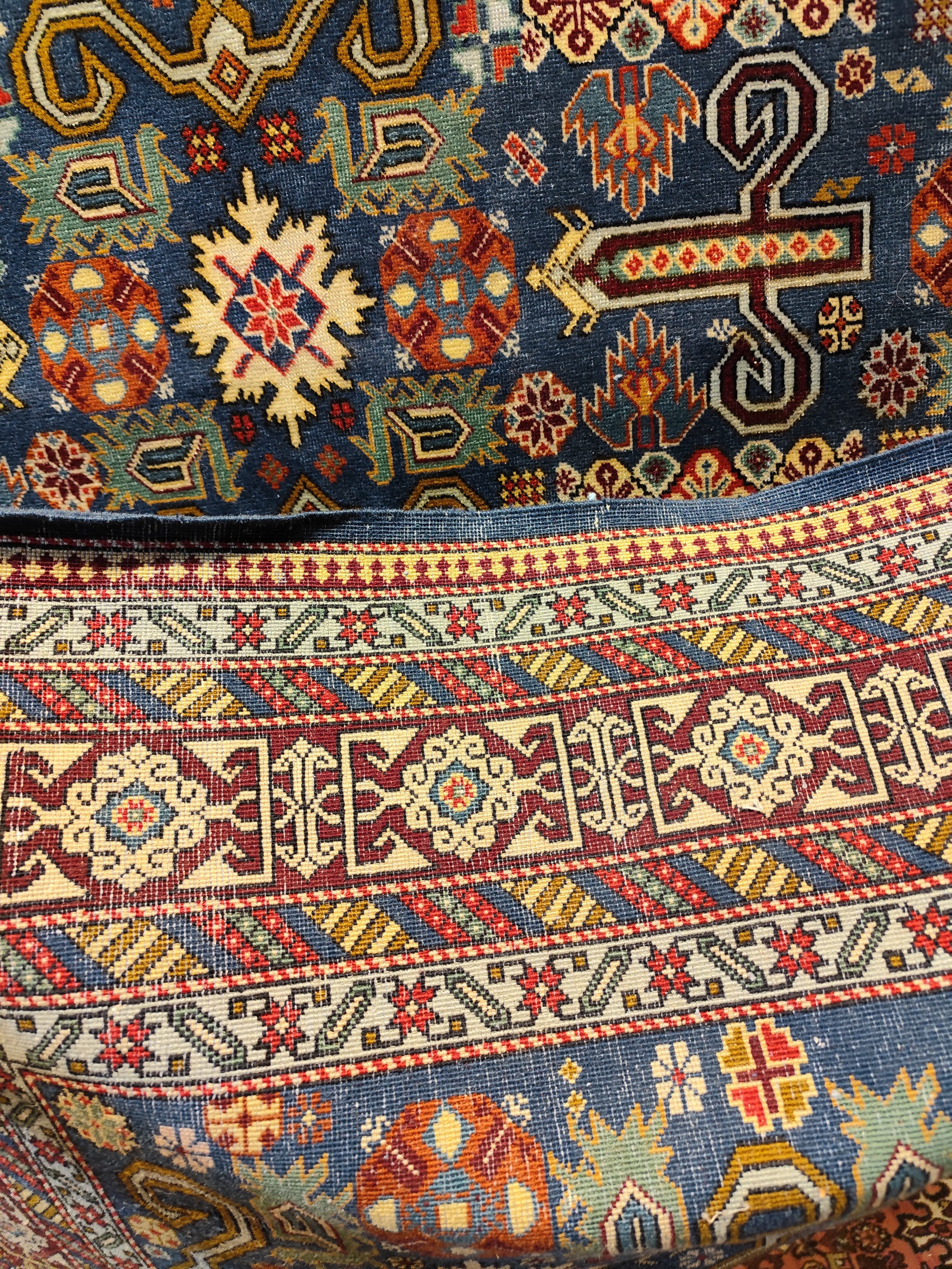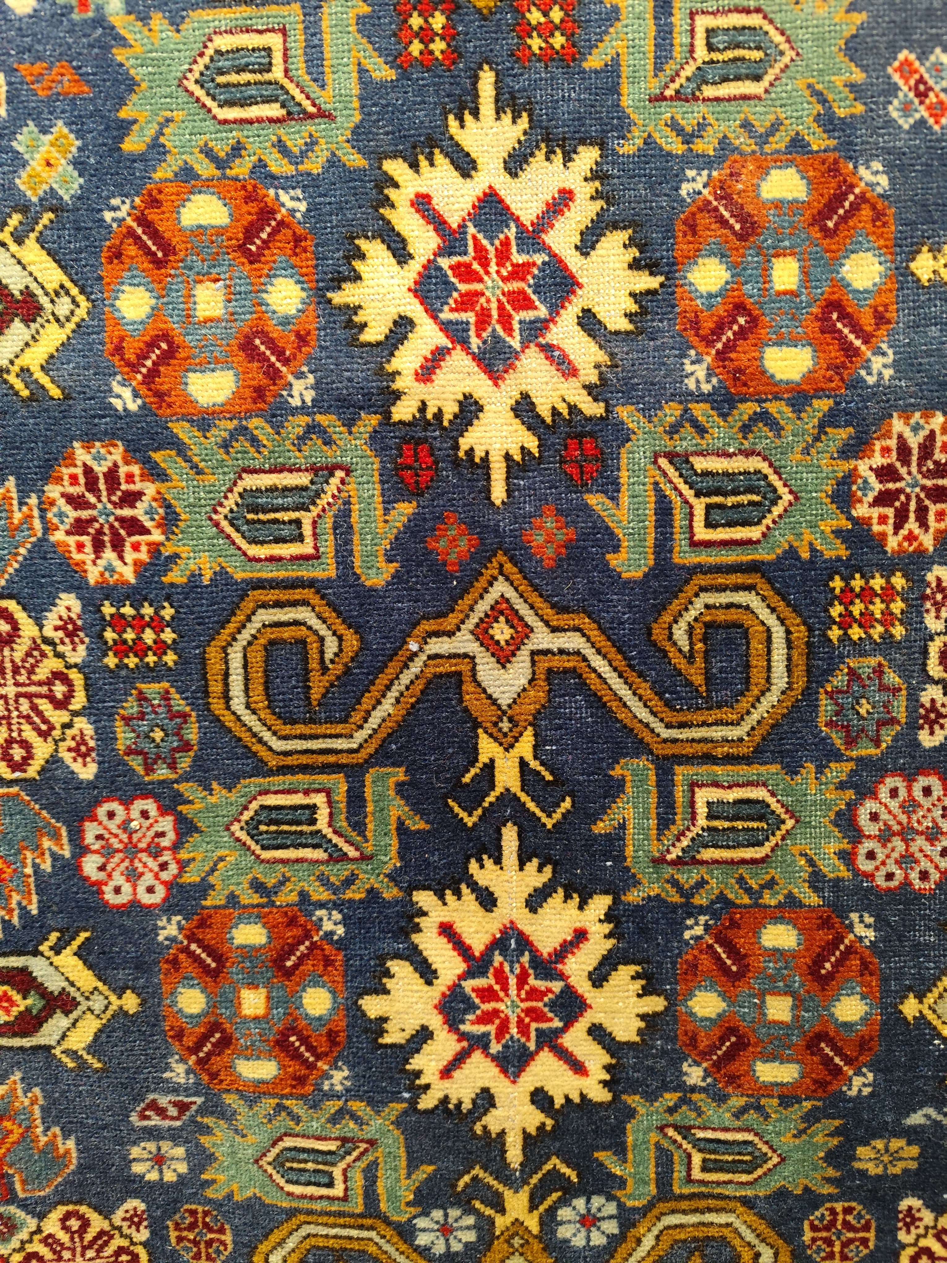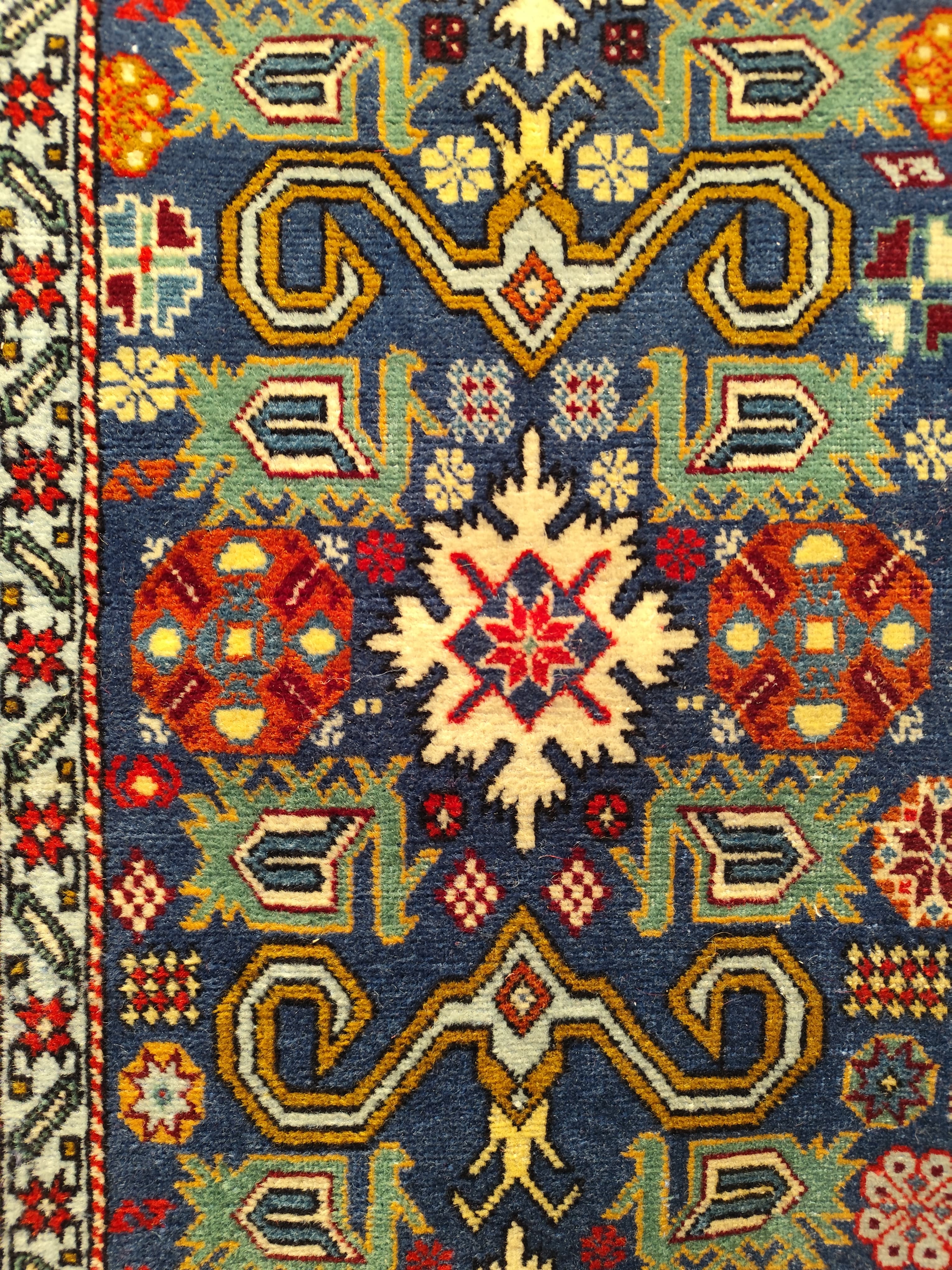 Preciosa alfombra Derbend, de orige Cáucaso, hecha de lana tejida a mano, en distintivos diseños geométricos, centrados alrededor de medallones o cartuchos abstractos, en tonos rojos, azules y verdes, con bordes blancos. La composición se completa con un borde de diseños repetidos, en el que destaca el blanco, haciendo contrapunto con el diseño total.