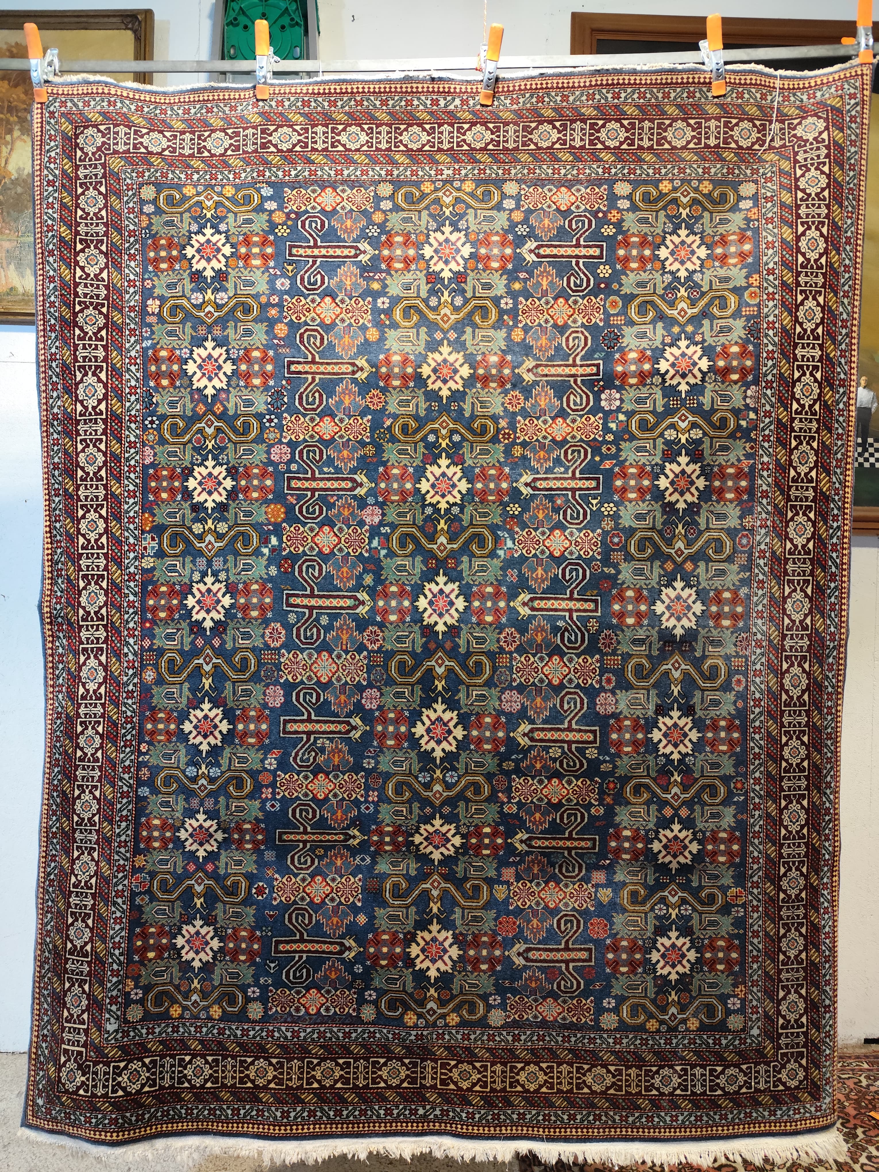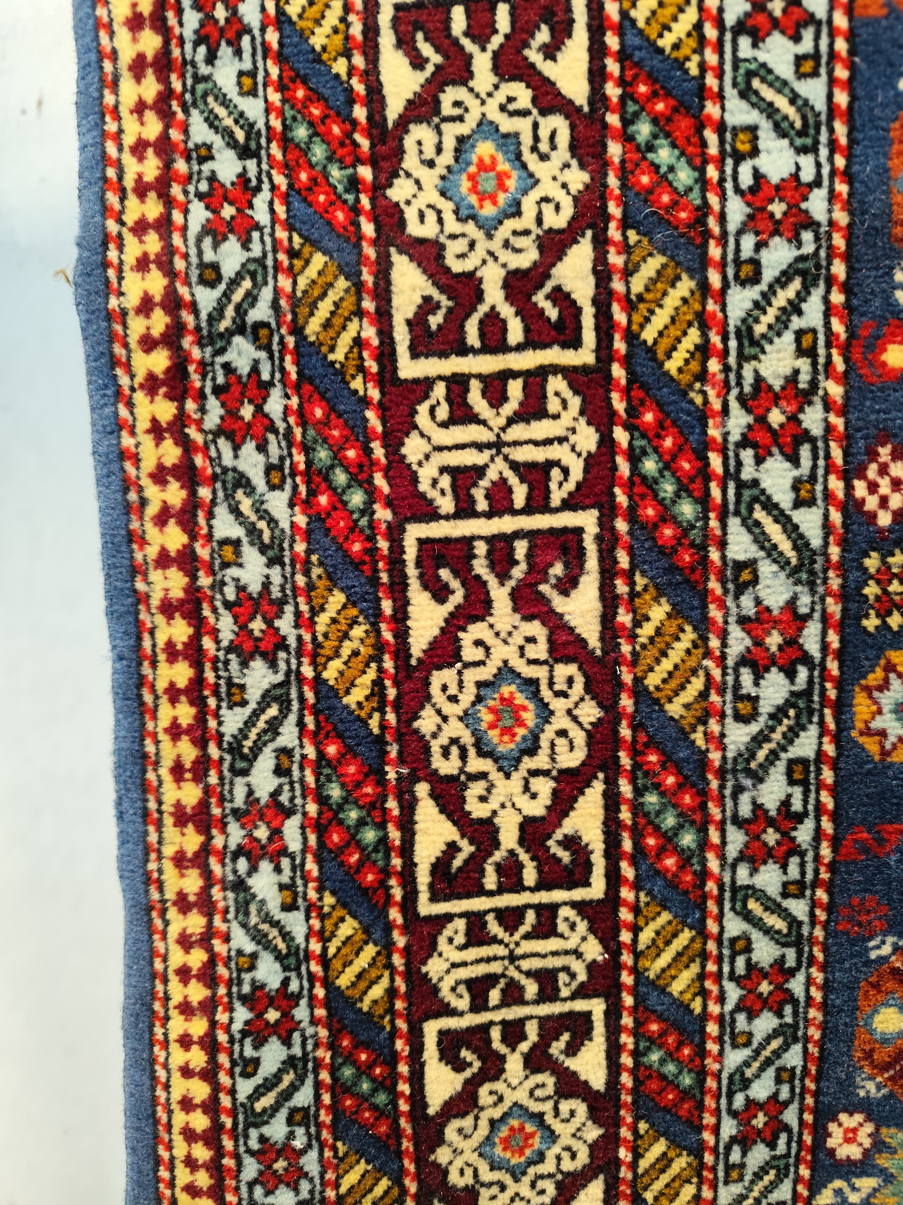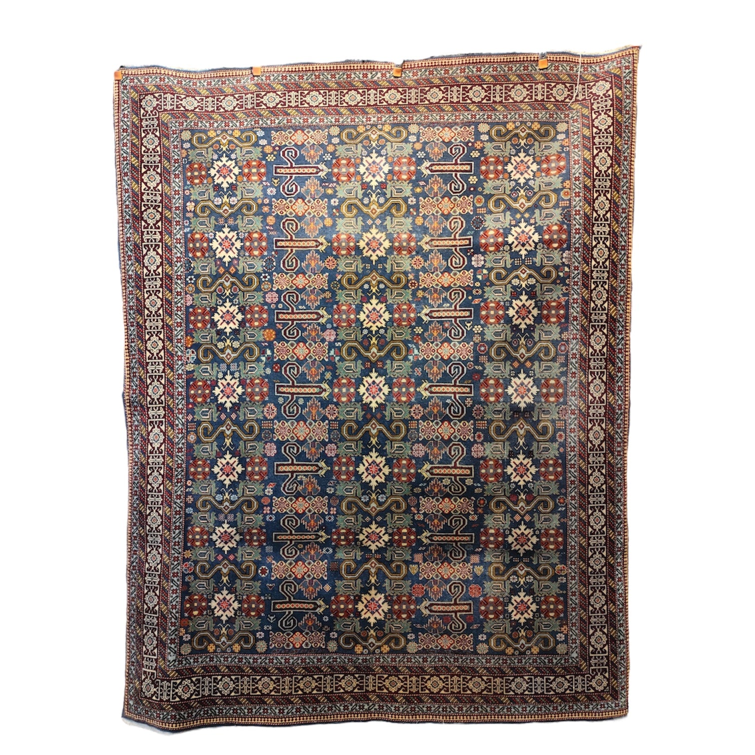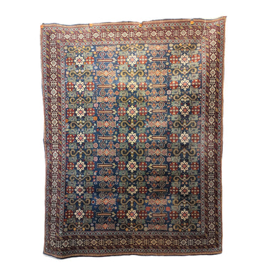 Preciosa alfombra Derbend, de orige Cáucaso, hecha de lana tejida a mano, en distintivos diseños geométricos, centrados alrededor de medallones o cartuchos abstractos, en tonos rojos, azules y verdes, con bordes blancos. La composición se completa con un borde de diseños repetidos, en el que destaca el blanco, haciendo contrapunto con el diseño total.
