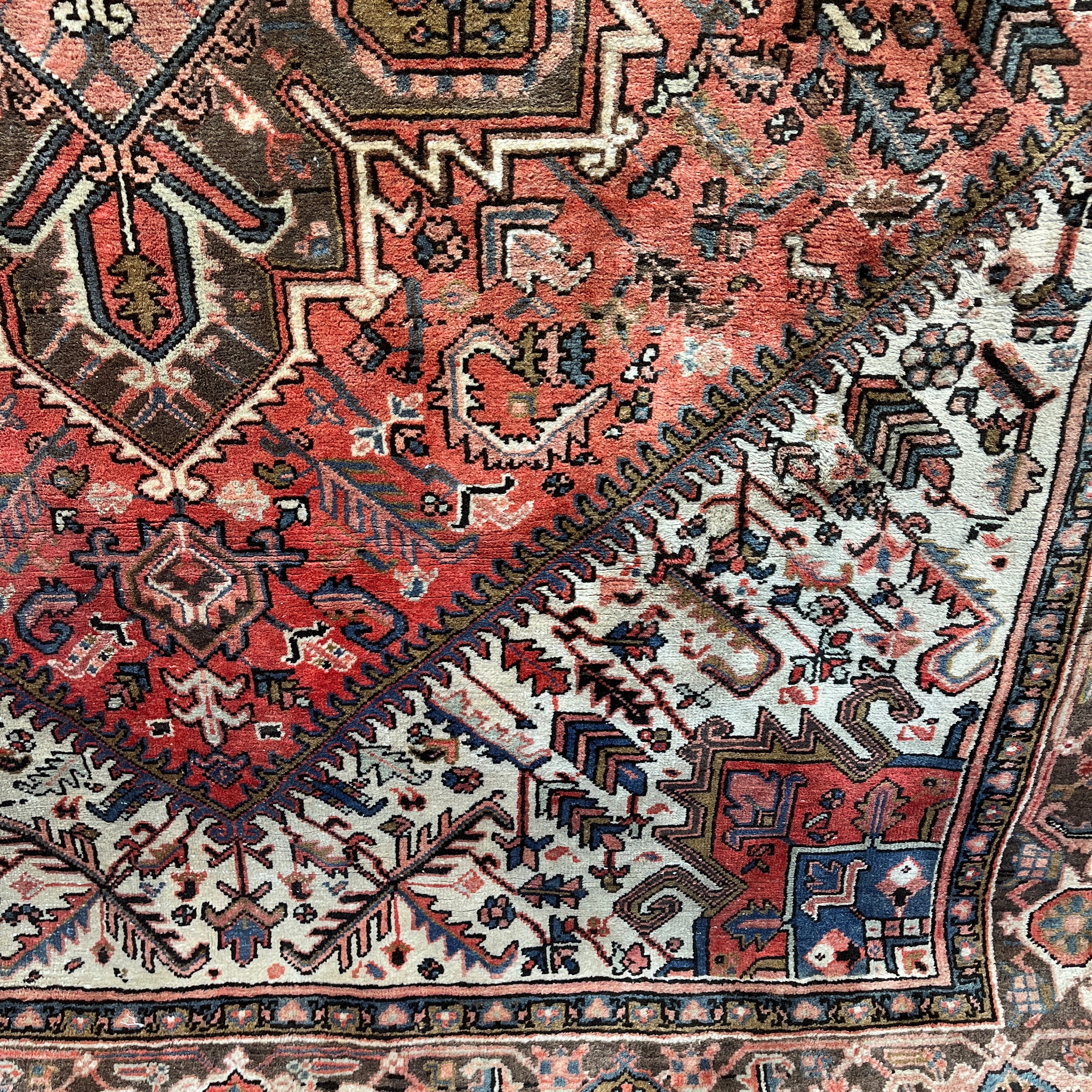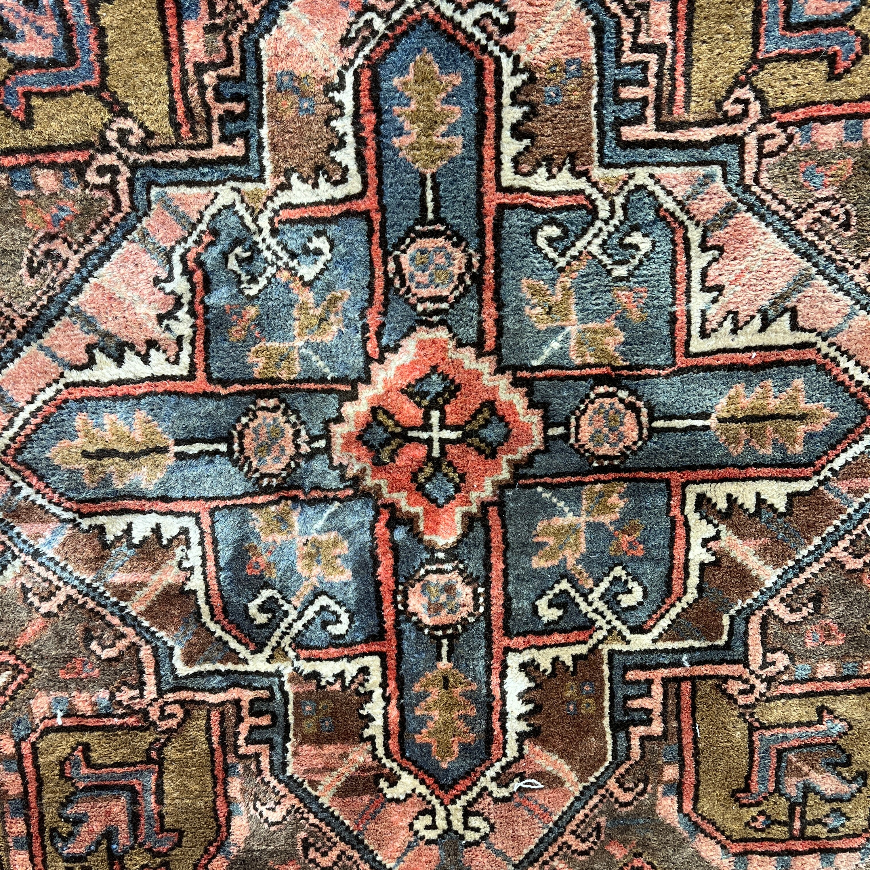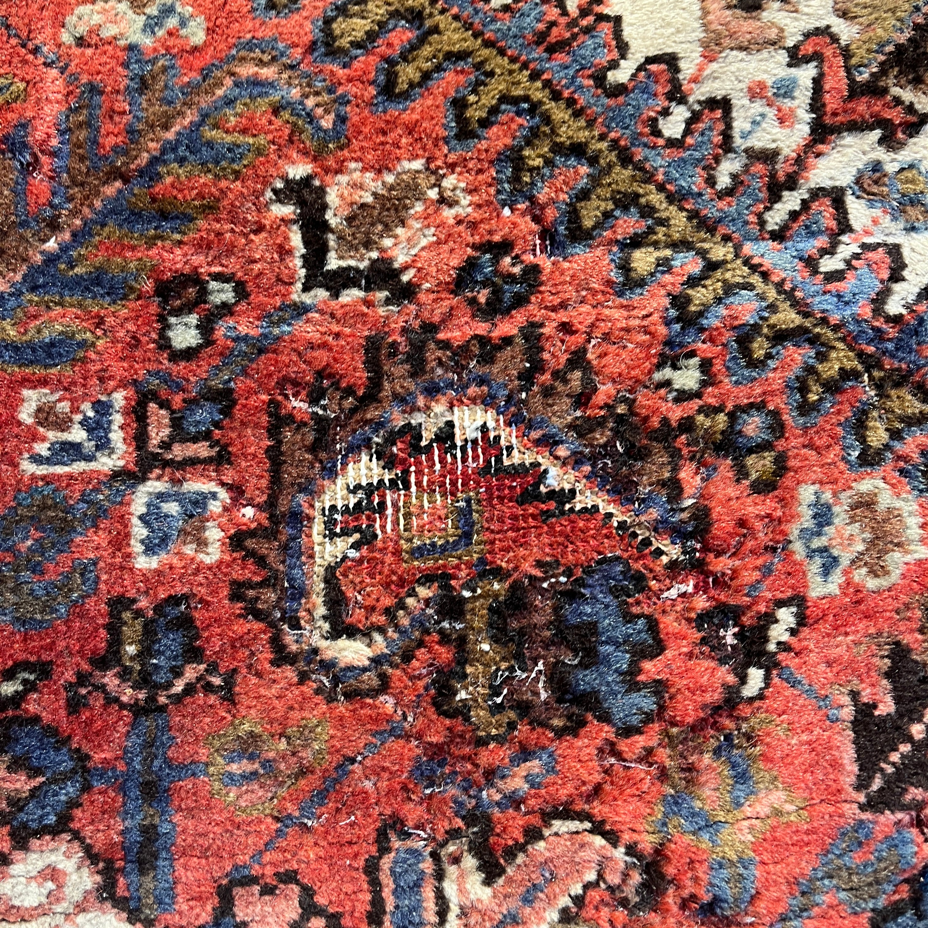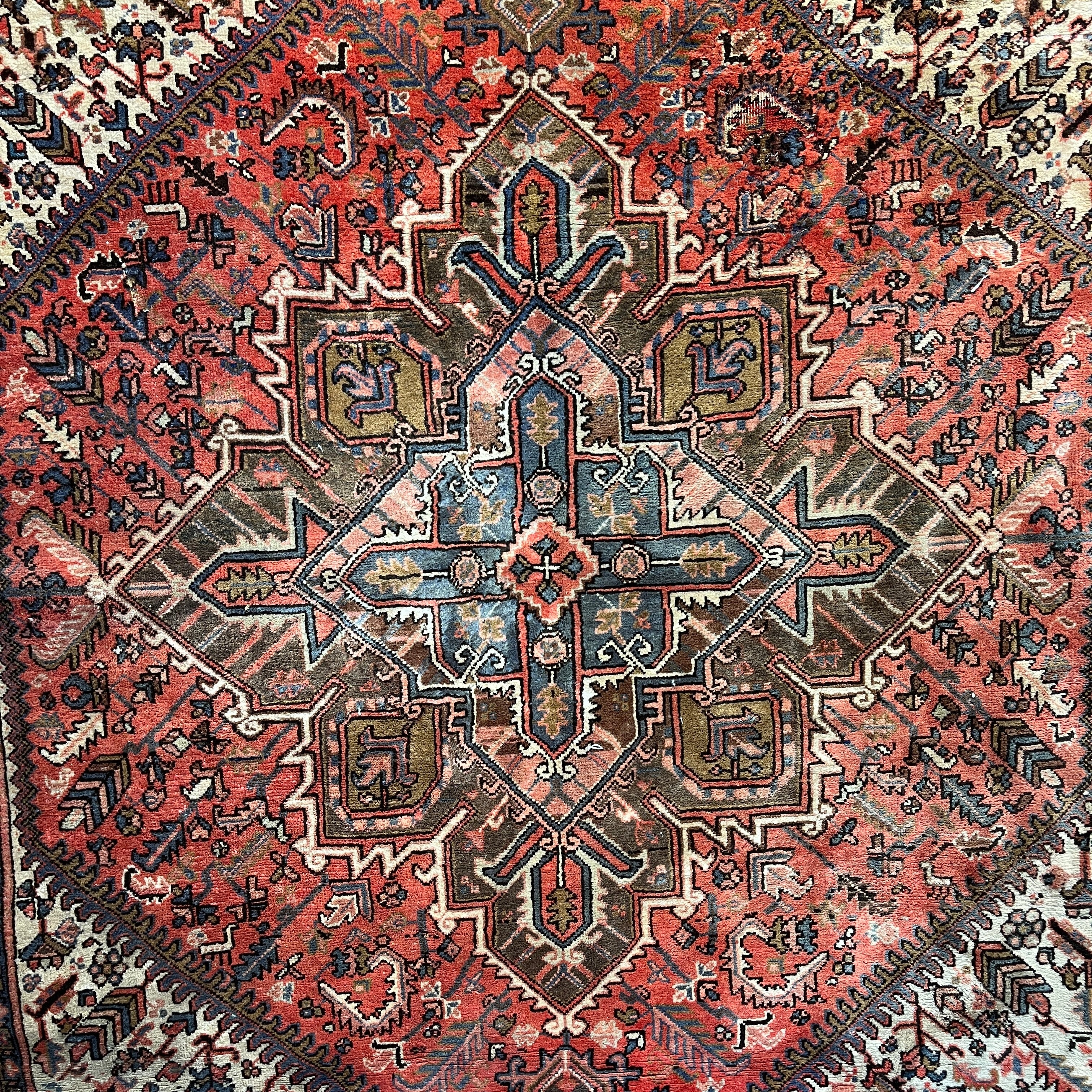 Preciosa alfombra persa Heriz, originaria de la provincia de Azerbaiyán Oriental, en Irán. Esta alfombra está hecha de lana de alta calidad, tejida y teñida a mano, con tinturas vegetales de gran tradición. El diseño se caracteriza por su patrón geométrico. A diferencia de otros diseños persas más curvos, las alfombras Heriz se anudan con líneas perpendiculares, paralelas y oblicuas, formando un medallón central grande con contornos y esquinas destacadas. Esta pieza comone ese diseño con una predominancia de rojos, con detalles en azul, amarillo y contrapuntos en blanco.