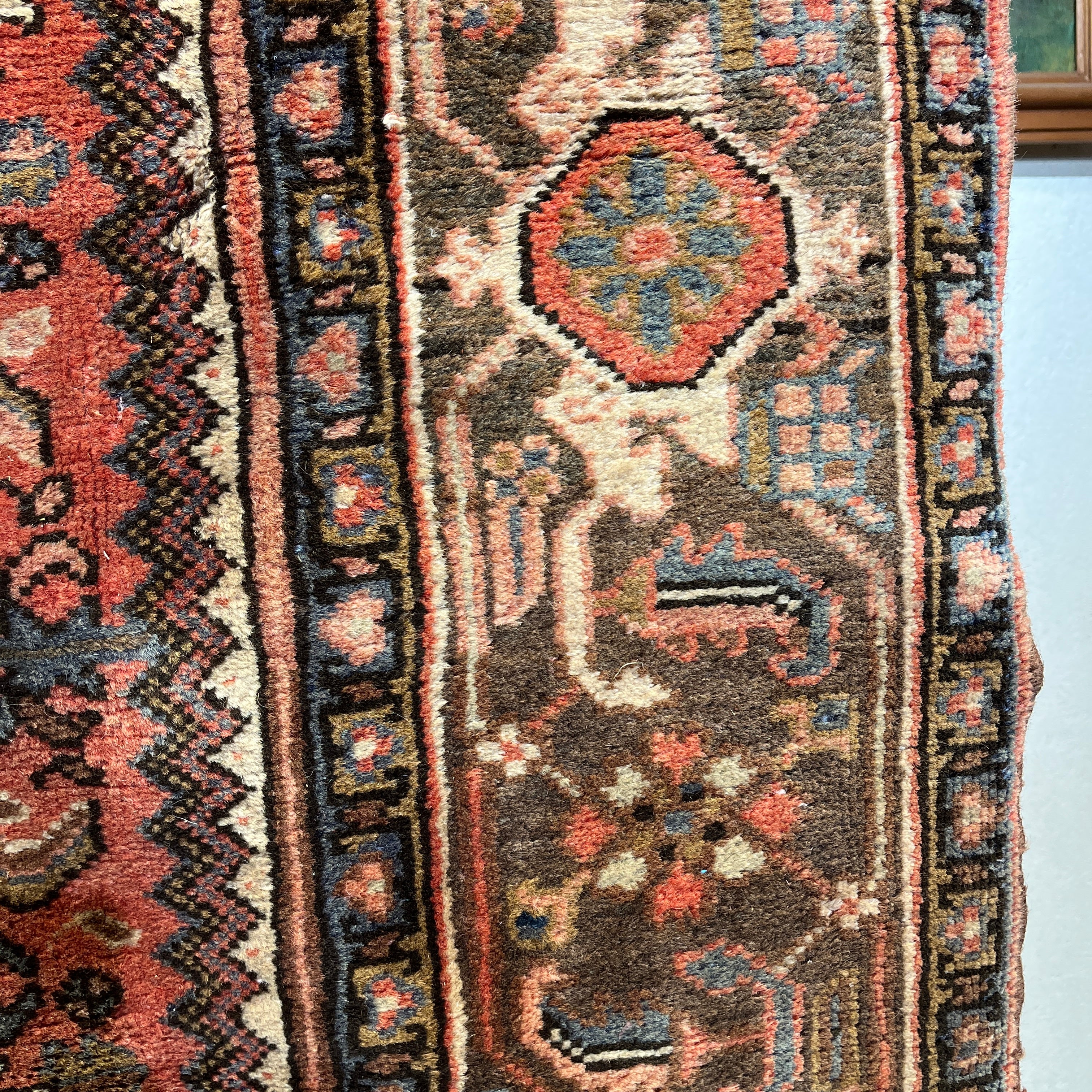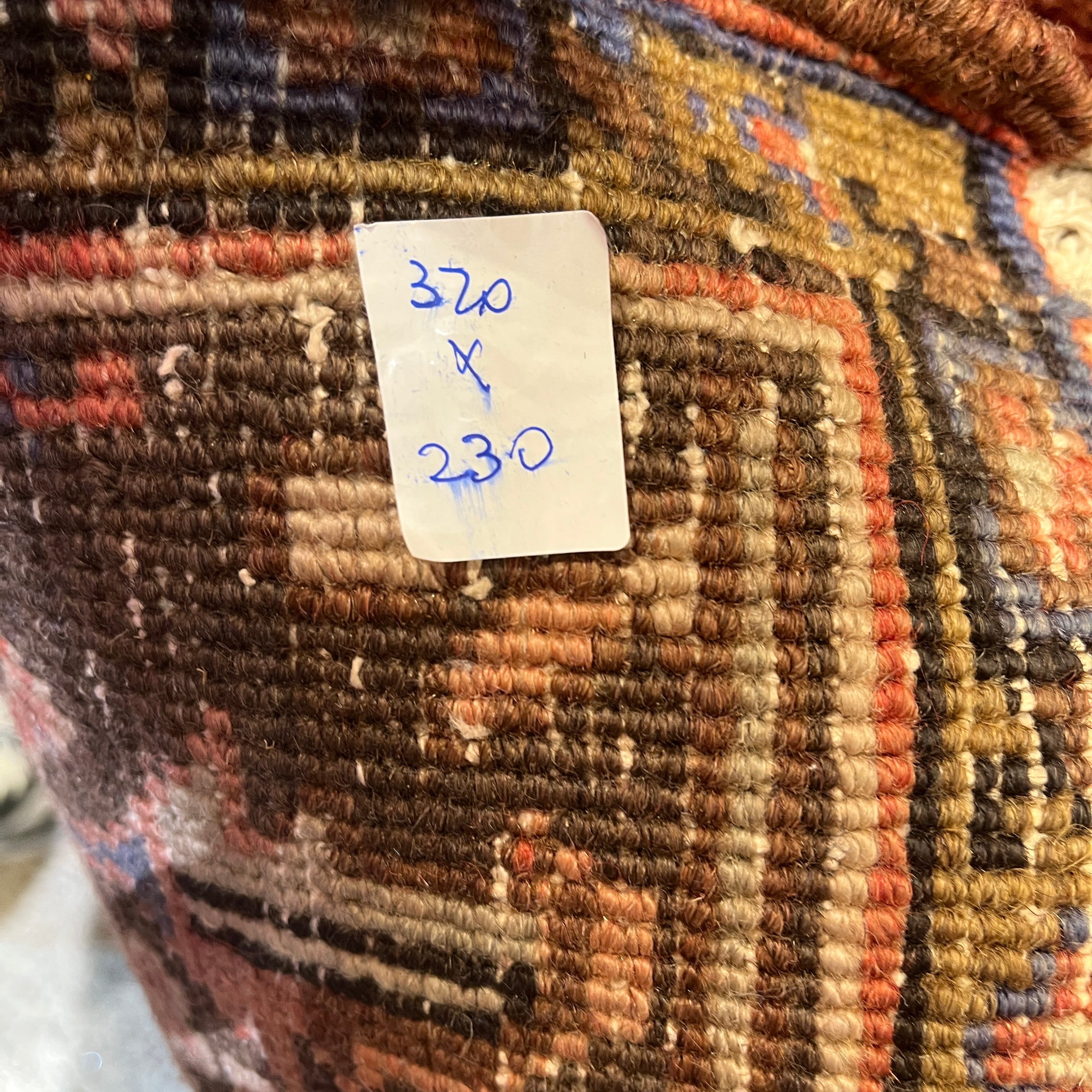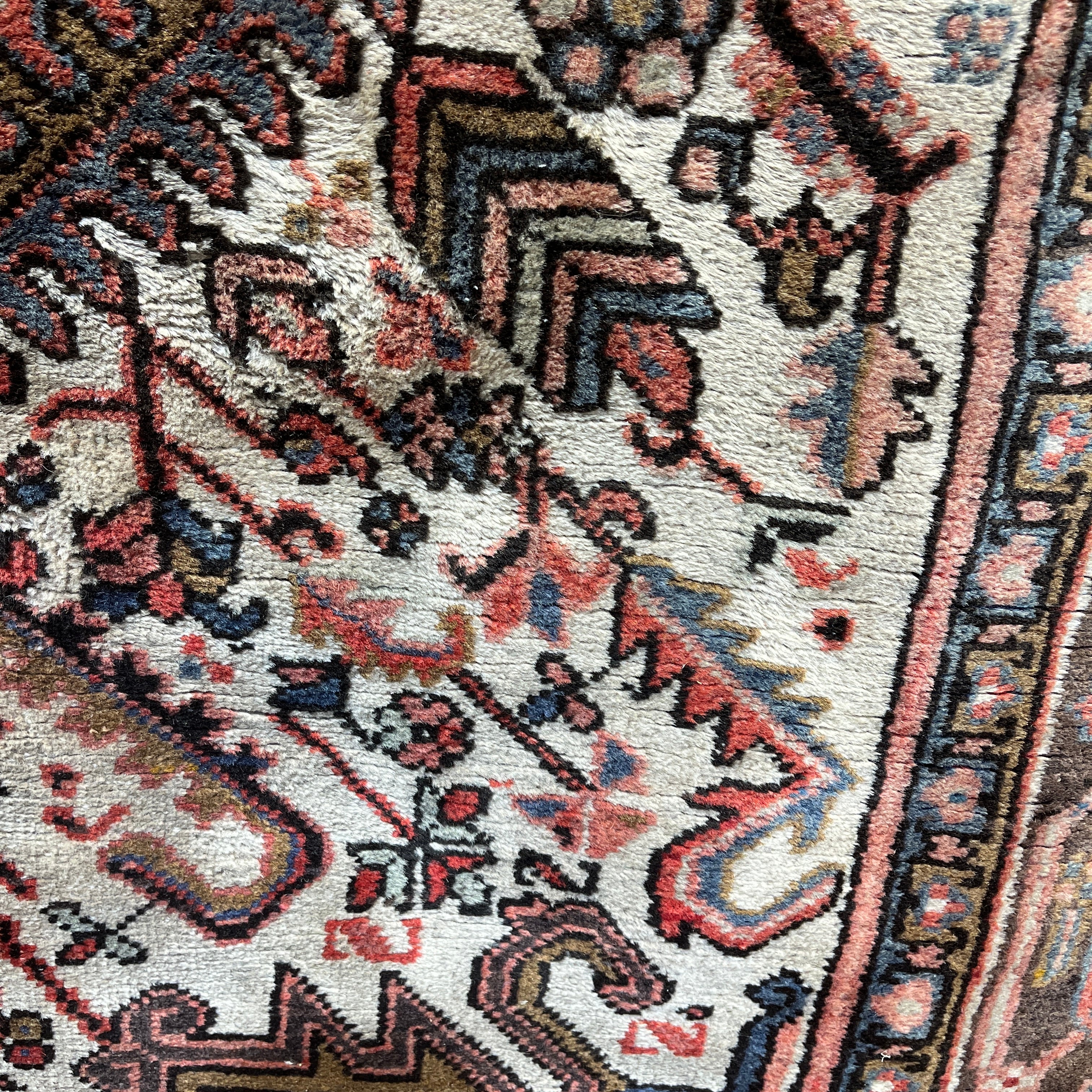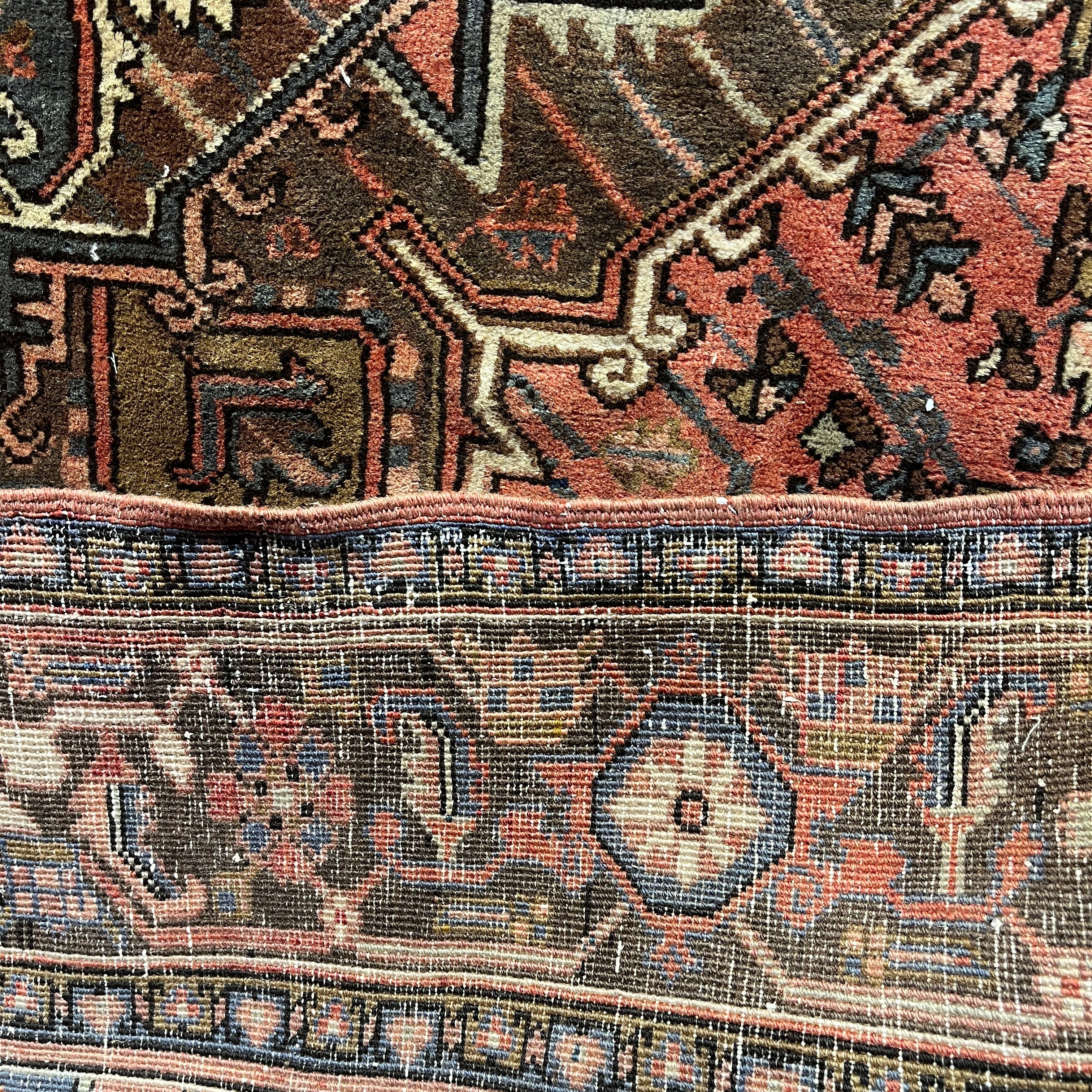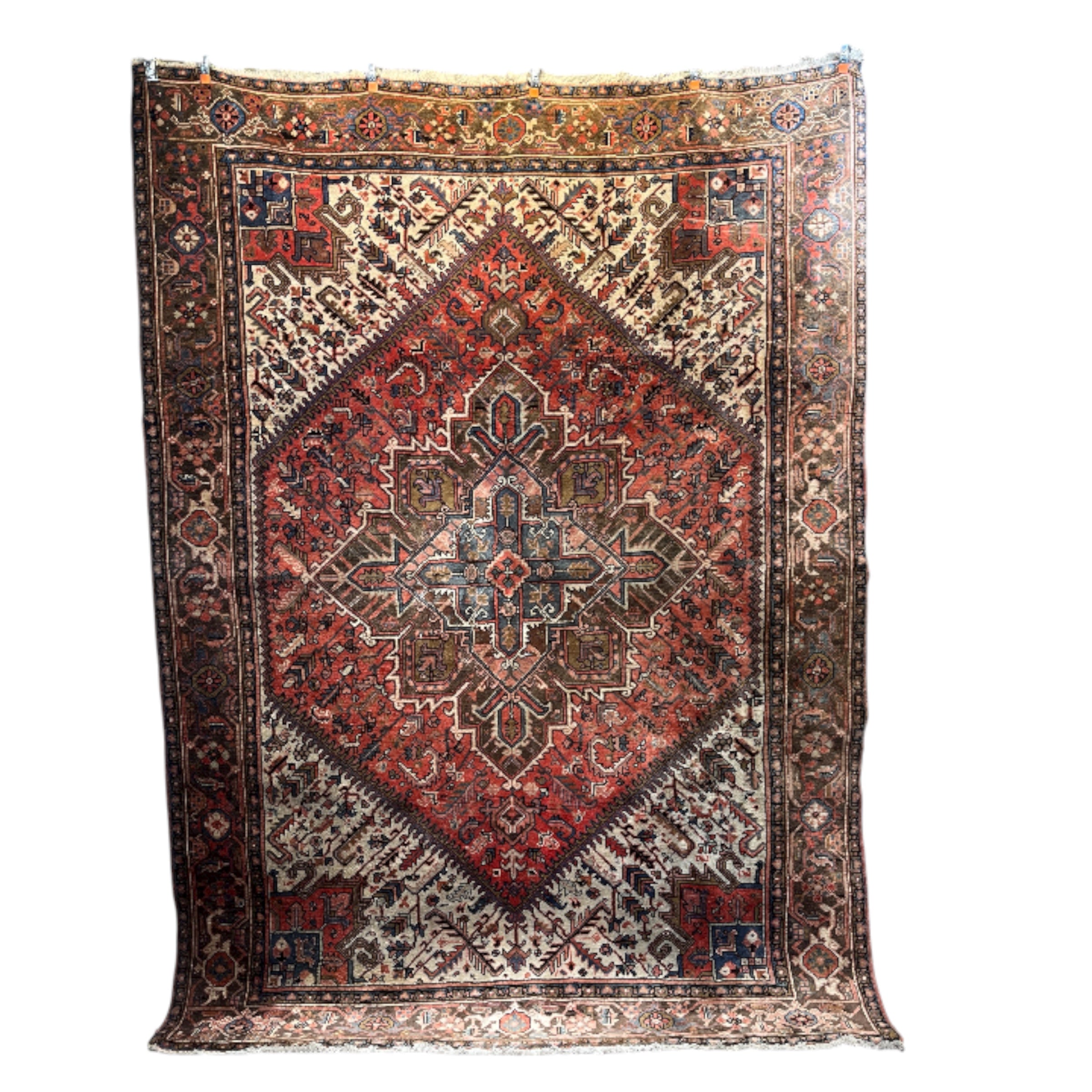 Preciosa alfombra persa Heriz, originaria de la provincia de Azerbaiyán Oriental, en Irán. Esta alfombra está hecha de lana de alta calidad, tejida y teñida a mano, con tinturas vegetales de gran tradición. El diseño se caracteriza por su patrón geométrico. A diferencia de otros diseños persas más curvos, las alfombras Heriz se anudan con líneas perpendiculares, paralelas y oblicuas, formando un medallón central grande con contornos y esquinas destacadas. Esta pieza comone ese diseño con una predominancia de rojos, con detalles en azul, amarillo y contrapuntos en blanco.