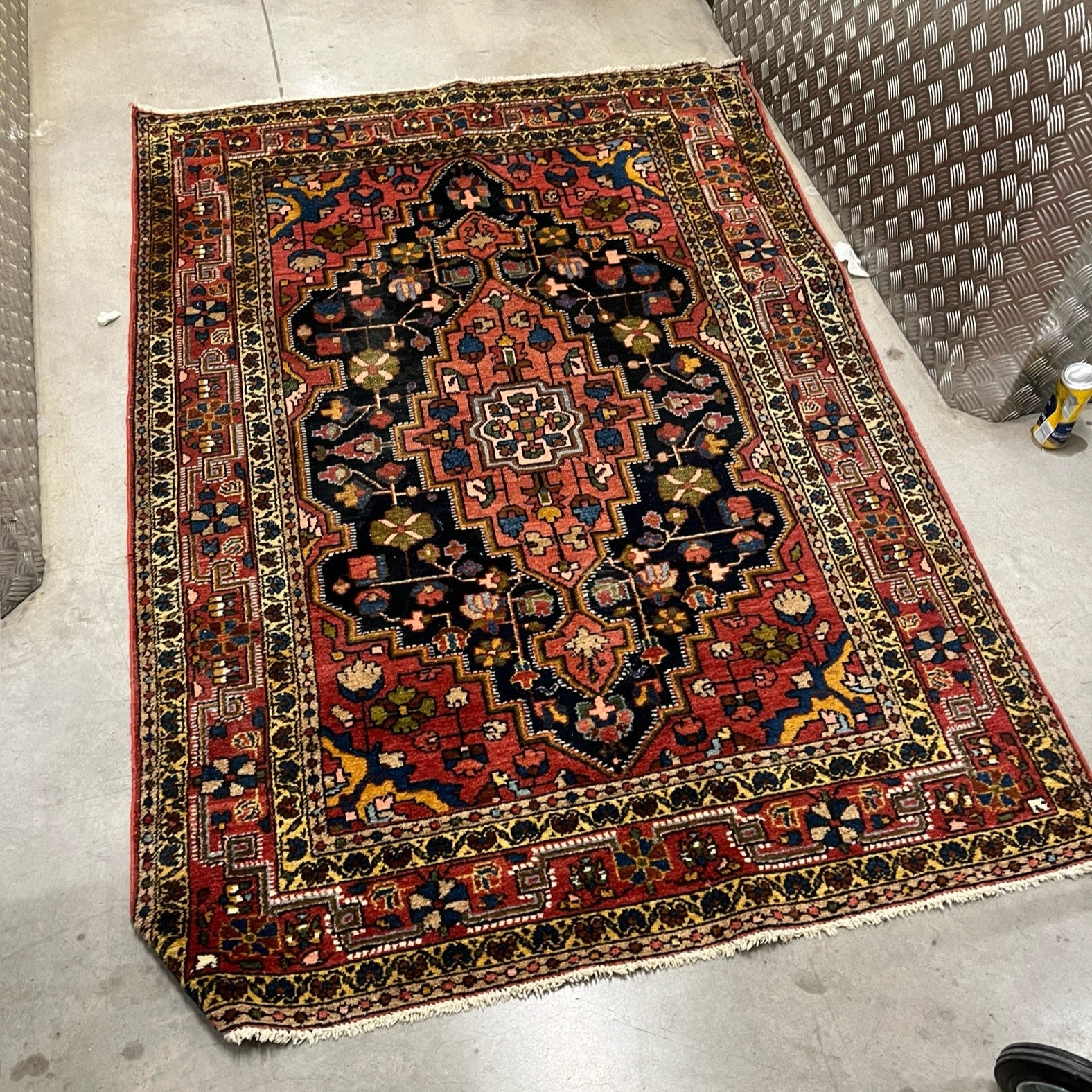 Alfombra en lana con medallón geométrico central. 127 x 193 cm.