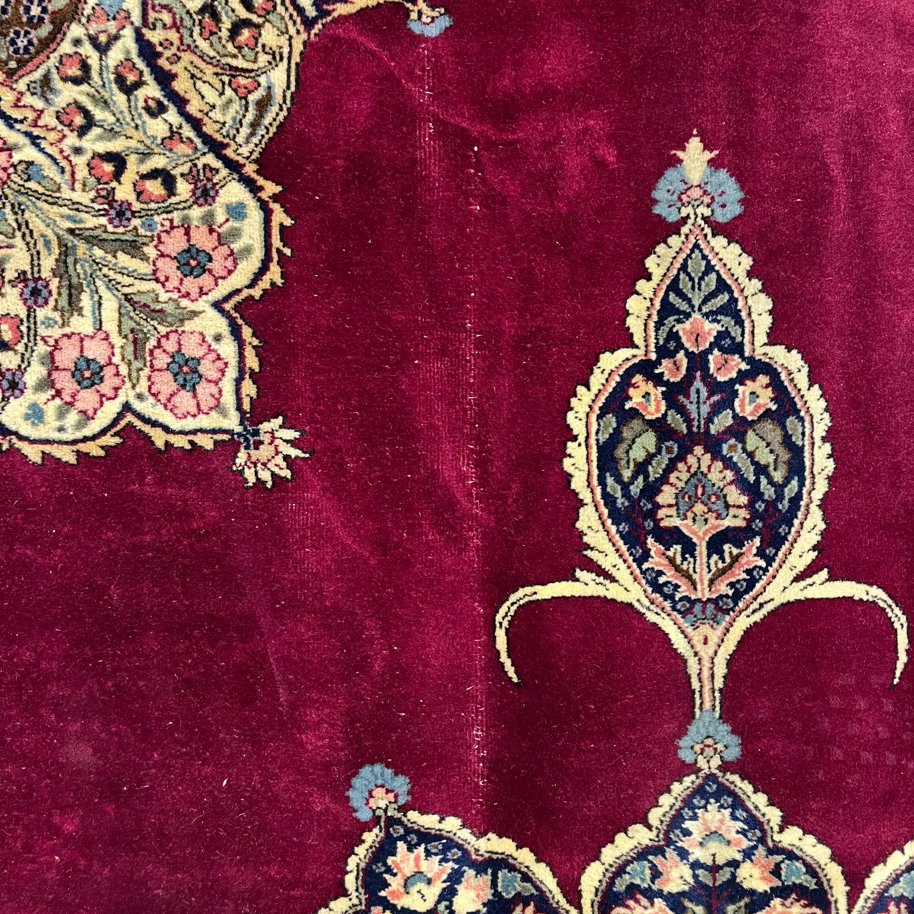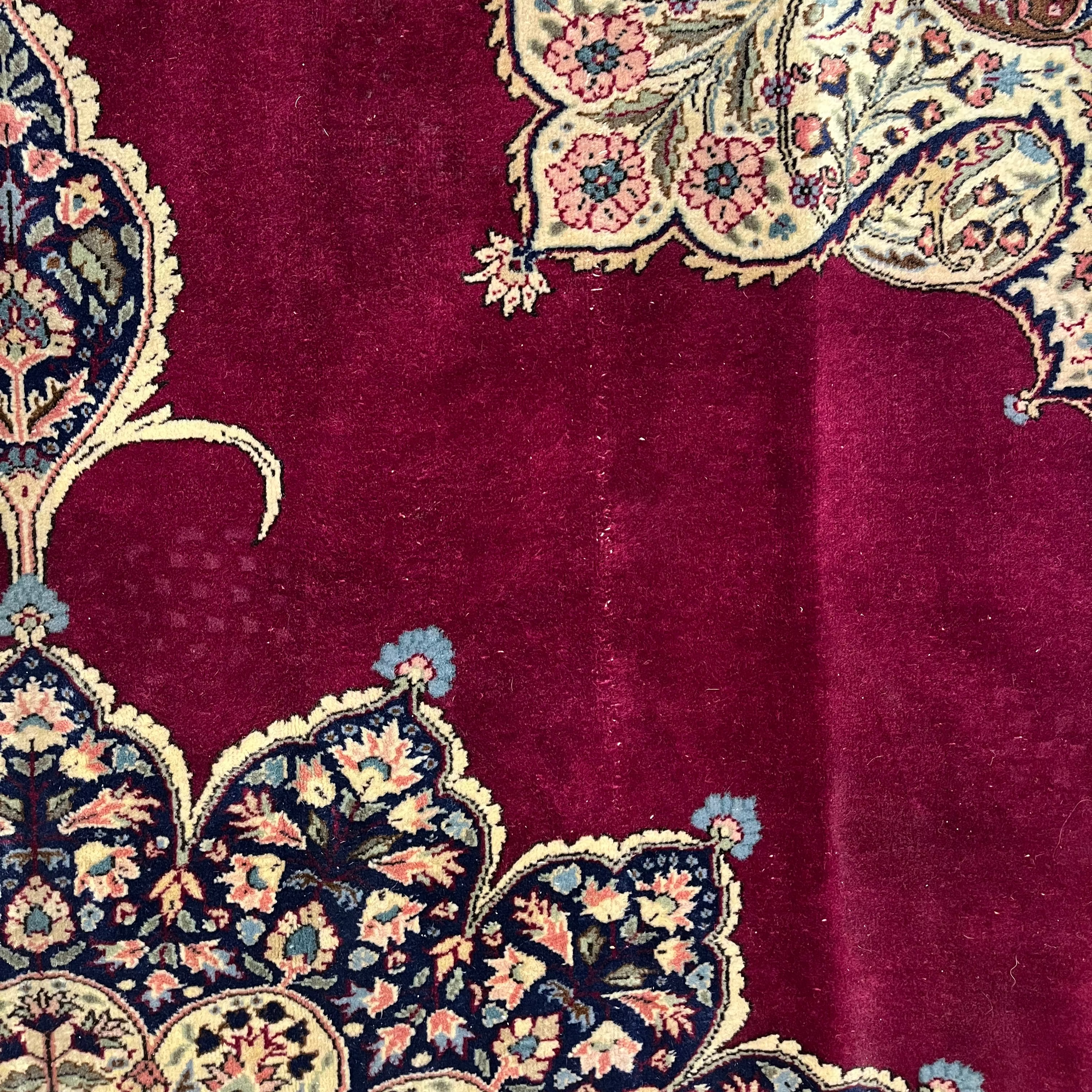 Espectacular alfombra persa Tabriz, de origen Iraní, hecha de lana, algodón y seda de los años sesenta. Hecha a mano, presenta hermosos detalles florales y patrones geométricos en llamativos tonos rojizos, azules y rosas. Se encuentra en buen estado, presentando unas leves marcas por peso.