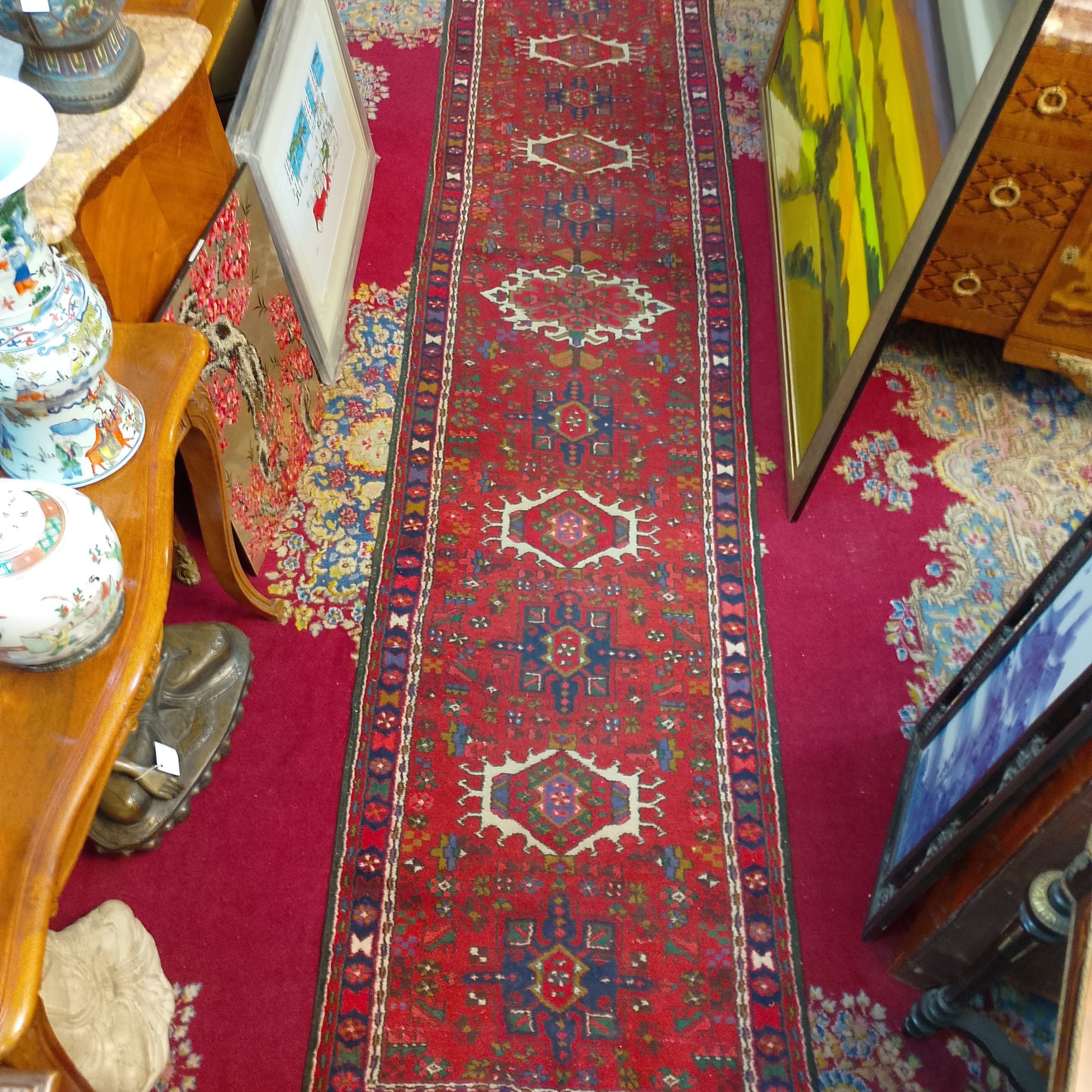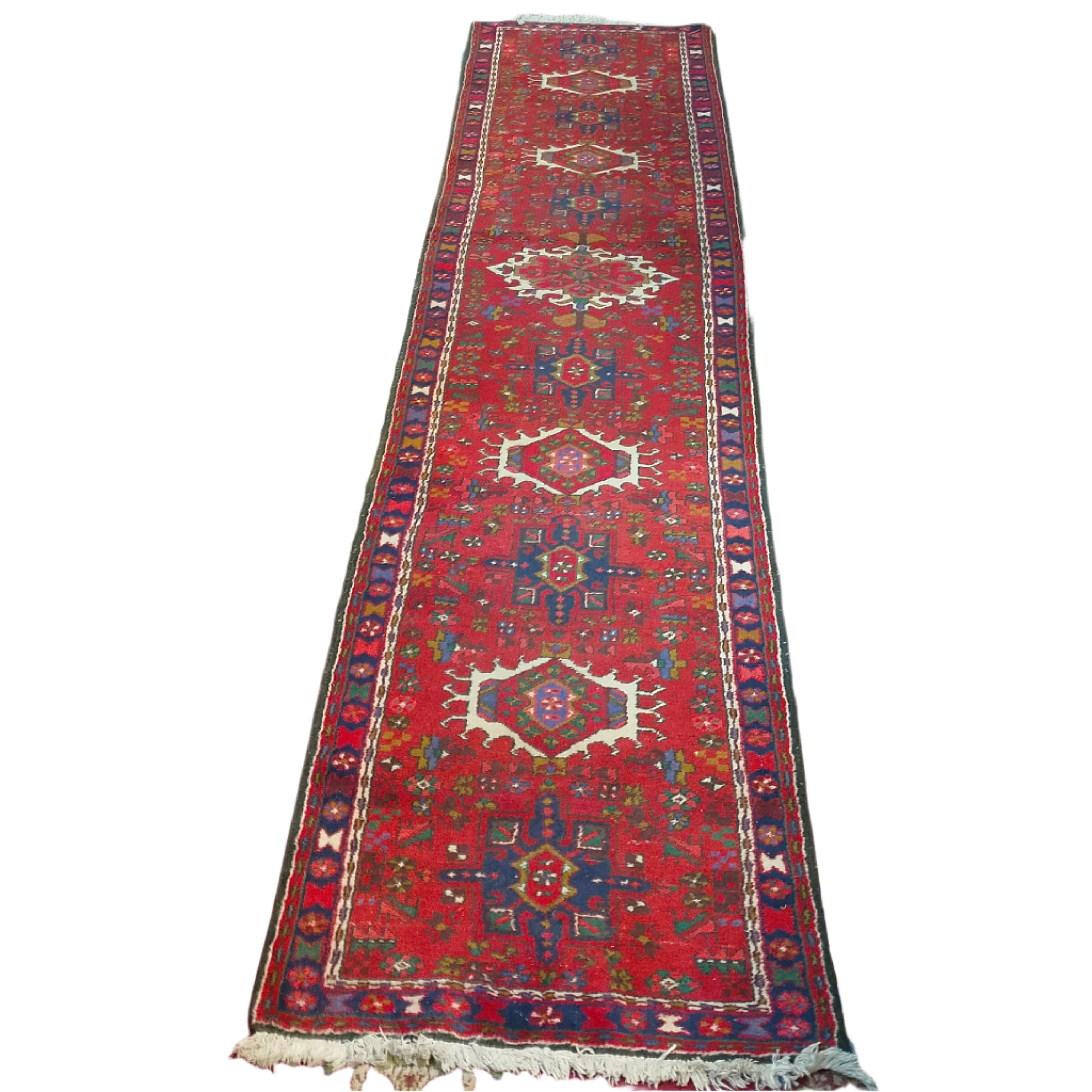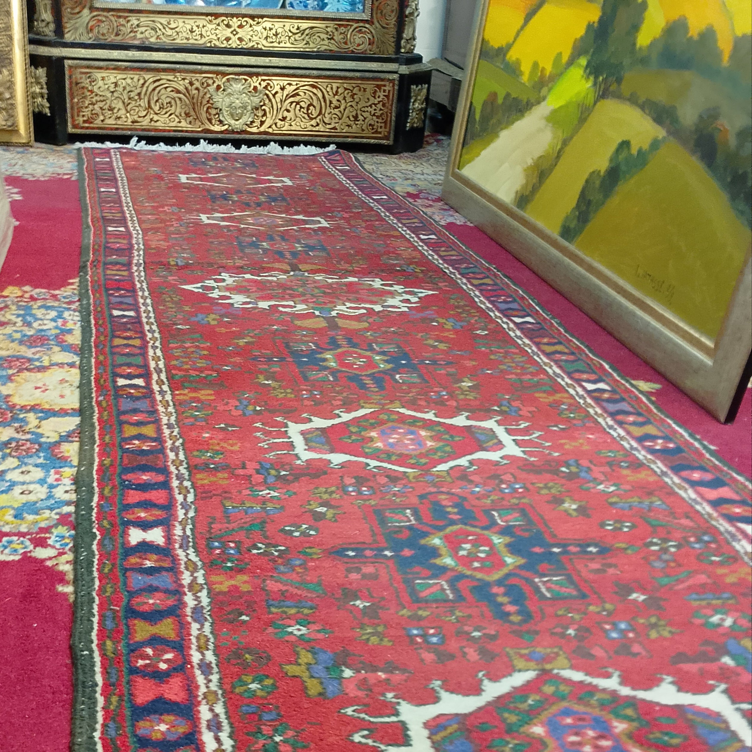 Gran alfombra persa para pasillo, anudada y tejida a mano, con intrincado diseño en colores azul, verde y blanco sobre rojo.