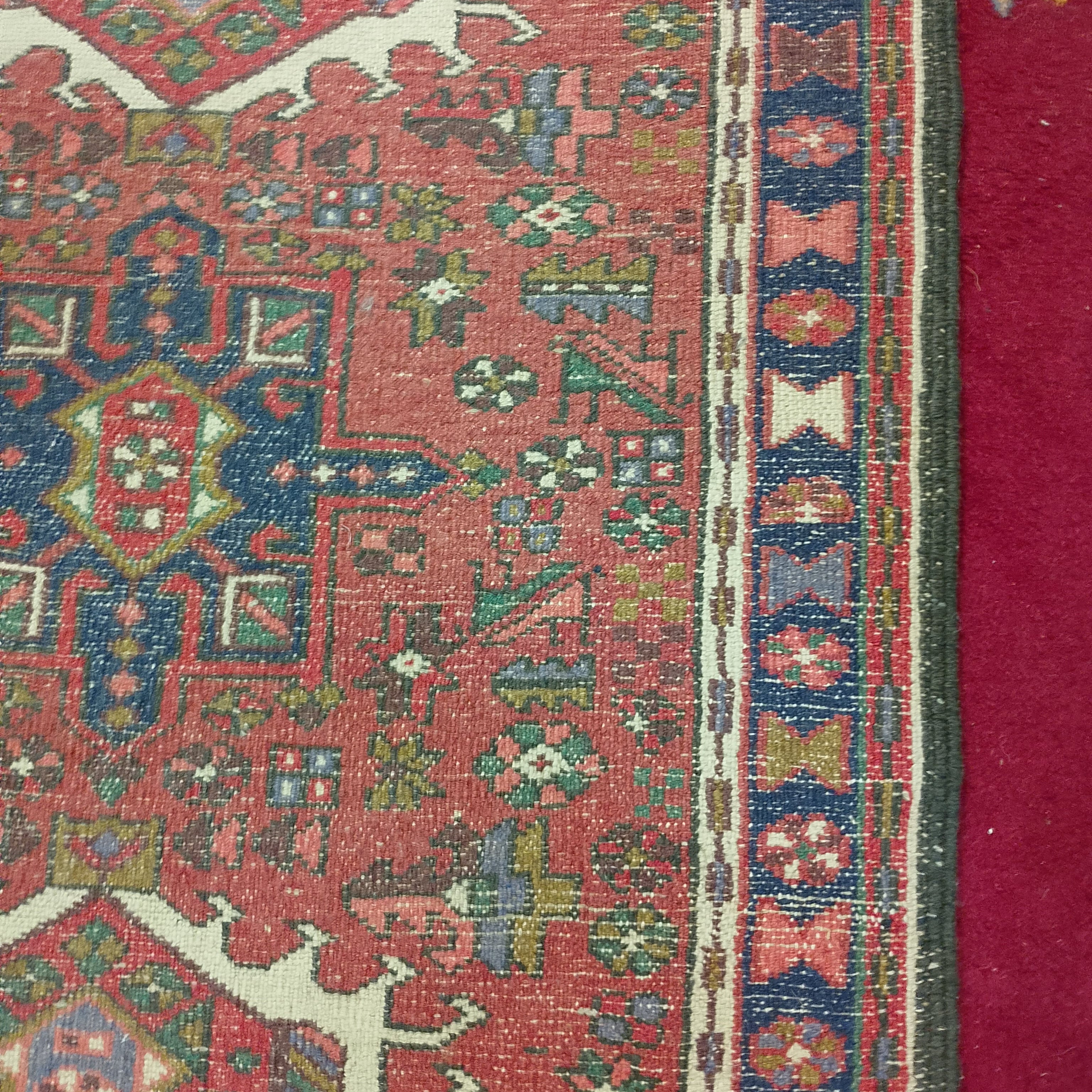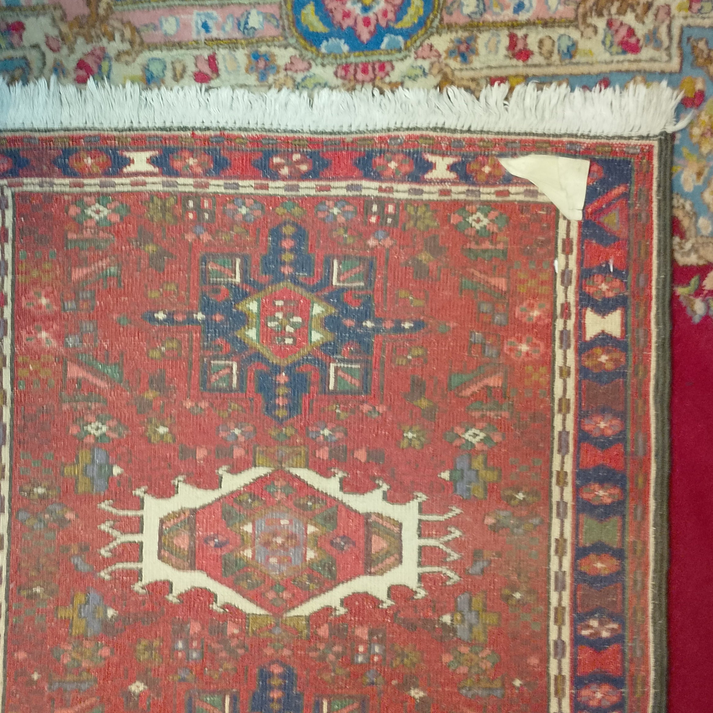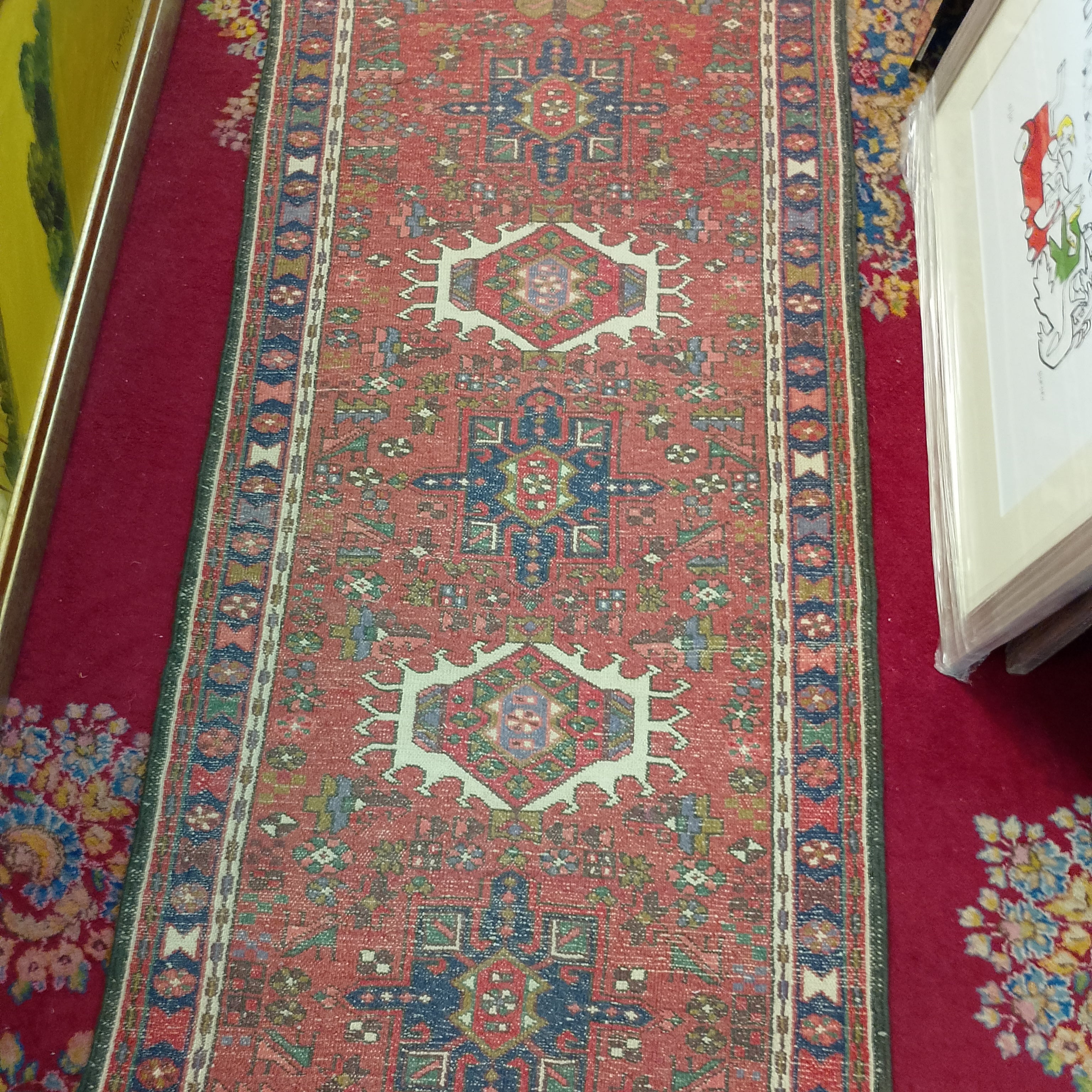 Gran alfombra persa para pasillo, anudada y tejida a mano, con intrincado diseño en colores azul, verde y blanco sobre rojo.