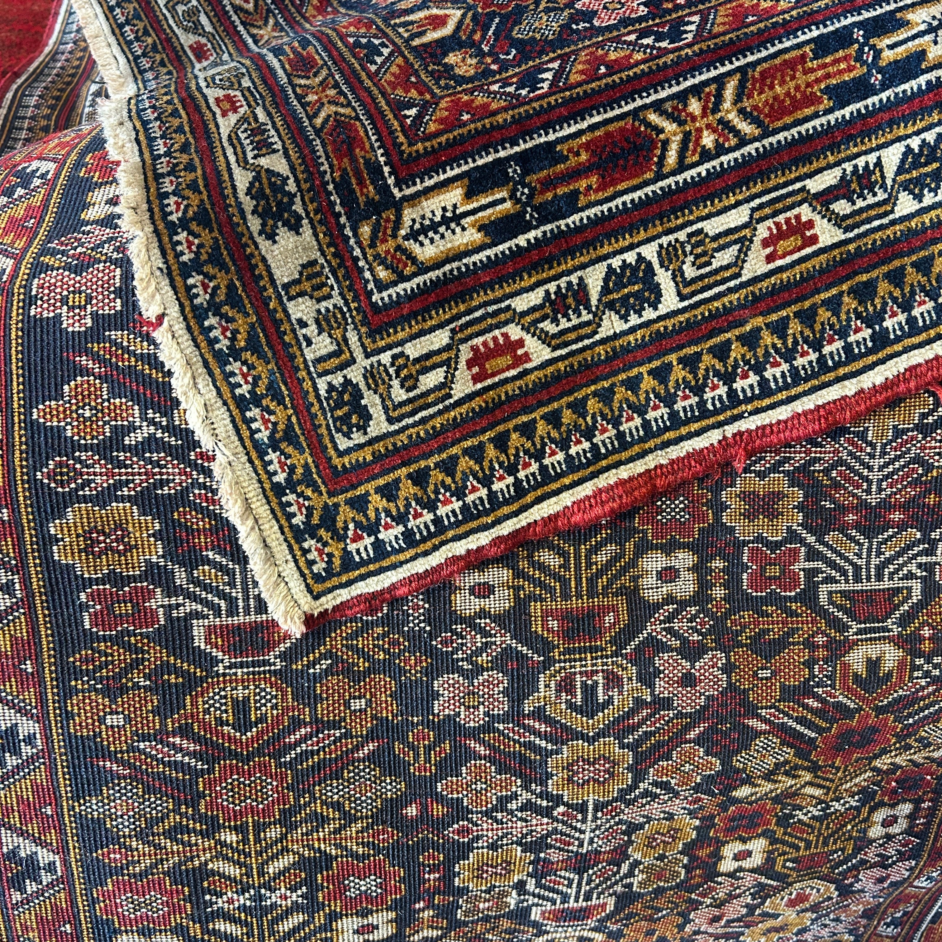 Bella alfombra de origen Cáucaso Ruso de la zona Derbent, tejido a mano en lana en patrones florales teñidos de colores rojos, amarillos y naranjos, sobre un fondo azul oscuro. La pieza tiene una zona central de fondo azul, con un patrón de pequeñas flores con bordes blancos, seguida de la zona de los bordes, hecha de cadenas geométricas.