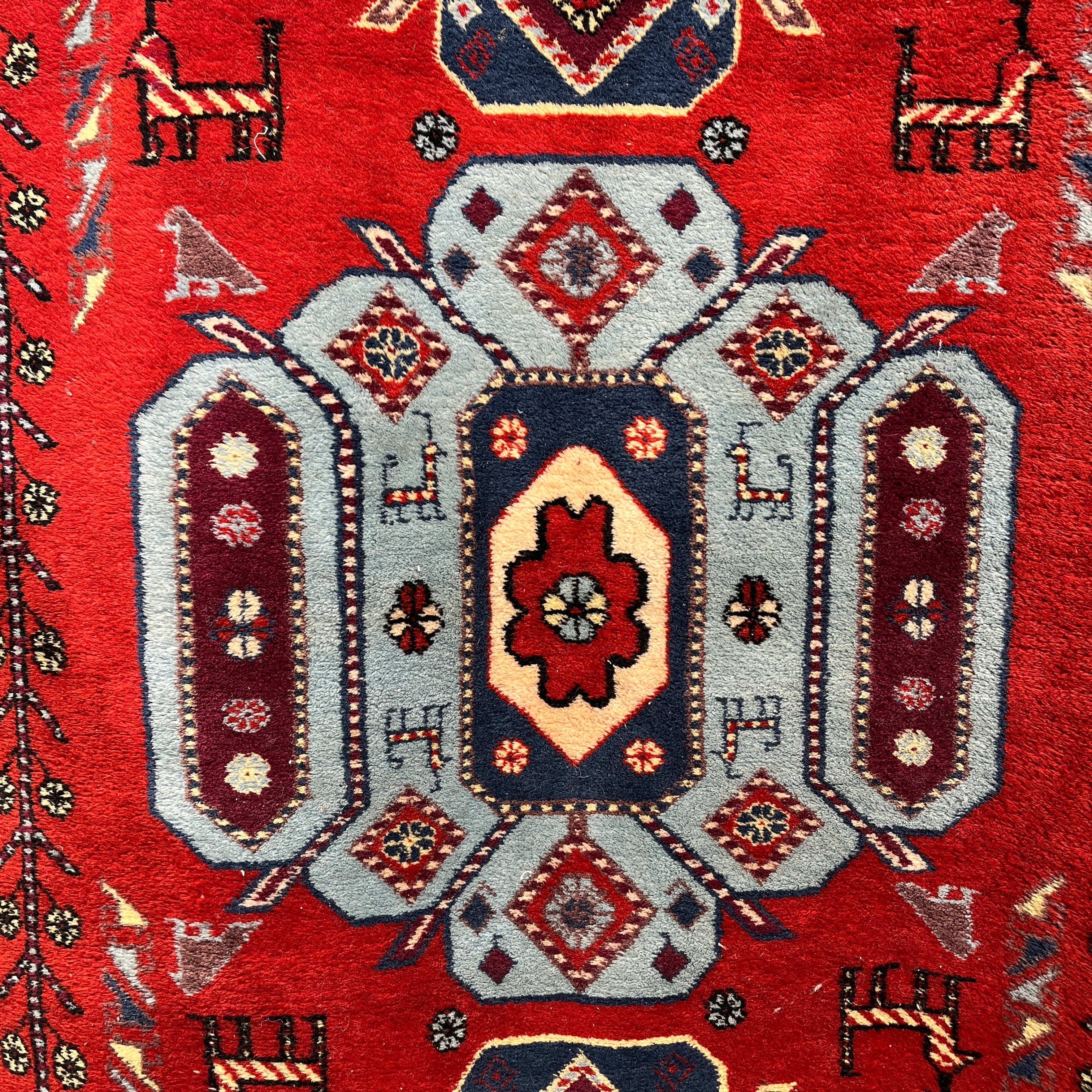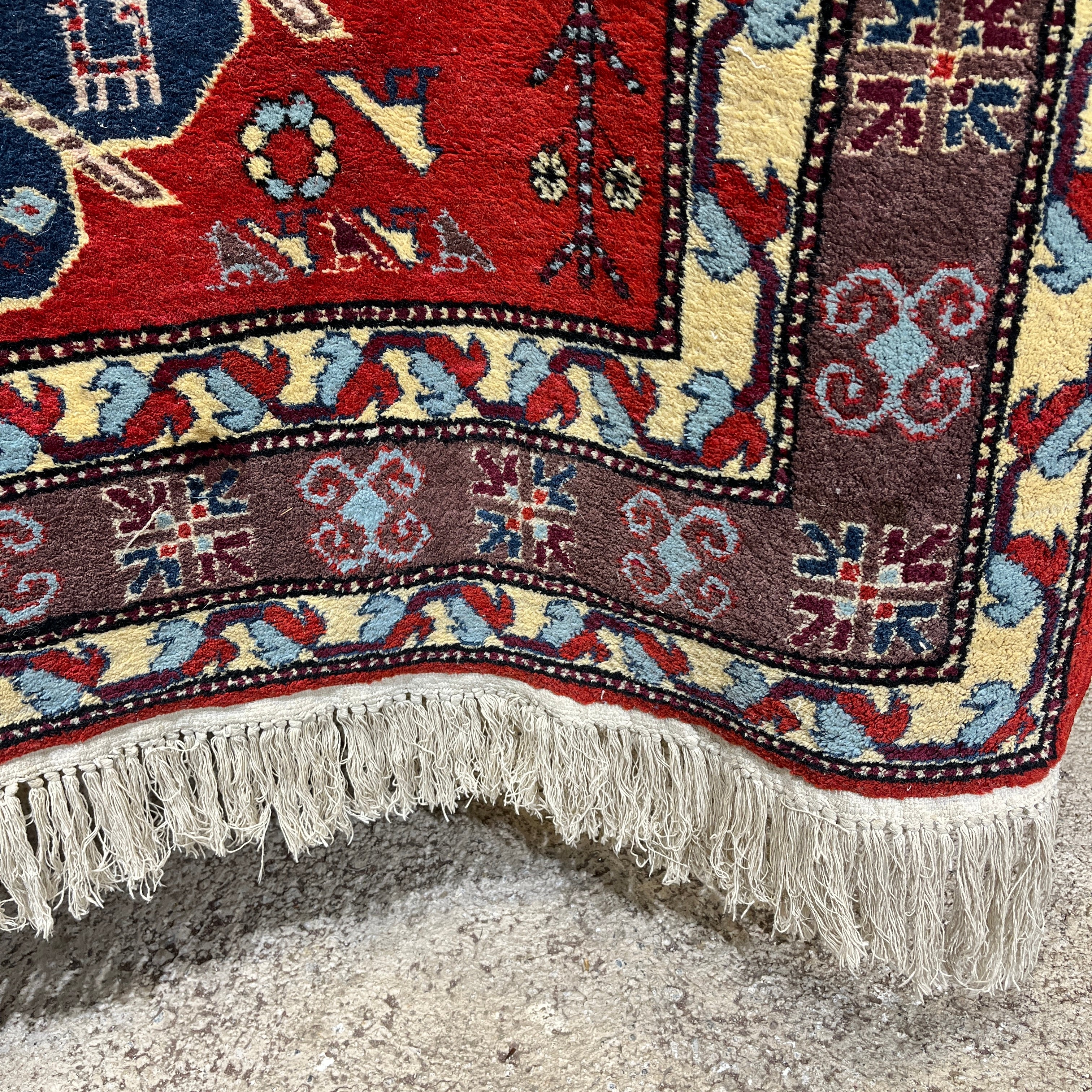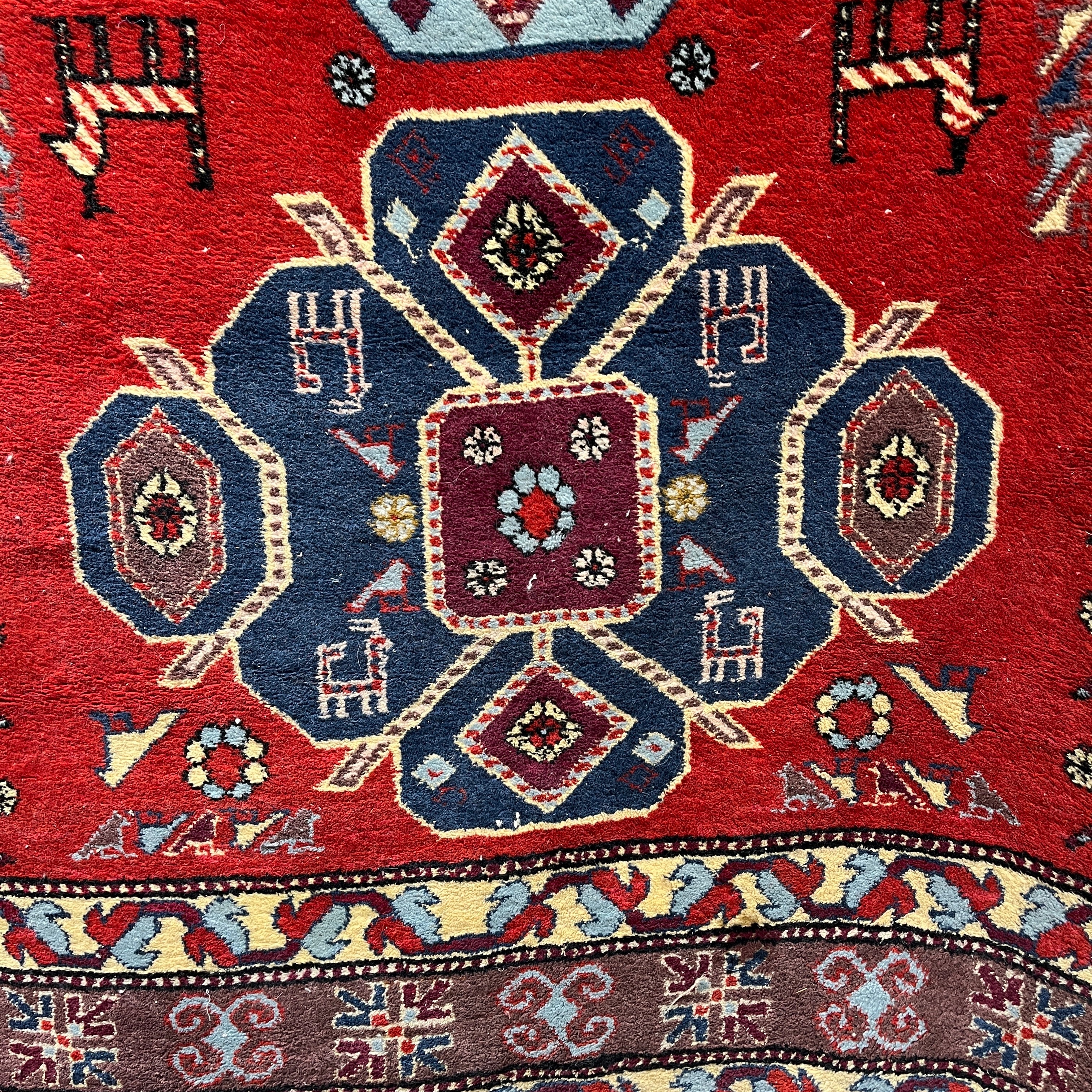 Bella alfombra originaria del Cáucaso Oriental, específicamente de la región de Shirvan en Azerbaiyán. Si bien a menudo se comercializan como "alfombras rusas" debido al pasado histórico y la influencia de Rusia en la región del Cáucaso, su origen y tradición de tejido son azerbaiyanos. Esta alfombra hecha de lana anudada y teñida a mano, tiene un diseño que presenta el motivo "boteh" (también conocido como paisley) de medallones poligonales o en forma de rombo, y figuras de animales y humanos estilizadas. Esta bella pieza tiene una paleta de colores intensos y contrastantes, con un medallón central índigo, además de rojo, azul violáceo, blanco y café.
