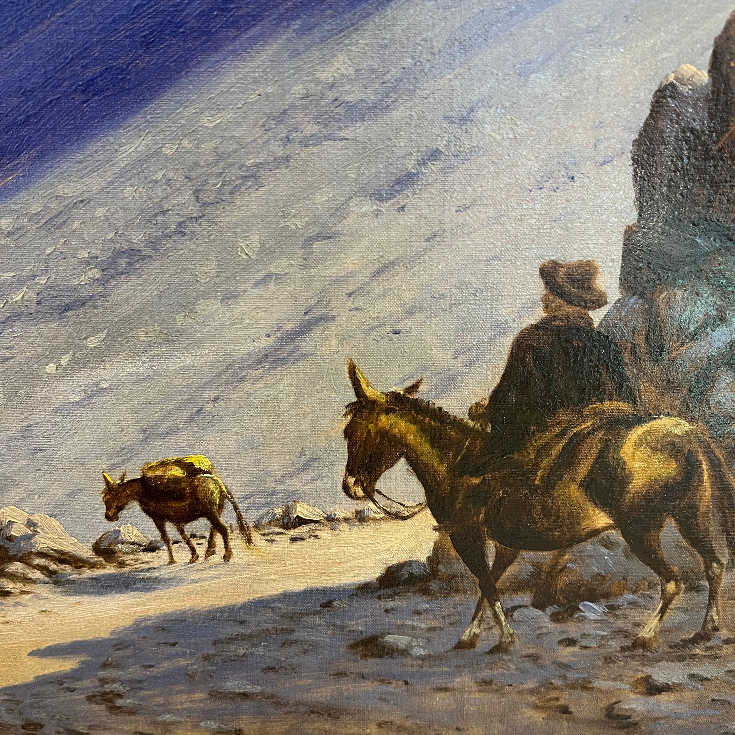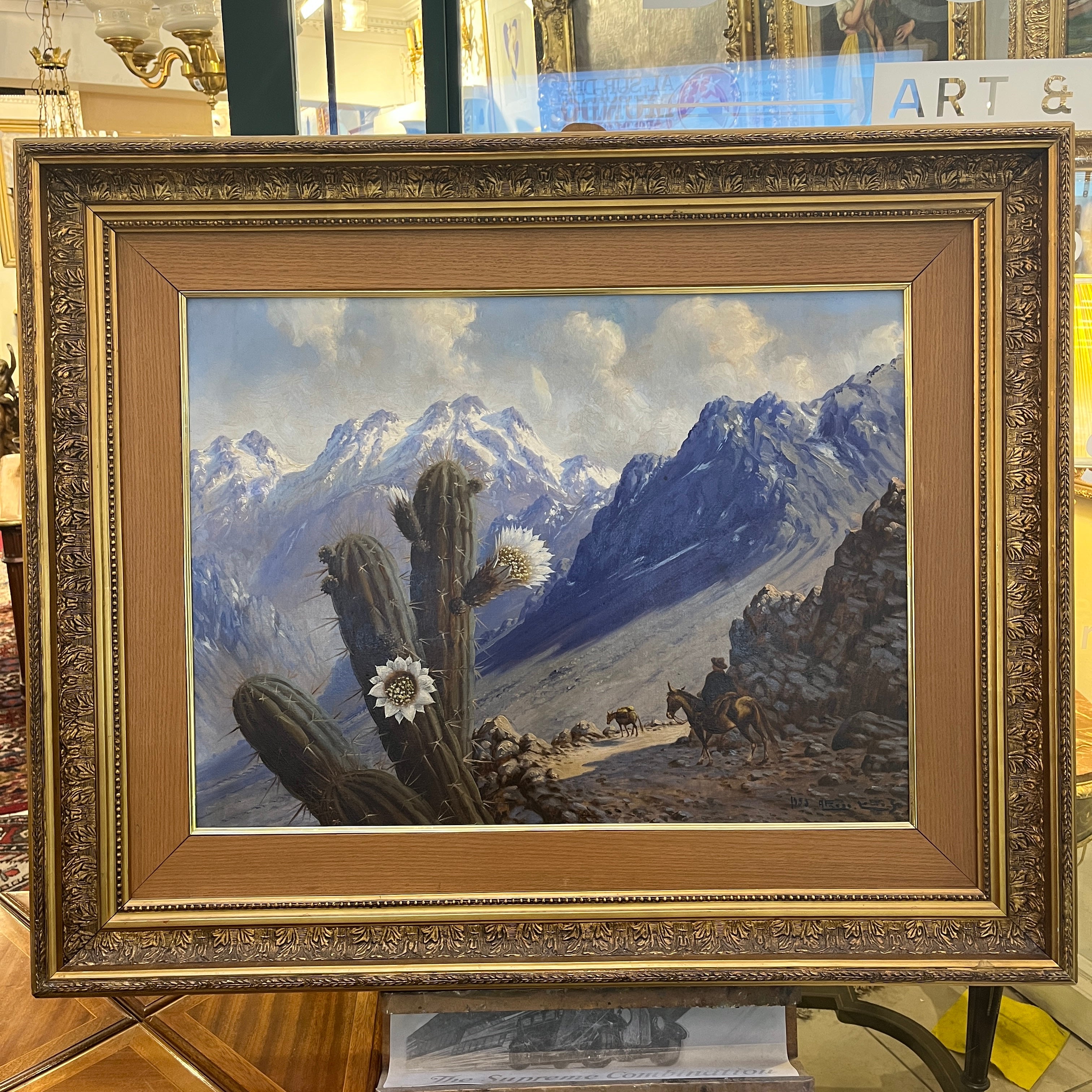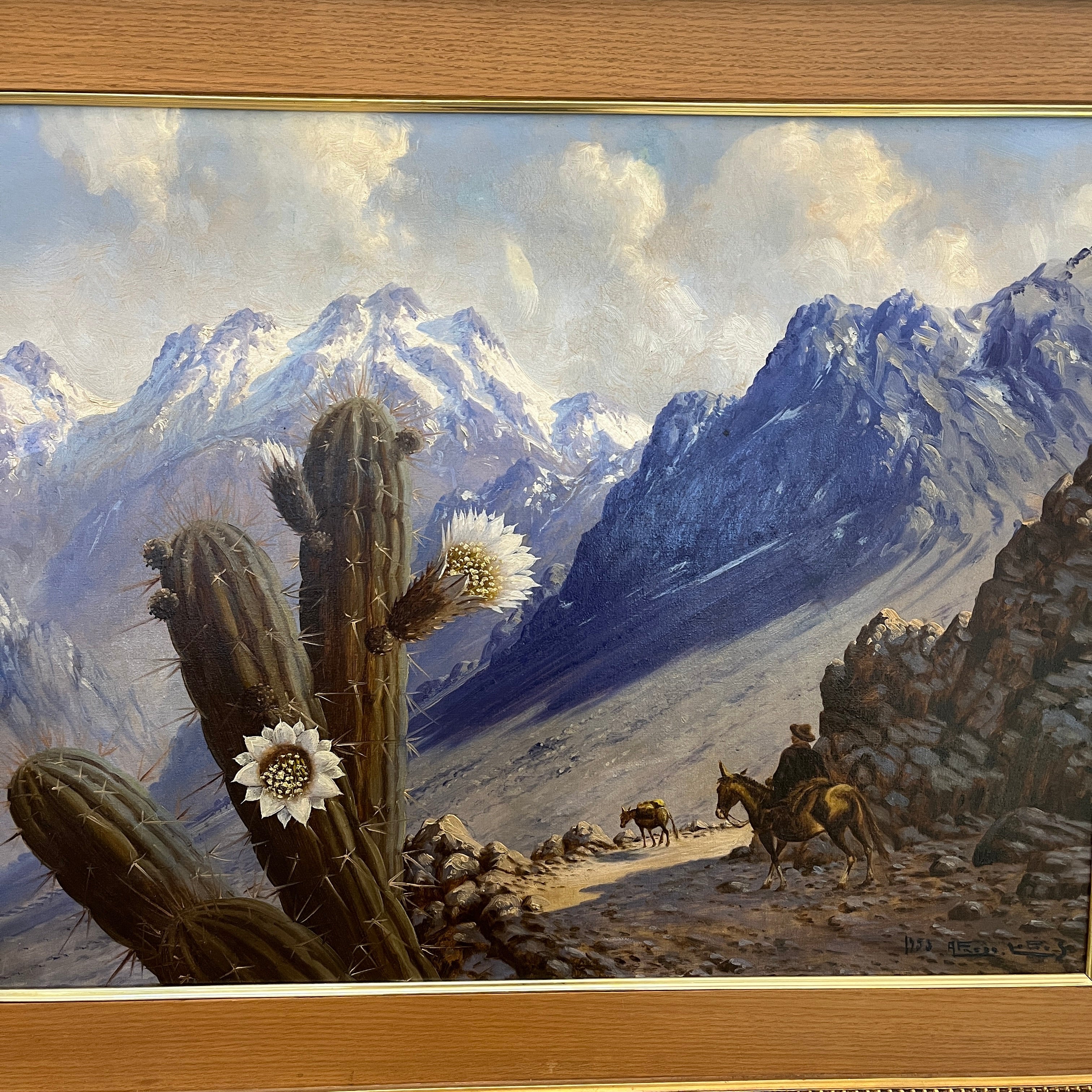 Óleo sobre tela del recocido pintor chileno Alfredo Lobos Aránguiz (1890 - 1918 ), pintado en 1953. La Obra representa un paisaje cordillerano, en el que se ve a un hombre ascendiendo en con sus caballos a la cumbre, que observa desde lejos. En en el lado izquierdo de la composición, en primer plano, toma protagonismo un cactus San Pedro, florecido. La obra captura la majestuosidad del paisaje con detalle y un bello juego de tonos azulados para representar la cordillera.