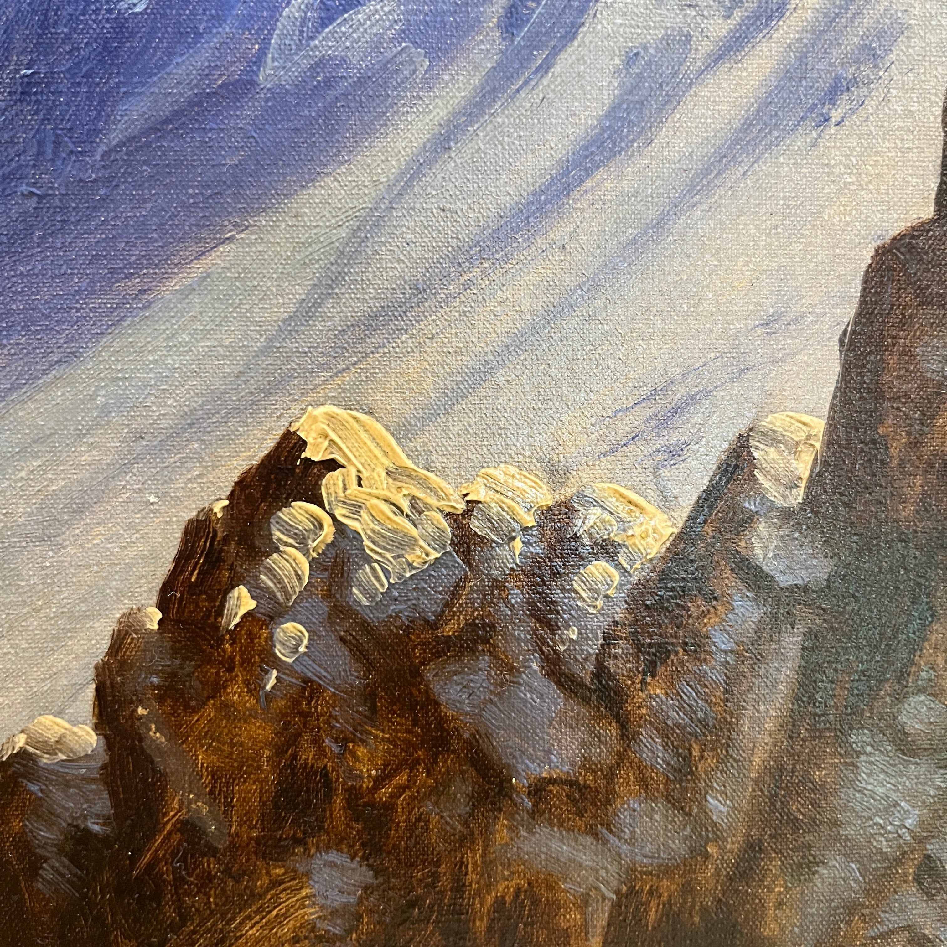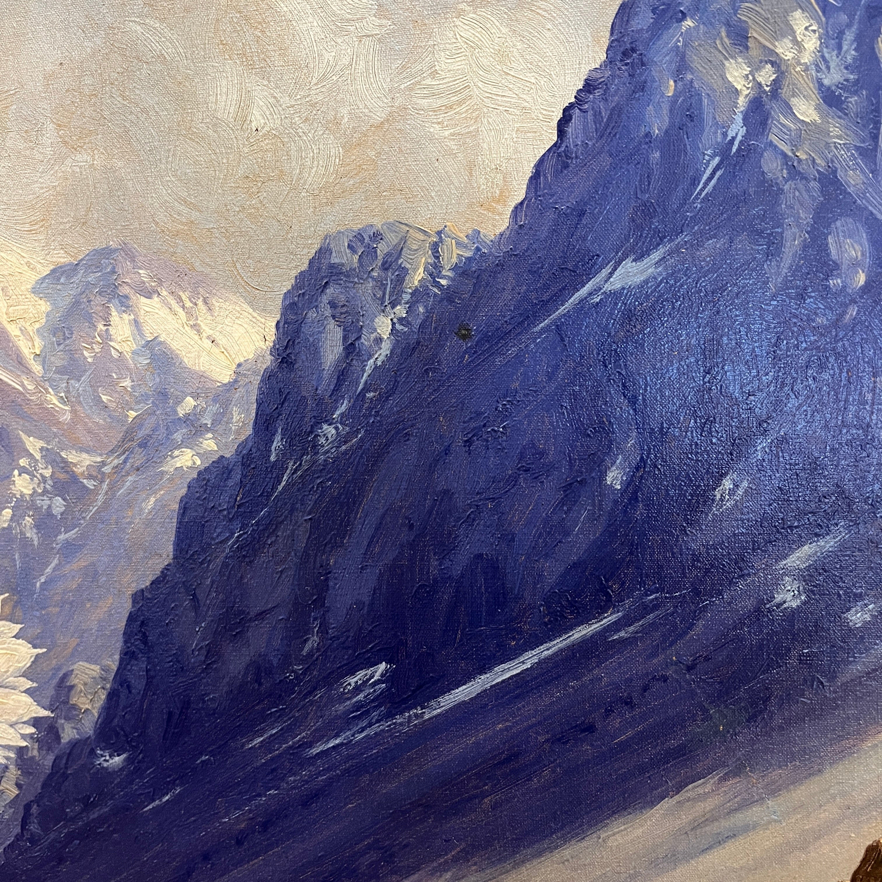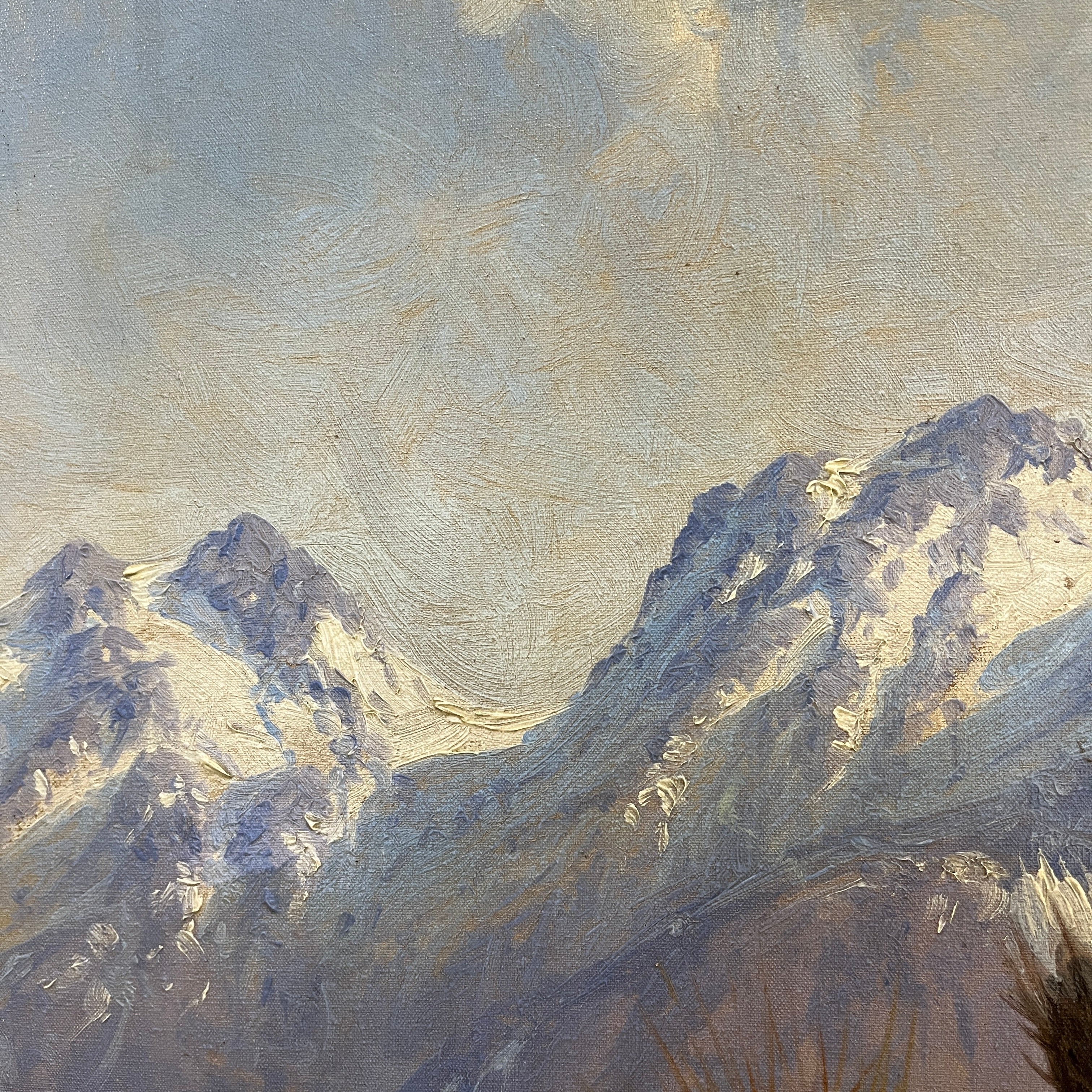 Óleo sobre tela del recocido pintor chileno Alfredo Lobos Aránguiz (1890 - 1918 ), pintado en 1953. La Obra representa un paisaje cordillerano, en el que se ve a un hombre ascendiendo en con sus caballos a la cumbre, que observa desde lejos. En en el lado izquierdo de la composición, en primer plano, toma protagonismo un cactus San Pedro, florecido. La obra captura la majestuosidad del paisaje con detalle y un bello juego de tonos azulados para representar la cordillera.