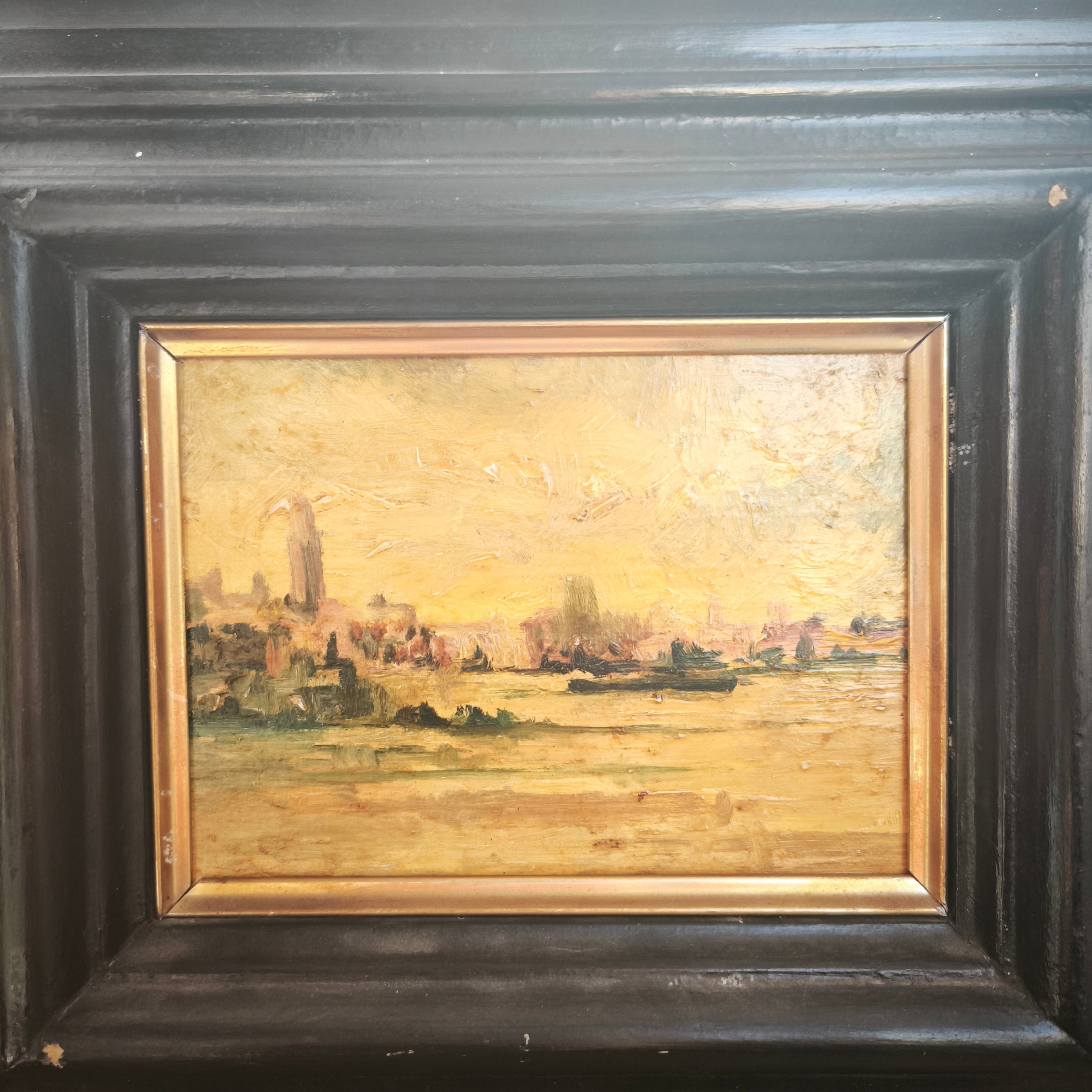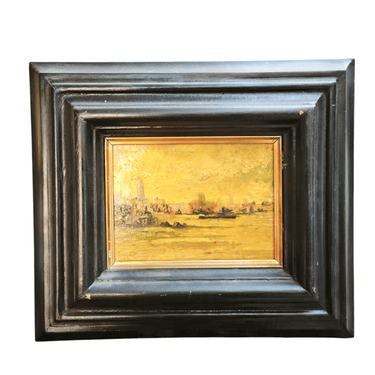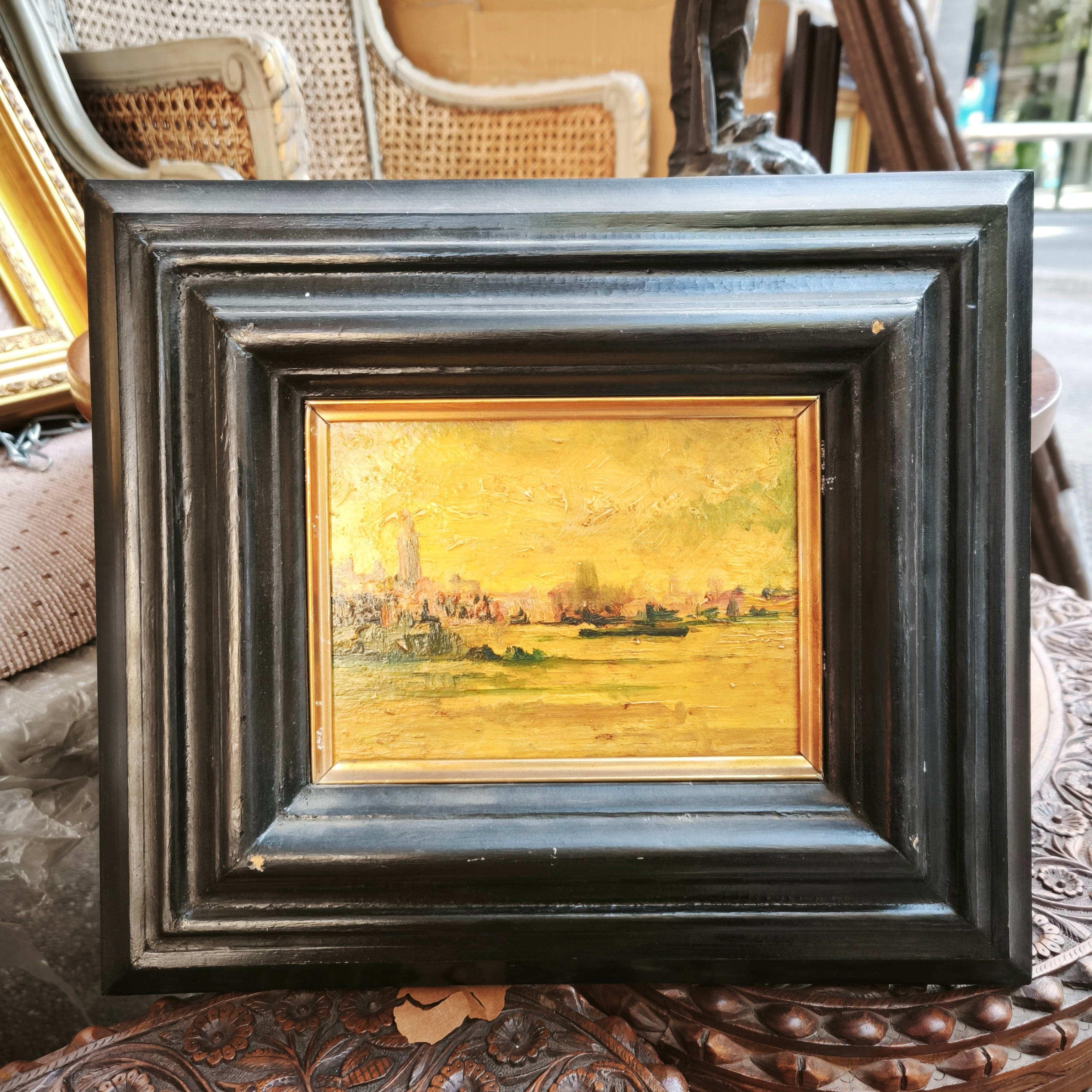 Óleo sobre madera, representando expresivamente un paisaje en diversos tonos de amarillo. La obra está enmarcada en sobria madera tallada y pintada de negro, con un borde interior en dorado.