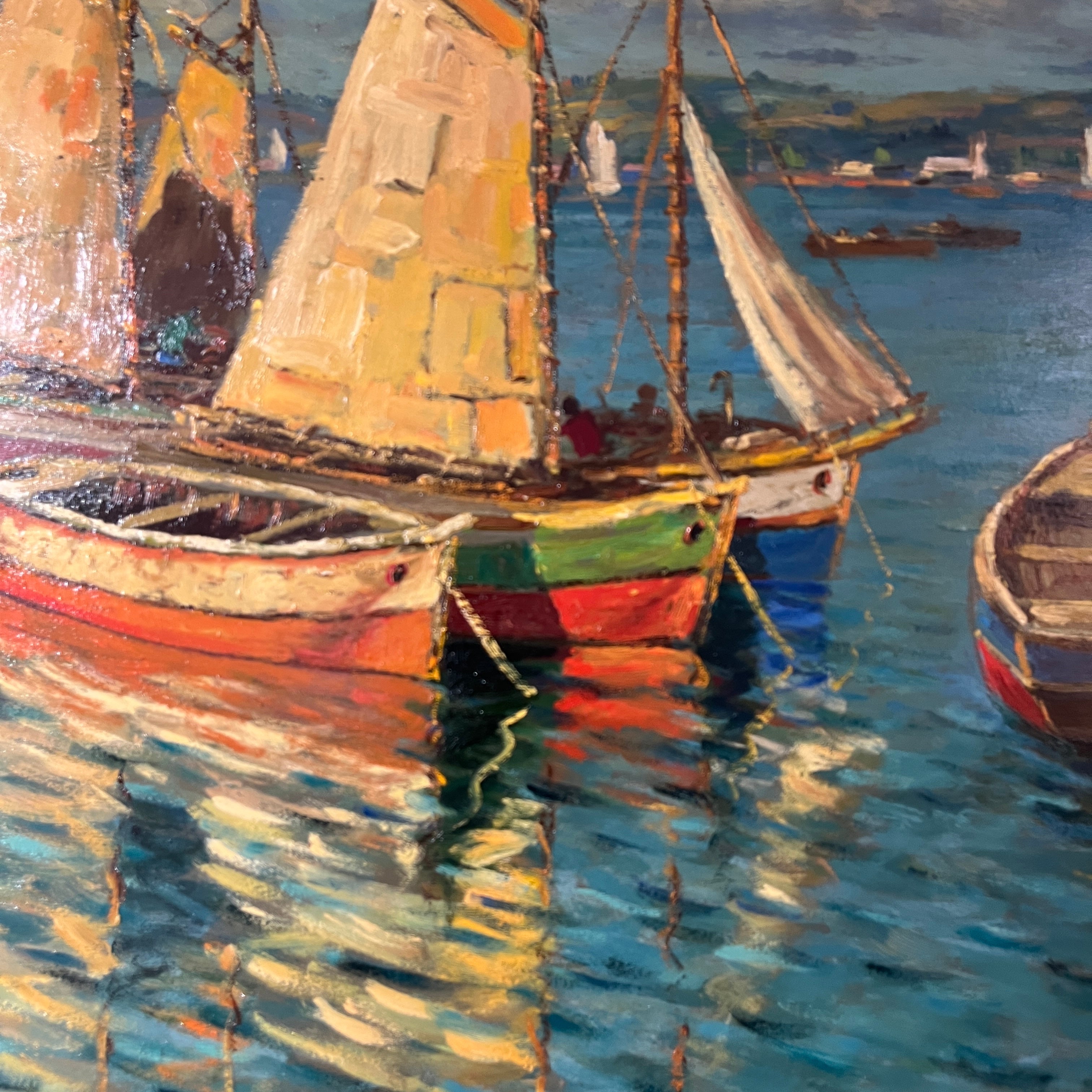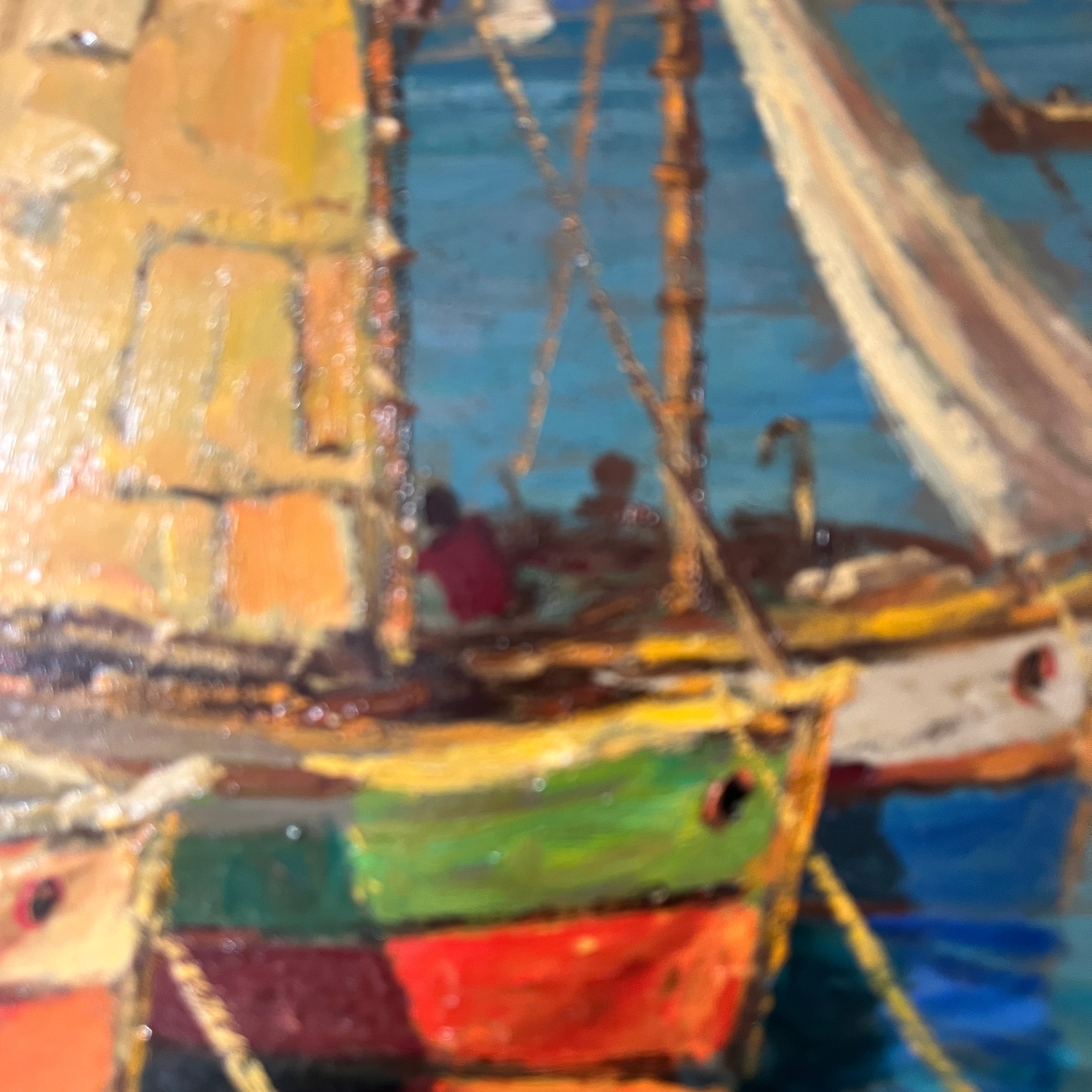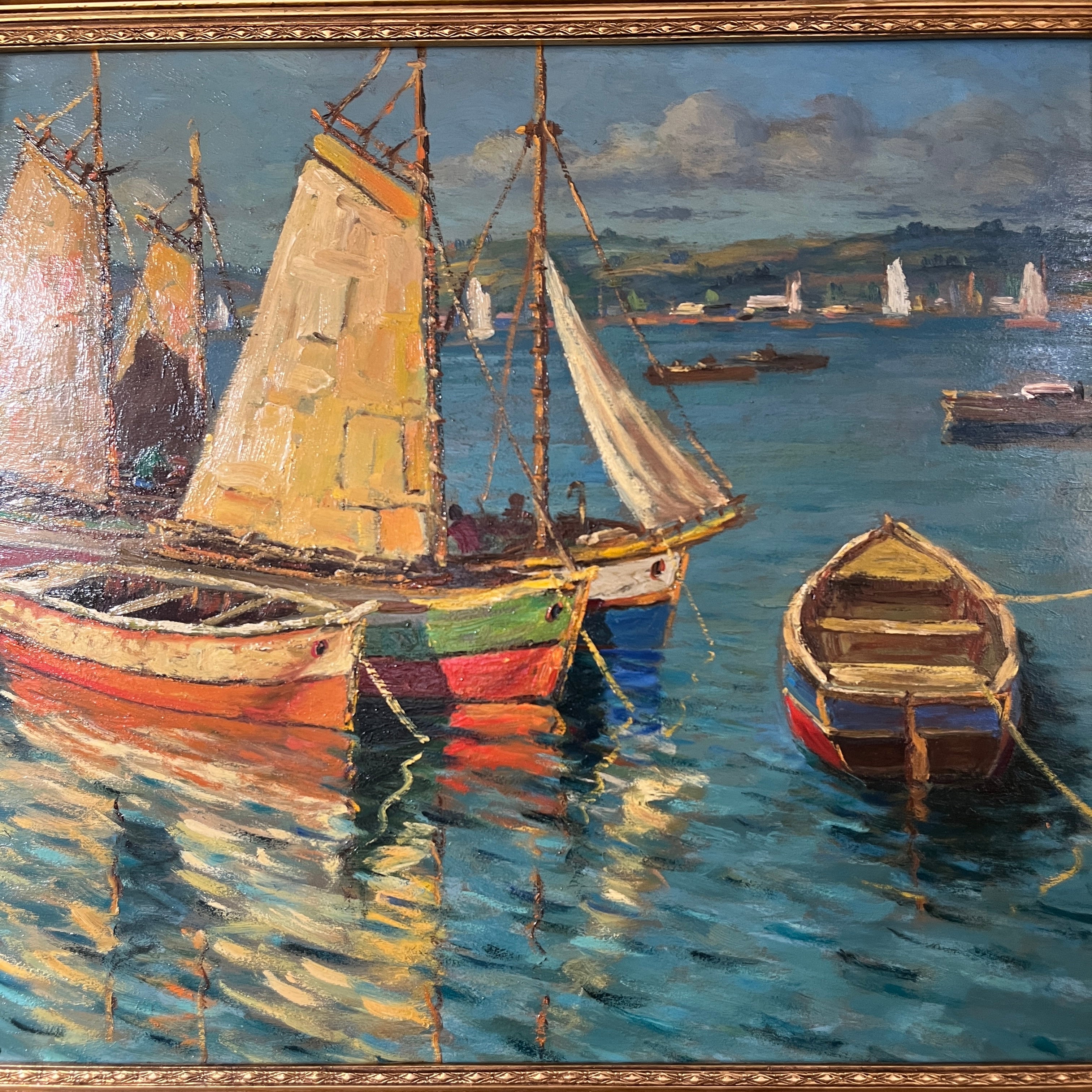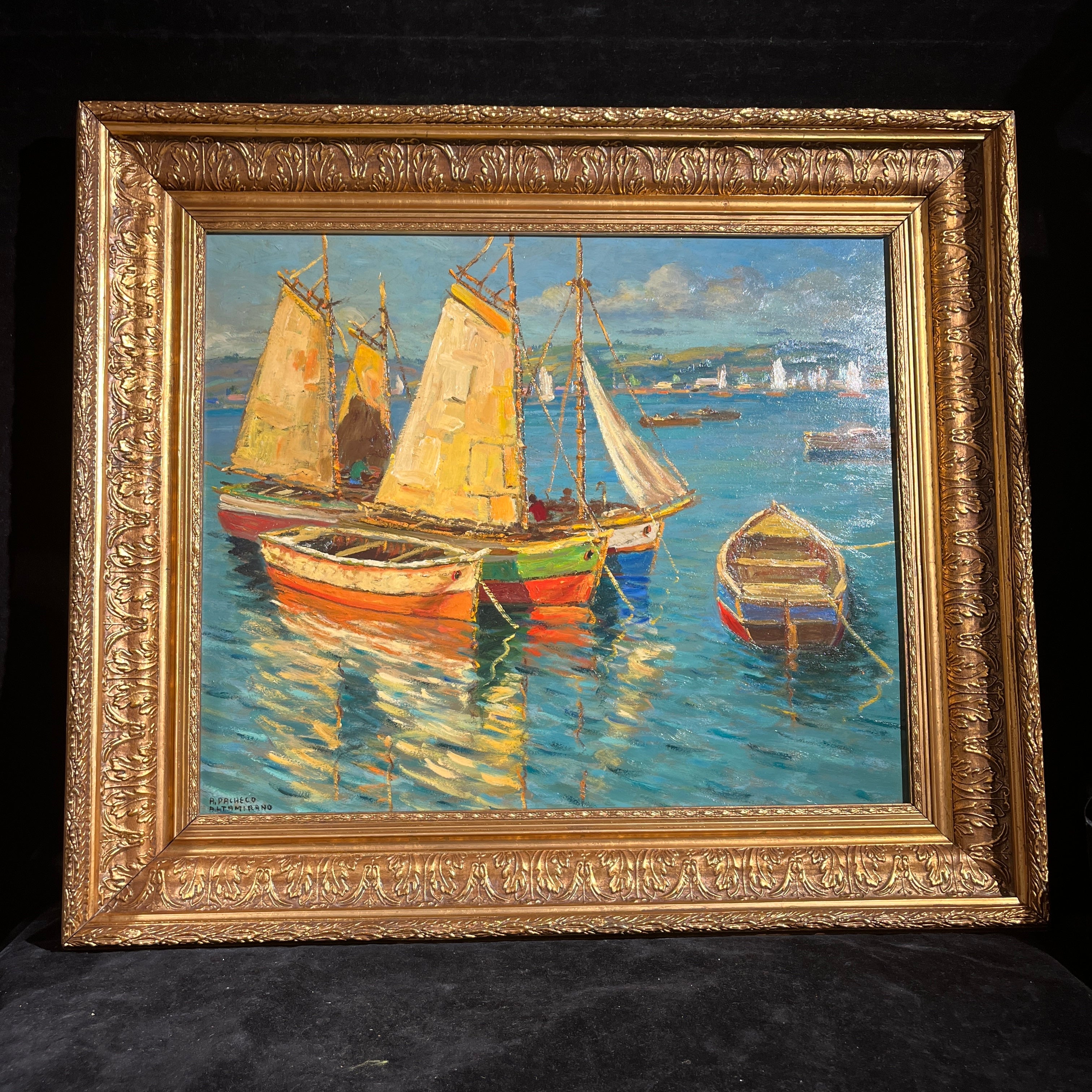 Hermoso óleo del talentoso pintor chileno Pacheco Altamirano (1905-1978) nos presenta tres veleros y dos botes aparcados en el mar, algunos con tripulantes y otros vacíos. En el horizonte se aprecia una ciudad. La obra destaca por sus colores y el característico trazo marcado de Altamirano.