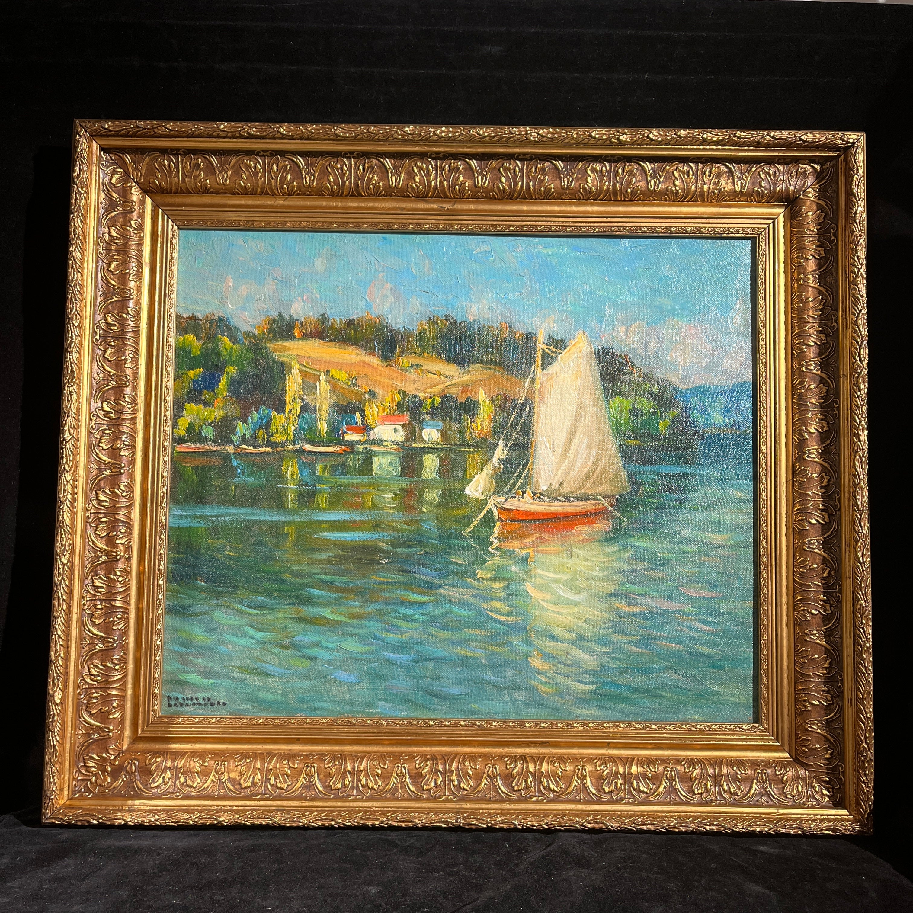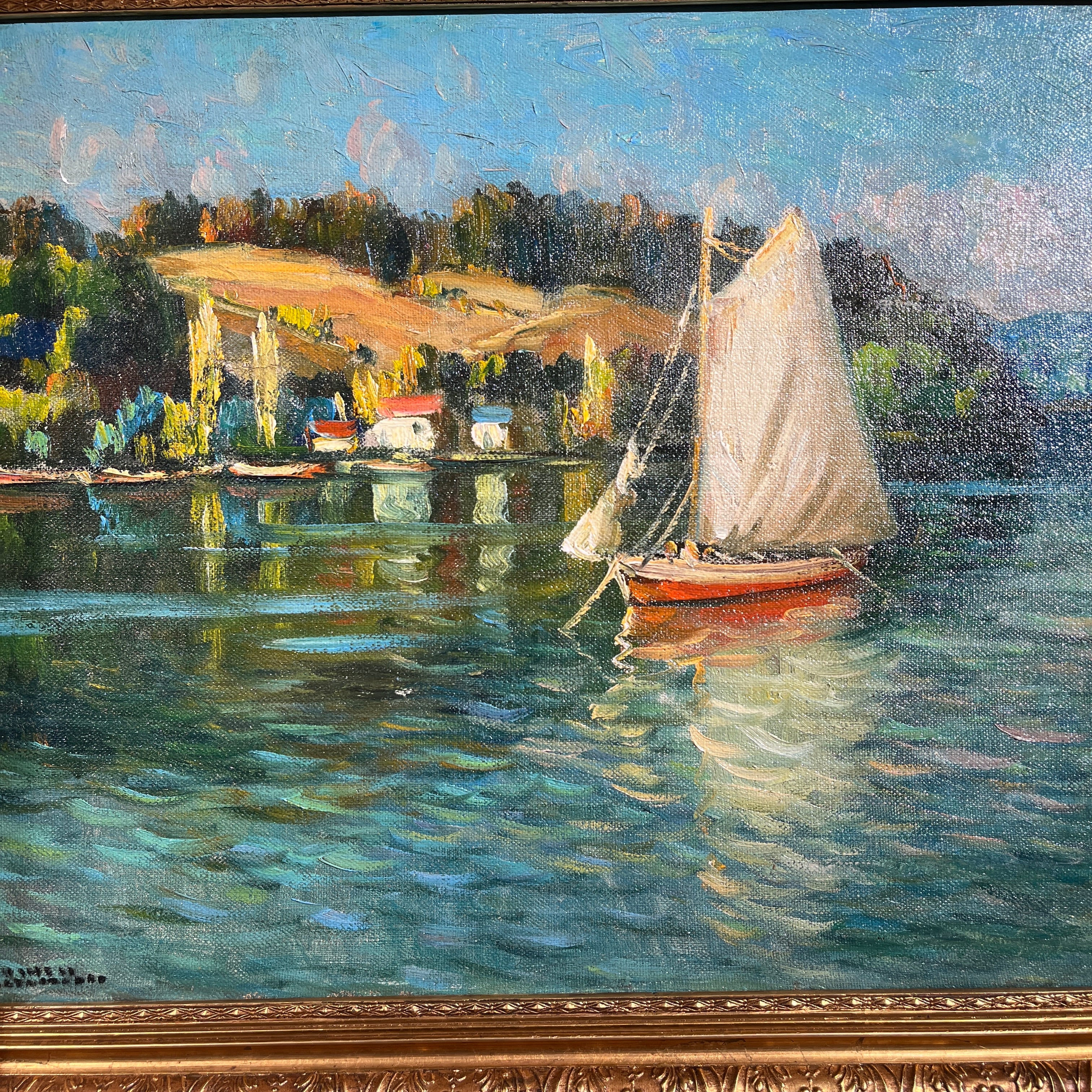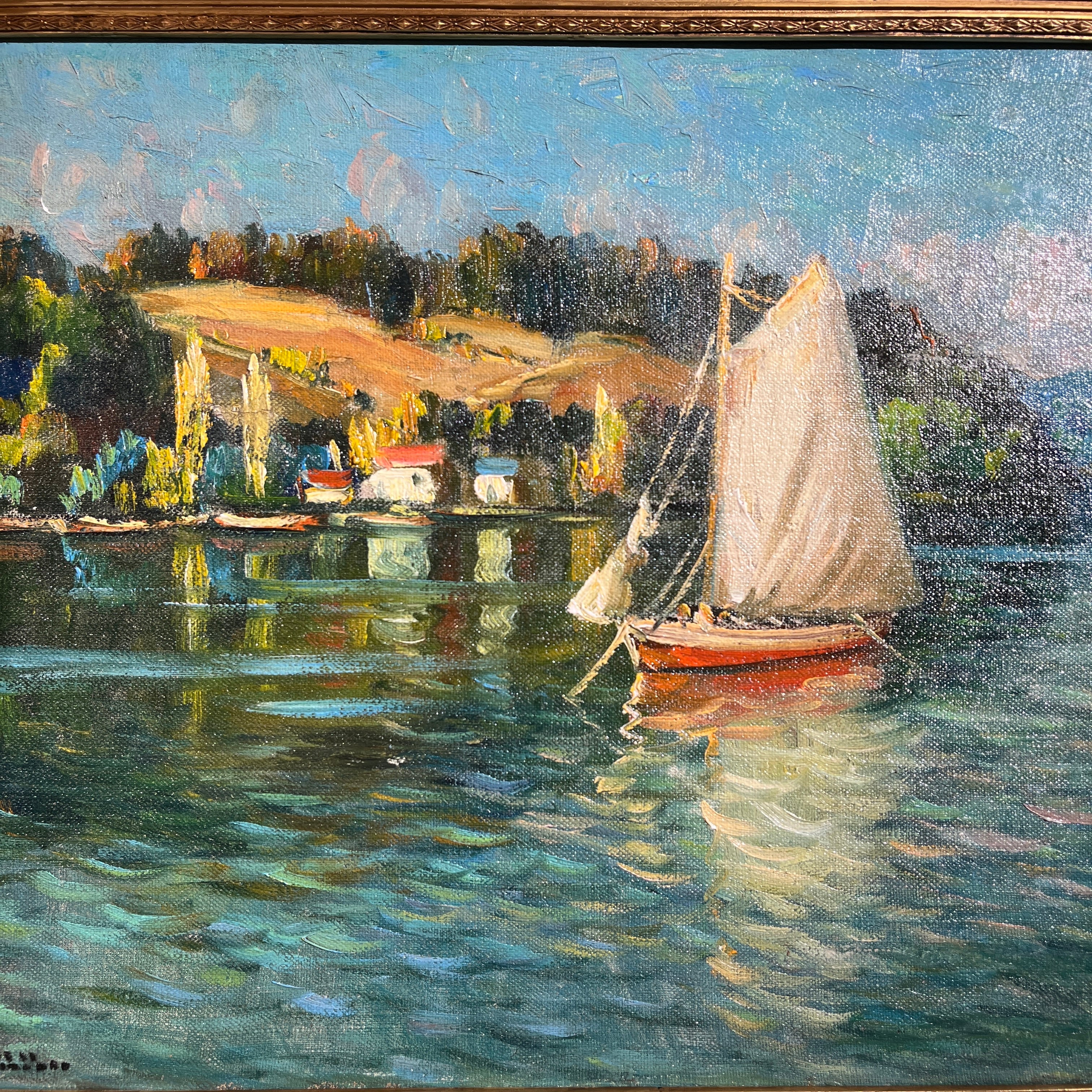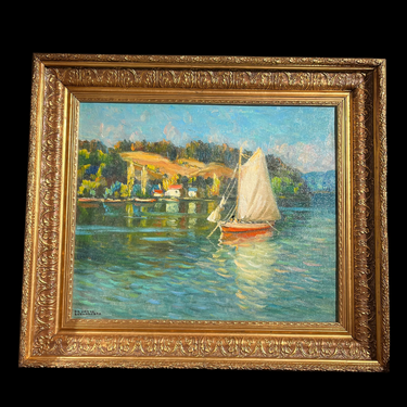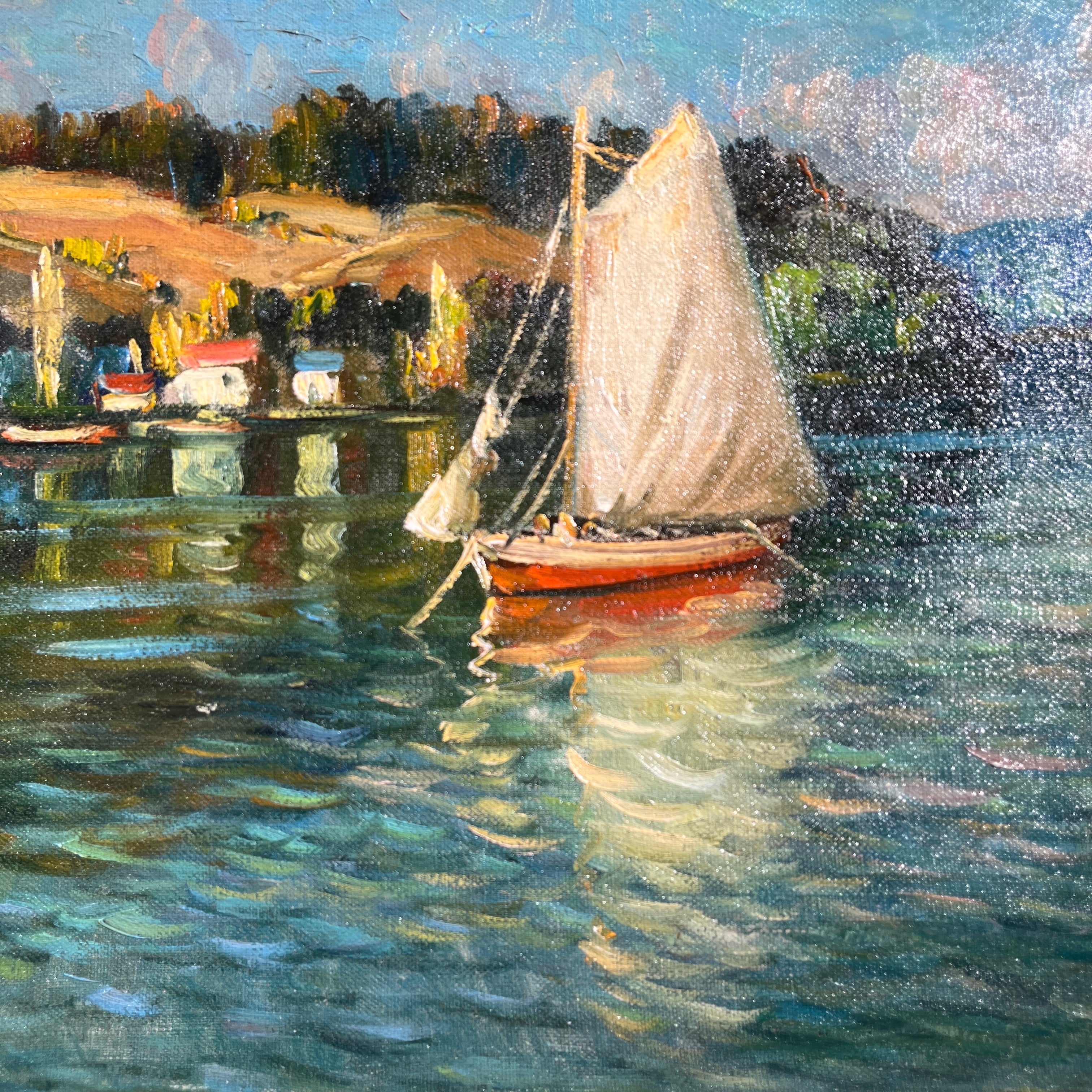 Óleo del pintor impresionista chileno Arturo Pacheco Altamirano (1905-1978), que nos muestra sus clásicos paisajes acuáticos, de poblados y embarcaciones. Podemos ver un velero anclado cerca de una pequeña aldea costera, ambas se reflejan en el agua. Es una obra de colores más intensos y claros que de costumbre. Tiene un cielo calipso que también se espejea en el mar, lo cual que le entrega más luminosidad a la pintura.