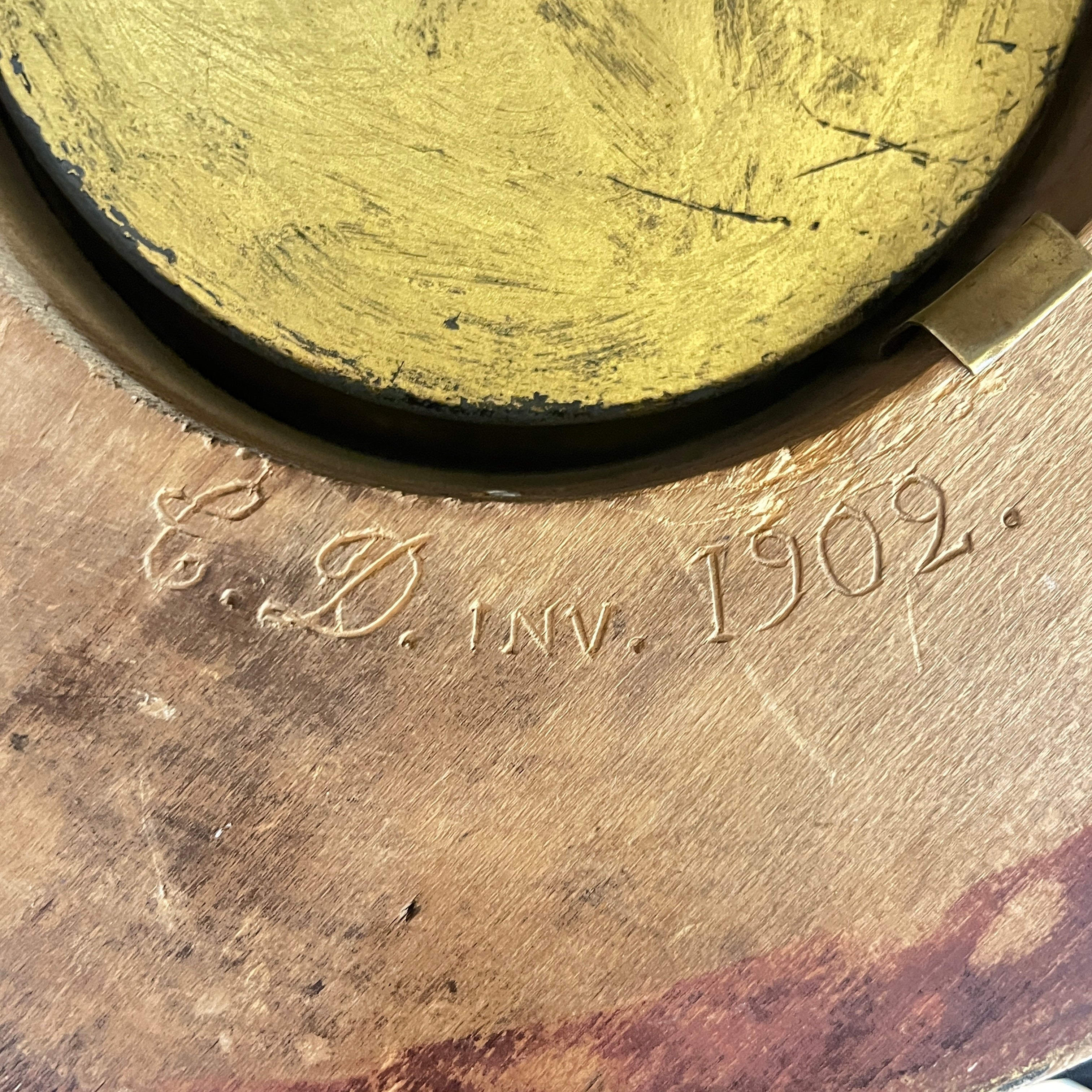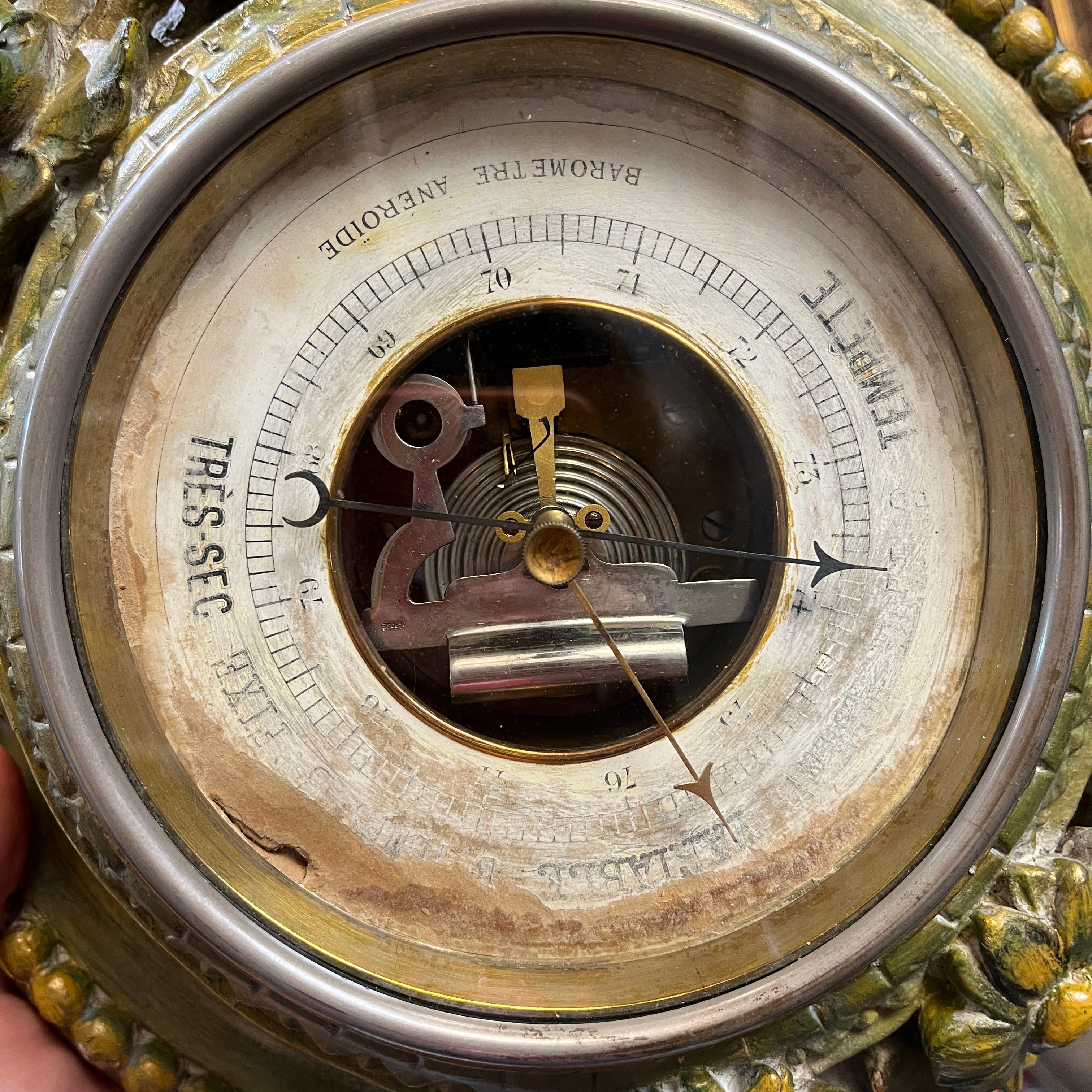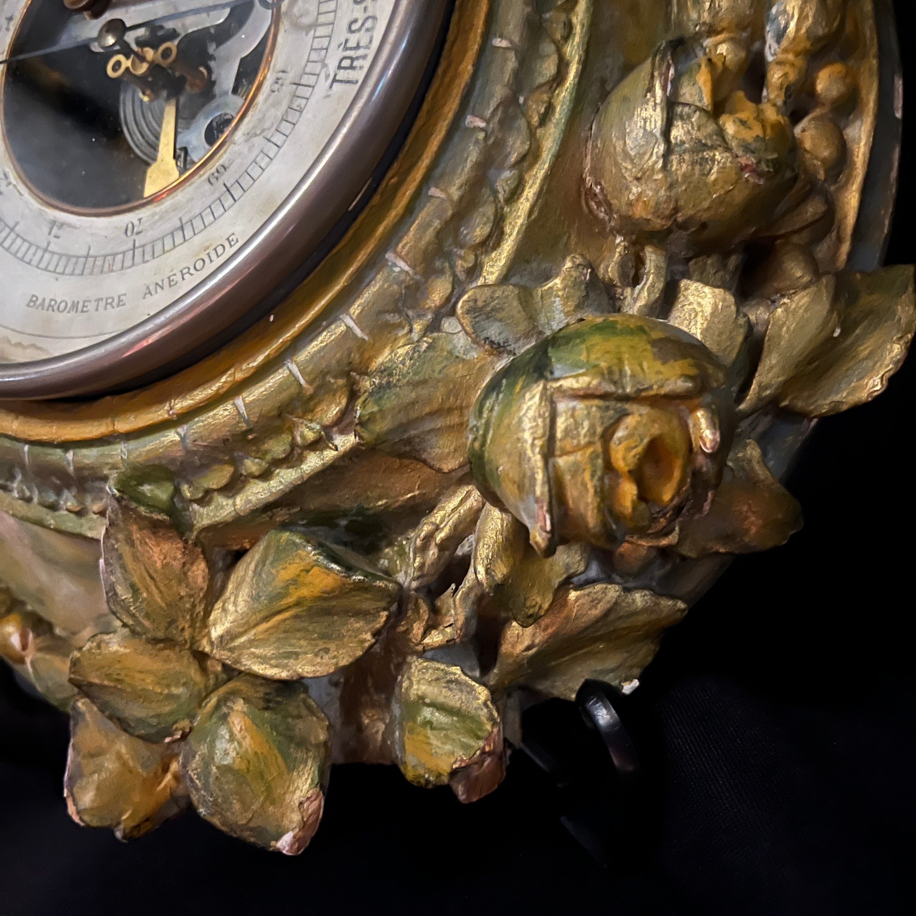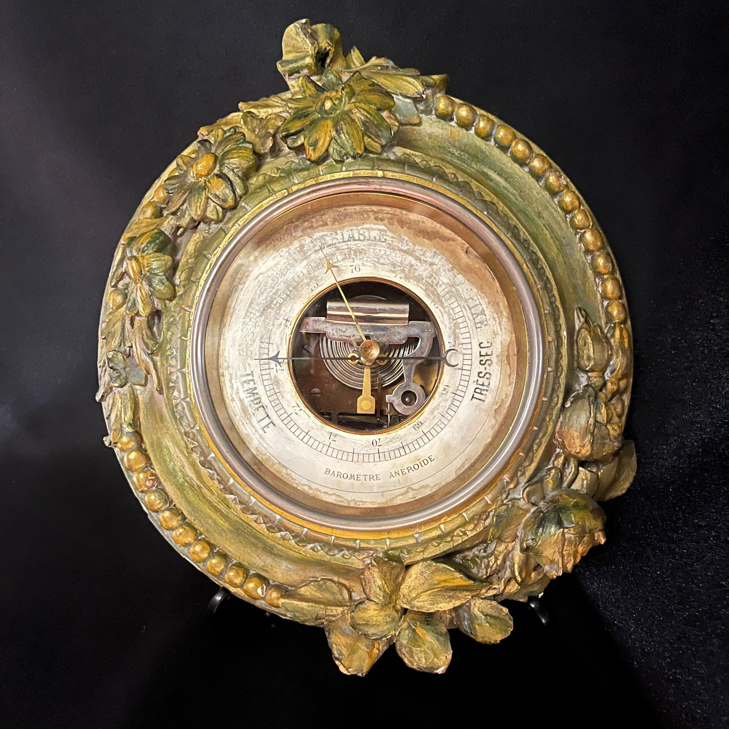 Precioso barómetro francés de madera policromada, tallado a mano con una especial corona ornamental floral a su alrededor. Ideal para decorar muros del hogar. Firmado E. D. Inv. 1902